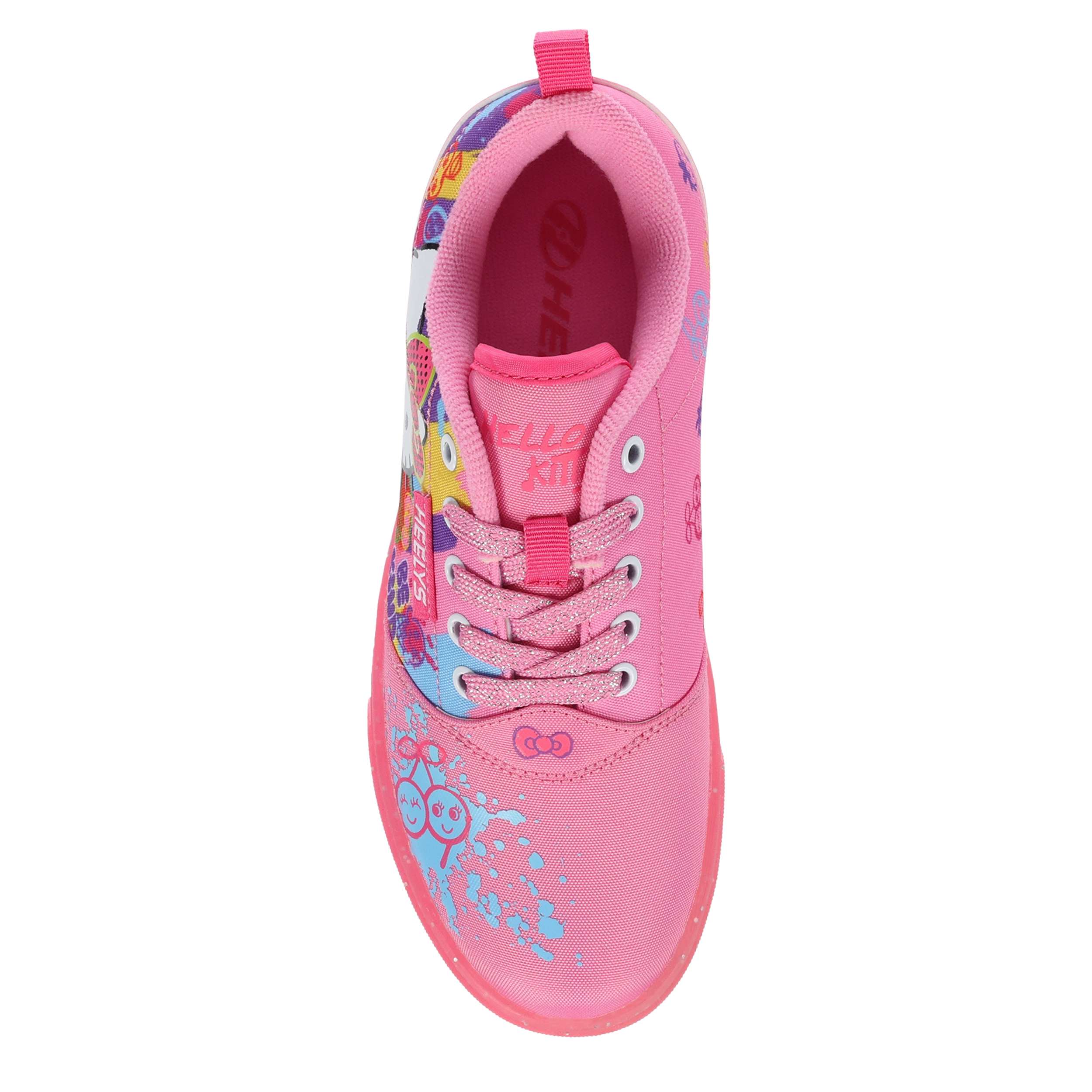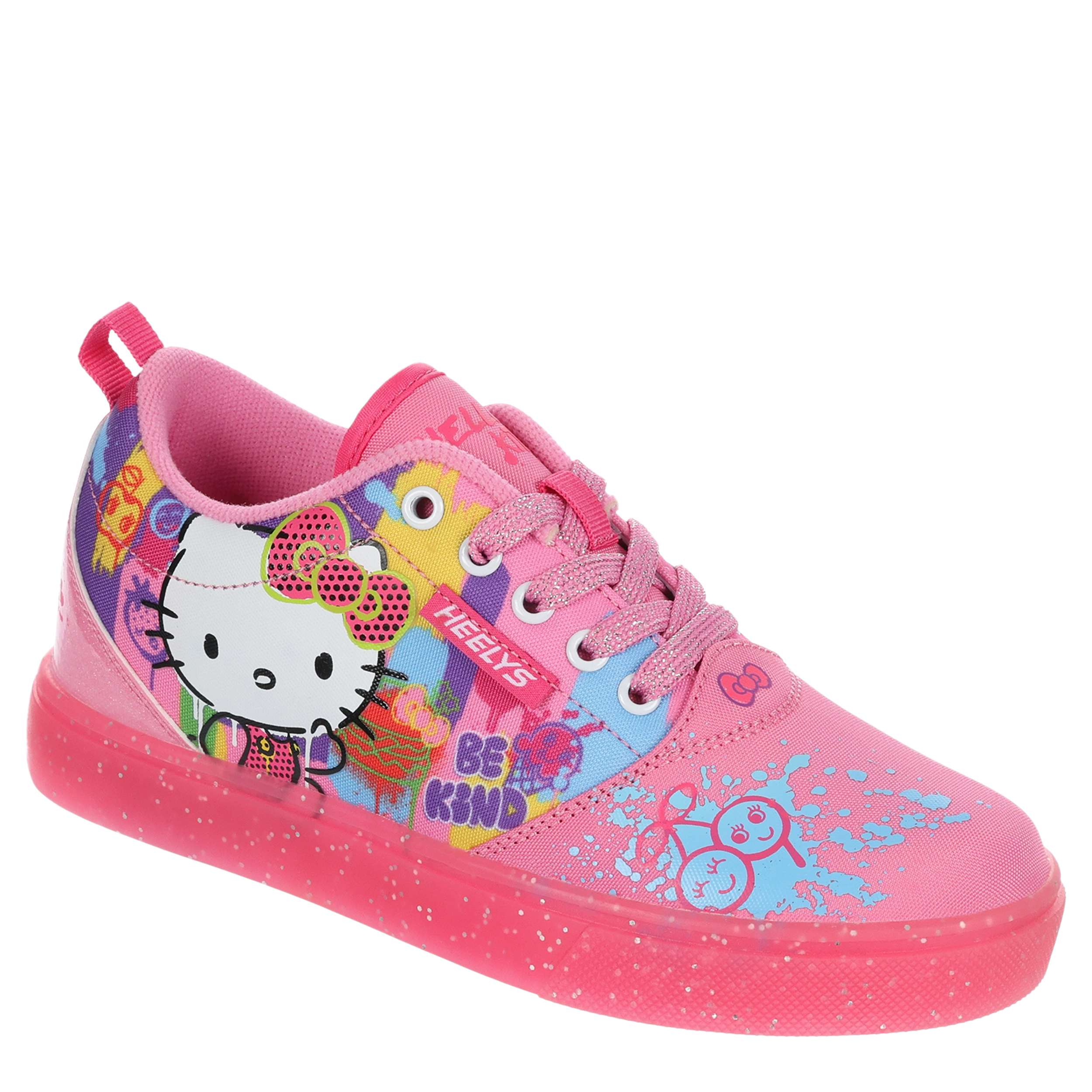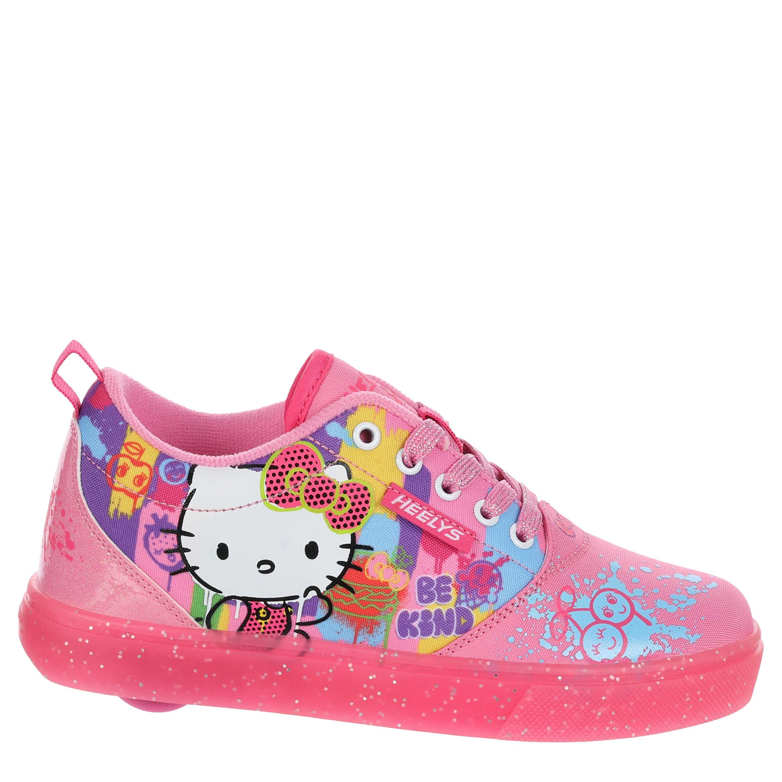 Switch up her style with the nylon canvas Heelys Pro 20 Hello Kitty girls' sneaker. Featuring a graffiti printed upper with large Hello Kitty on the side, this skate shoe also has glittery laces and a glitter patent heel. The padded footbed provides comfort while the outsole helps with durability.