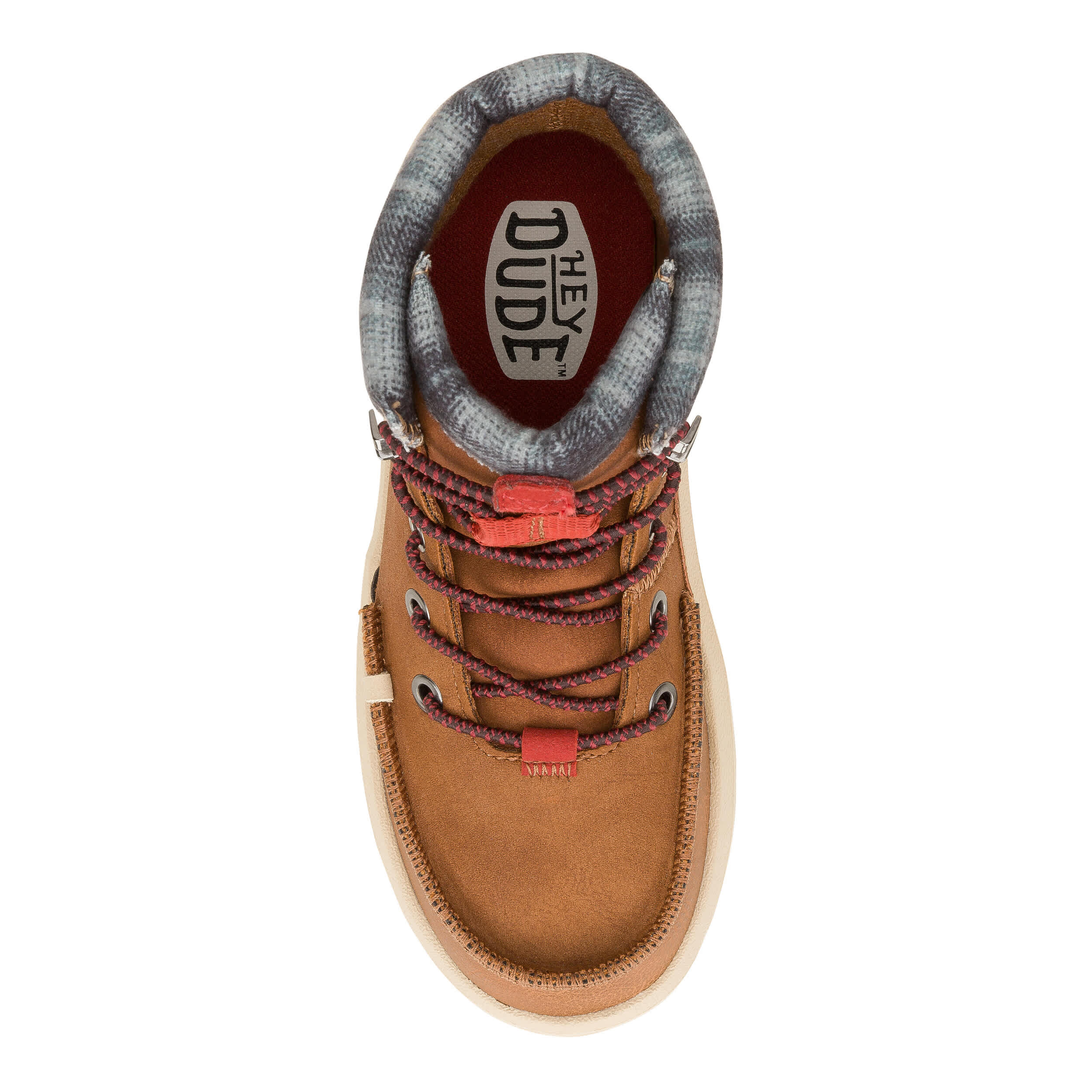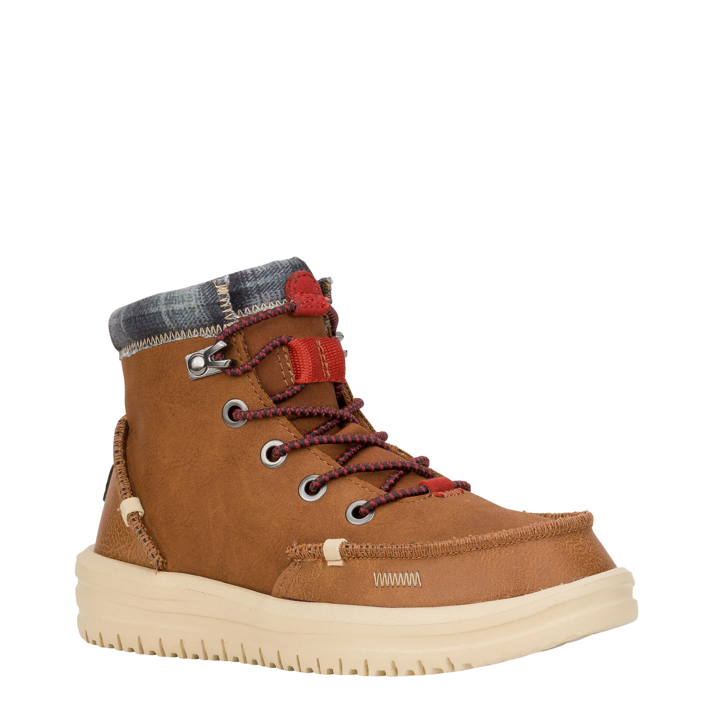 Send him out for the day in the lightweight HEYDUDE Bradley Youth boot. With a water-repellent leather upper featuring a Flex & Fold technology and textile collar for extra style, this lace-up boot has an easy-on system that make them a smart choice. The removable Memory Foam insole and leather lining offer ergonomic cushioning while the traction outsole keeps his rugged adventures confidently on task.
