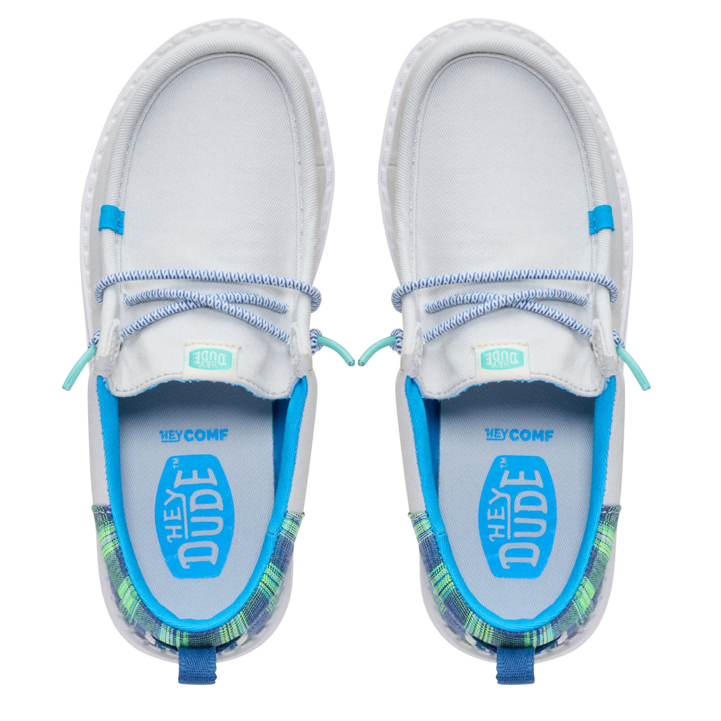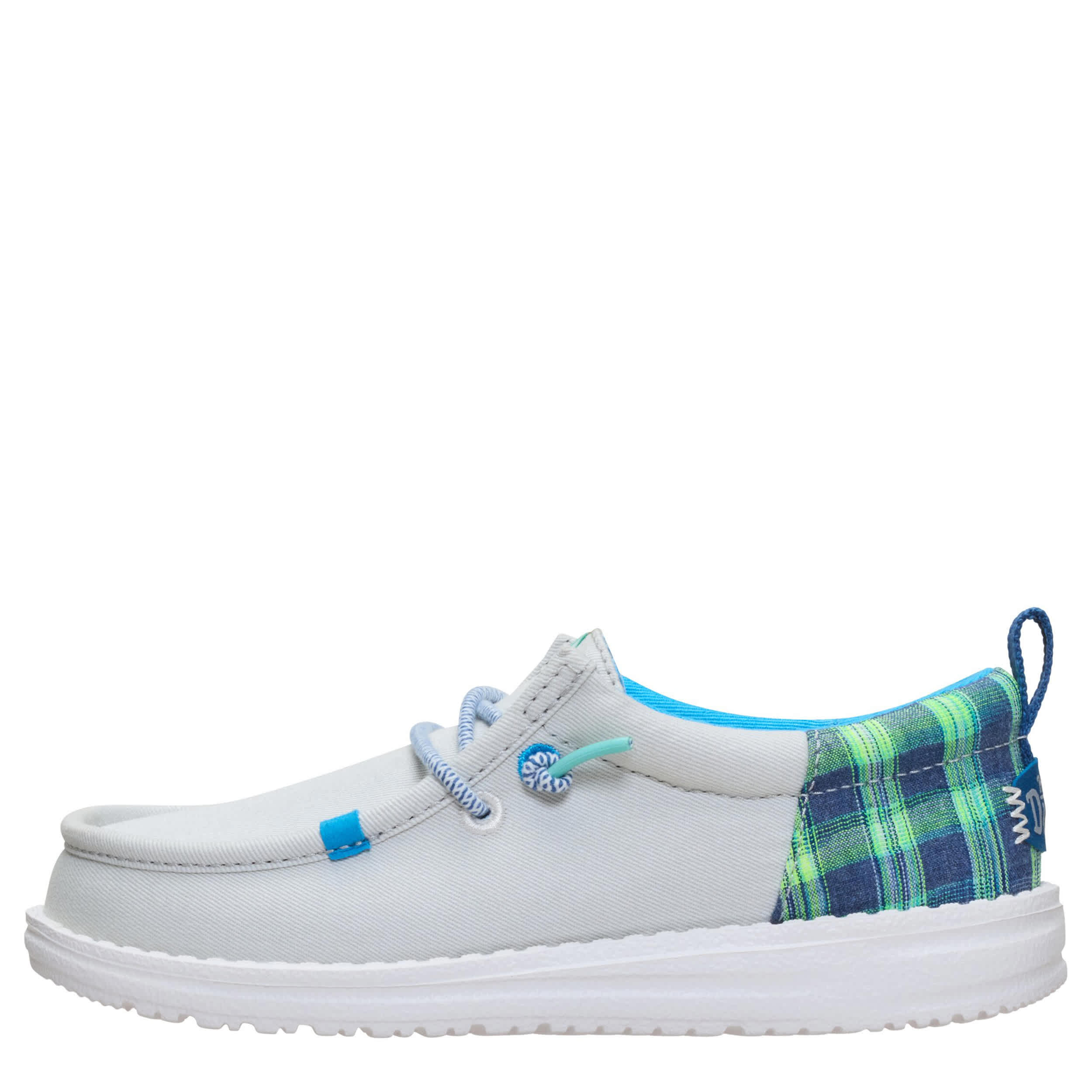 Pack up the springtime vibes in the HEYDUDE Wally Funk Youth Prep Plaid boys' slip-on sneaker and enjoy. Featuring a textile upper with a padded collar for extra comfort, this shoe also has a chambray plaid design on the heel. The foam cushioning comforts every step, while the flexible outsole sets him free to explore unfettered.