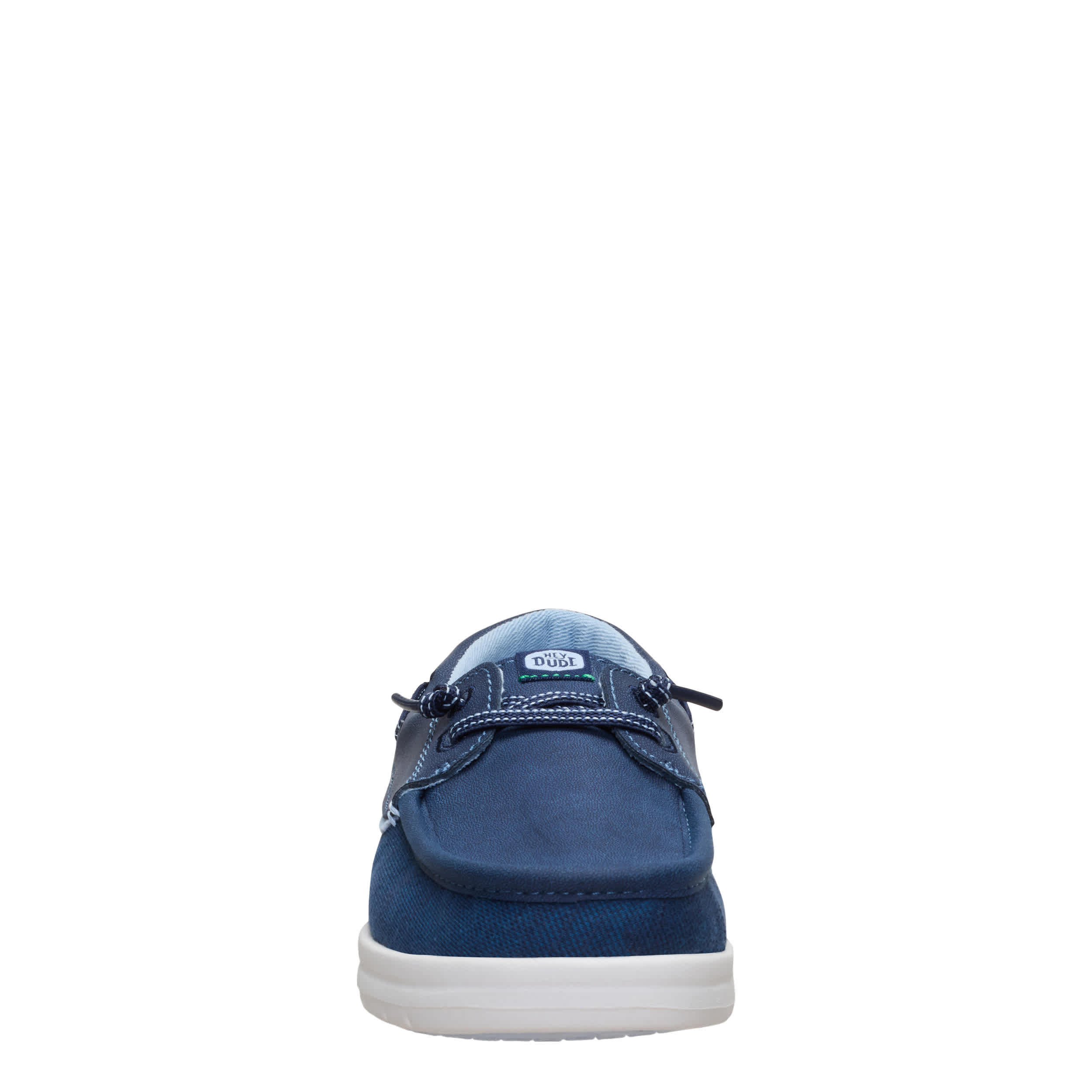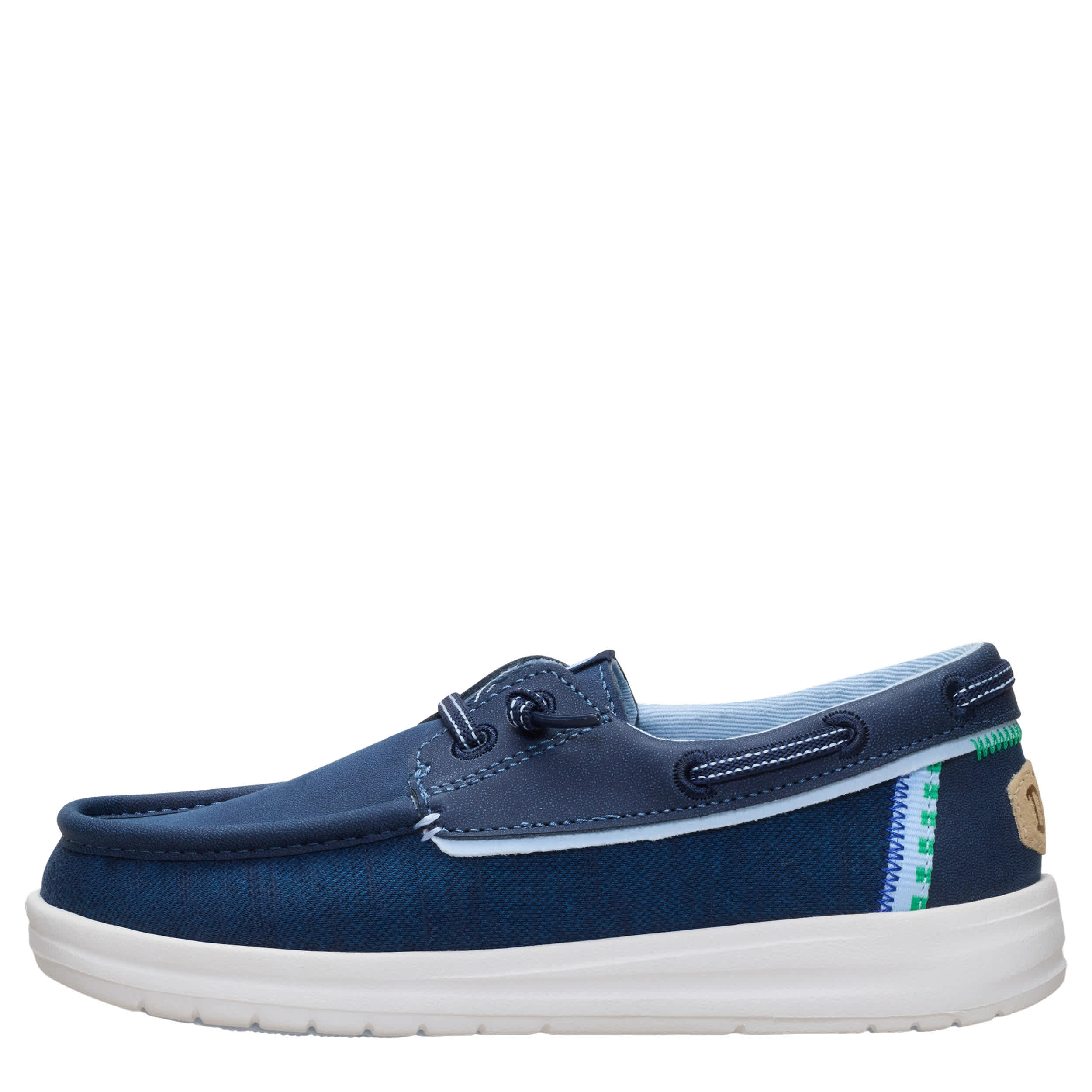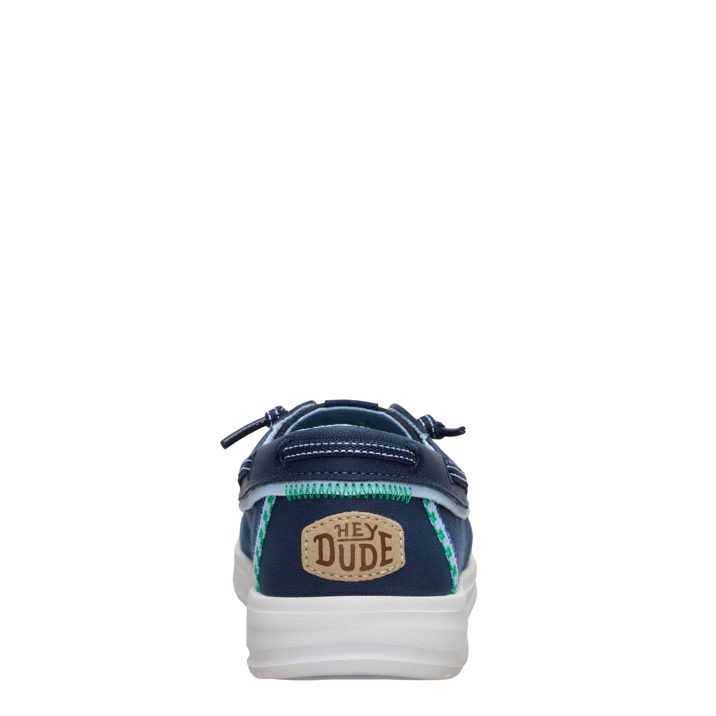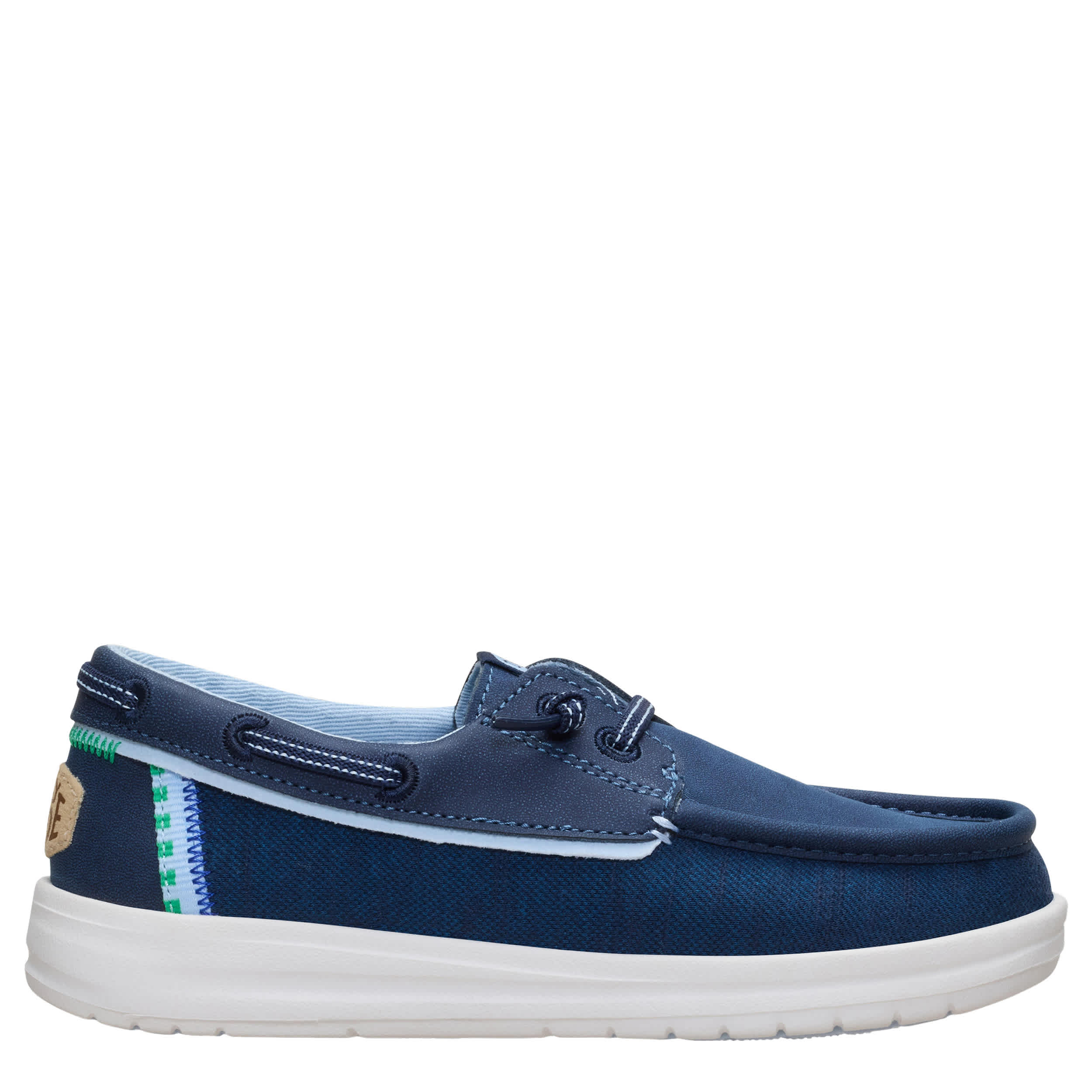 Enjoy the laidback style of the HEYDUDE Wells Classic boys' boat shoe. With a textile & faux leather upper featuring a padded collar, this slip-on shoe is great for casual walking or traveling. The removable insole protects his foot with every step, while the lightweight outsole provides fantastic traction on various surfaces.