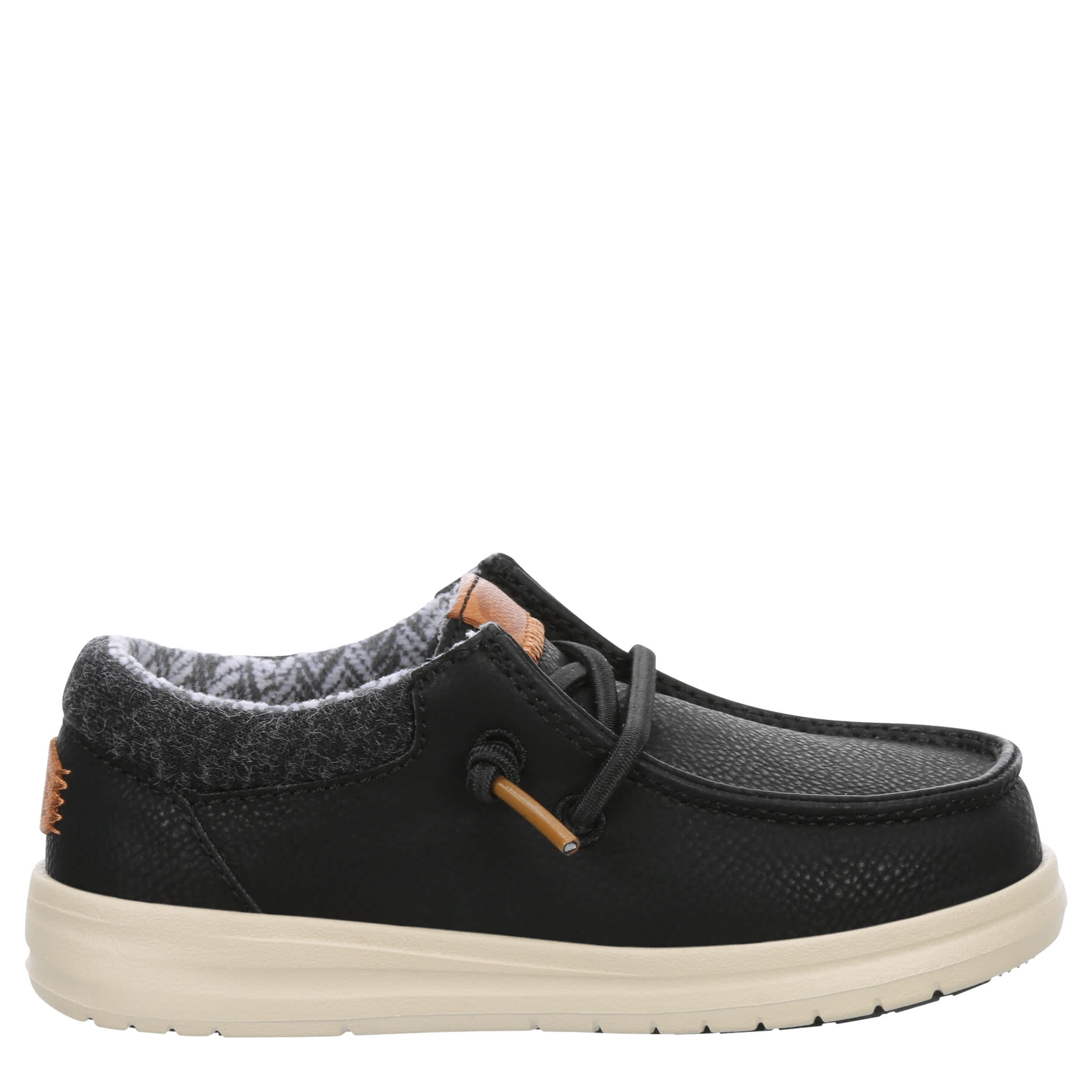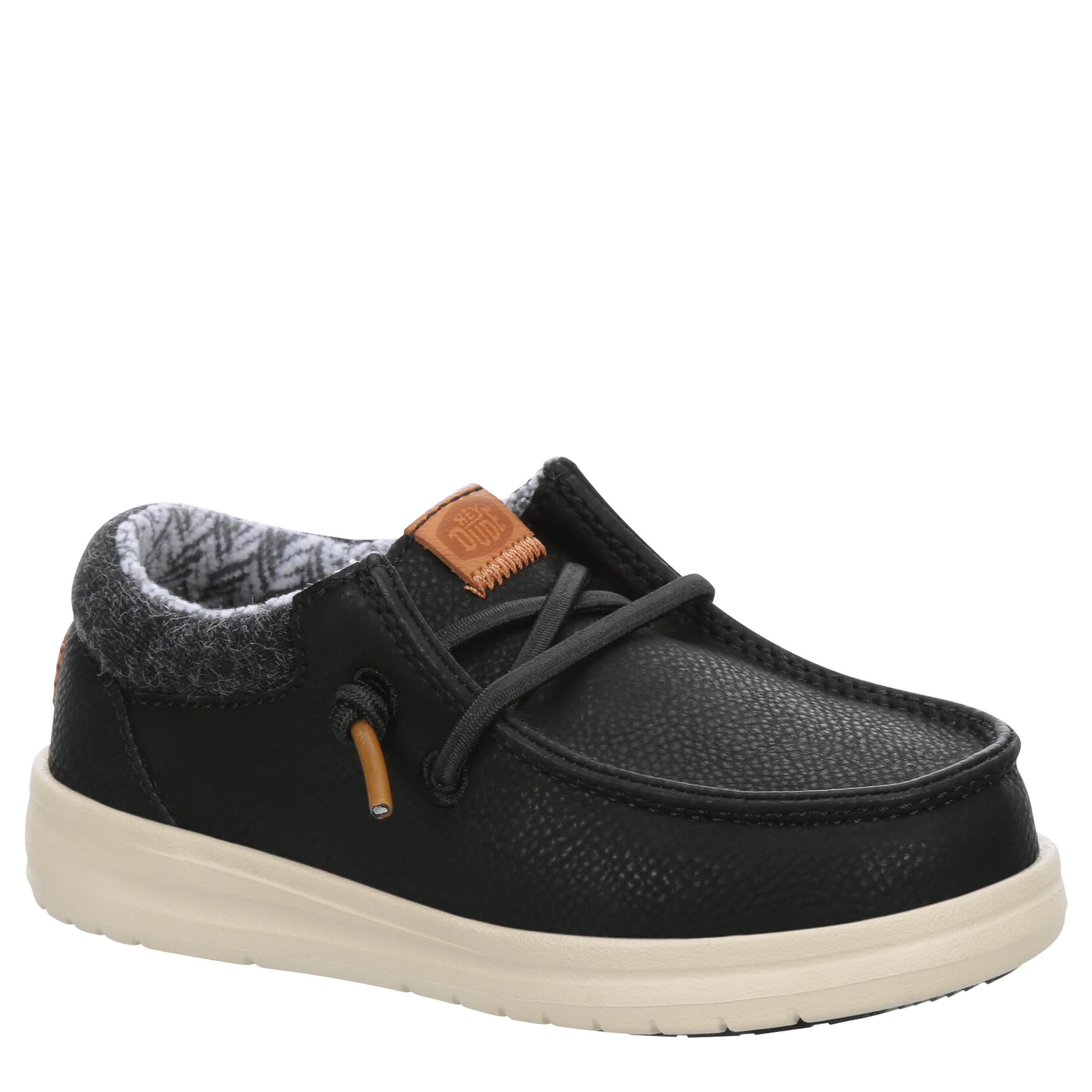 Update his little HEYDUDEs with the Paul Toddler slip-on sneaker. Featuring a water-resistant recycled leather upper with suede detailing for extra style and contrasting heel detail,this sneaker has an Easy-On bungee lacing system to grab and go. The removable footbed offers ergonomic cushioning, while the lightweight outsole sets him up for great traction.