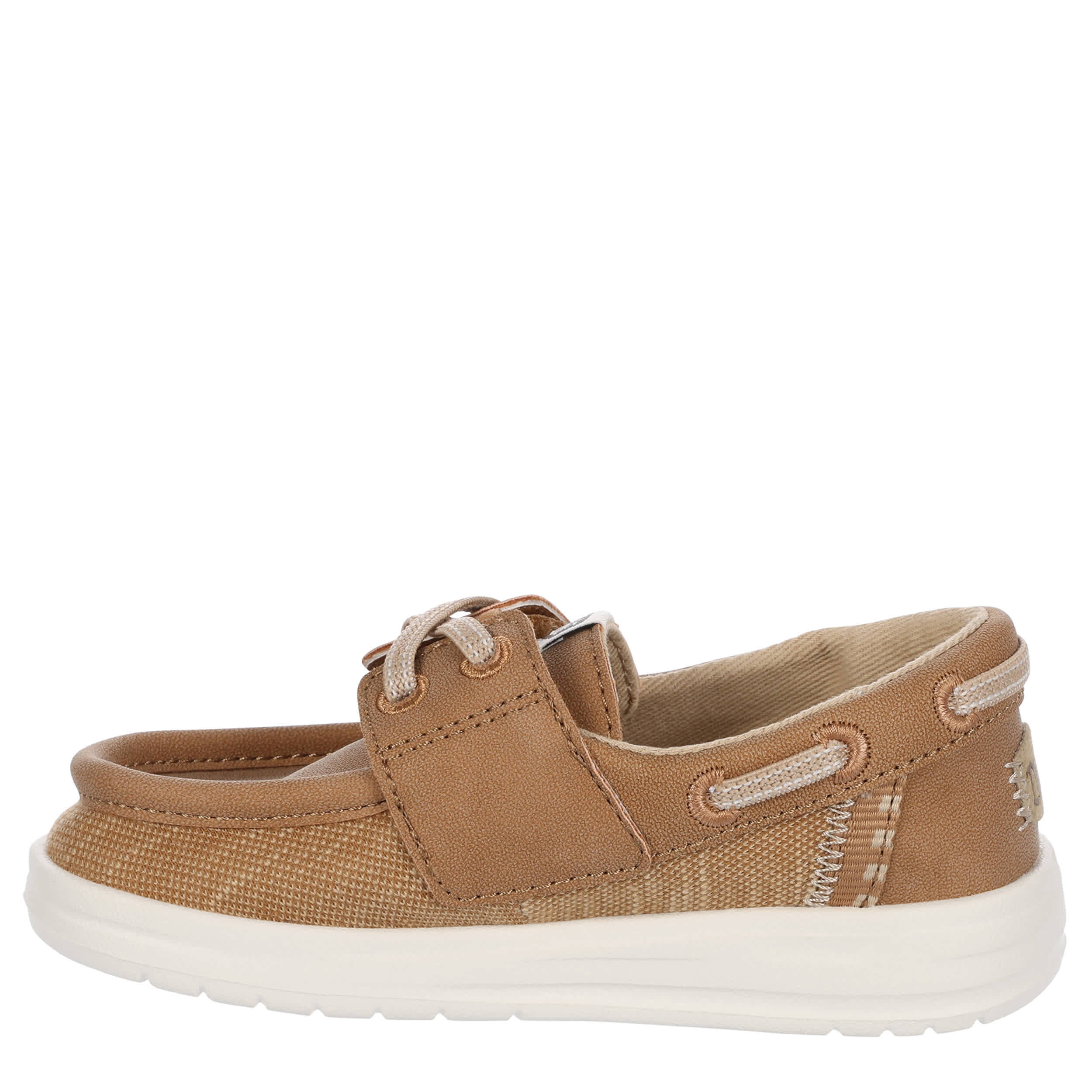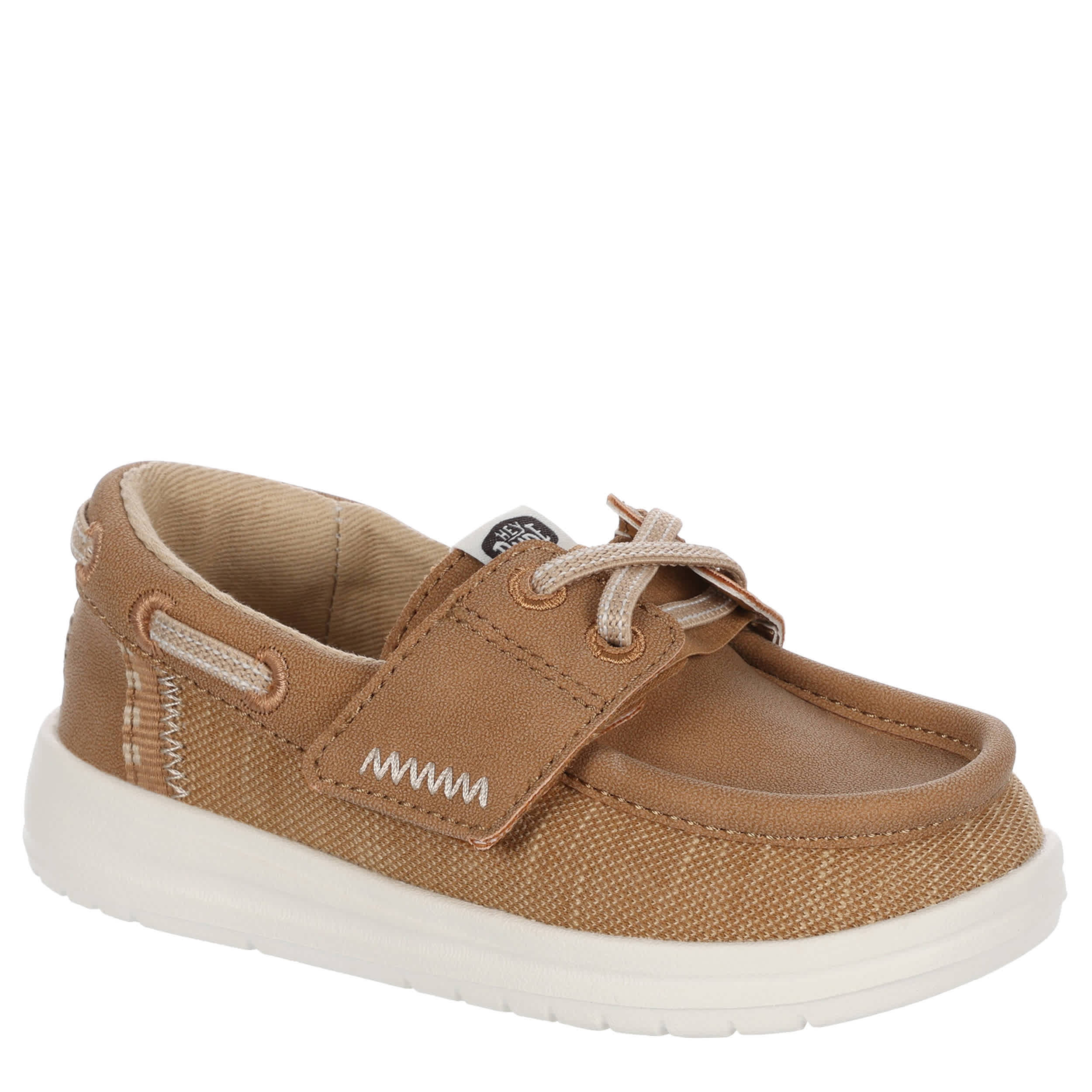 Enjoy the laidback style of the HEYDUDE Wells Classic infant boys' boat shoe. With a textile & faux leather upper featuring a padded collar, this easy-on shoe is great for casual walking or traveling. The removable insole protects his little foot with every step, while the lightweight outsole provides fantastic traction on various surfaces.