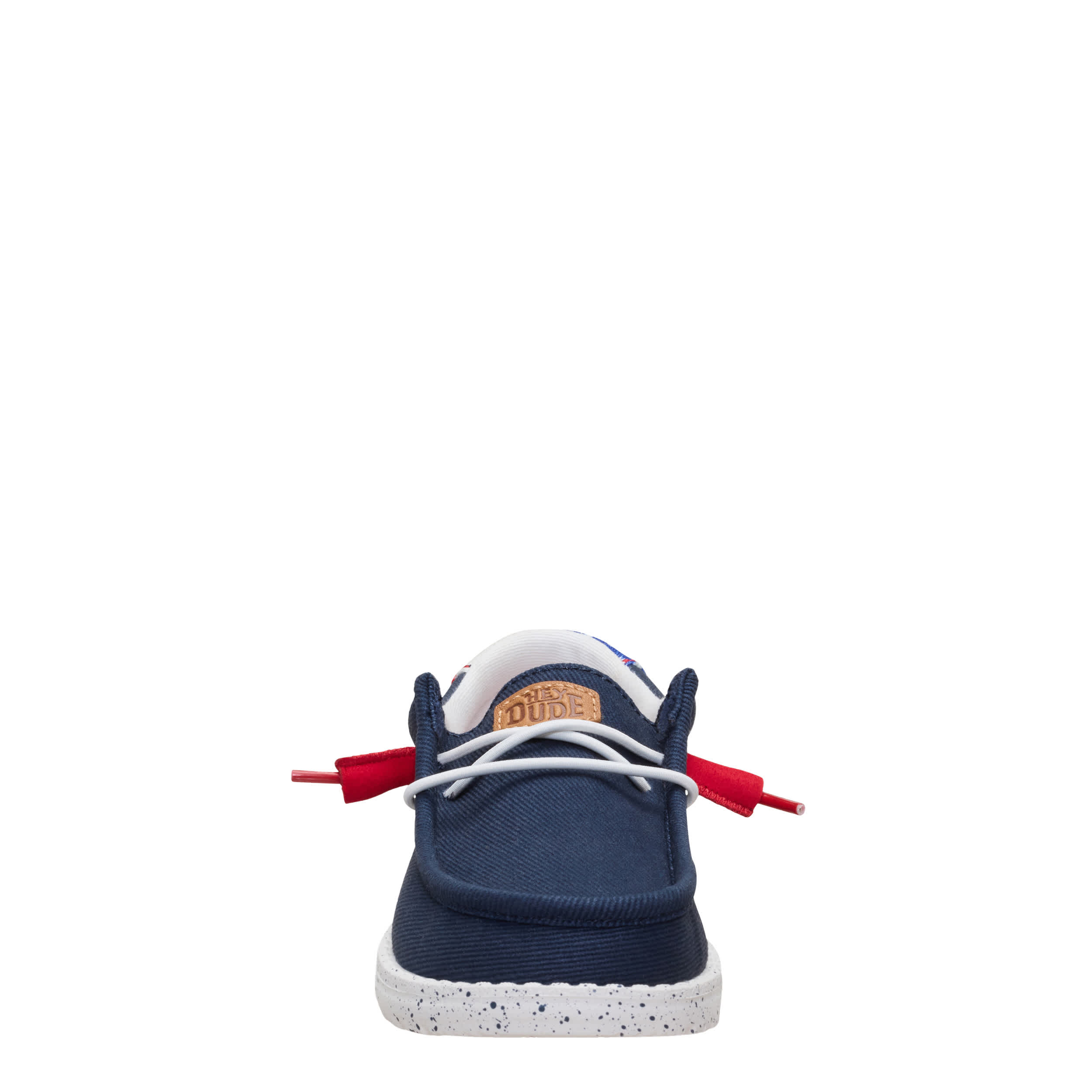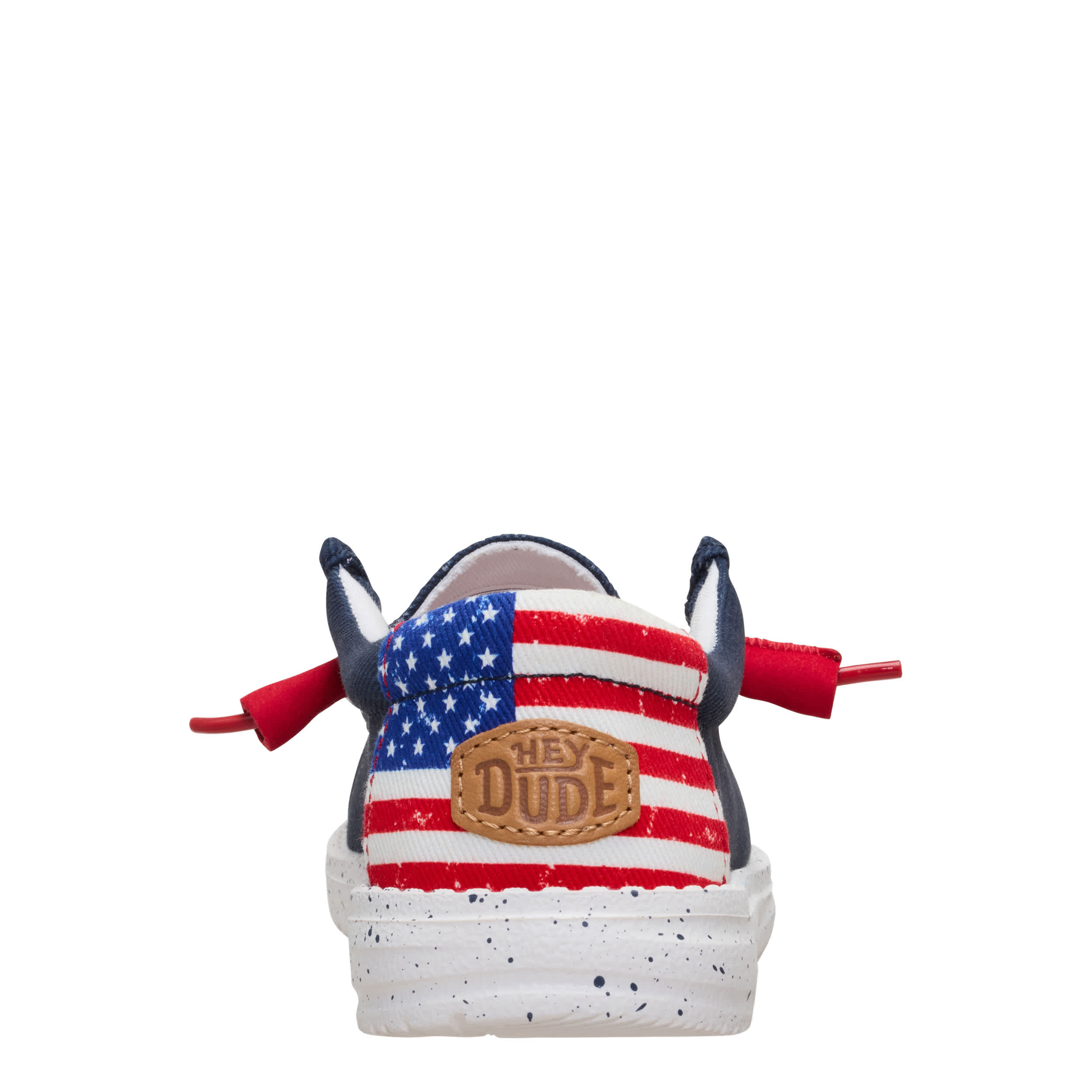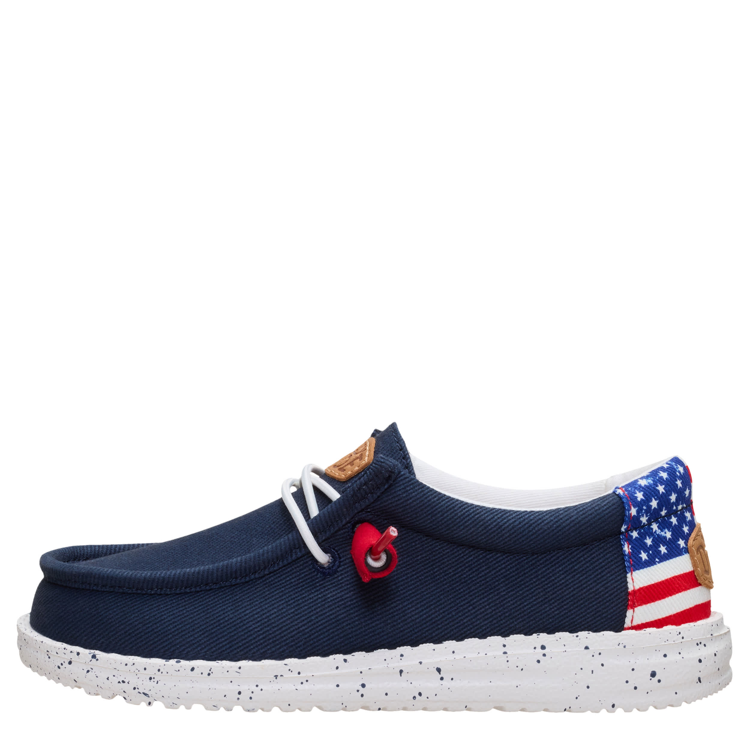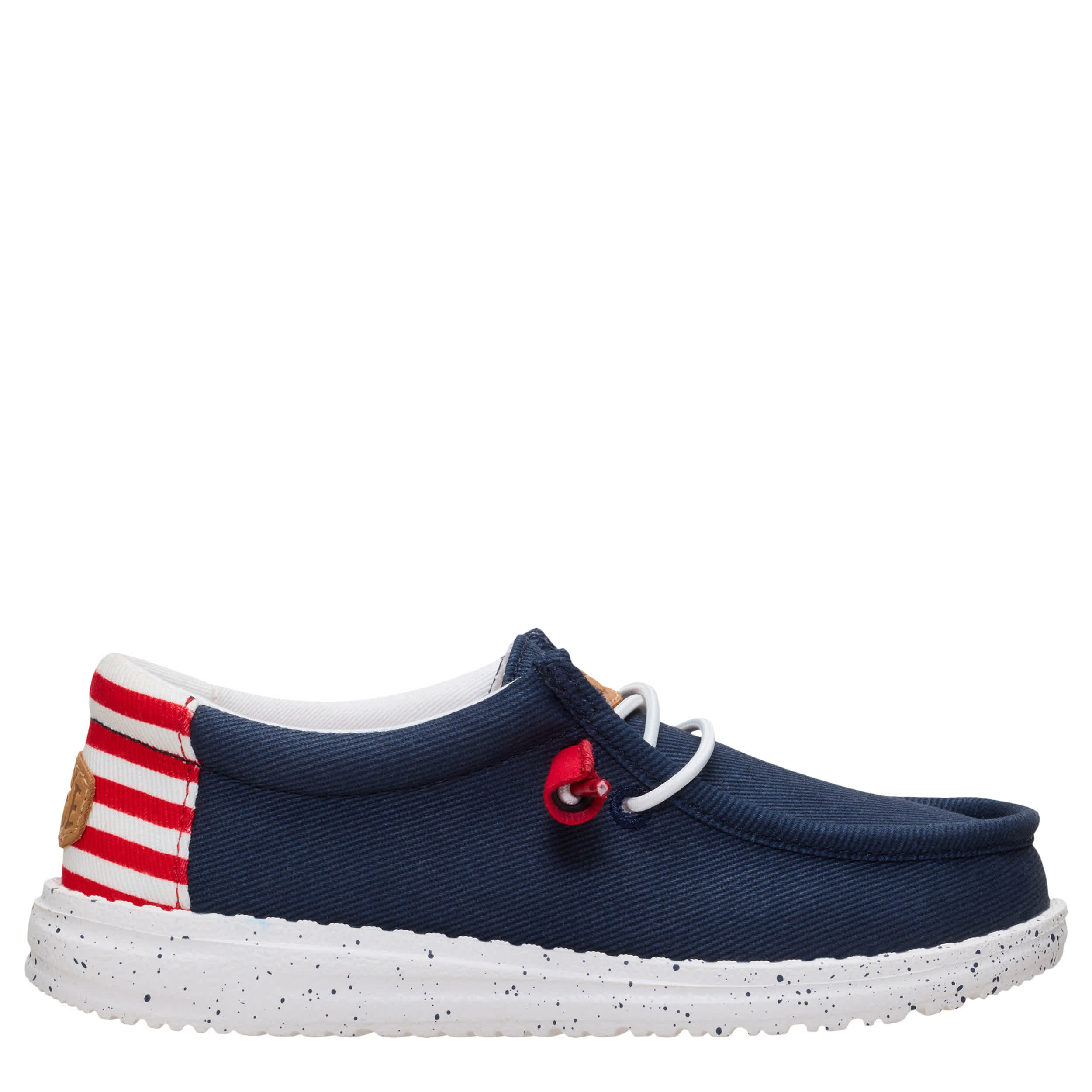 Cookout-ready with the HEYDUDE Wally Classic Youth boys' slip-on sneaker. Featuring a textile upper with a speckled midsole and American flag heel detail for extra style, these elastic-laced shoes are ready for the Fourth. The removable insole offers cushioning while the lightweight outsole is flexible enough free to explore unfettered.