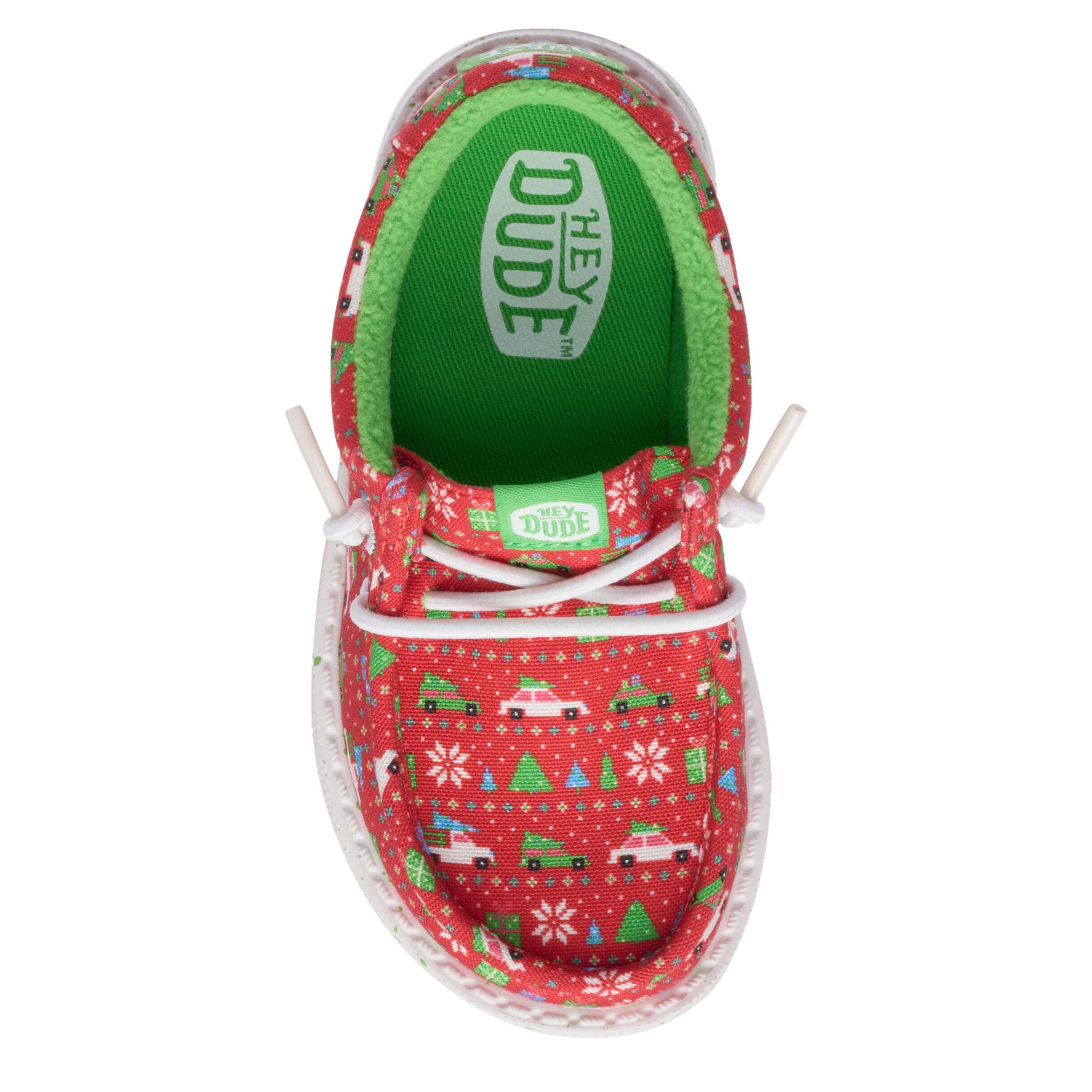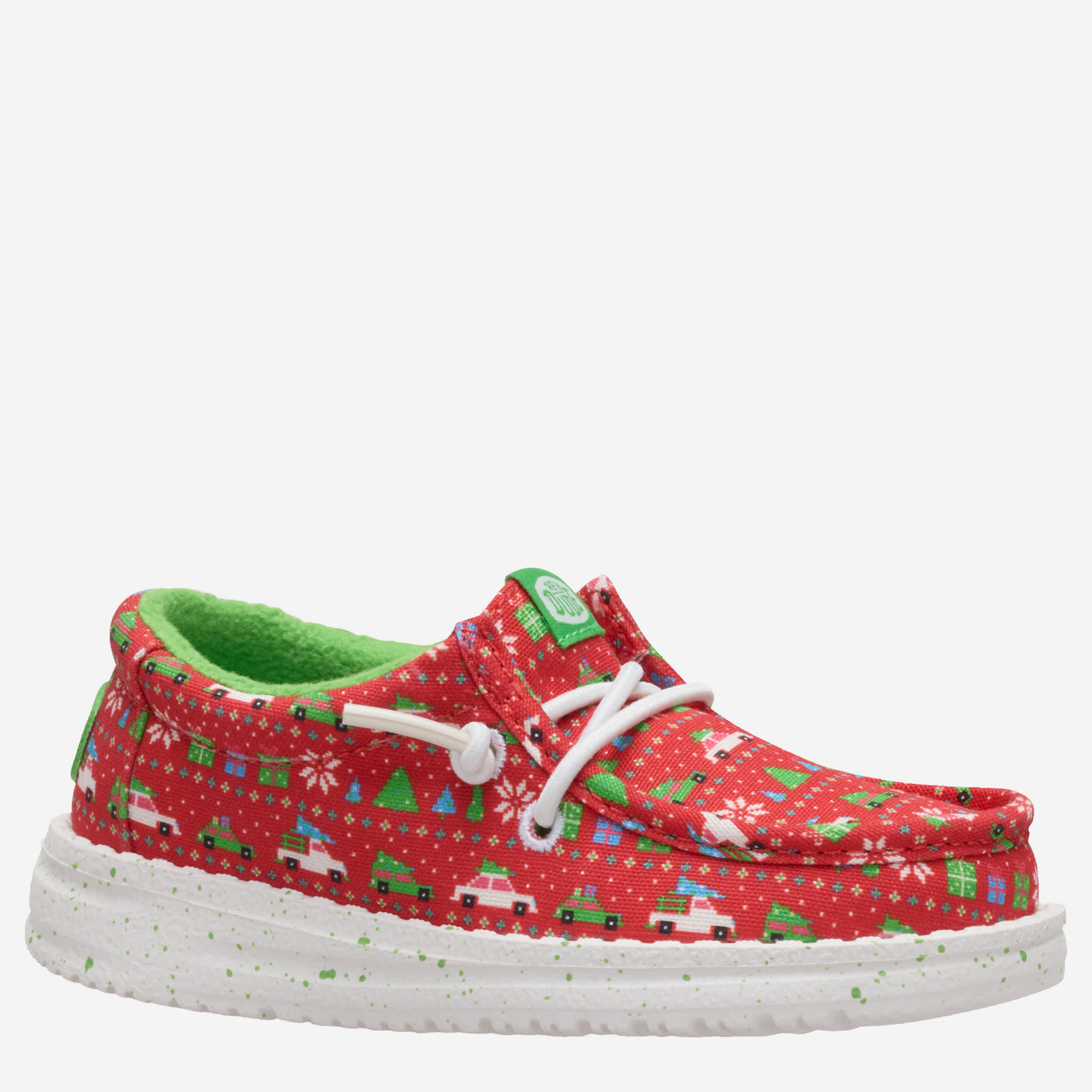Relax and leave the stress behind in the HEYDUDE Wally Holiday toddler boys' slip-on sneaker. With a textile upper featuring a holiday print for extra joy, this shoe has elastic laces for a secure fit. The removable insole offers cushioning while the ultralight outsole sets him free to explore unfettered.