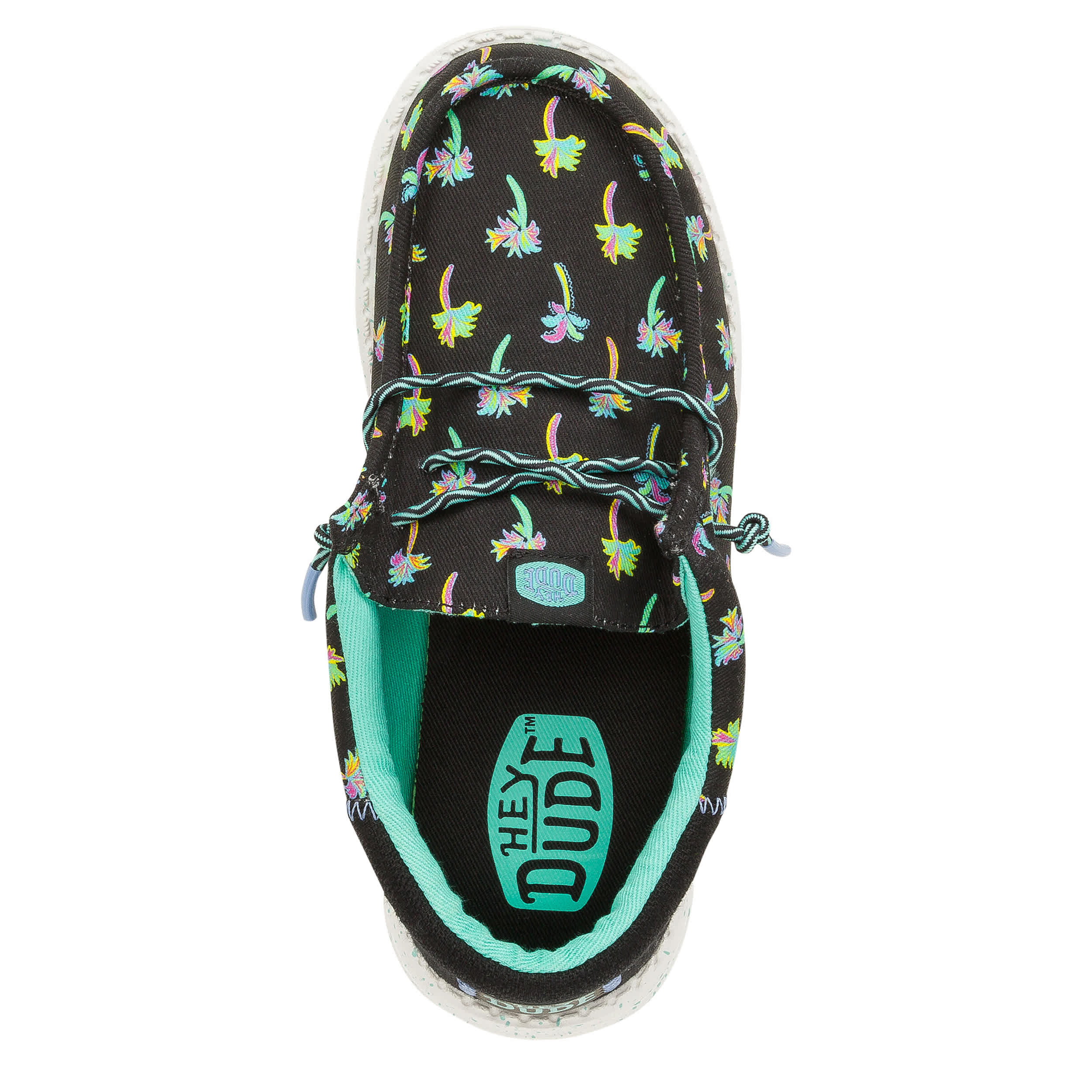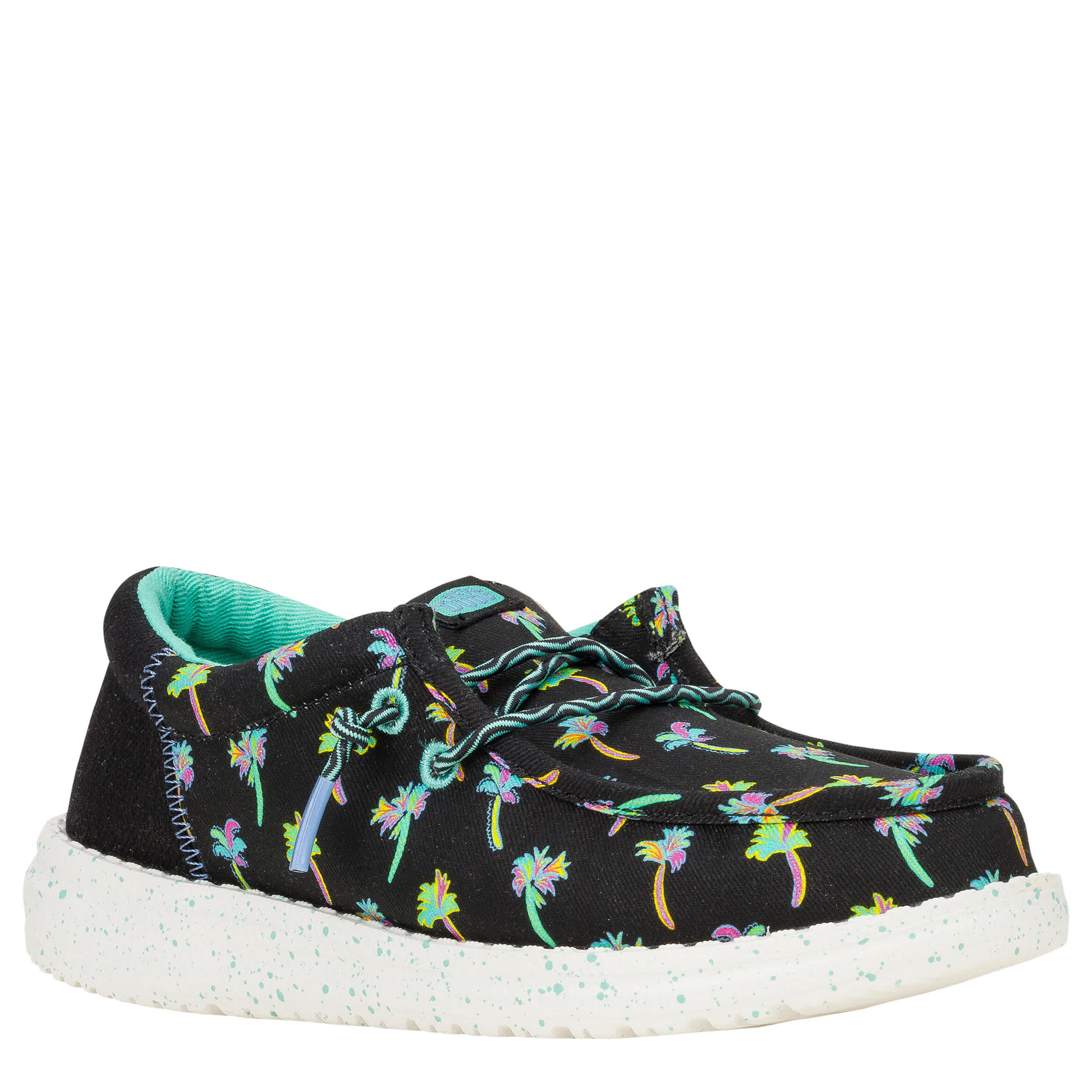 Get excited for the lightweight HEYDUDE Wally Funk Youth Tropical Palm slip-on sneaker. With a printed upper featuring a woven design heel for extra fun, and color pop lacing, this shoe is great for summer or school. Foam cushioning comforts his steps, while the EVA outsole sets him free to explore.