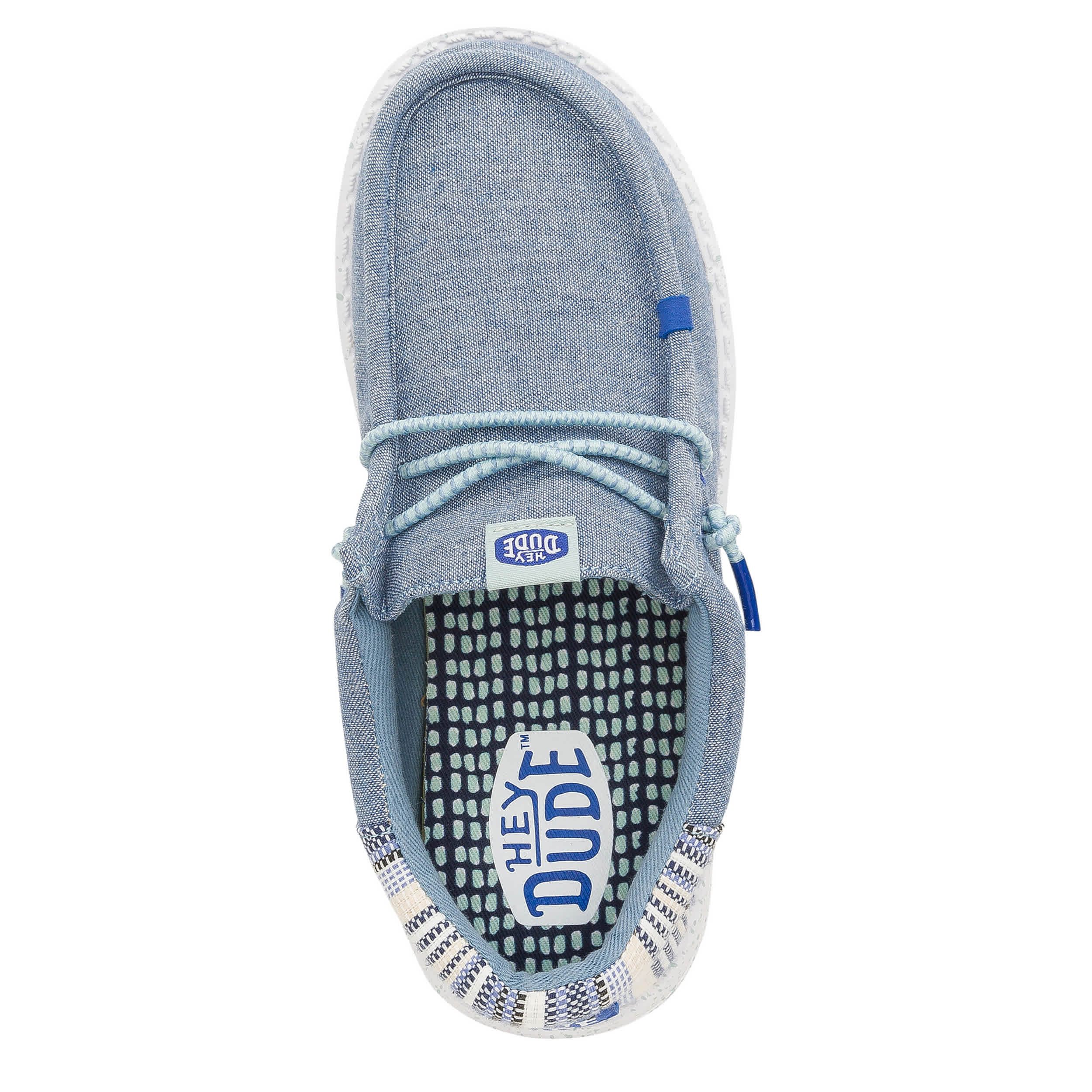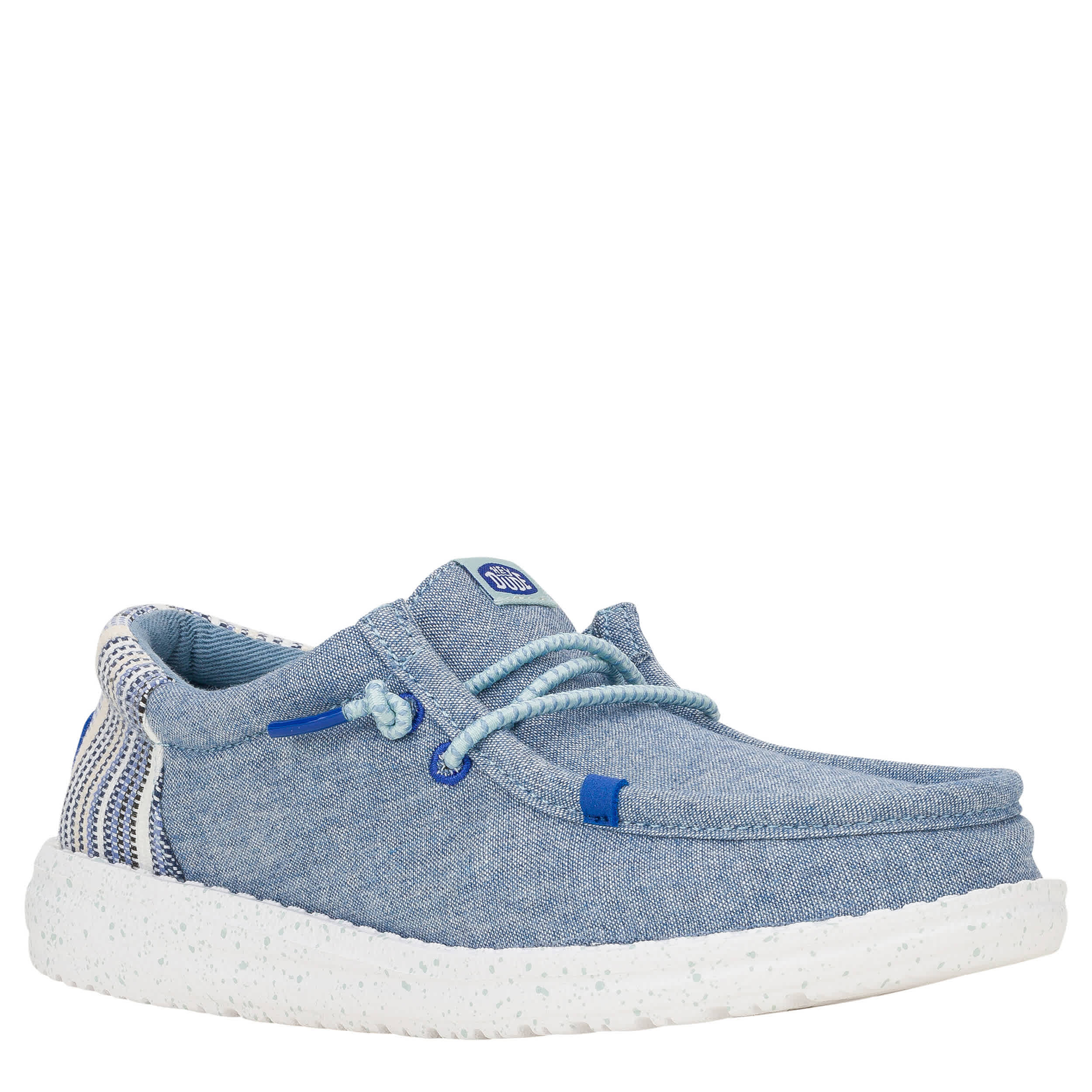 Get excited for the lightweight HEYDUDE Wally Funk Youth Craft slip-on sneaker. With a chambray upper featuring a woven design heel for extra fun, and color pop lacing, this shoe is great for summer or school. Foam cushioning comforts his steps, while the EVA outsole sets him free to explore.