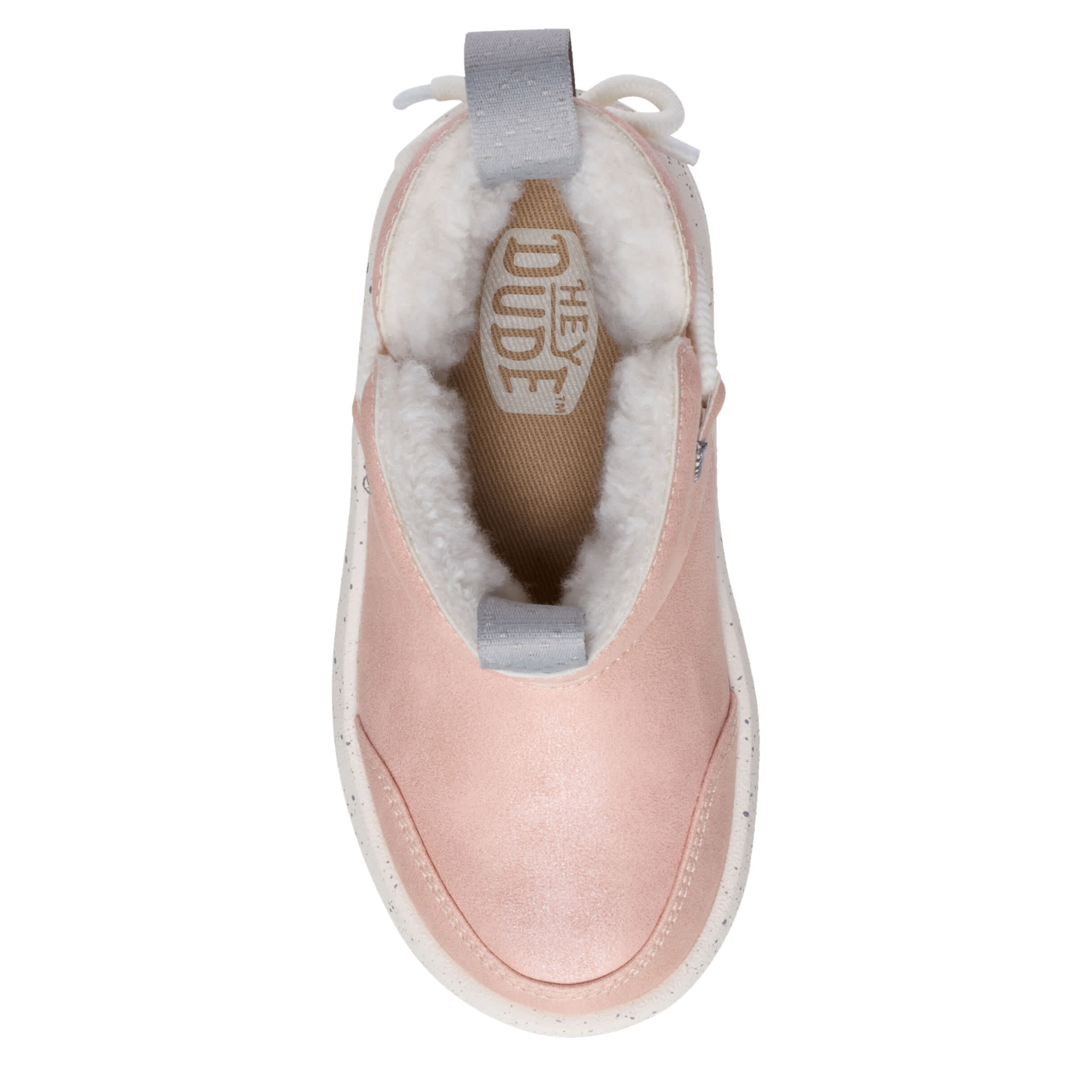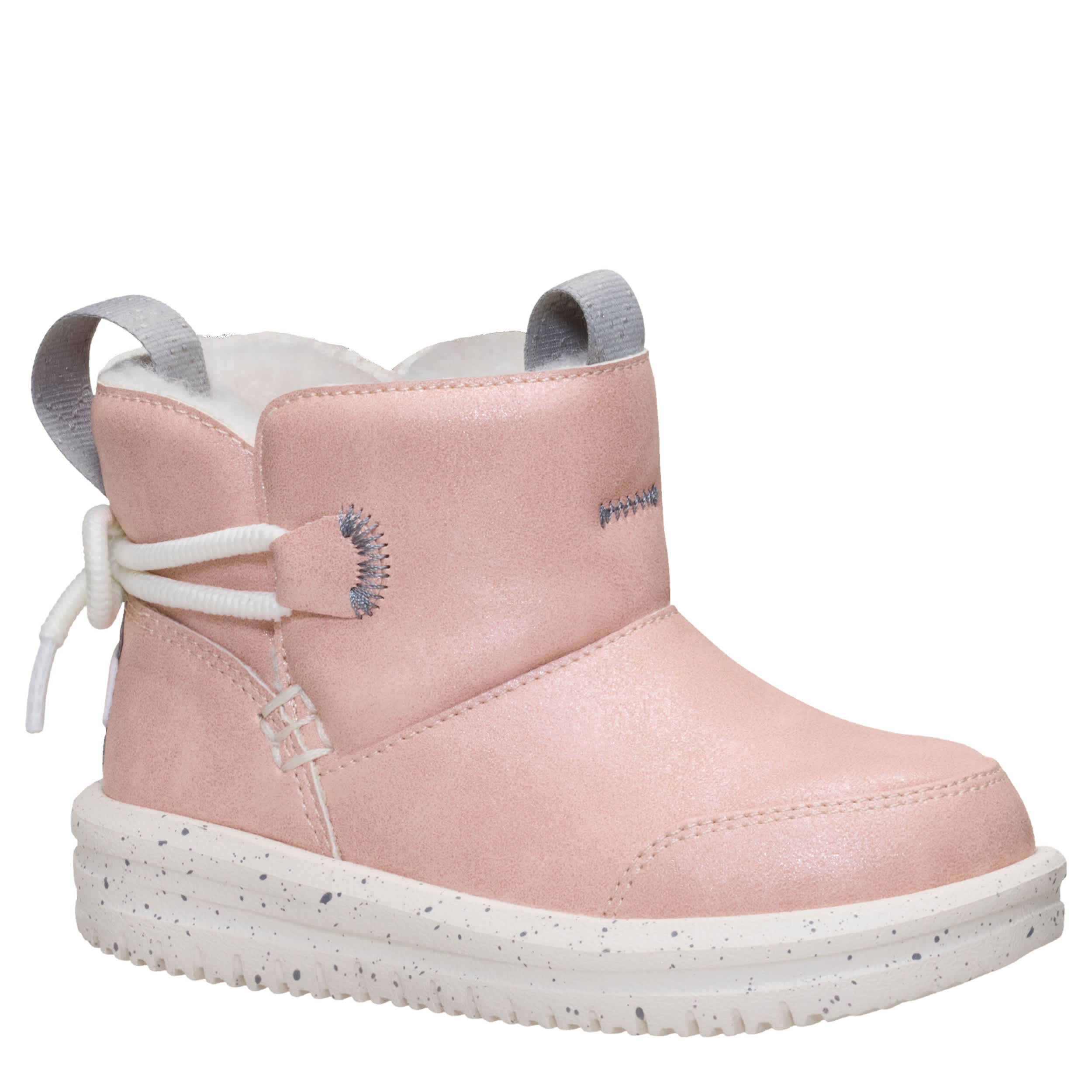 Cutesy and functional, the HEYDUDE Camden Toddler infant girls' boot keeps her cozy. With a sparkly faux suede upper featuring dual pull tabs and plush sherpa for warm comfort, this easy-on boot is travel ready. The cushy insole and speckled midsole keep her little winter adventures confidently on task.