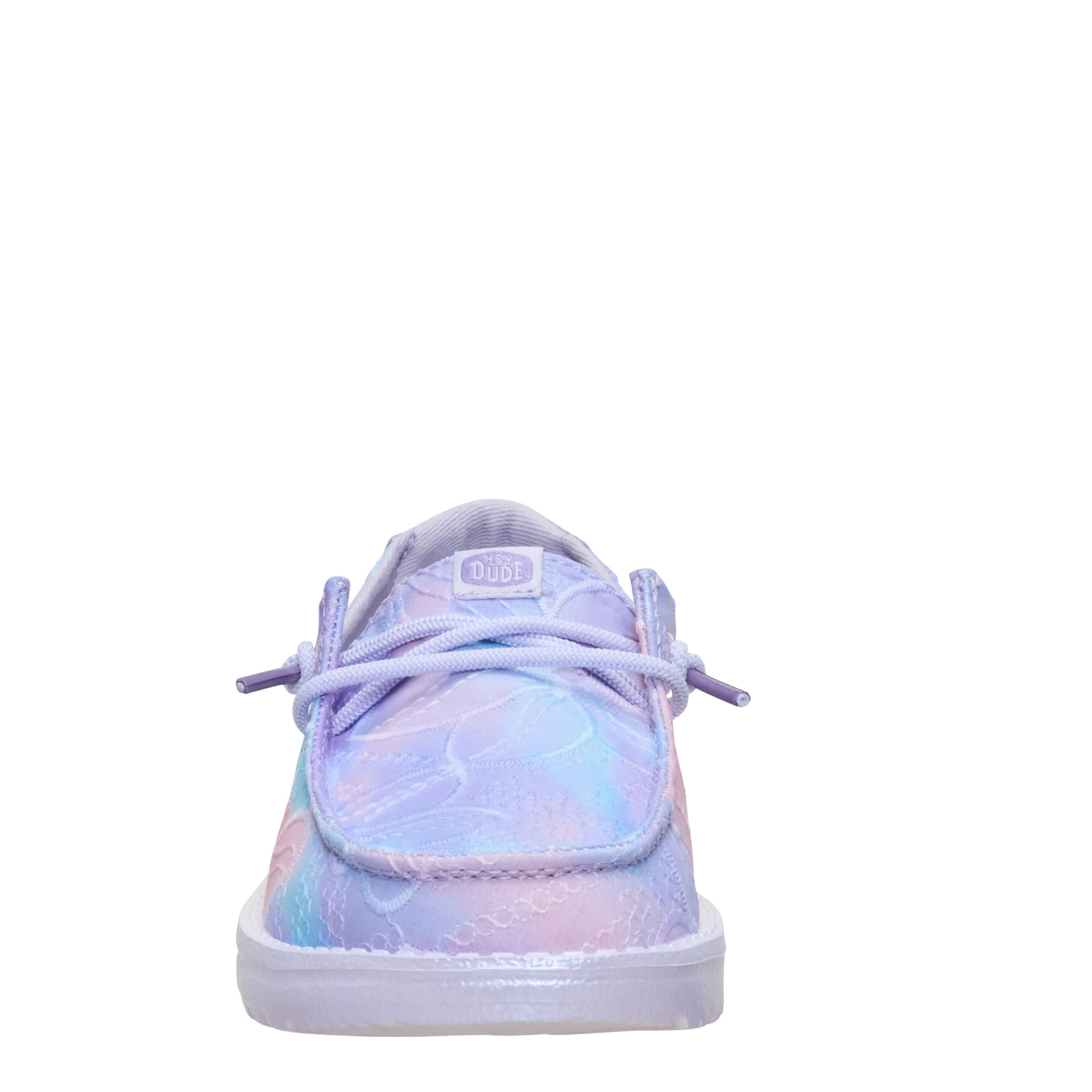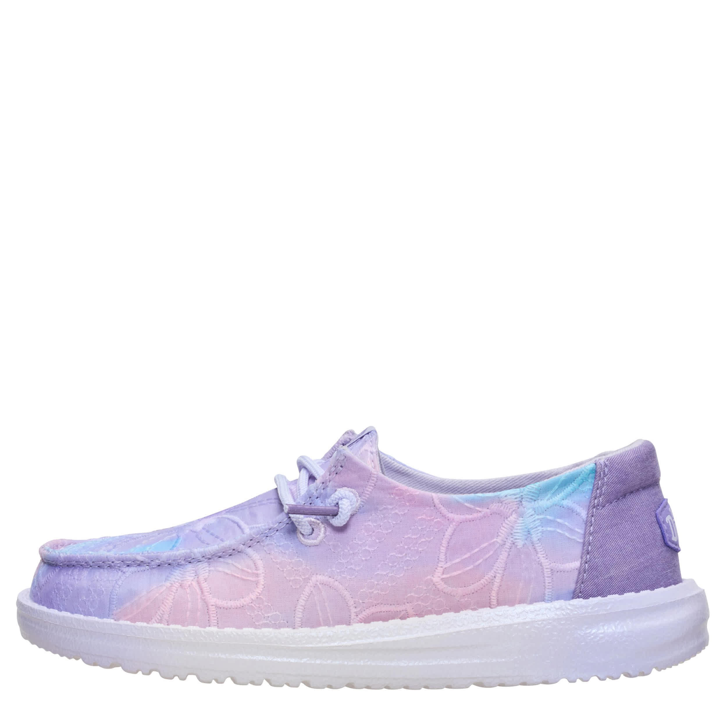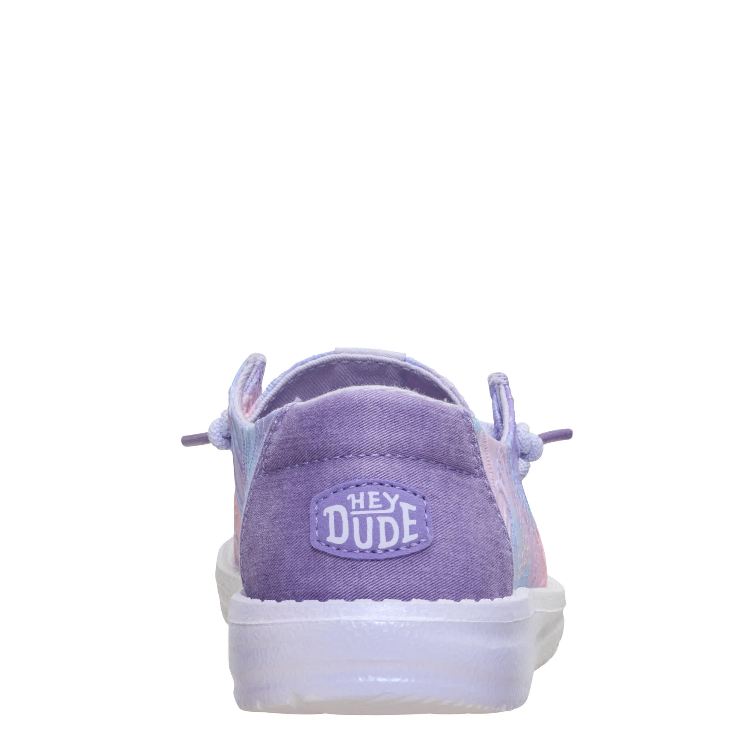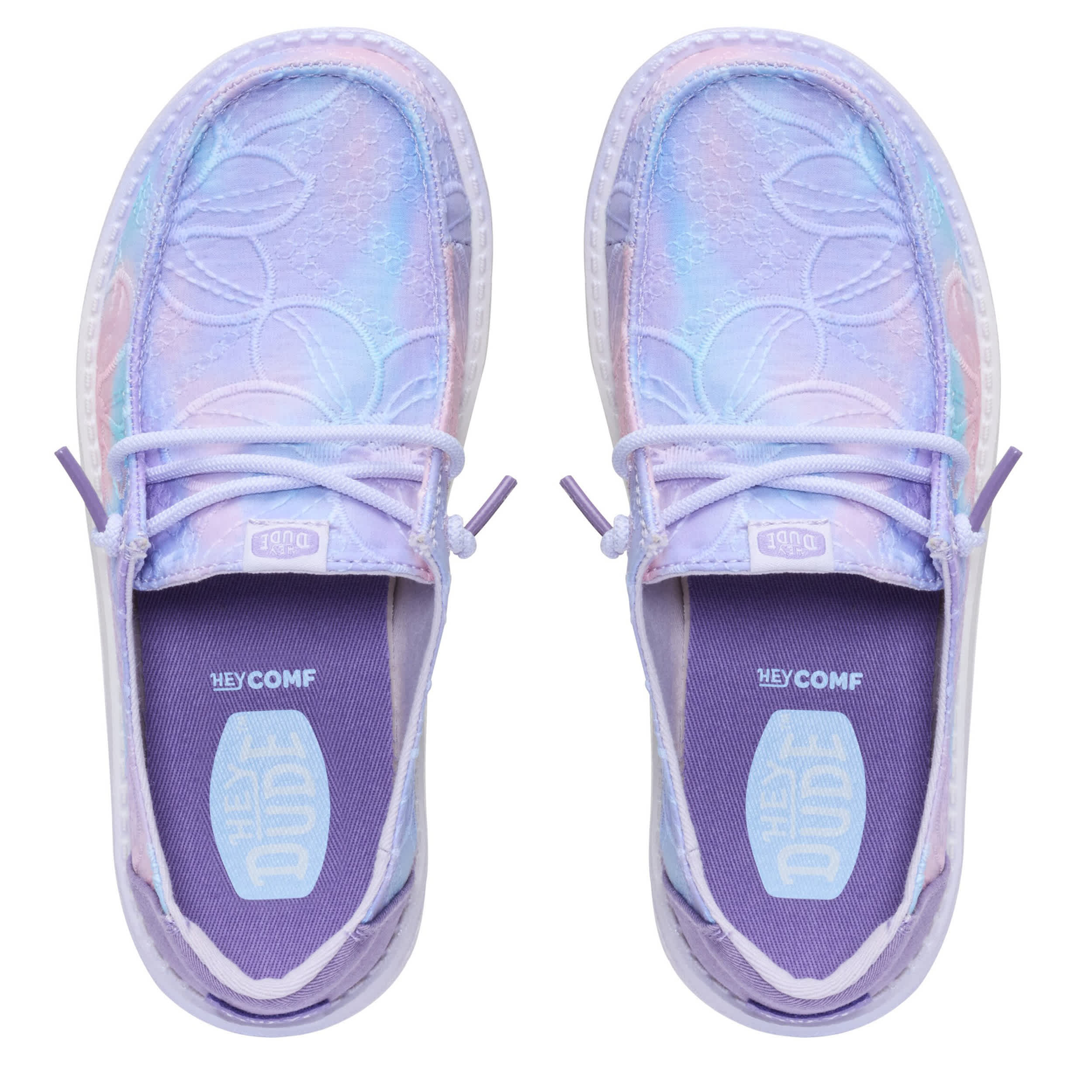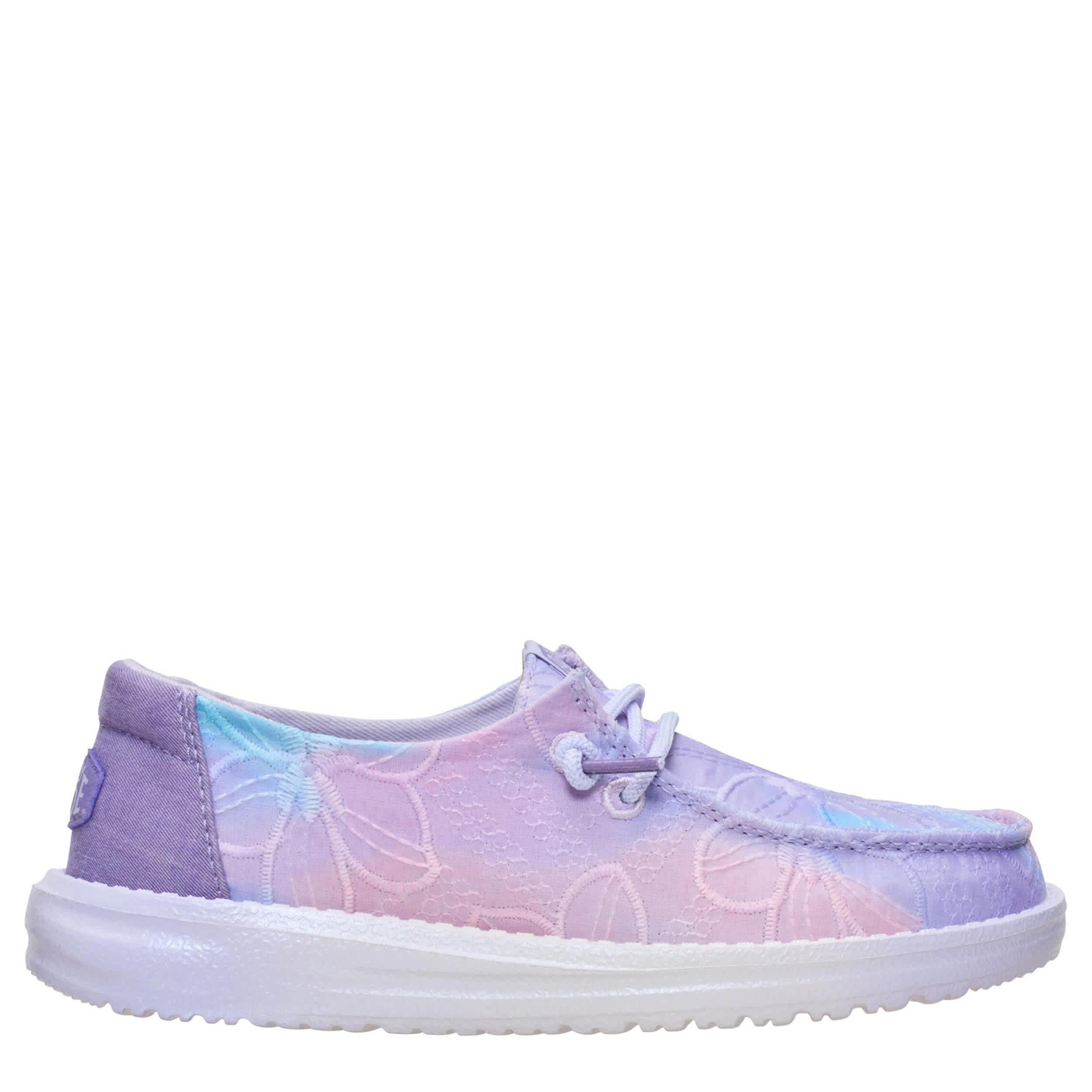 in the HEYDUDE Wendy Youth Ombre Floral slip-on sneaker. With an embroidered textile upper featuring an ombre floral pattern, this sneaker is eye-catching. The removable foam insole offers comfort and cushioning, while the ultralight outsole sets her free to explore unfettered.
