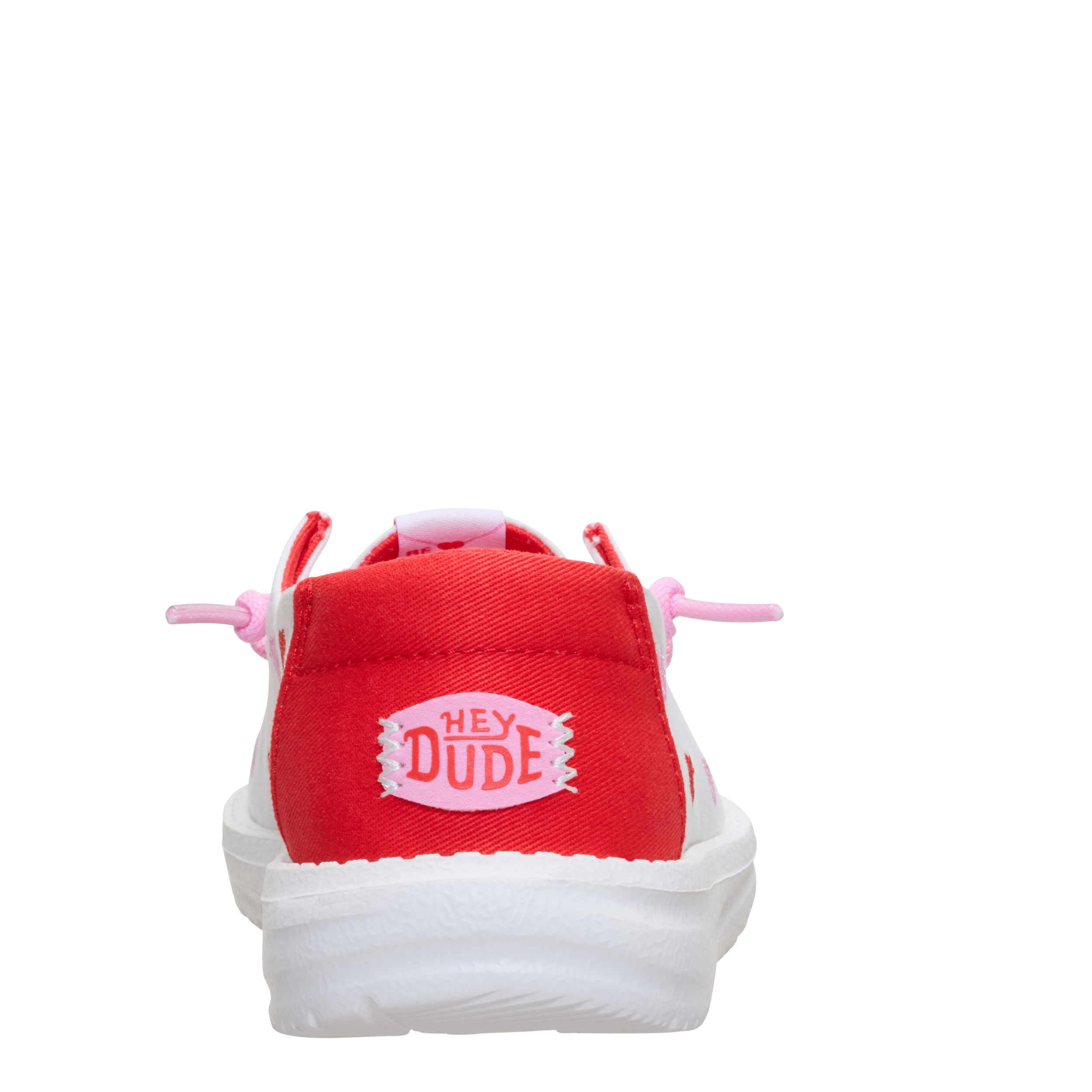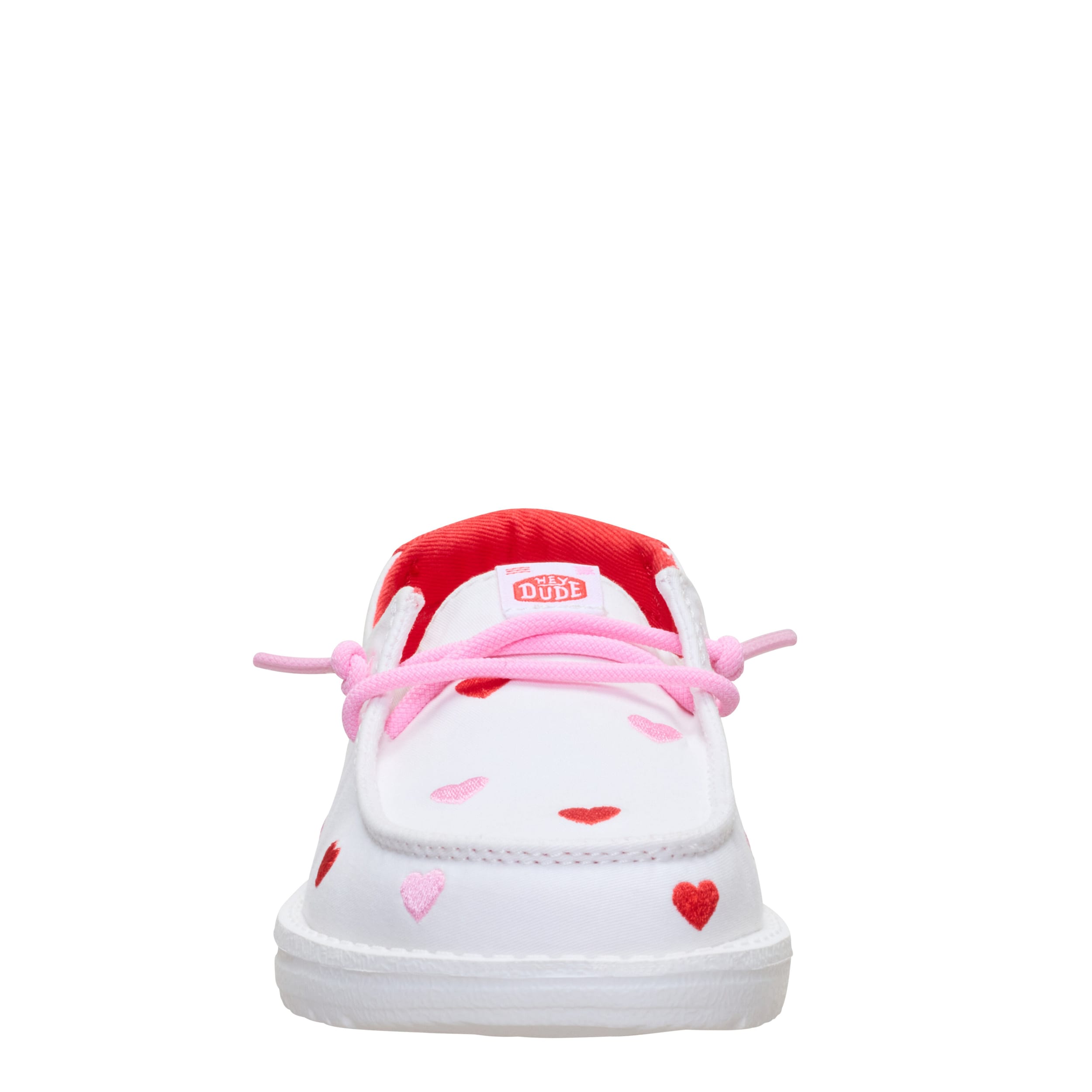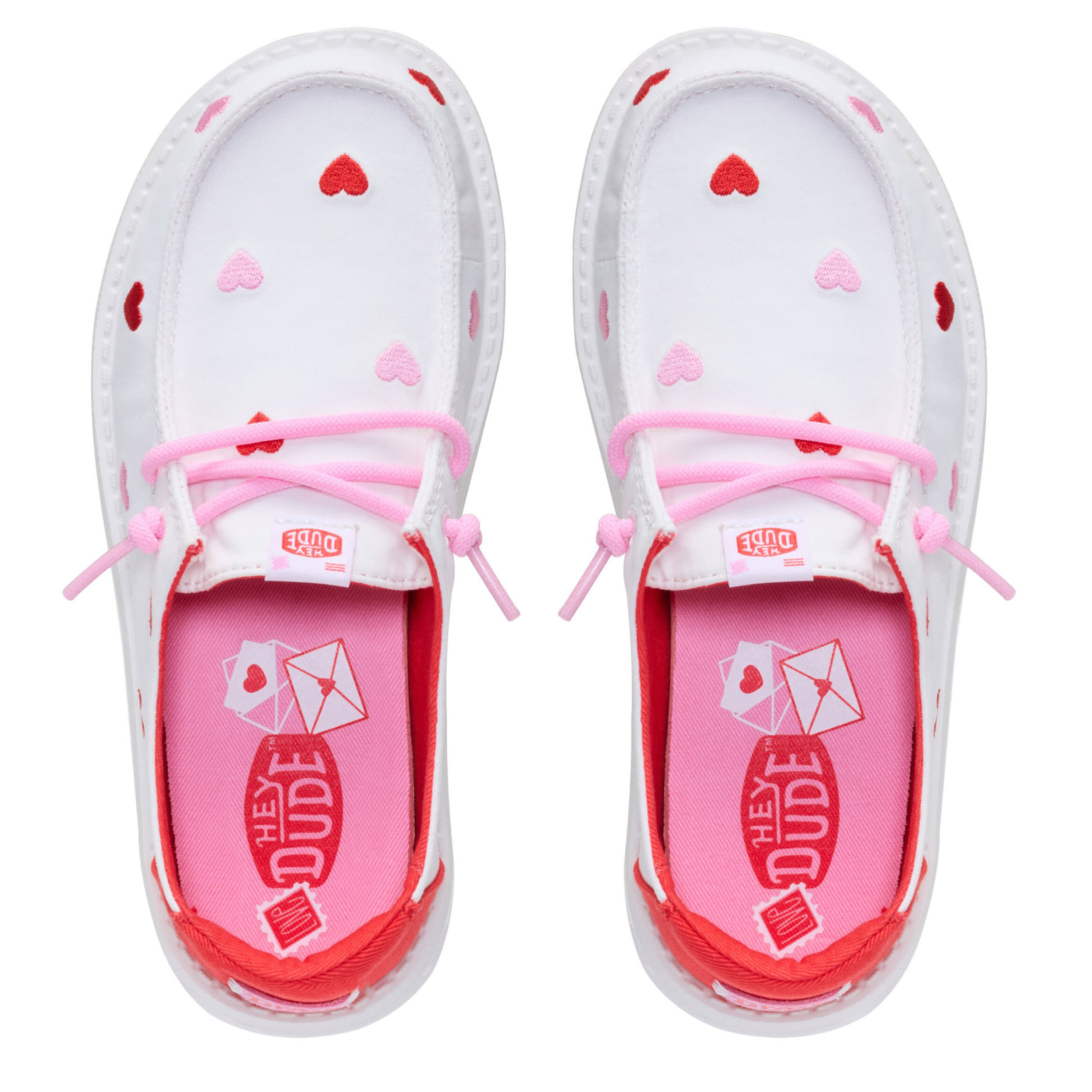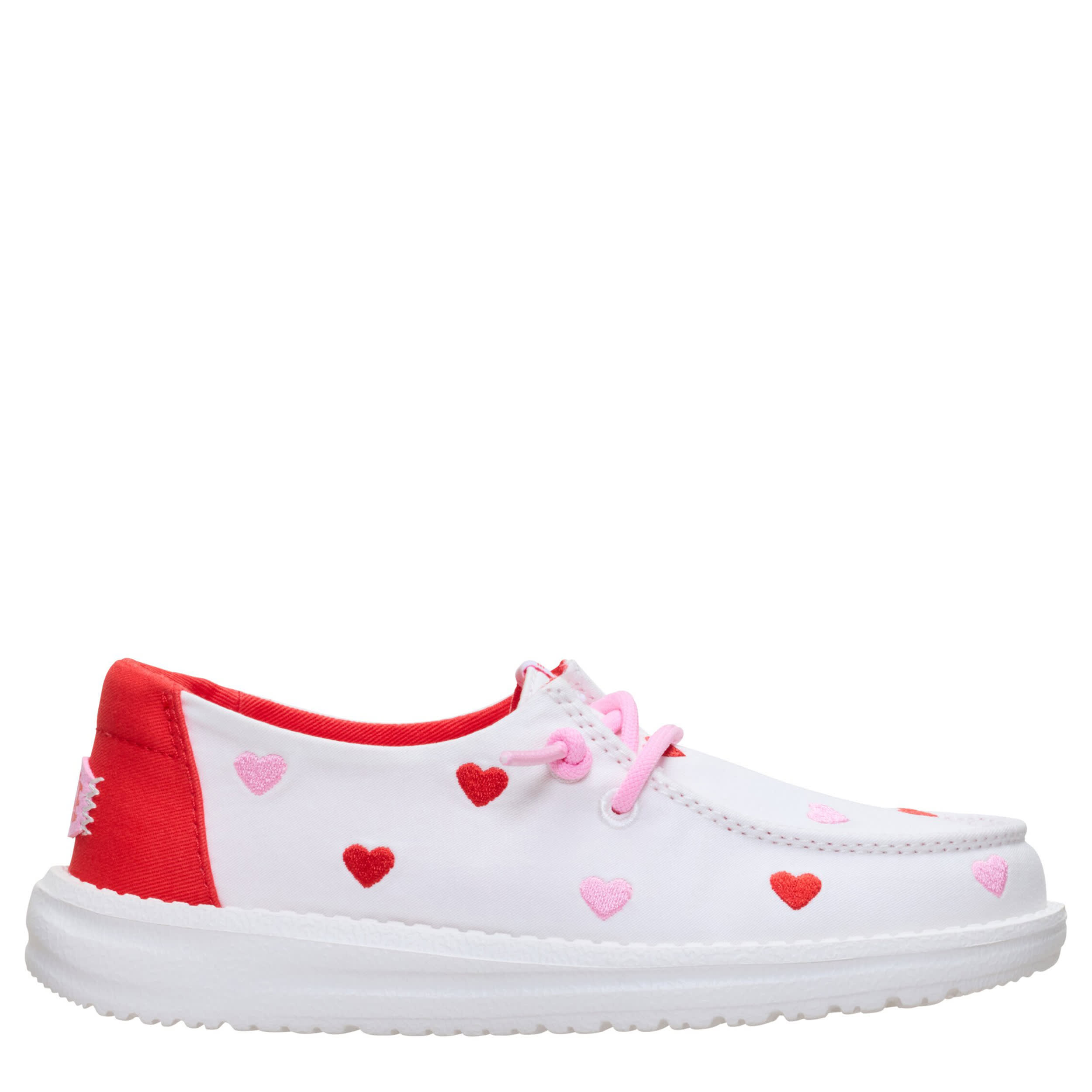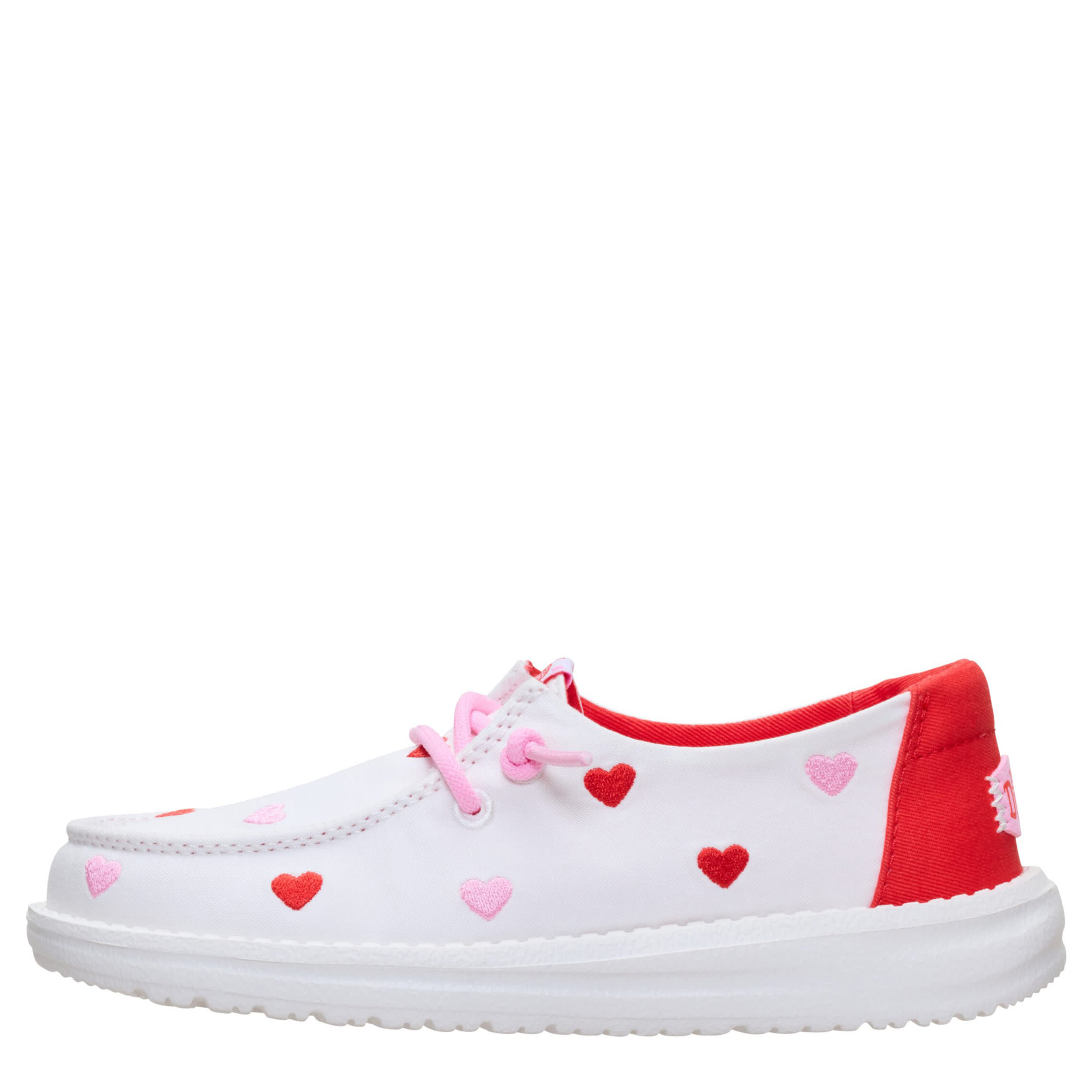 Dress your little in cuteness with the HEYDUDE Wendy Y Embroidered Hearts girls' slip-on sneaker. With an embroidered canvas upper featuring pink laces for extra style, this shoe gives her a token of your affection. The insole cushions her foot, while the EVA outsole frees her to explore unfettered.