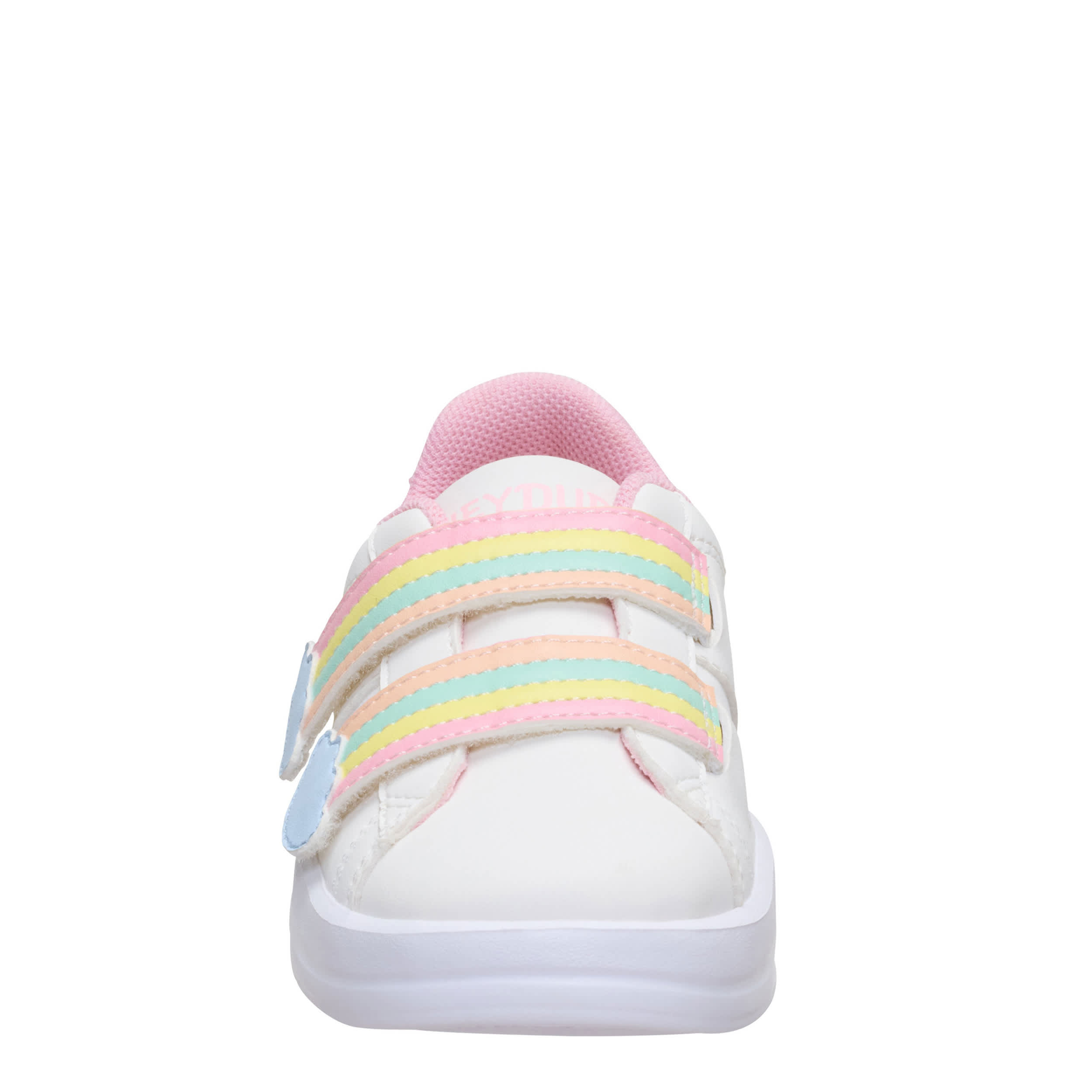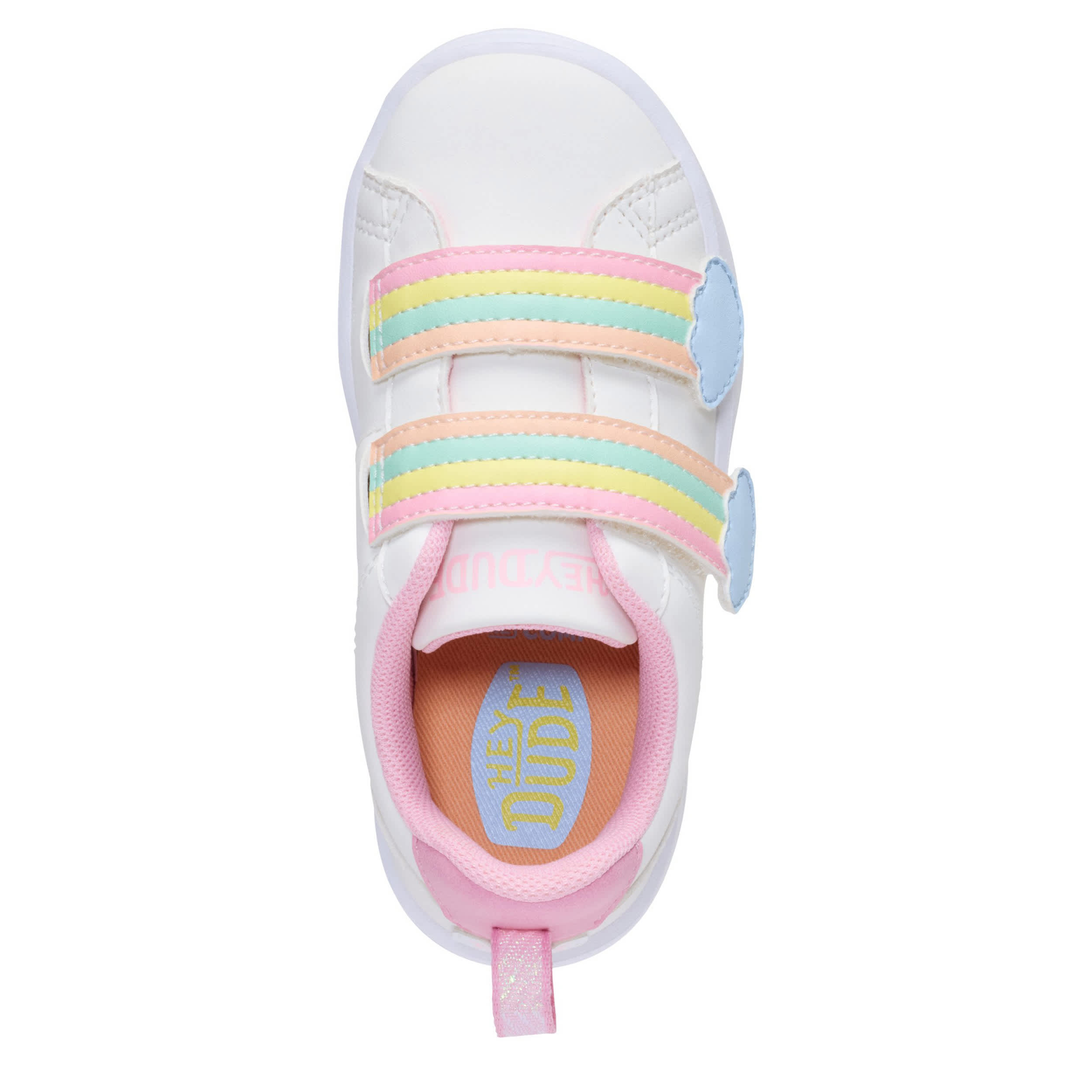 Court a cute trend in the Karina Duo AC Rainbow infant girls' sneaker from HEYDUDE. Featuring a faux leather upper with an oversized rainbow hook-and-loop strap, this minimalist slip-on is travel-ready and goes with all her outfits. The removable insole cushions, while the lightweight outsole keeps her flexible.
