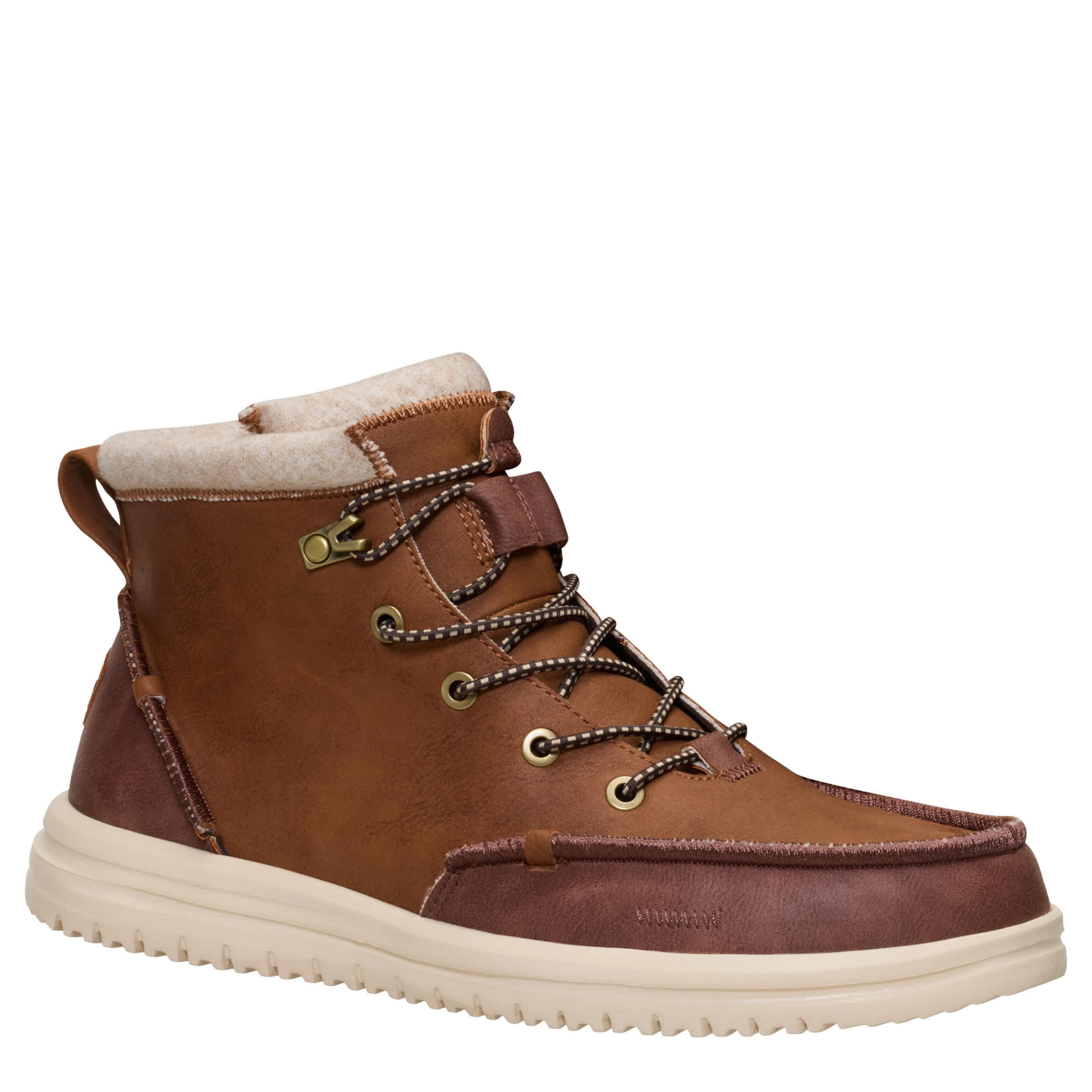 Head out for the day in the lightweight HEYDUDE Bradley Classic Tumbled men's sneaker boot. With a faux leather upper featuring a warm wool blend lining for extra comfort, this elastic laced boot has an easy-on system that makes them a smart choice. The removable insole cushions while the flexible outsole keeps your rugged adventures confidently on task.