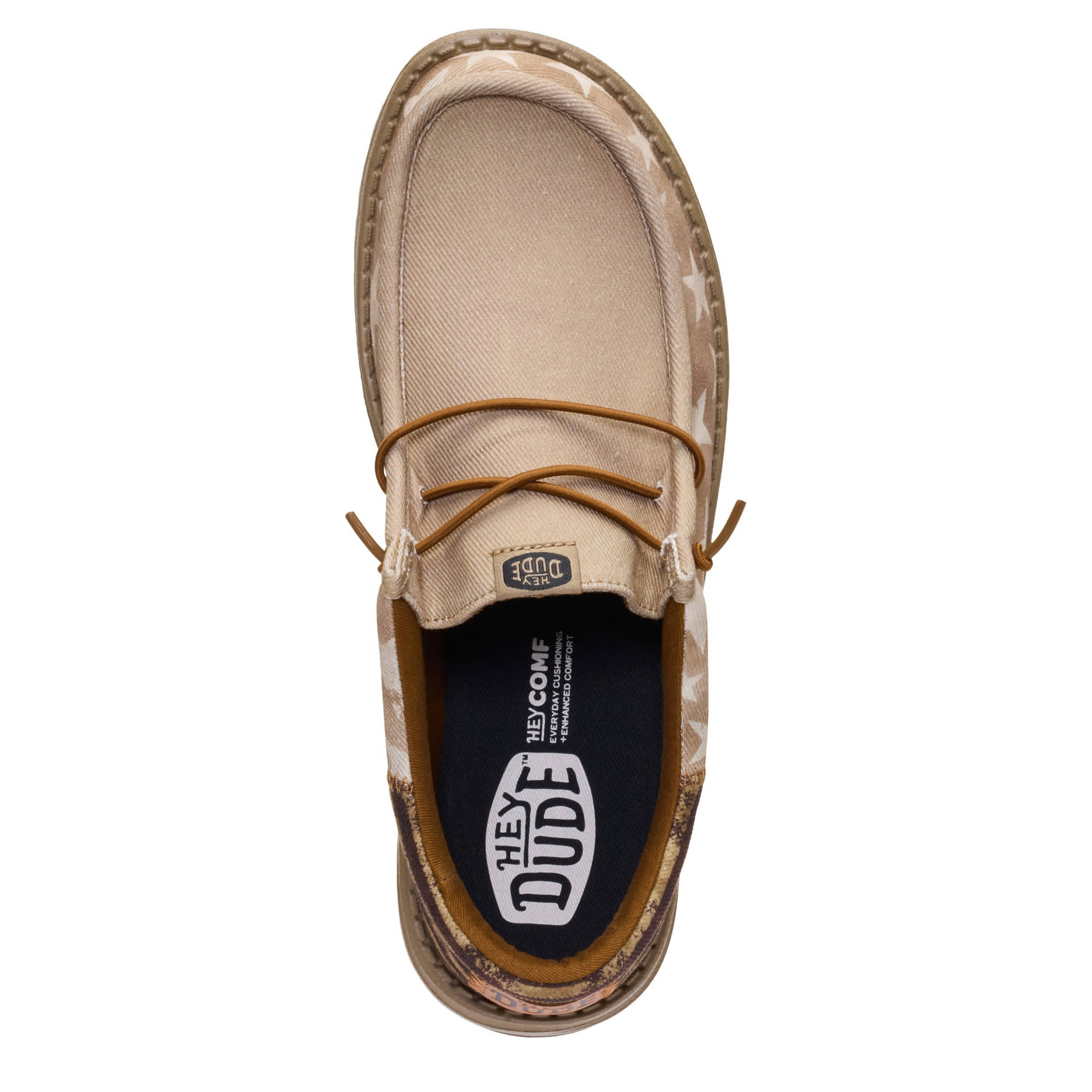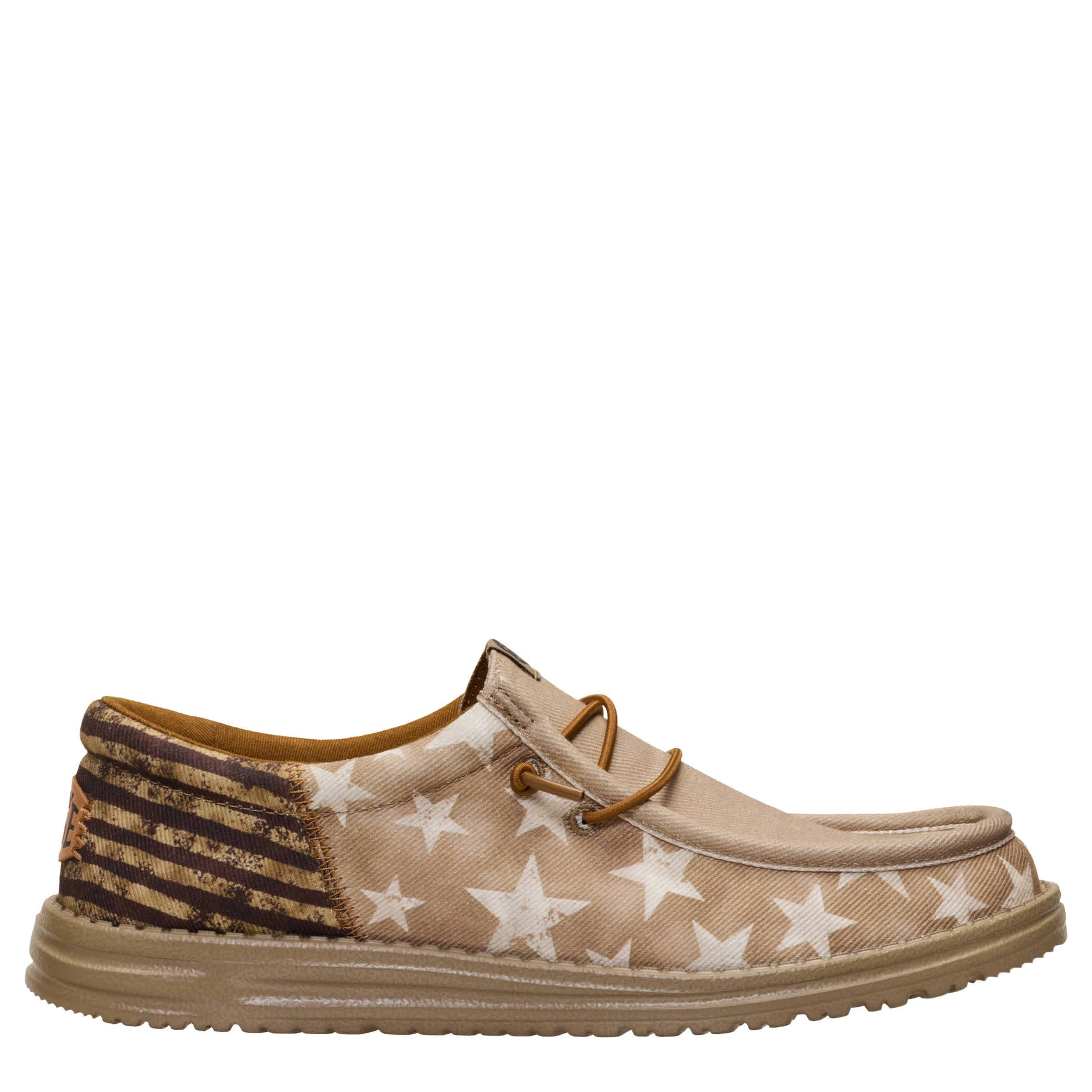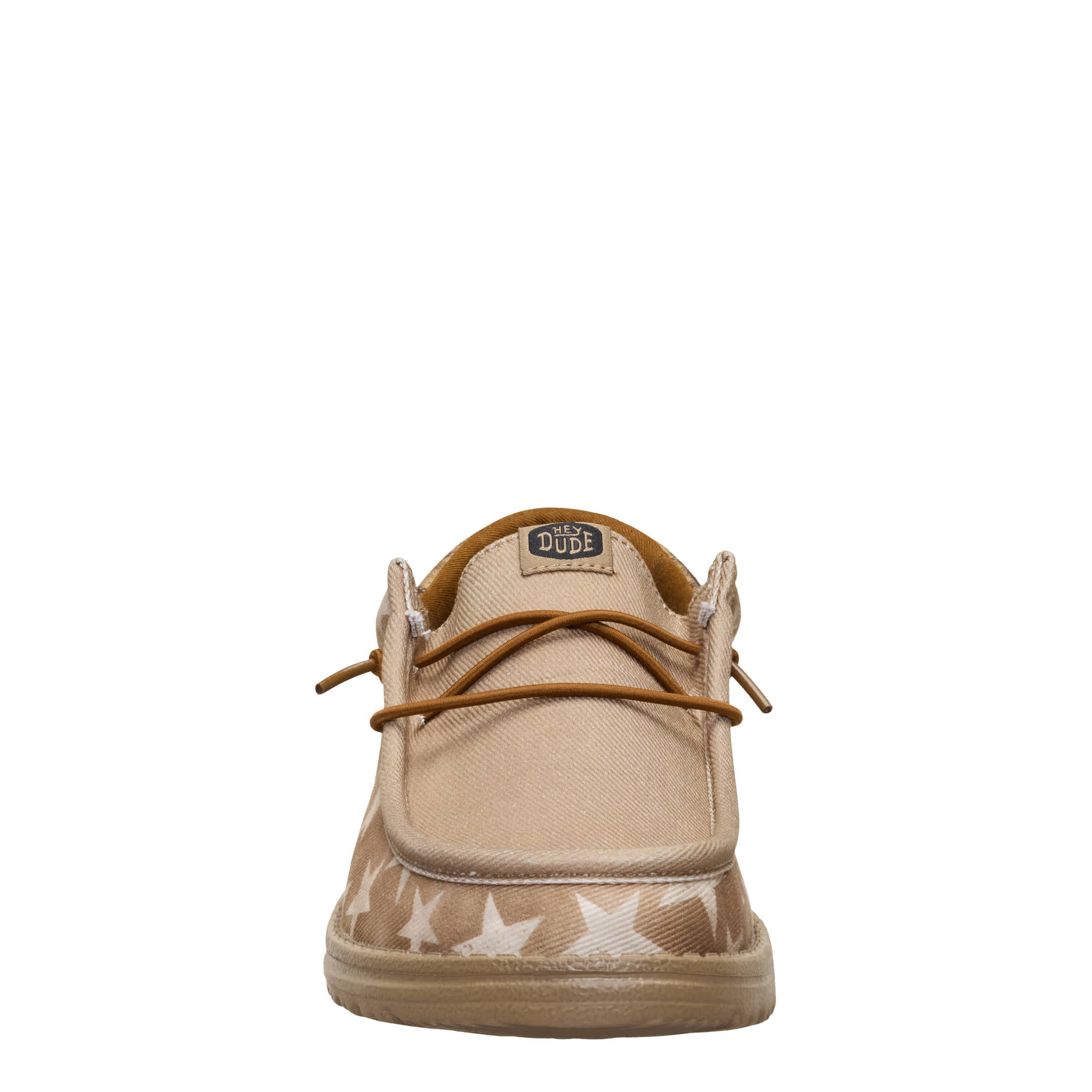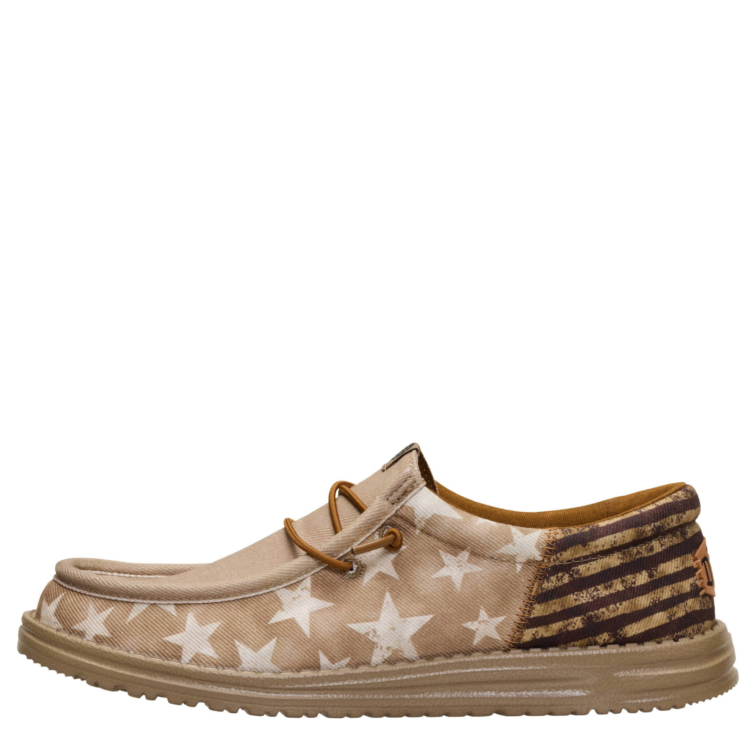 Be patriotic in style with the HEYDUDE Wally Funk Patriot slip-on sneaker. Made with a canvas upper featuring an aged stars & stripes design dipped in sienna and a textured midsole, this slip-on shoe has no-tie laces for easy entry. The removable insole offers cushioned comfort, while the lightweight outsole provides durable traction.