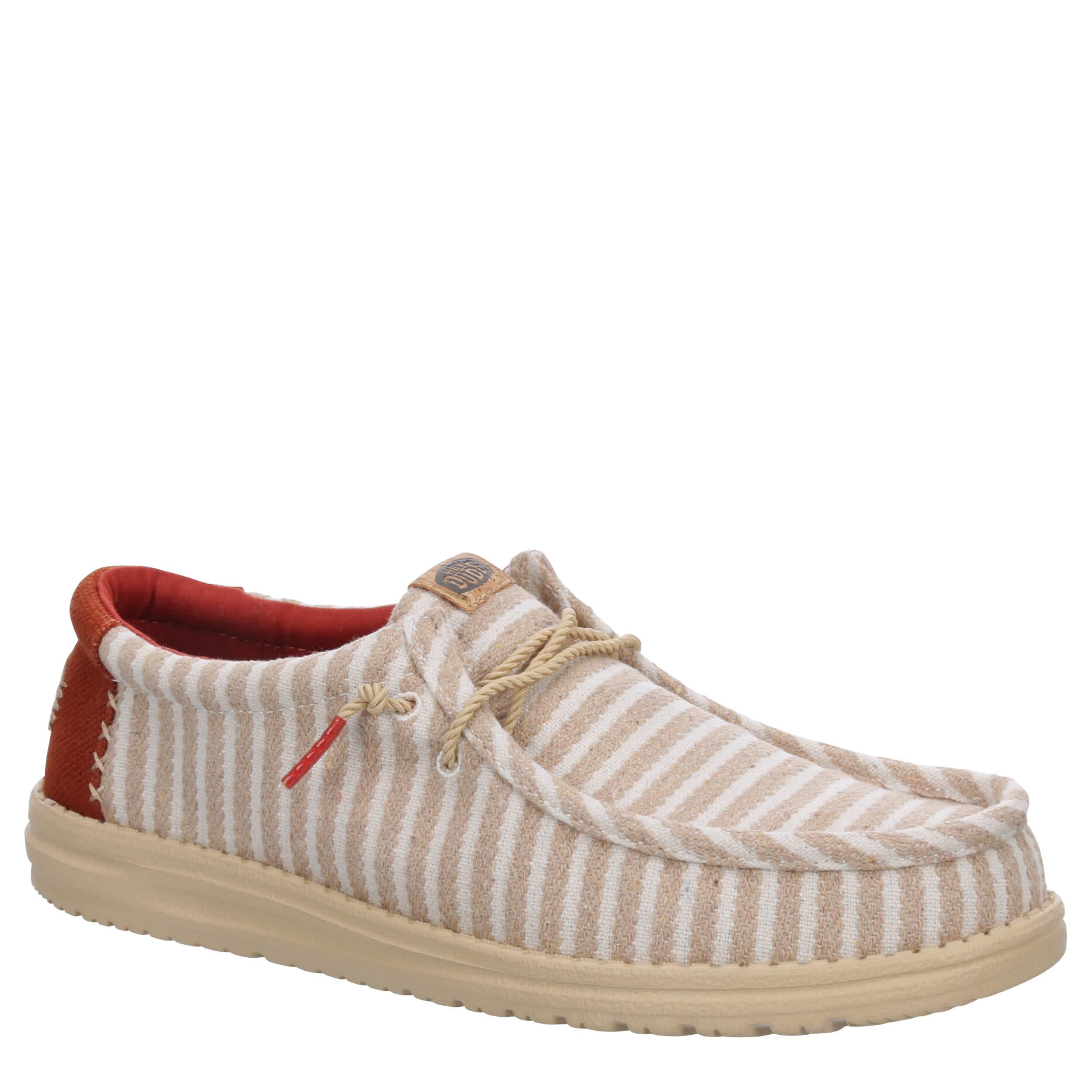 Get that jetset luxury feel in the HEYDUDE Wally Resort men's slip-on sneaker. With a striped linen blend upper featuring nautical rope laces and cork footbed, this slip-on is travel ready. The removable insole offers cushioning, while the lightweight outsole is flexible enough to set you free to explore.