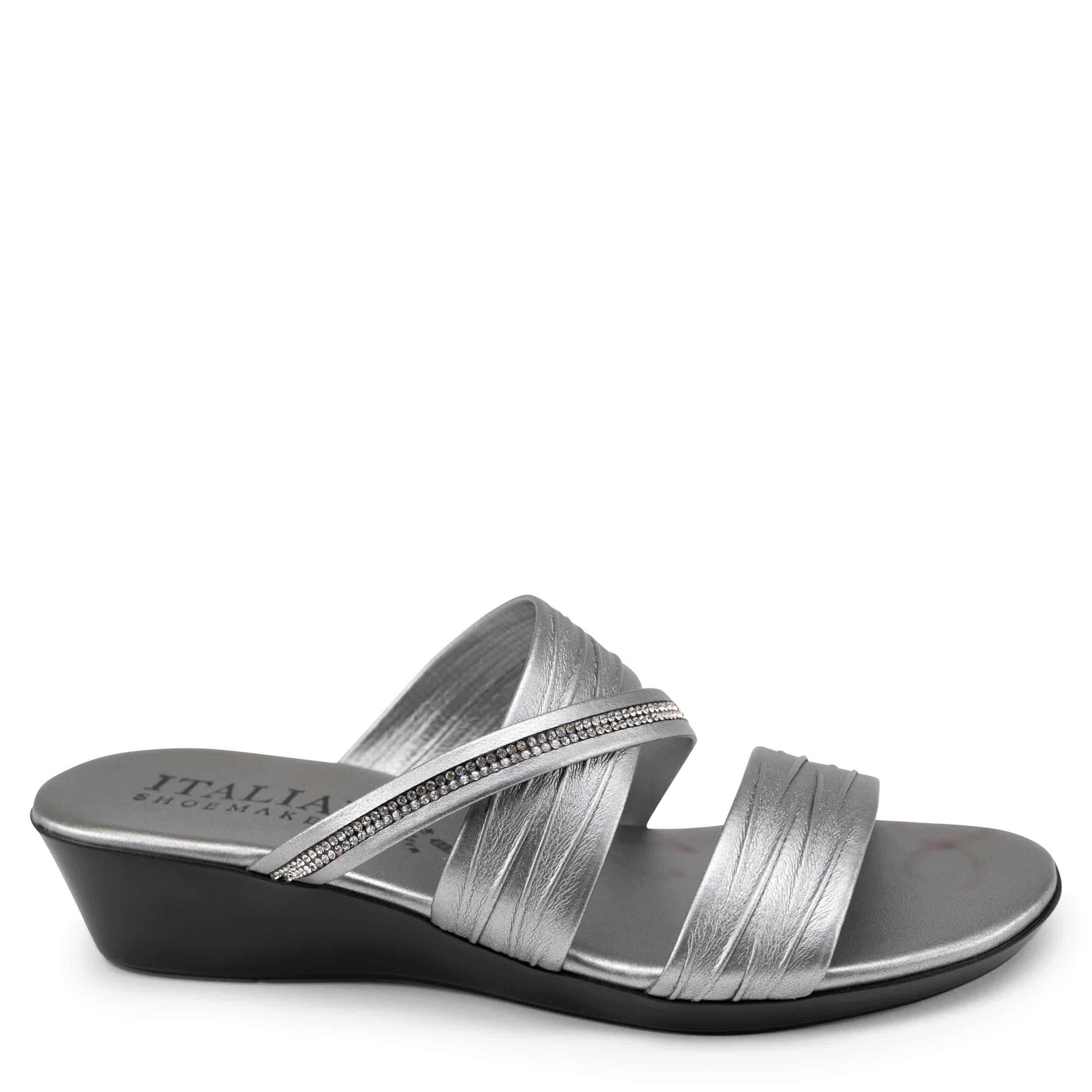 Be all things glam in the Hollis wedge sandal from Italian Shoemakers. Featuring a faux leather upper and thin sparkly strap, this slip-on is a summer essential. The footbed cushions your foot, while the low wedge heel offers subtle lift.