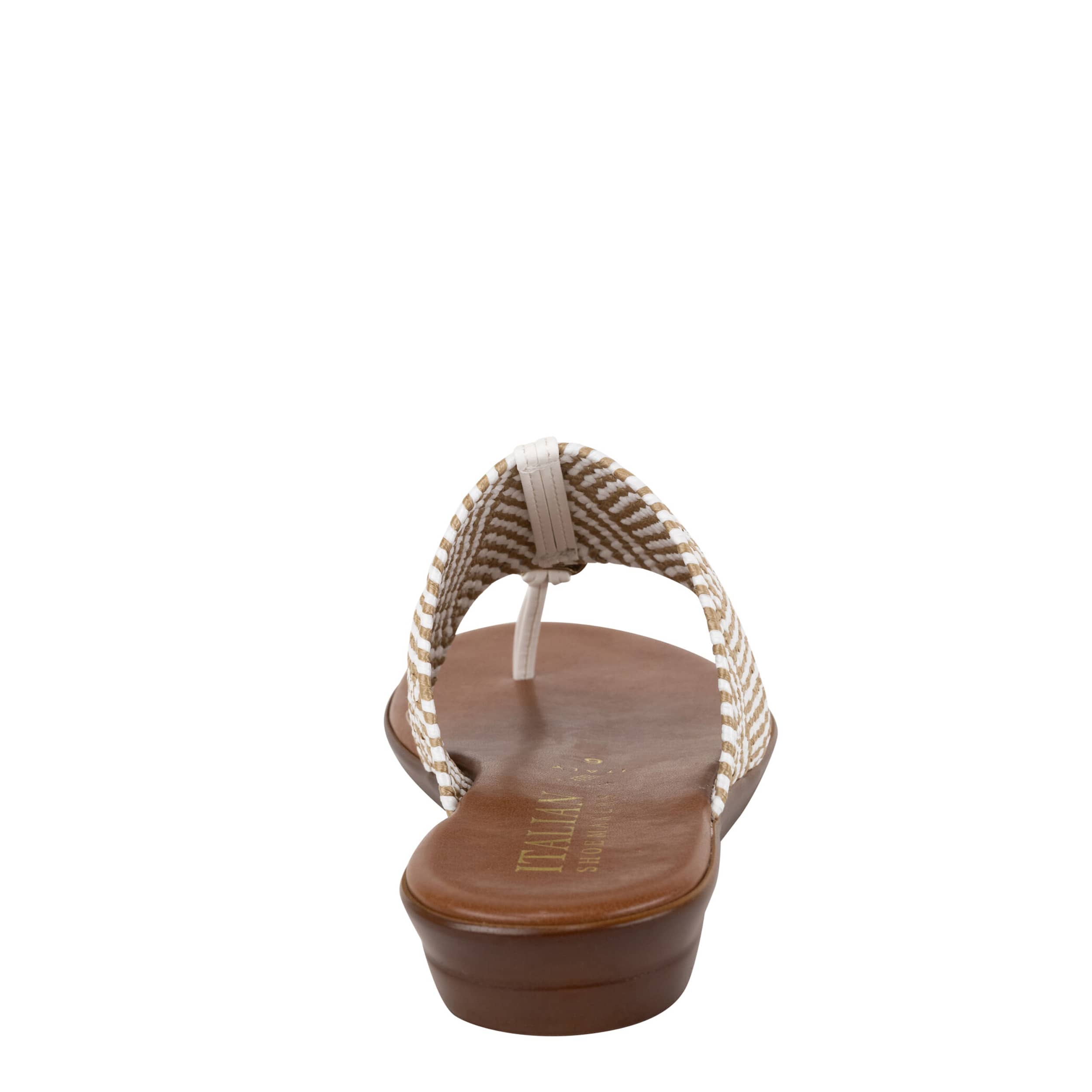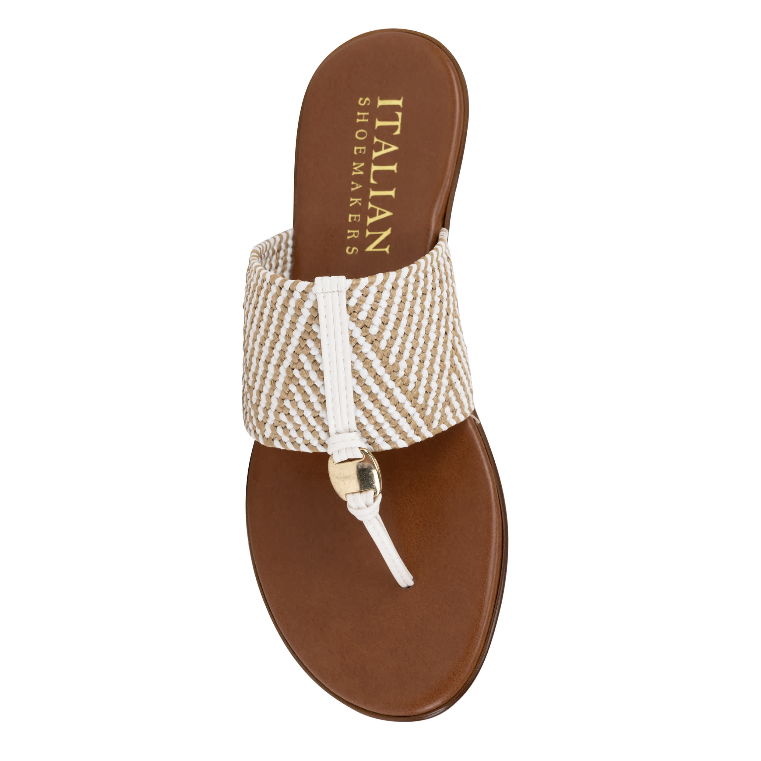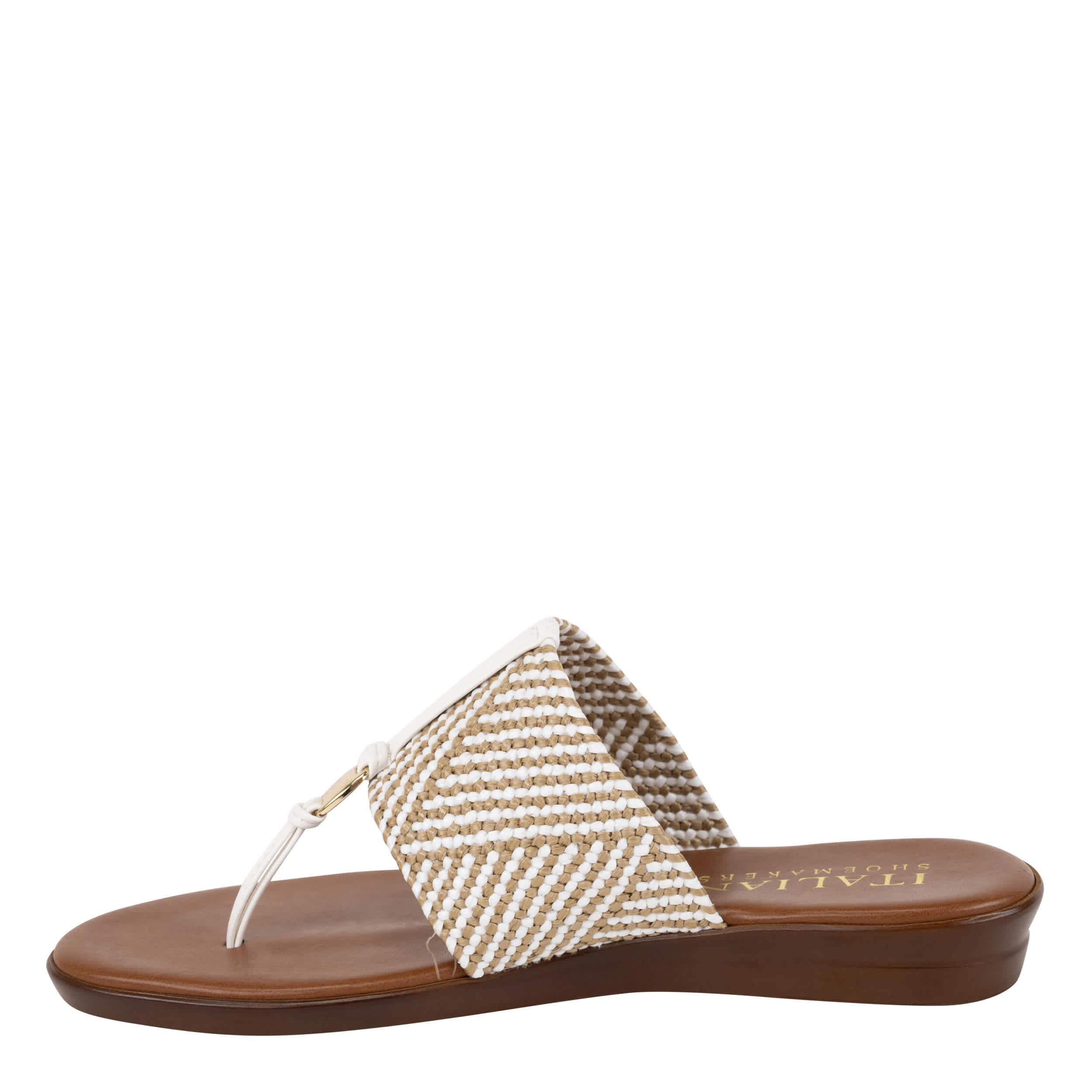 Walk on sunshine in the Leana wedge sandal from Italian Shoemakers. Featuring a stretchy elastic upper with a striped pattern, this thong sandal is a vacation essential. Your feet stay comfy on the cushioned footbed, while the slight wedge adds stability.