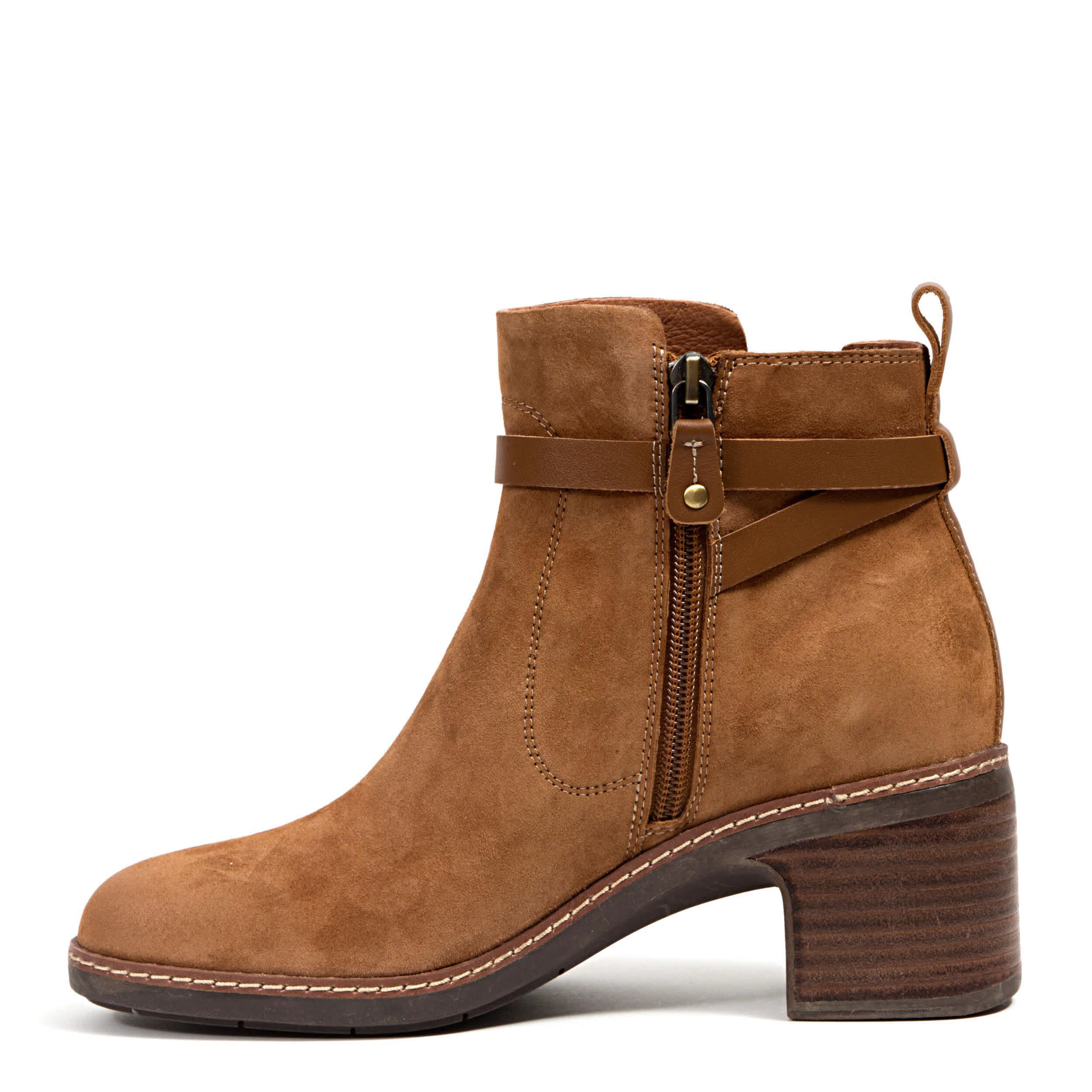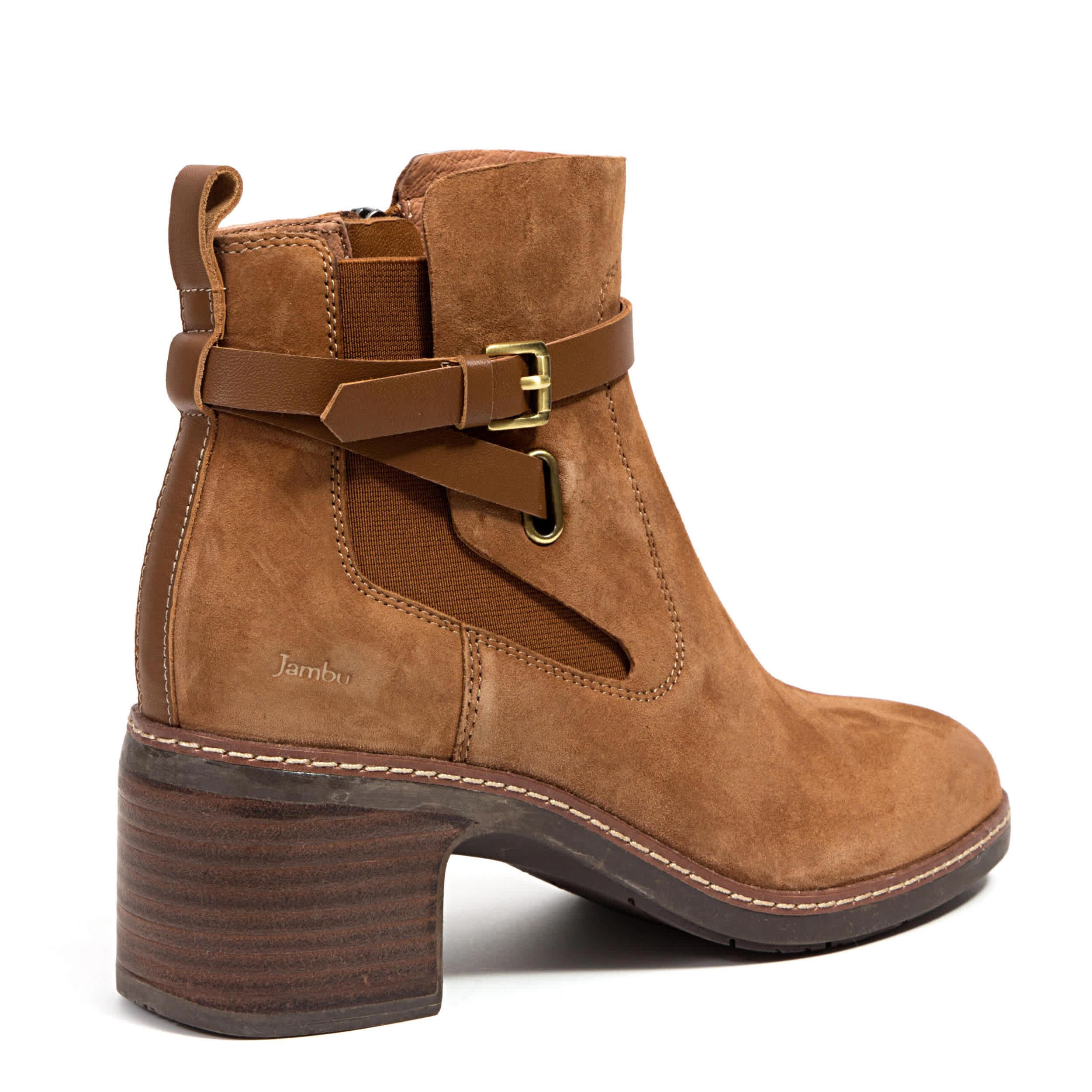 Fashion your look, simply, in the Vivi bootie from Jambu. Featuring a water-resistant kid suede upper with a thin, wraparound buckle band, this ankle boot is a chic upgrade to a Chelsea style. The insole cushions, while the slight heel adds subtle lift.