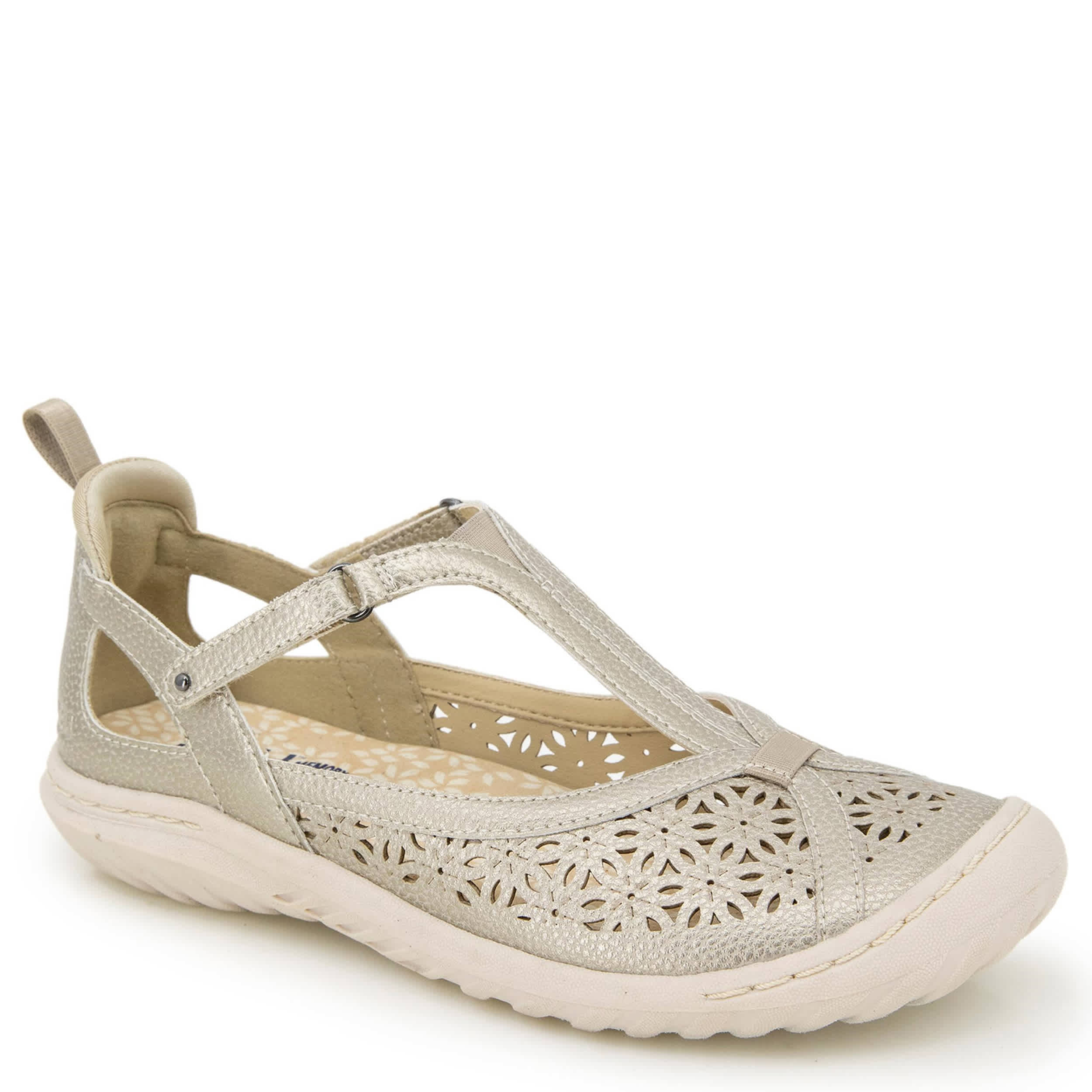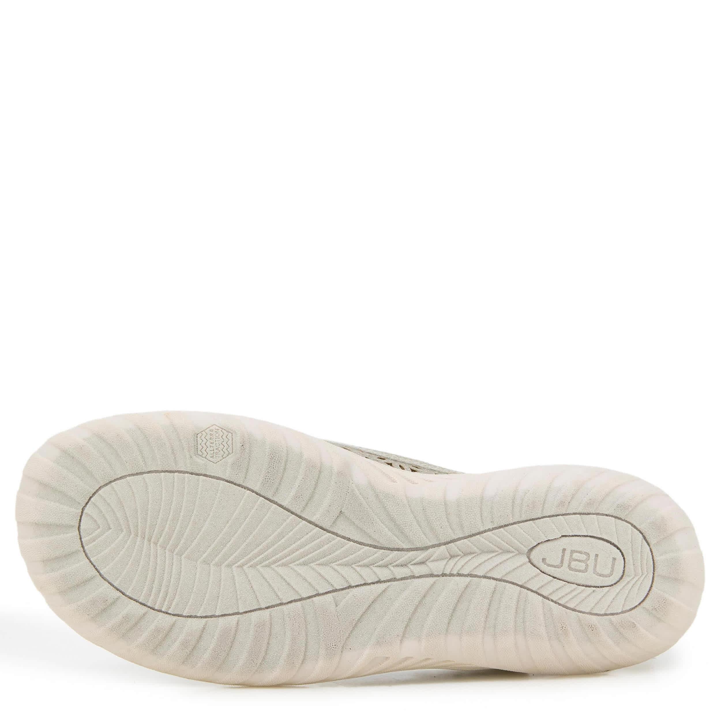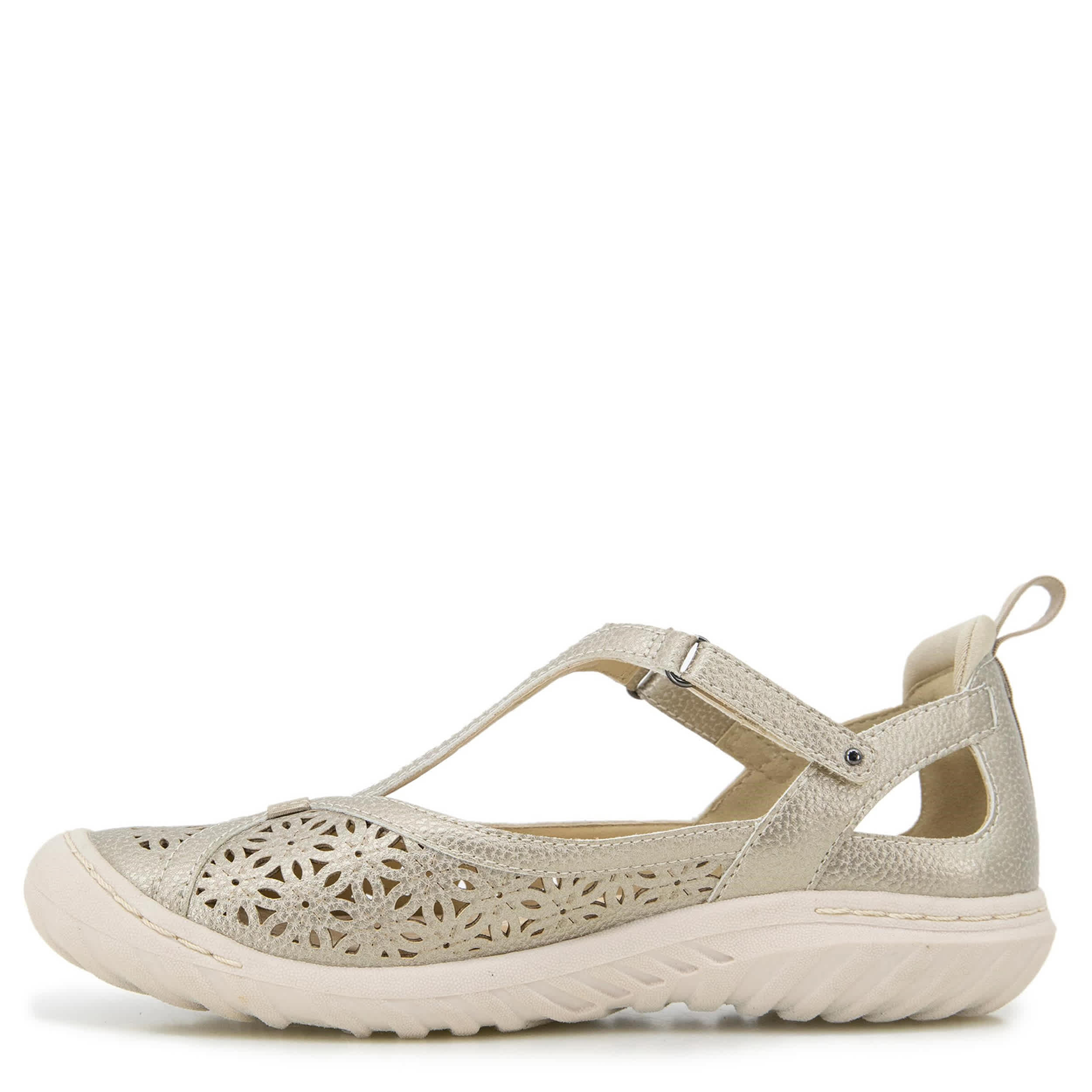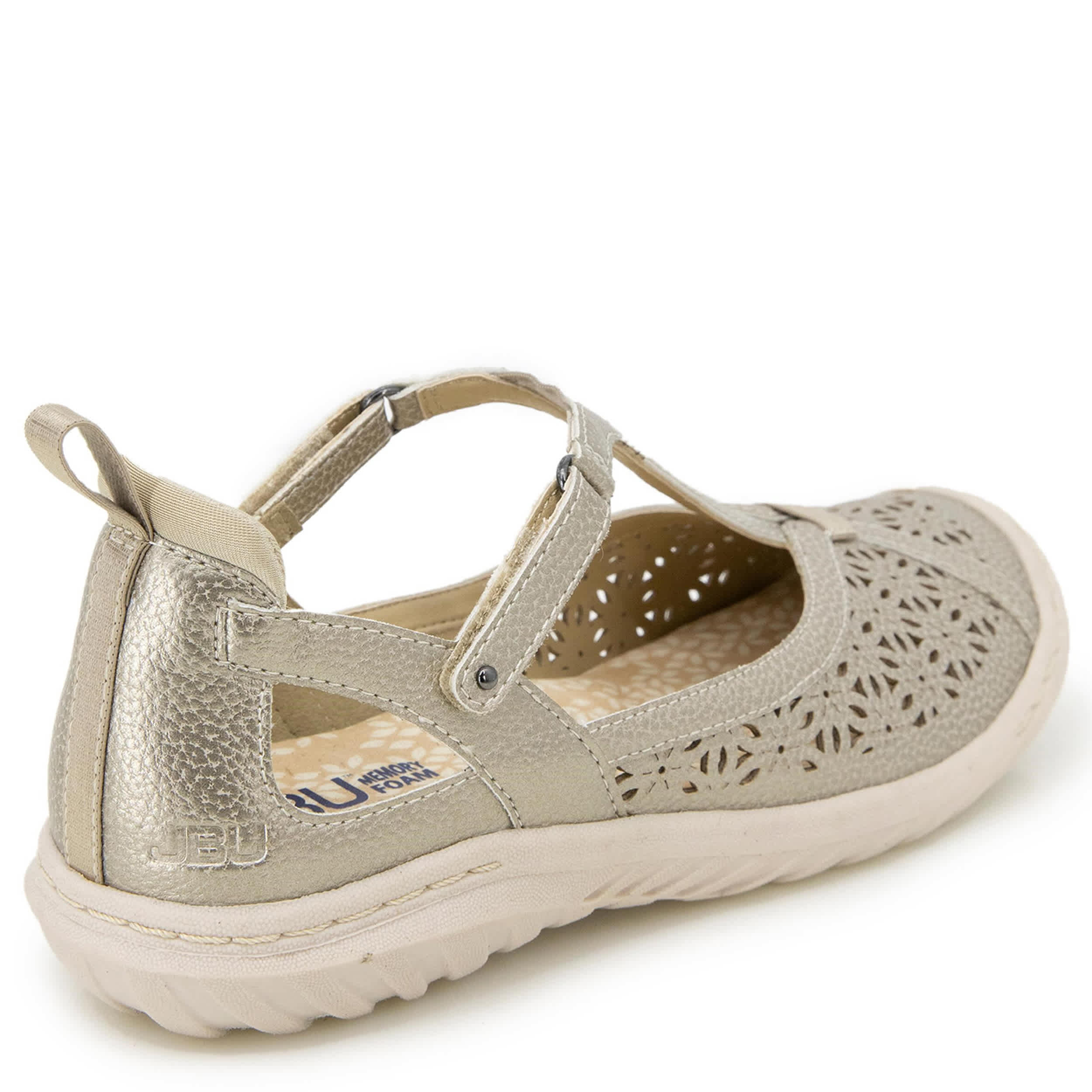 Flirty yet simple equals the rugged JBU Daffodil women's clog. With a faux leather, elastic & neoprene upper featuring floral-inspired perforations, this shoe has a classic T-strap closure for a flexible fit. The Memory Foam insole pampers your foot while the durable outsole adds All Terra Traction.