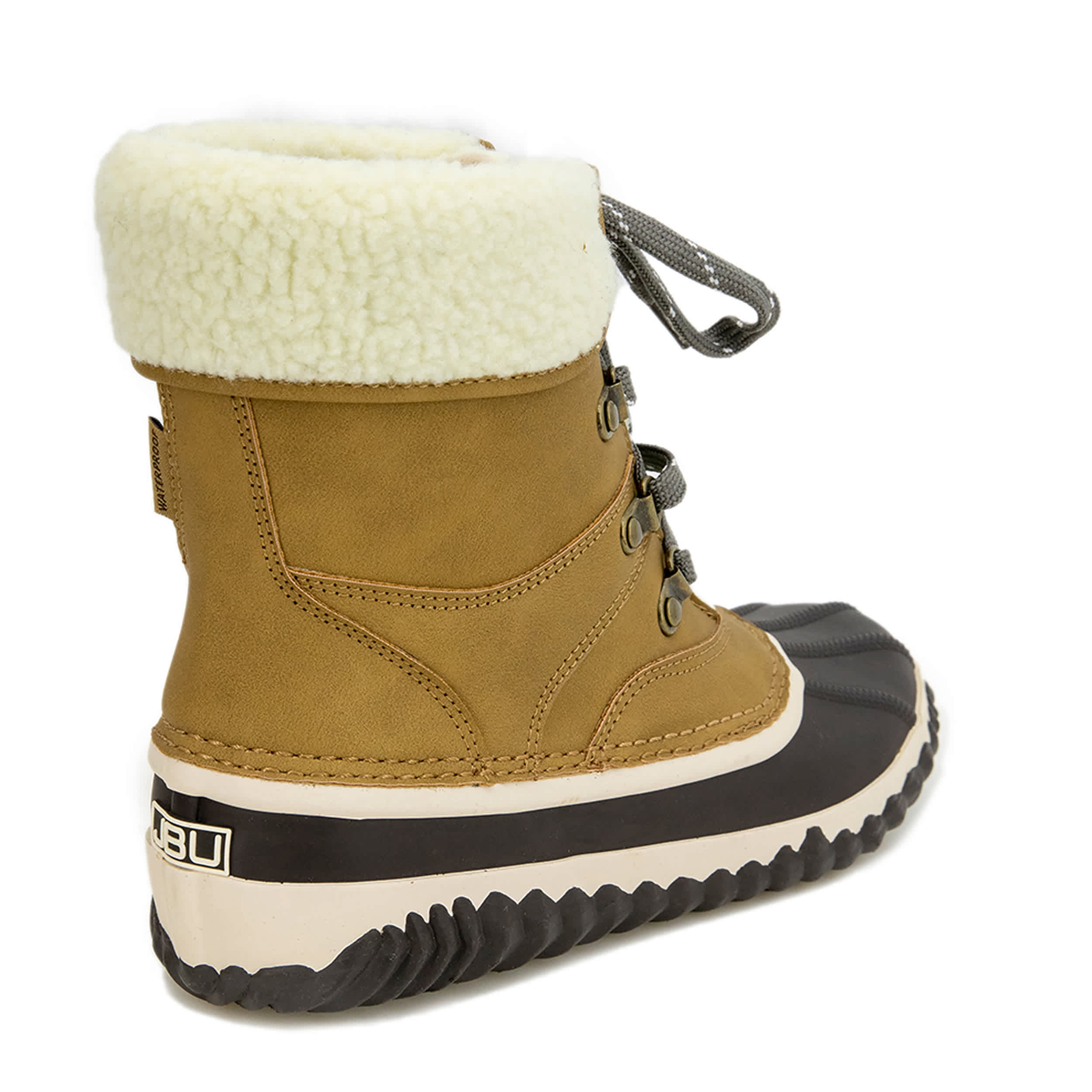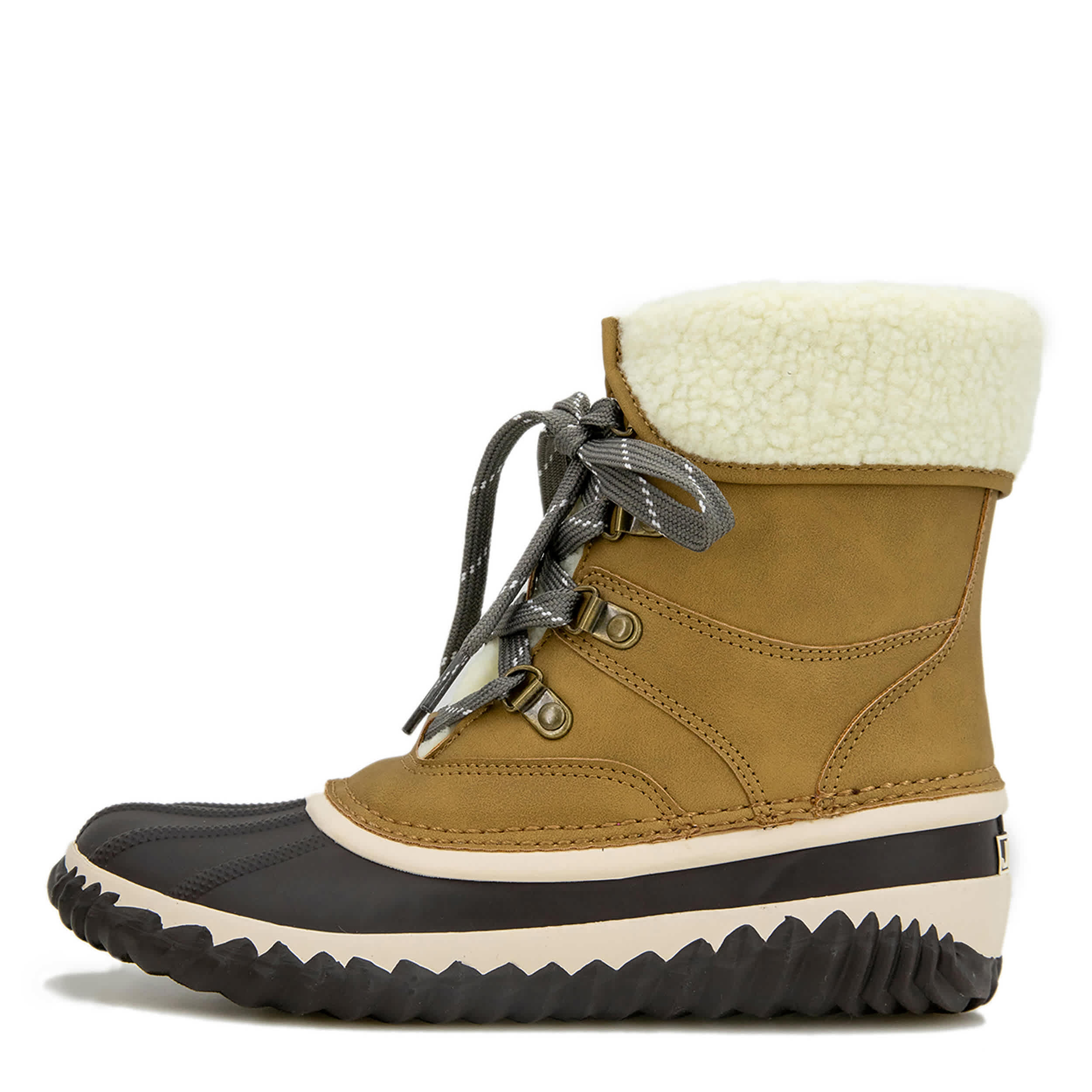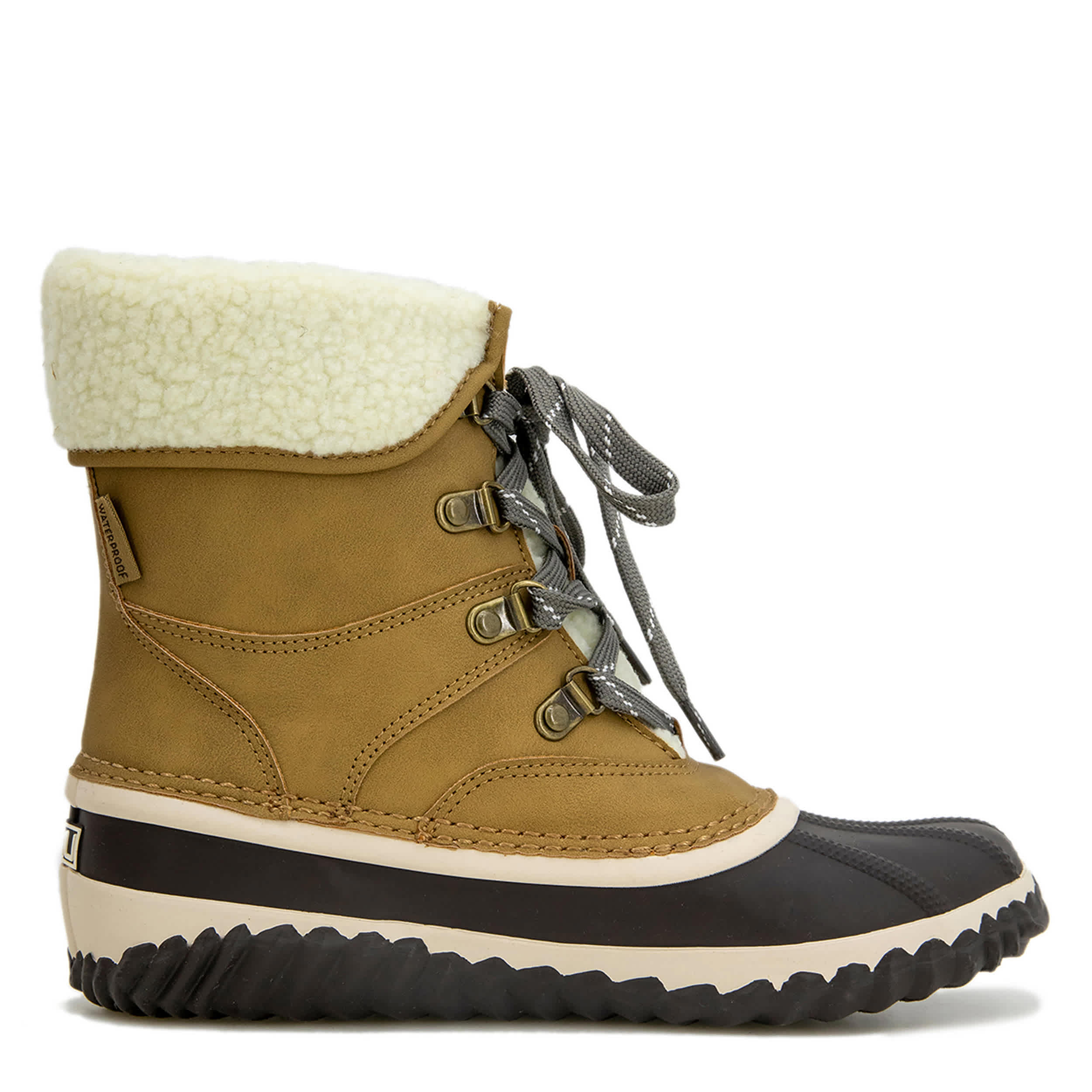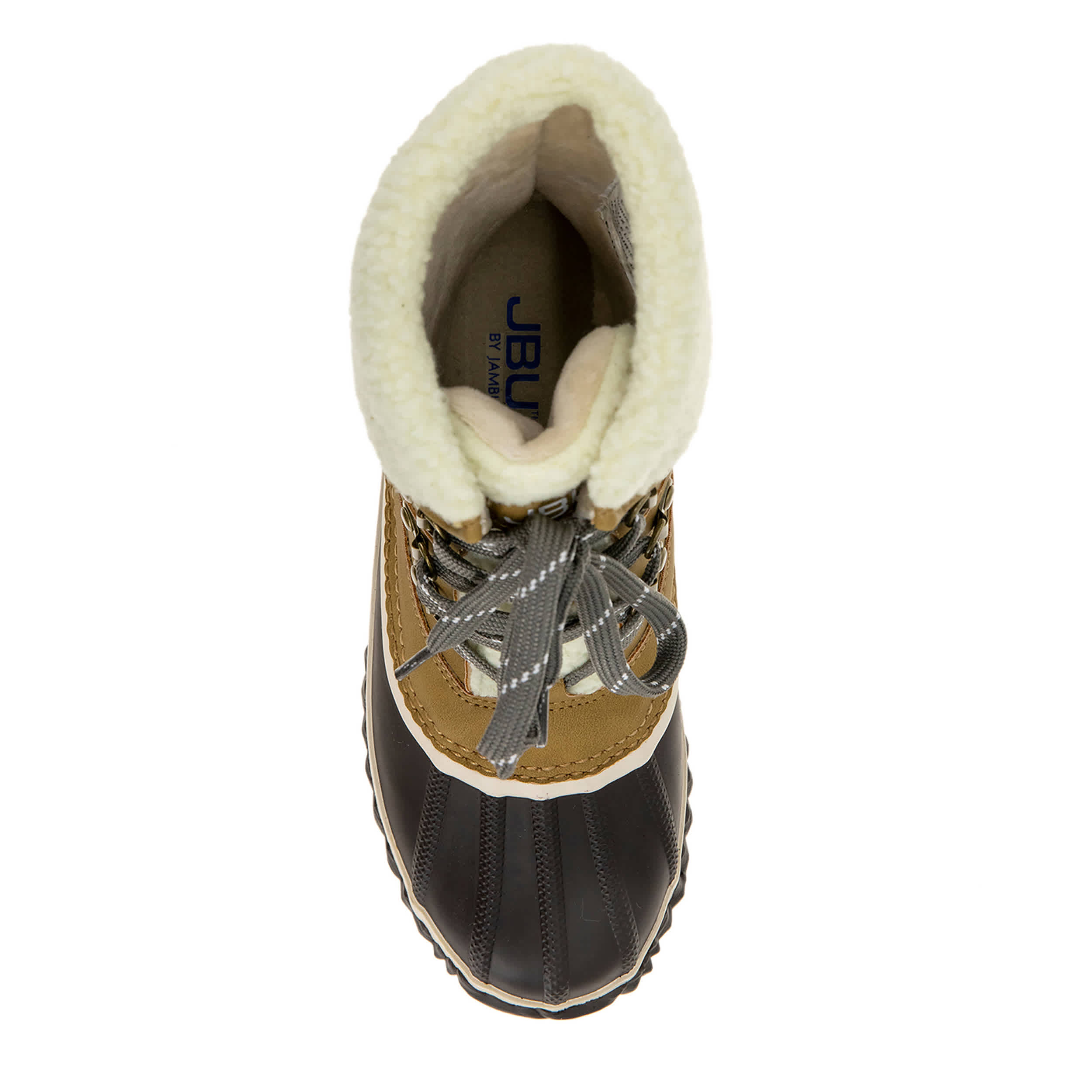 Bring on the rain with the JBU Lizzy Waterproof women's duck boot. With a synthetic upper featuring a faux shearling lining for a great feel & extra warmth, this lace-up boot has a D-ring system for a secure fit. The Memory Foam insole cushions while the traction outsole prevents slips.