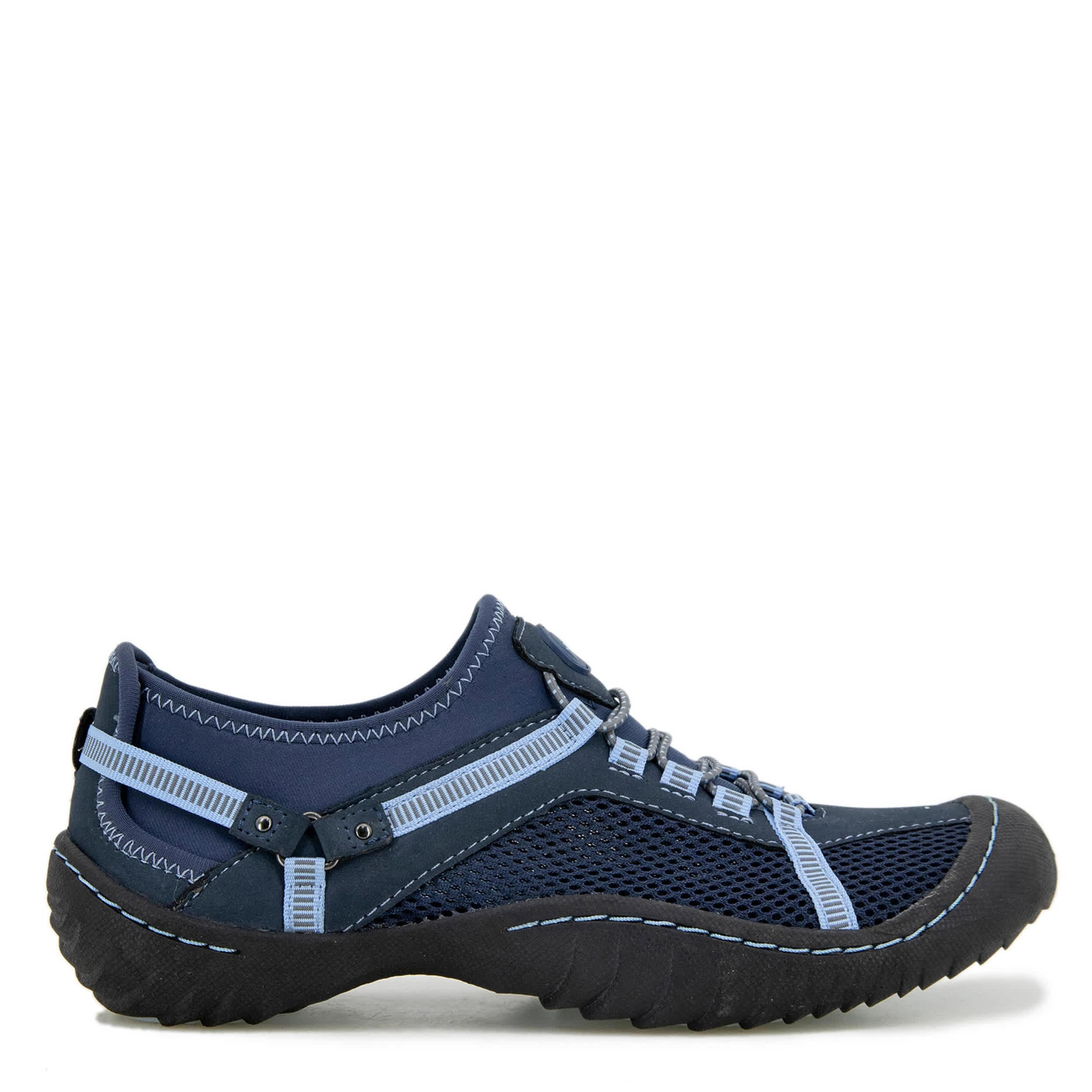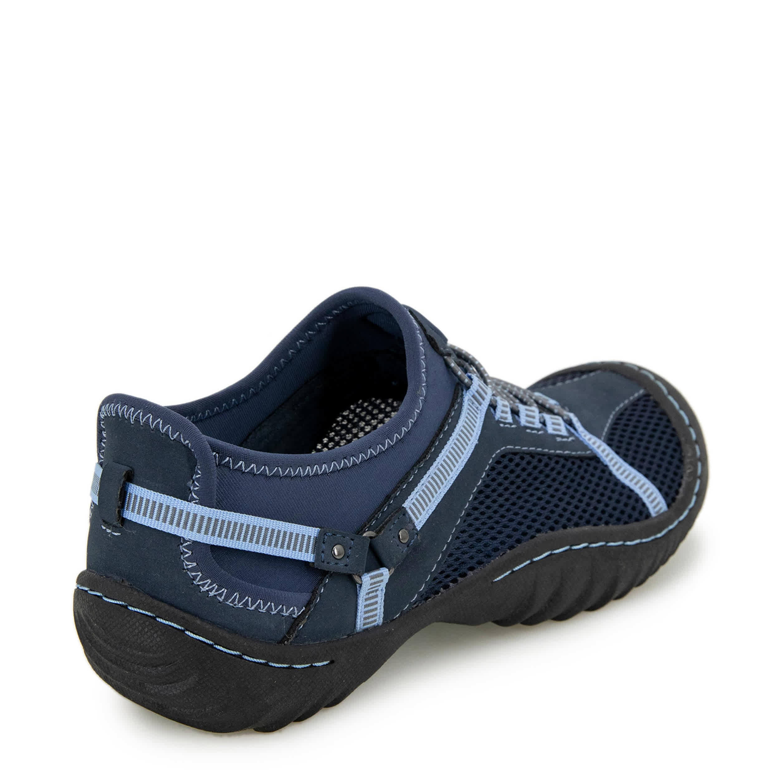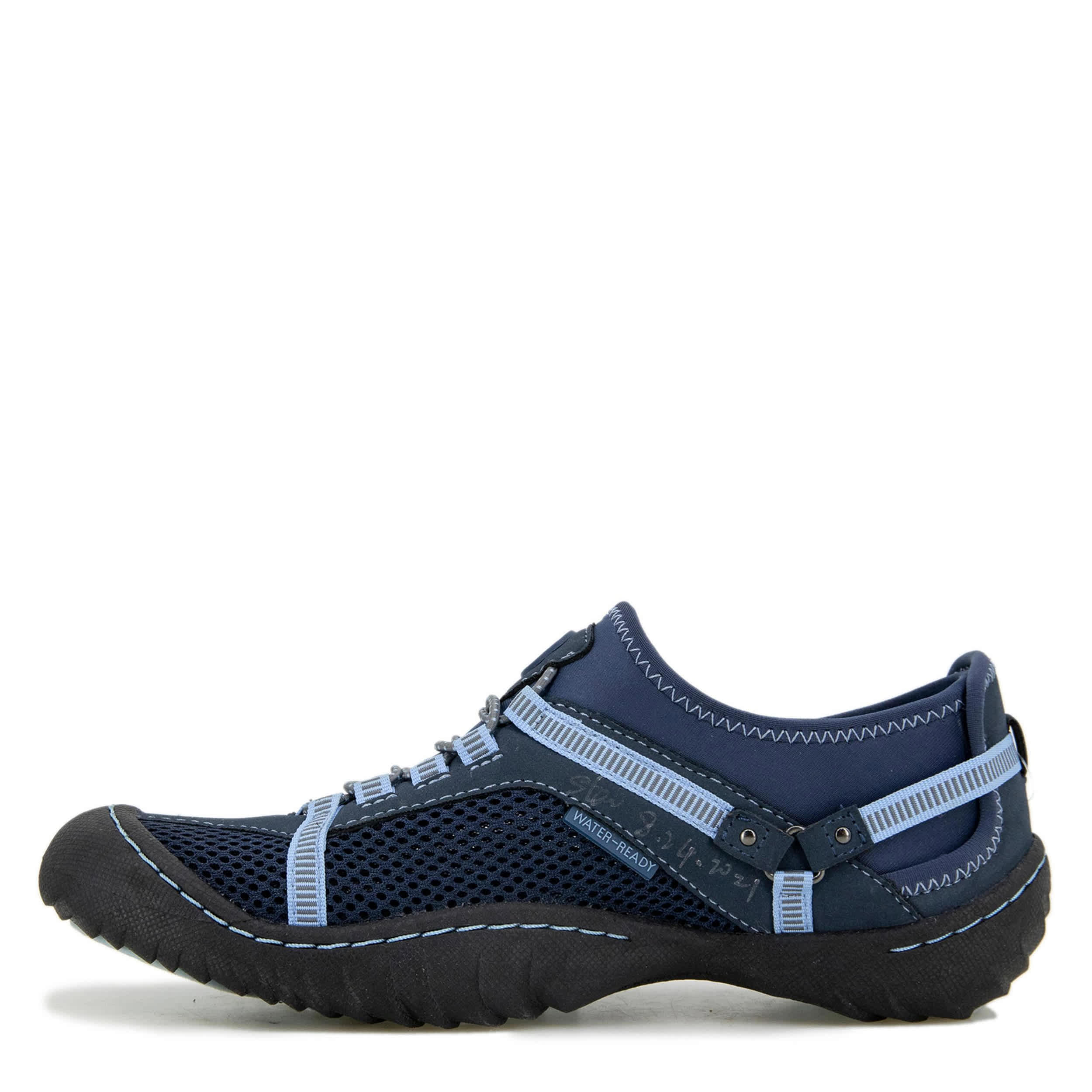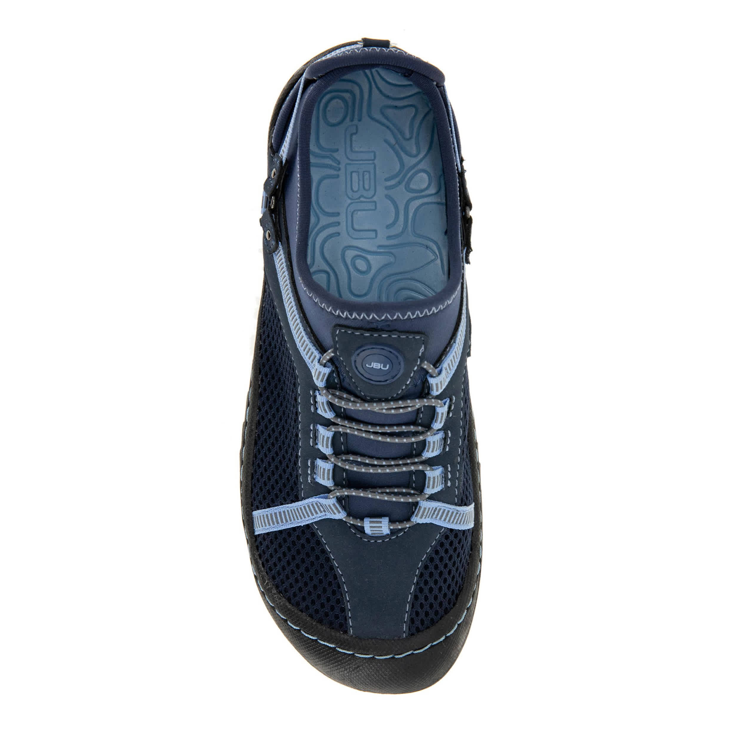 Forge ahead, in orderly fashion, with the JBU Tahoe women's water shoe. With a water-ready mesh & microfiber upper featuring bungee cord lacing for a secure fit, this slip-on shoe also has color-blocked canvas harness accents for a pop of style and extra support. The contoured EVA insole cushions every step while the non-slip outsole offers durable, multi-surface traction.
