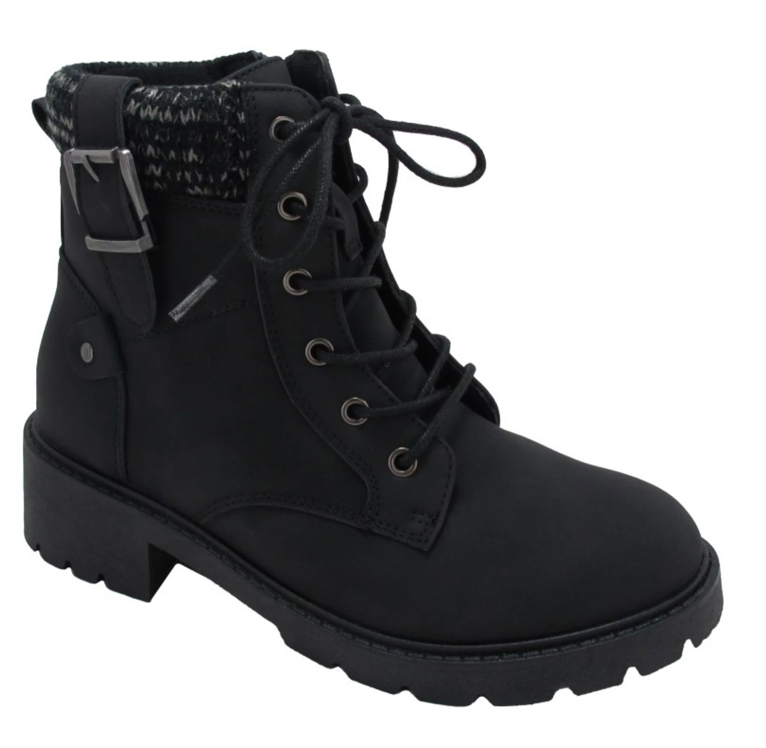 Pick up your fall style in the Tacoma women's boot from Jellypop. Featuring a faux leather upper with a plush padded collar and adjustable belt strap detail for extra style, this combat boot goes with jeans or long skirts. The insole offers comfort, while the just right heel is balanced with lug traction.