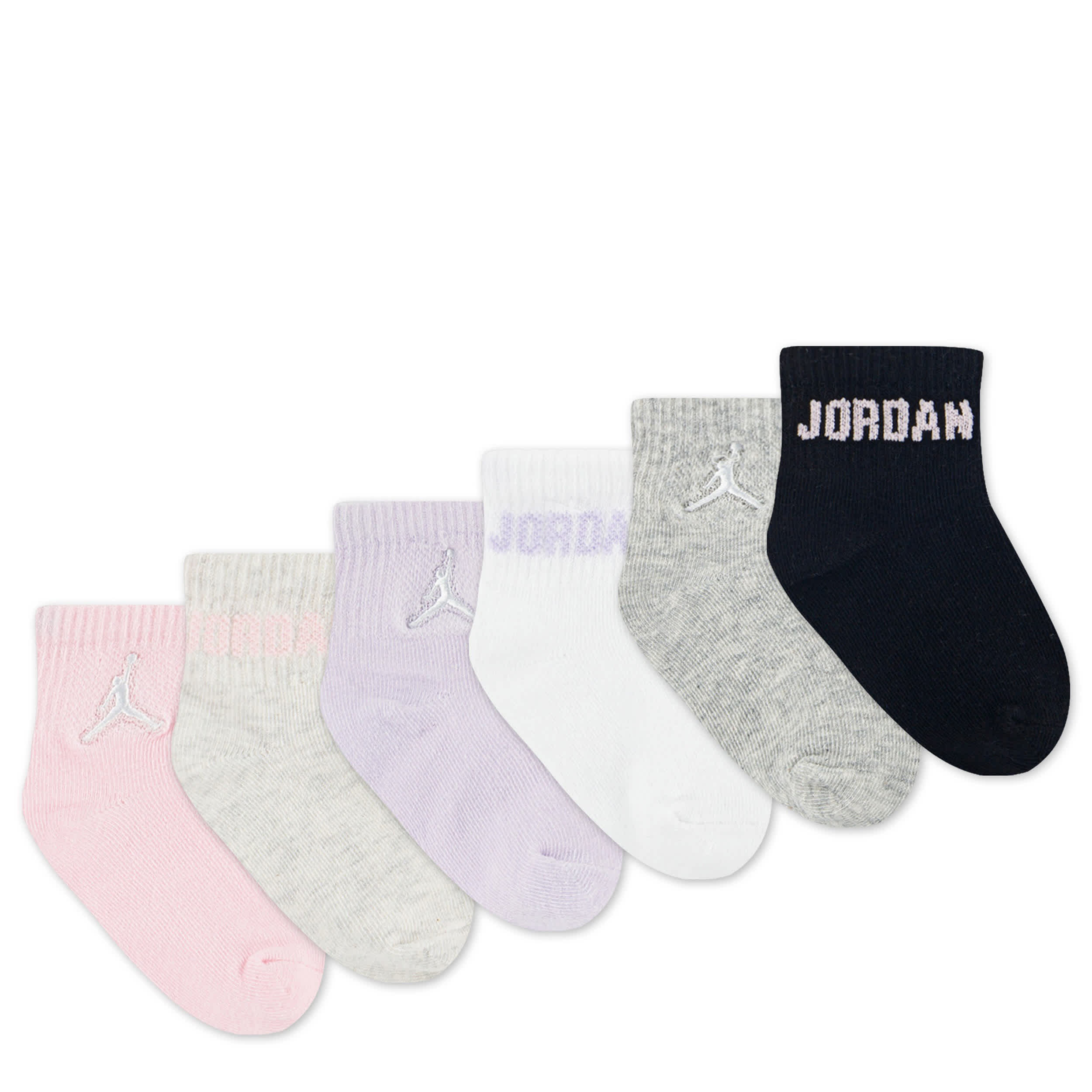 Keep your baby comfy in the Jordan 12-24M infant girls' quarter socks 6 pack. Featuring a soft, breathable cotton/poly blend with that classic Jordan heritage, her toes stay warm with a flat knit construction. Even the smallest can have a complete Jordan ensemble with these cute socks. And they stay up, but maybe not put (because little person), thanks to those ribbed cuffs.
