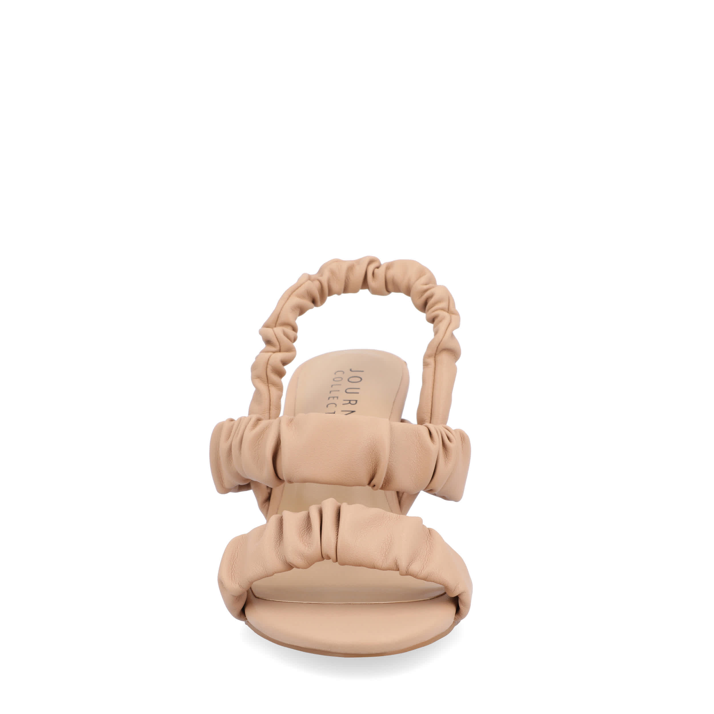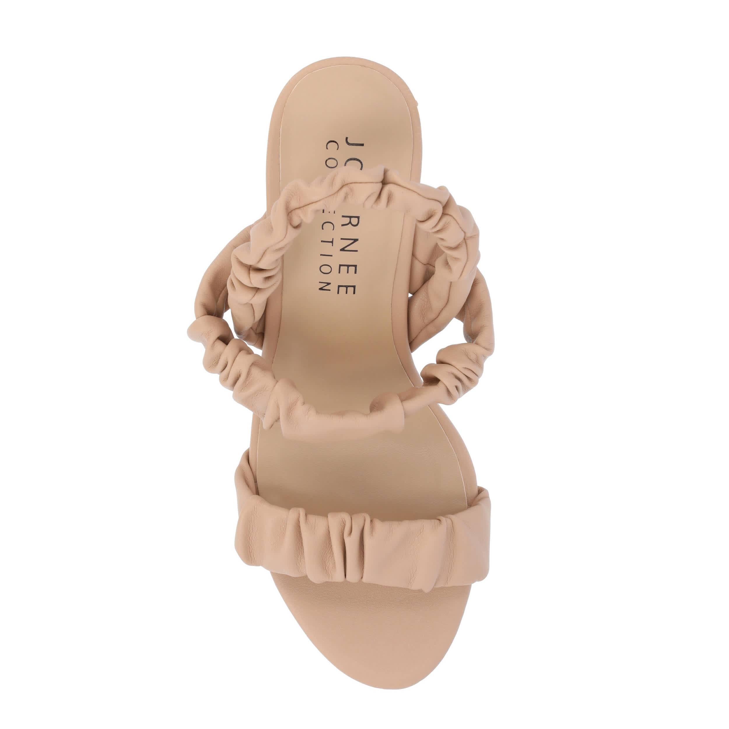 Grab their attention in no time with the Amaree women's sandal from Journee Collection. With a luxe vegan leather upper featuring ruched strap detailing, this chic sandal, with its open round-toe silhouette, will offset any ensemble. A padded footbed comforts your feet, while the 2¾" covered kitten heel creates a flattering lift.