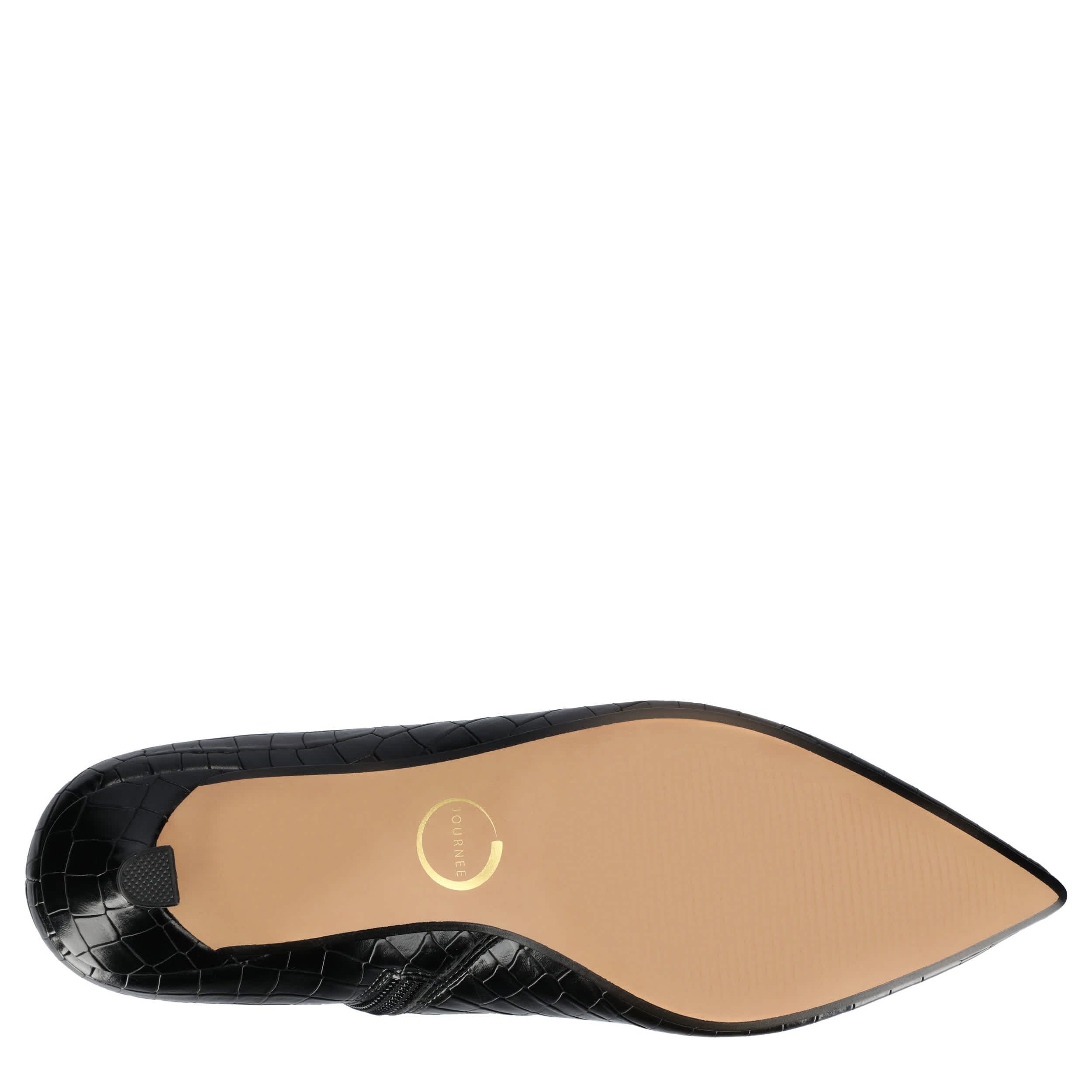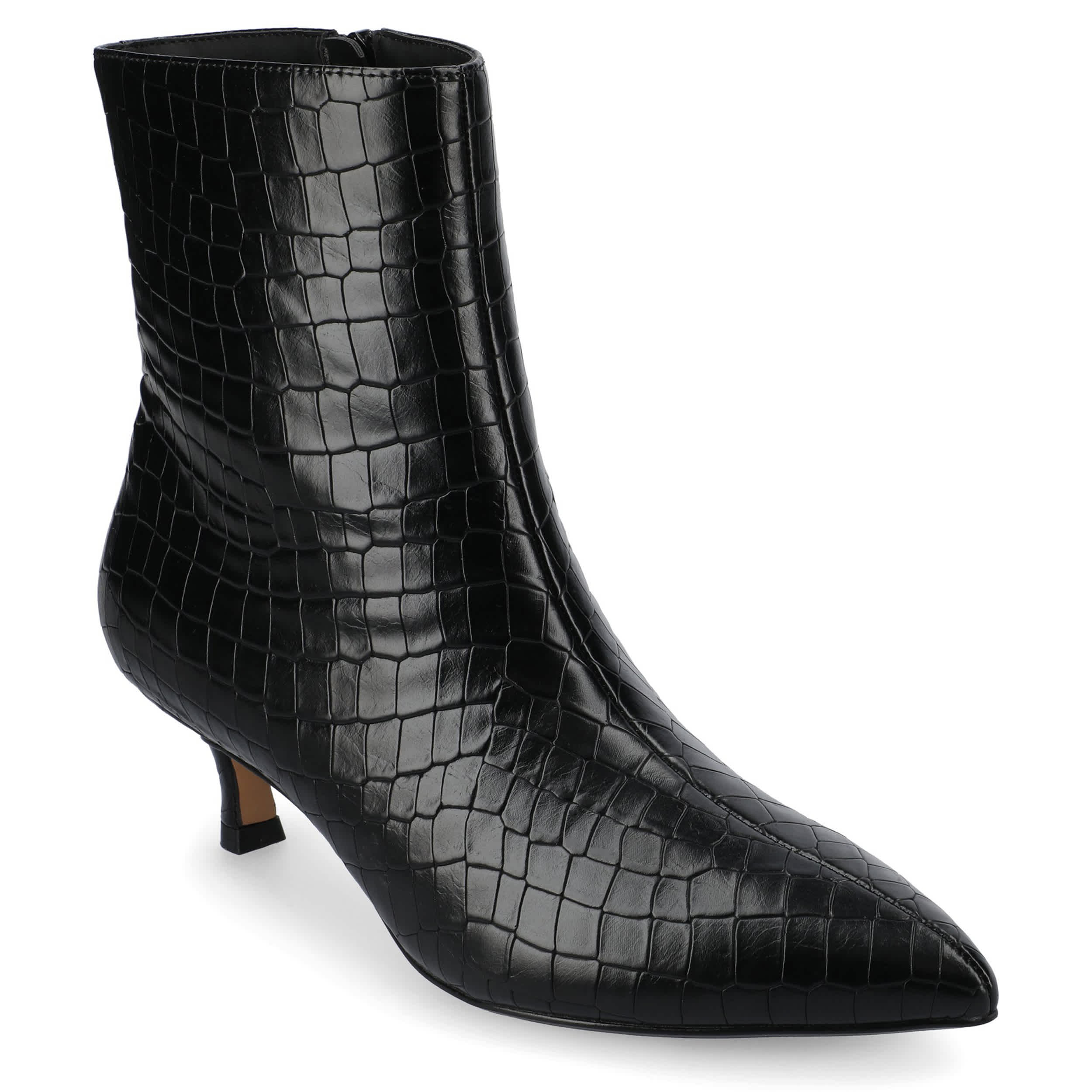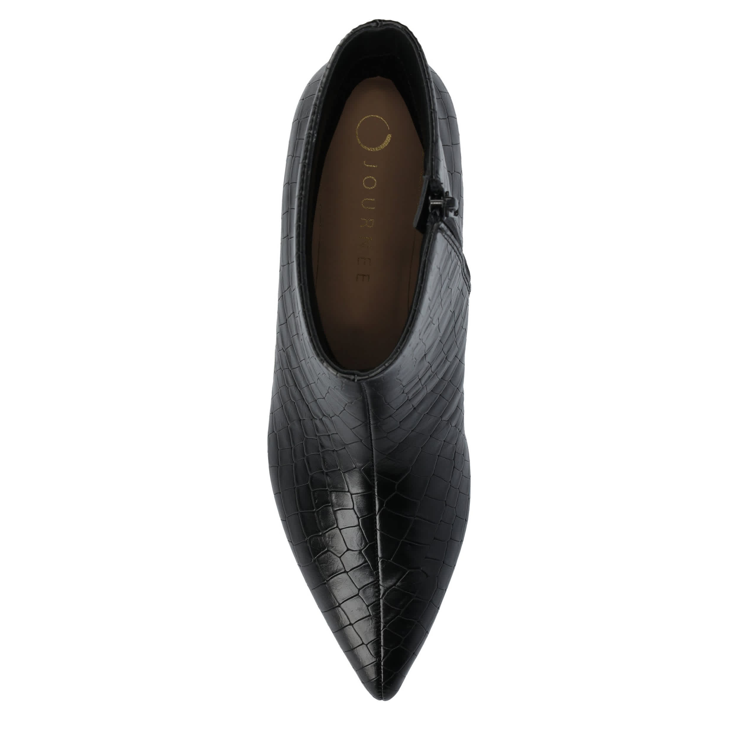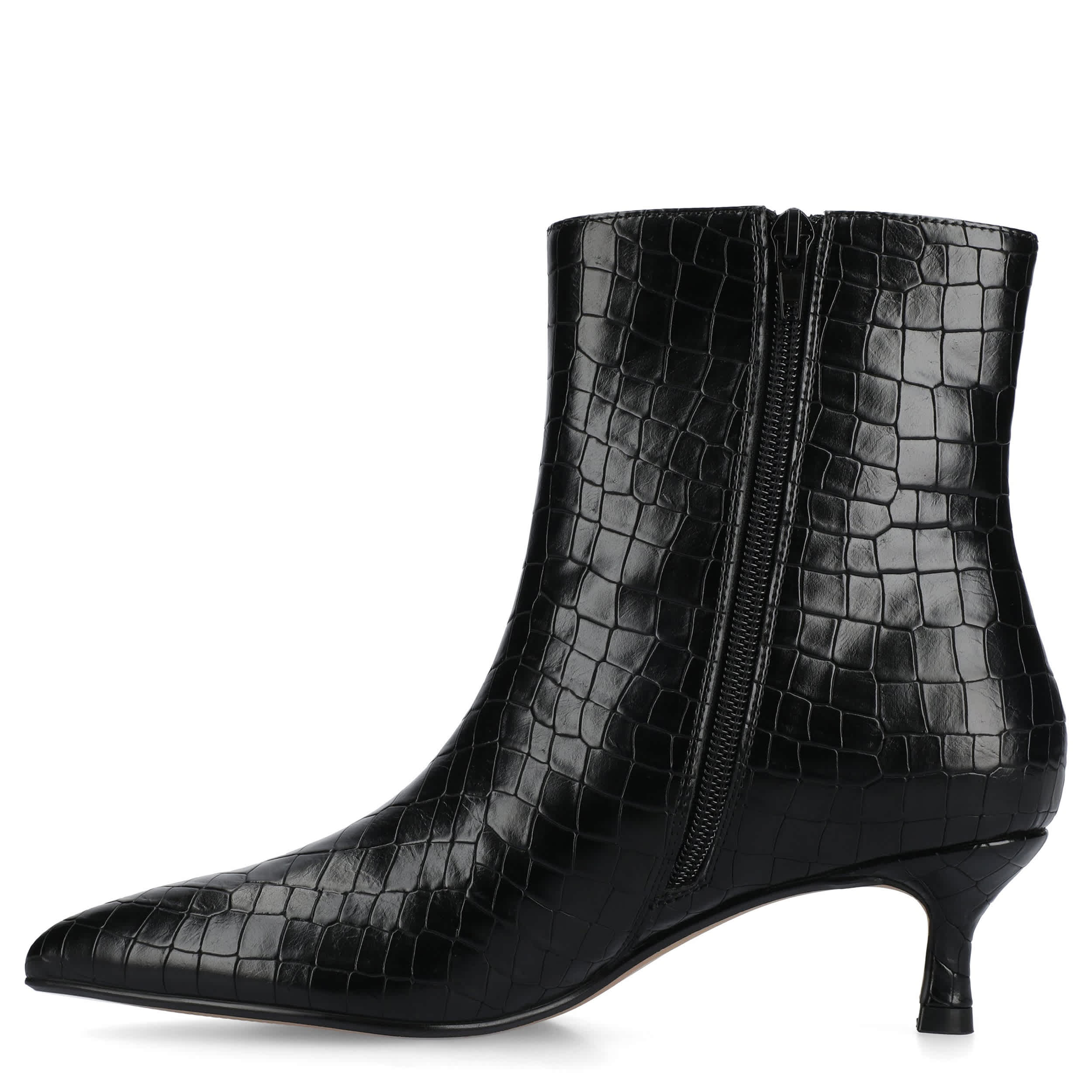 Make your point made in the Arely women's bootie from Journee Collection. With a crocodile print vegan leather upper featuring a sleek pointed toe for extra style, this easy-on boot is a must-have. The Journee Comfort System insole cushions, while the dainty kitten heel provides a slight lift.