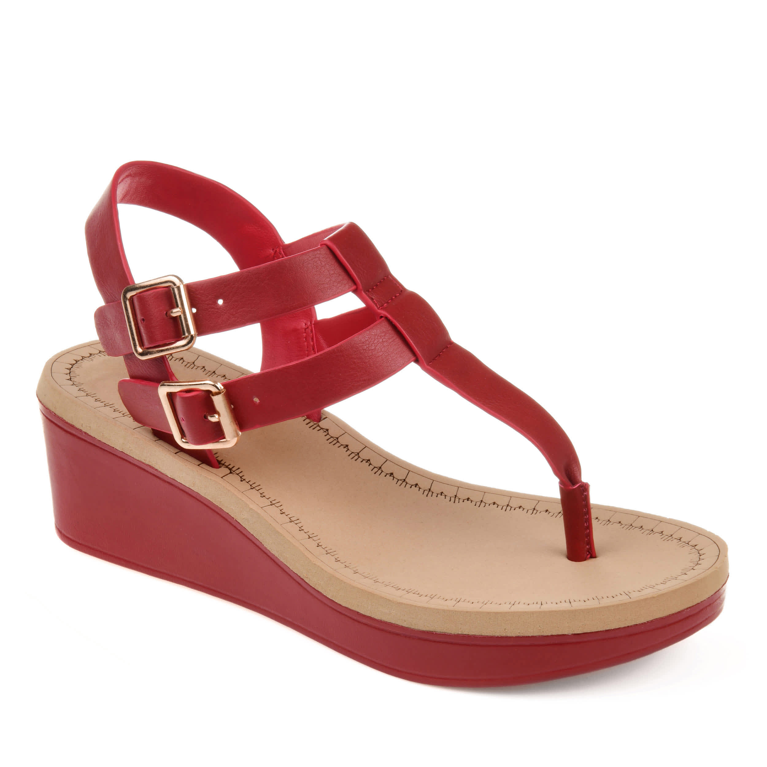 Pump up your sunny looks with the Bianca wedge sandal from Journee Collection. The synthetic upper has a thong construct with dual buckle closures for a stylish and comfortable look. The covered 2¼" wedge heel blends comfort and fashion to create the perfect silhouette.