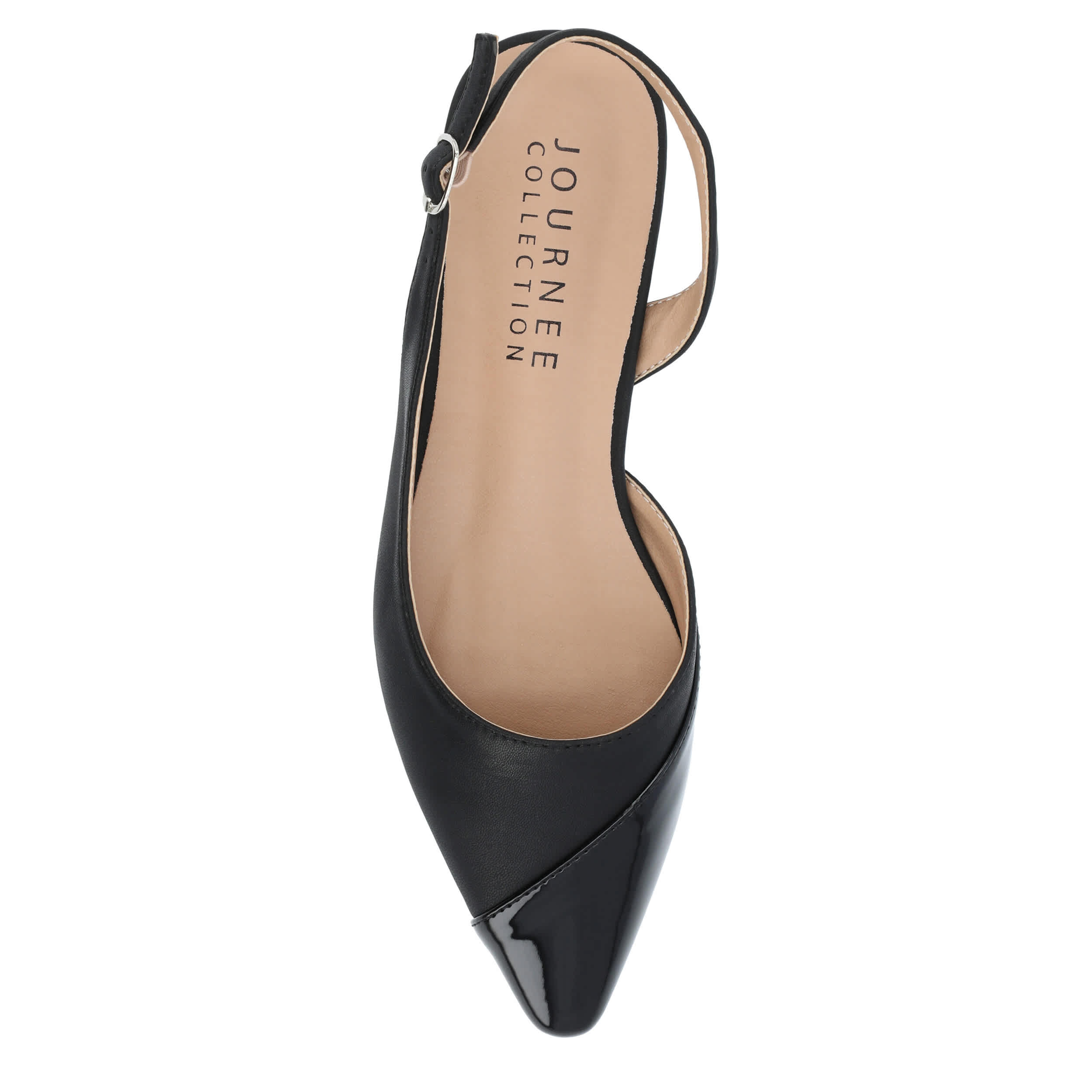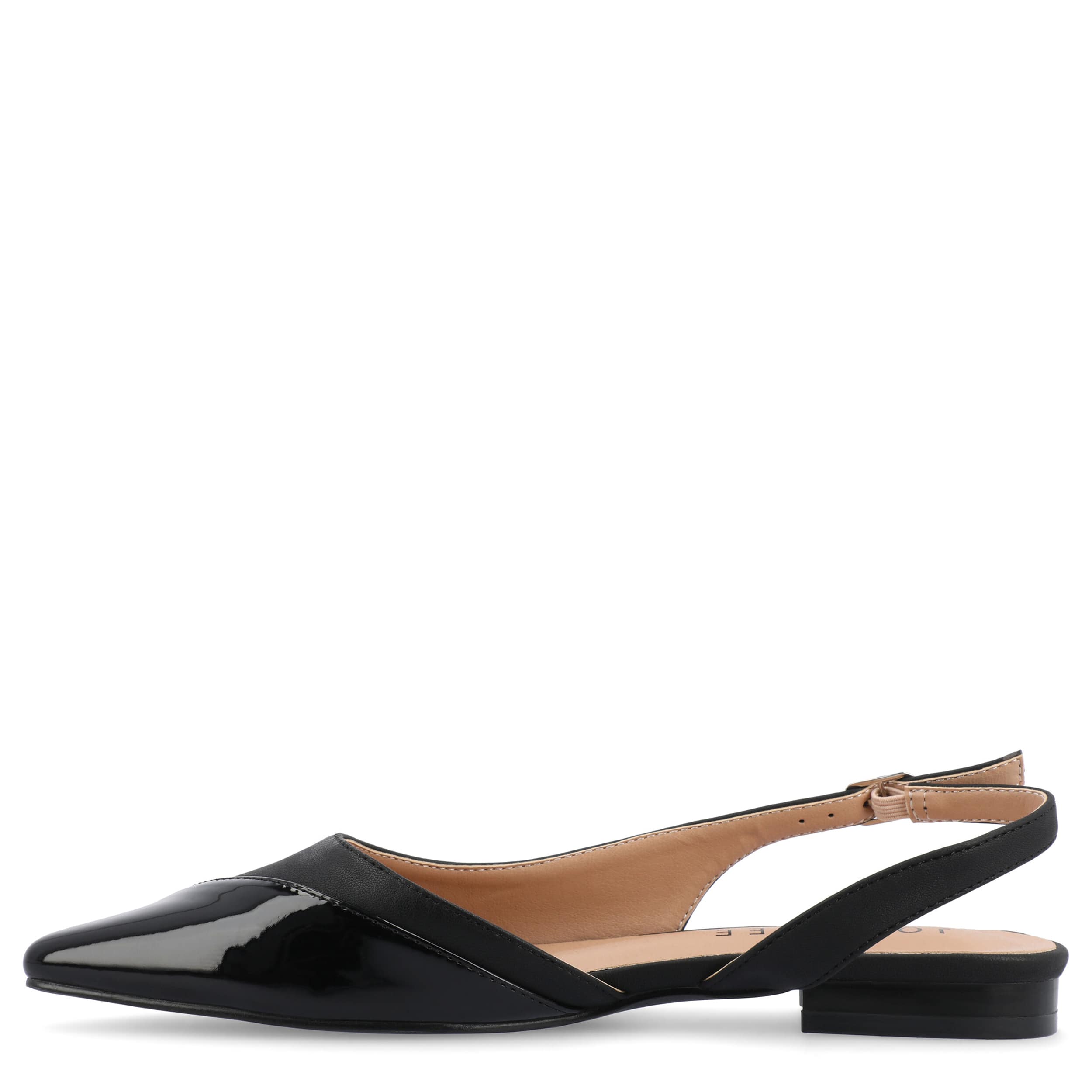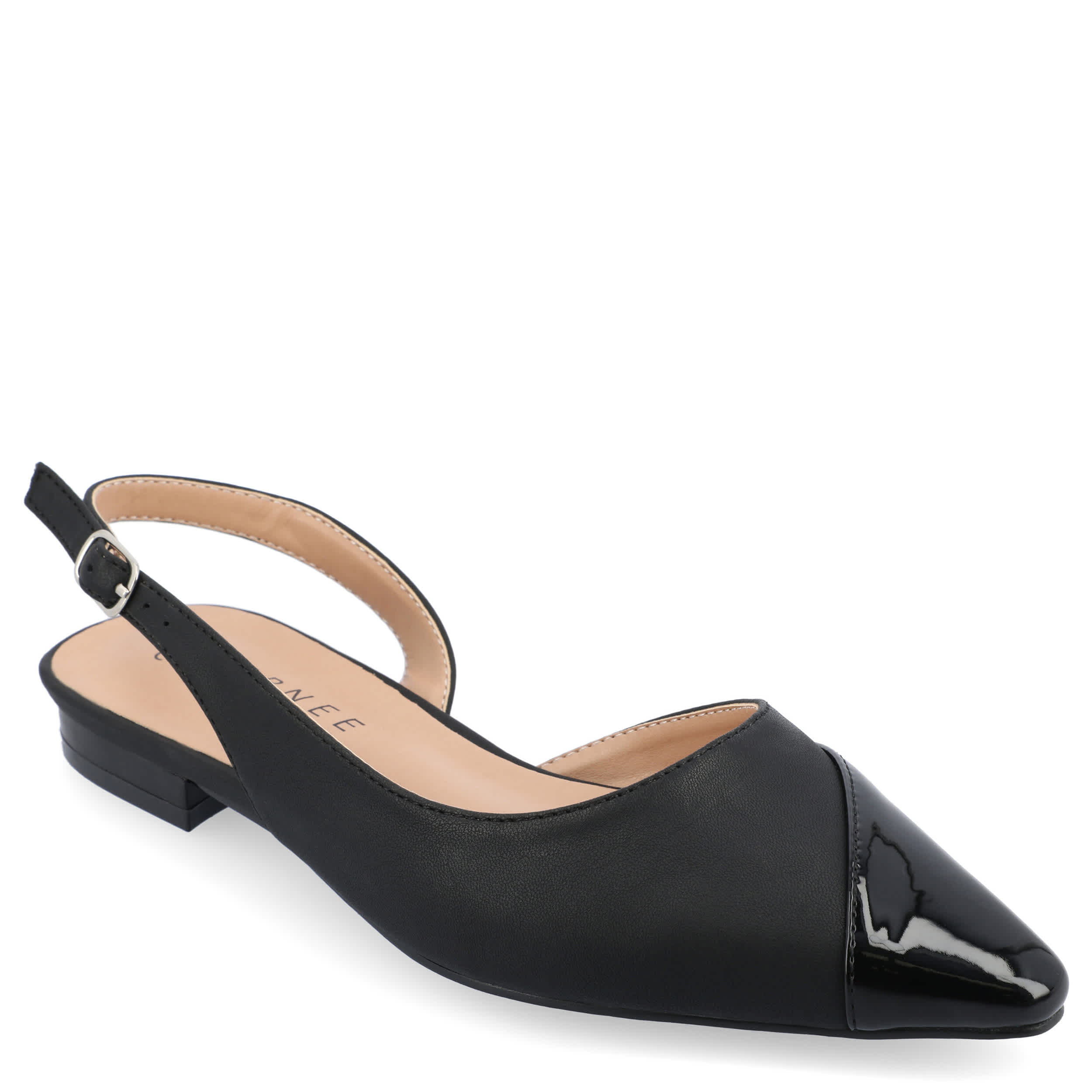 Gain style points and more in the Daphnne flat from Journee Collection. Featuring a faux leather & patent leather upper with an asymmetrical cap toe, this slingback pairs well with a dress or slacks. The Tru Comfort Foamâ„¢ provides excellent cushioning, while the synthetic sole is durable.