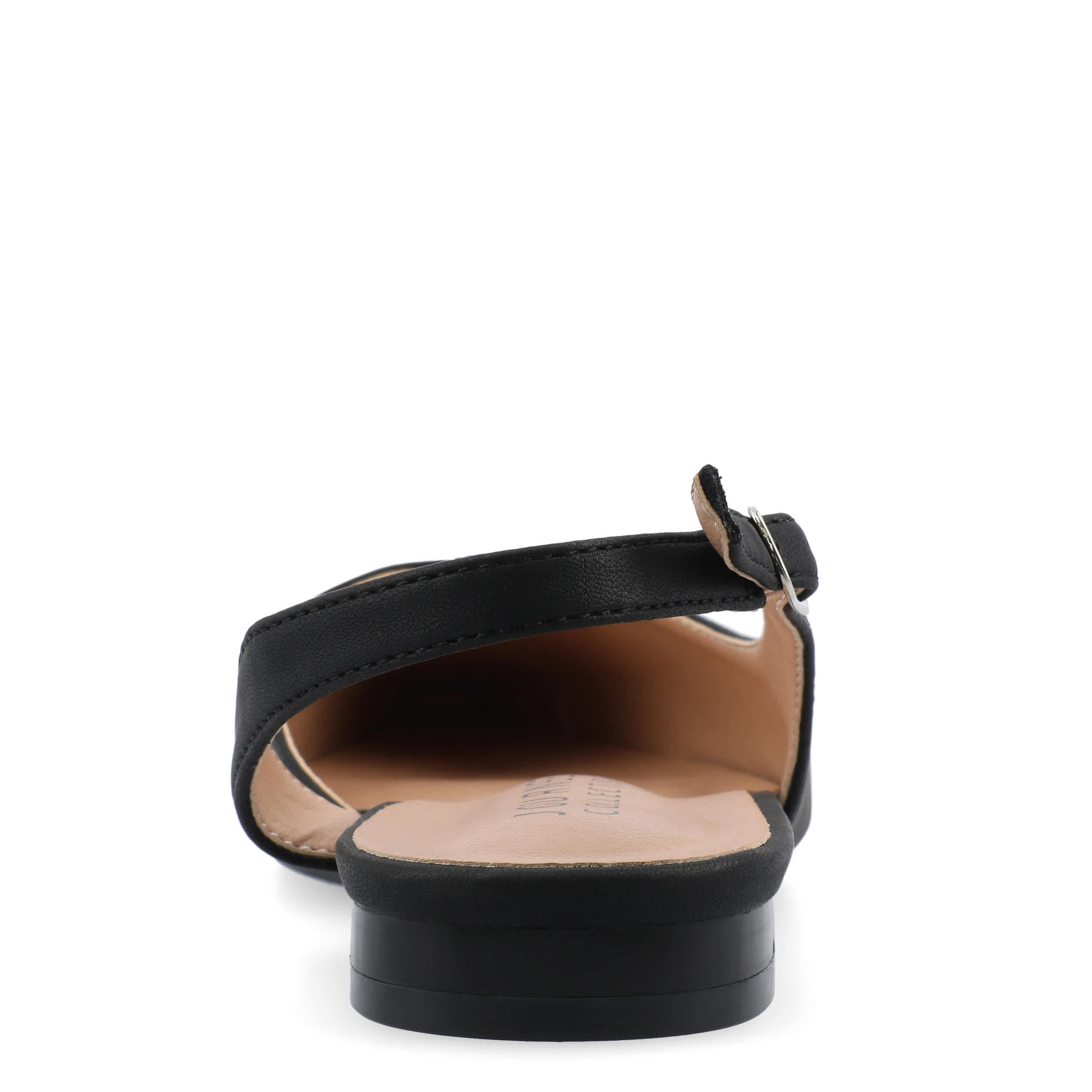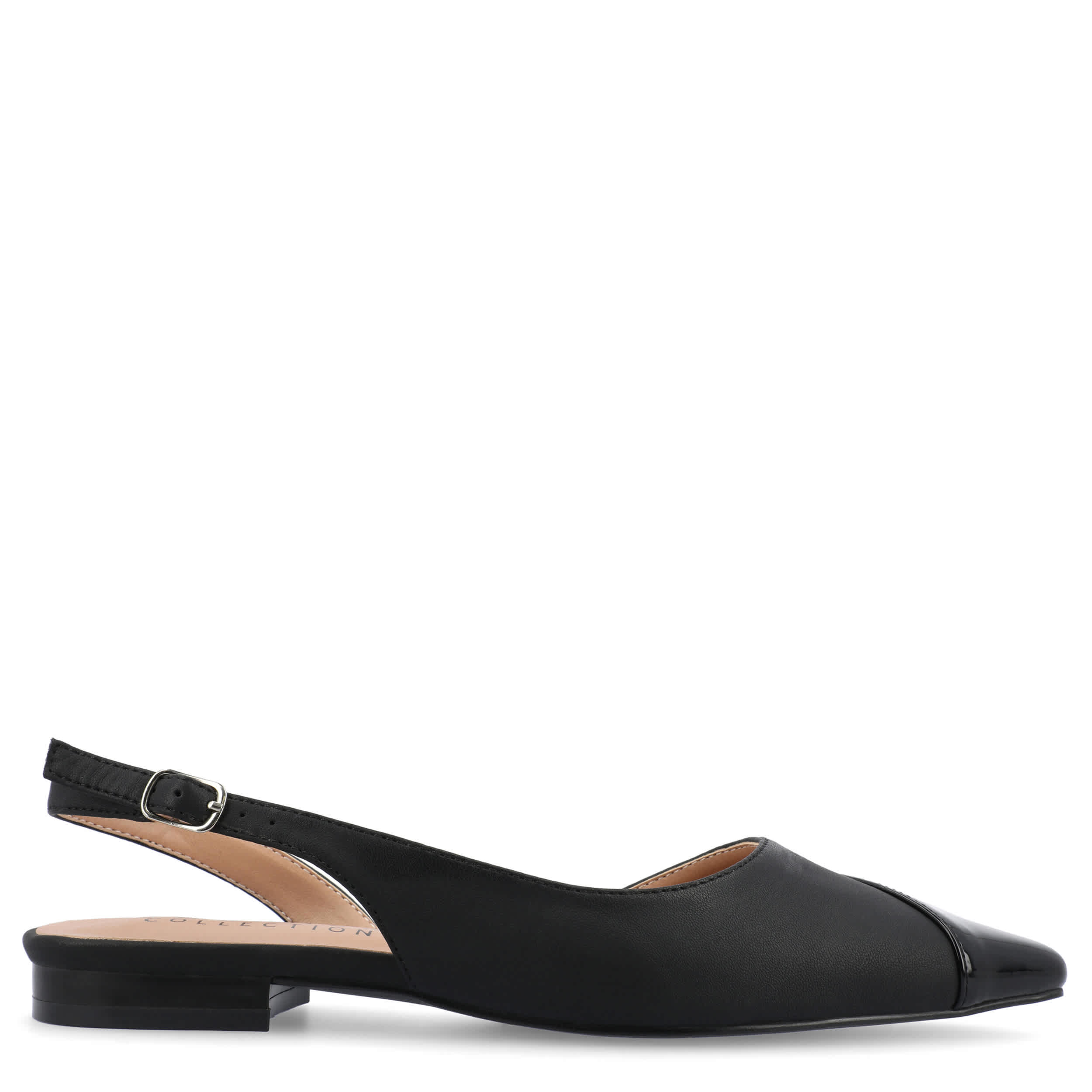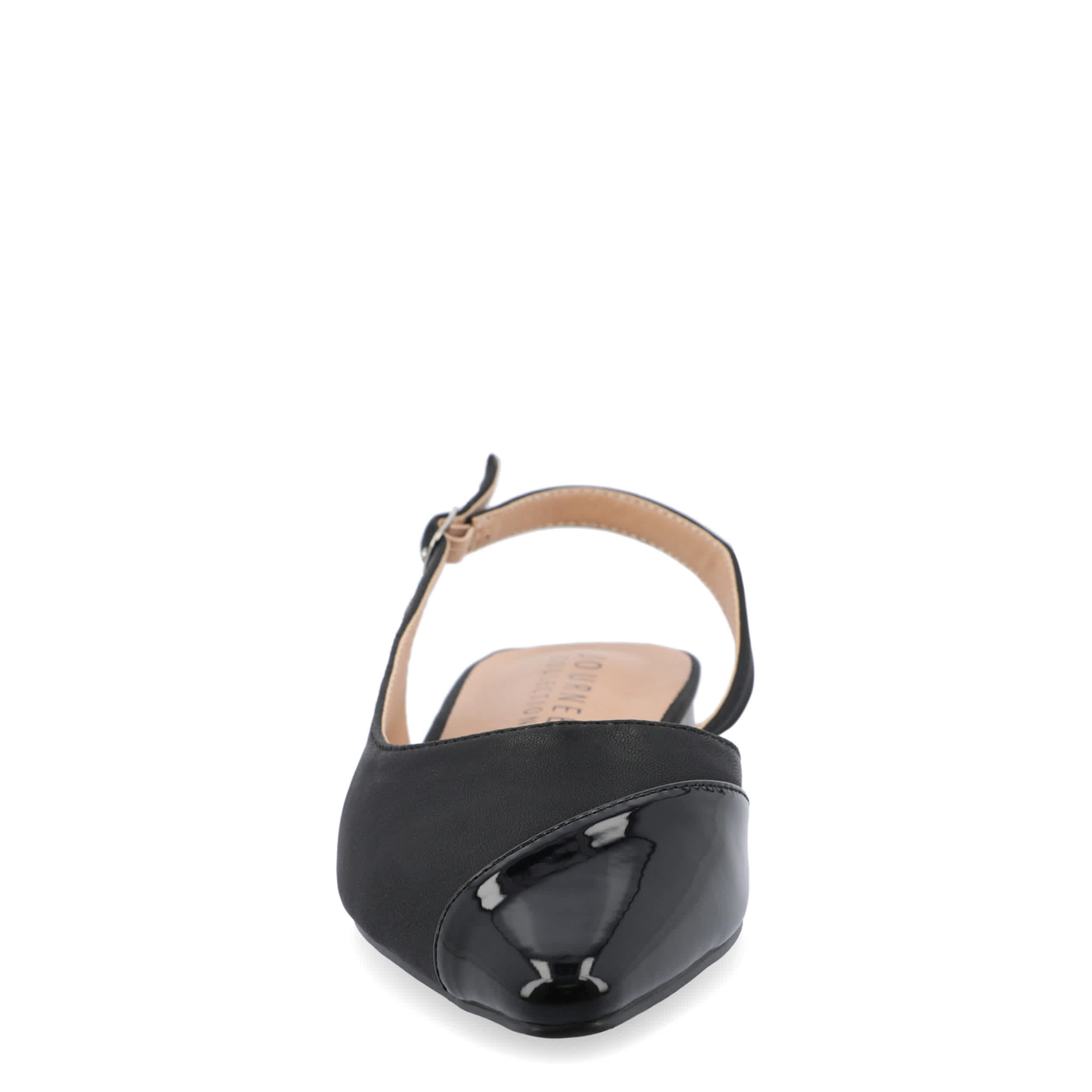 Gain style points and more in the Daphnne flat from Journee Collection. Featuring a faux leather & patent leather upper with an asymmetrical cap toe, this slingback pairs well with a dress or slacks. The Tru Comfort Foamâ„¢ provides excellent cushioning, while the synthetic sole is durable.