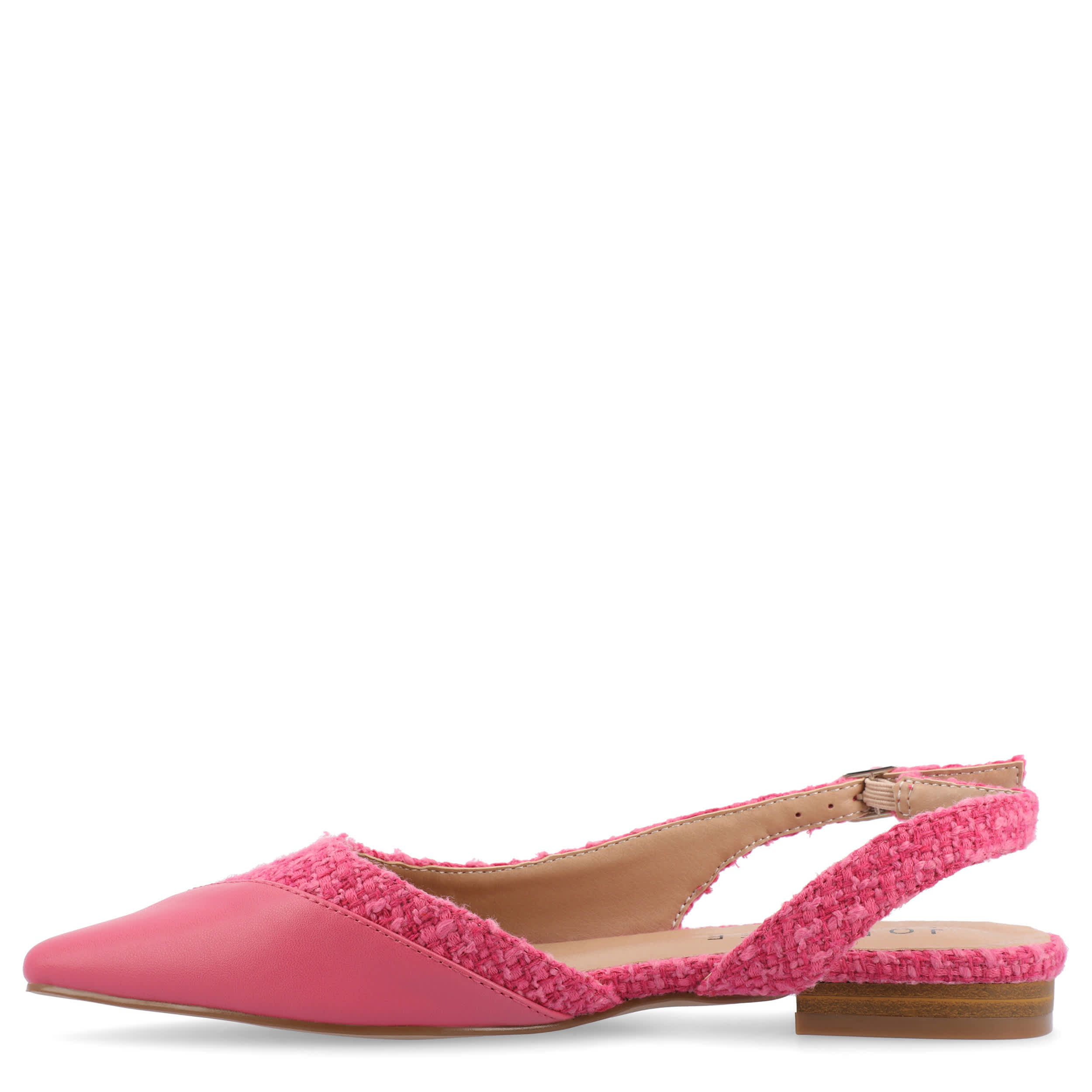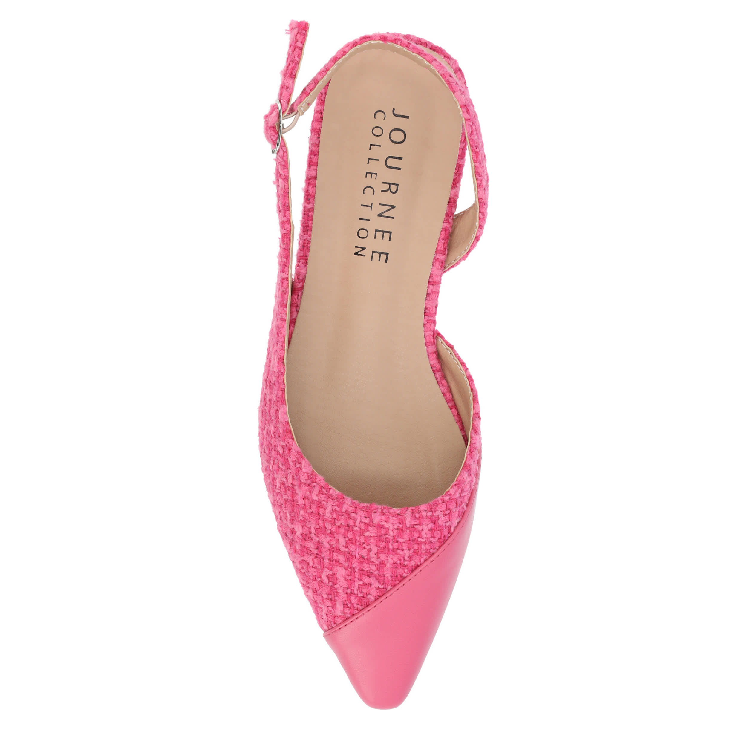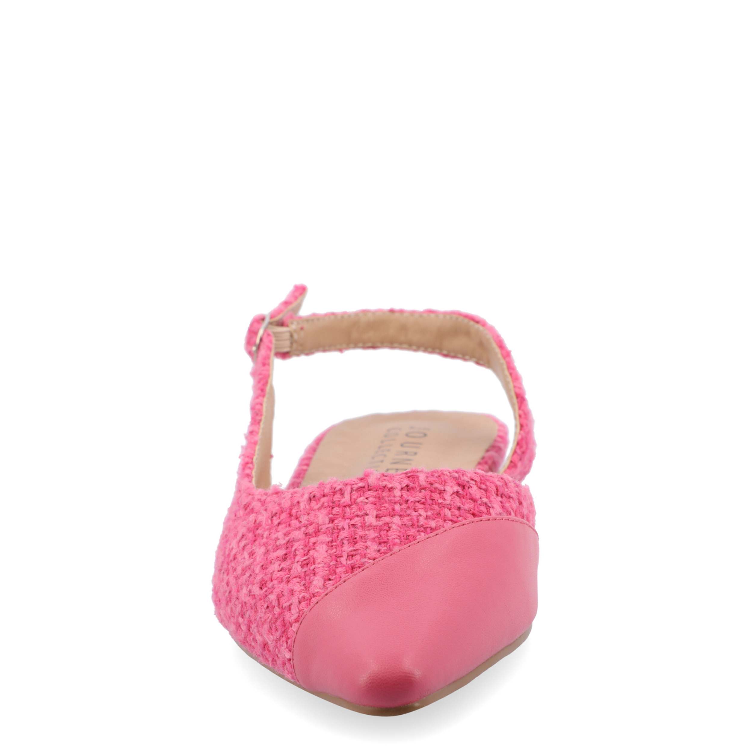 Gain style points and more in the Daphnne flat from Journee Collection. Featuring a tweed & faux leather upper with an asymmetrical cap toe, this slingback pairs well with a dress or slacks. The Tru Comfort Foamâ„¢ provides excellent cushioning, while the synthetic sole is durable.