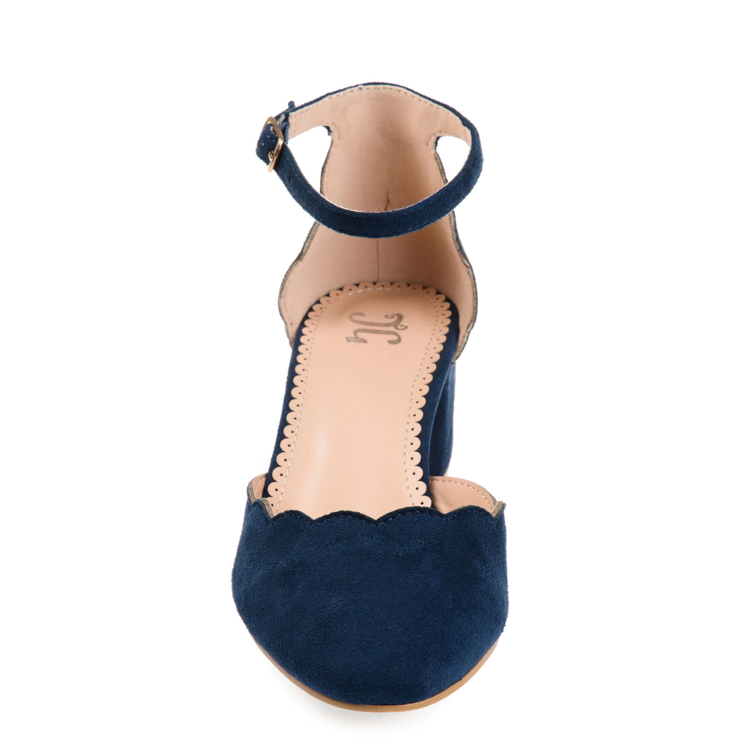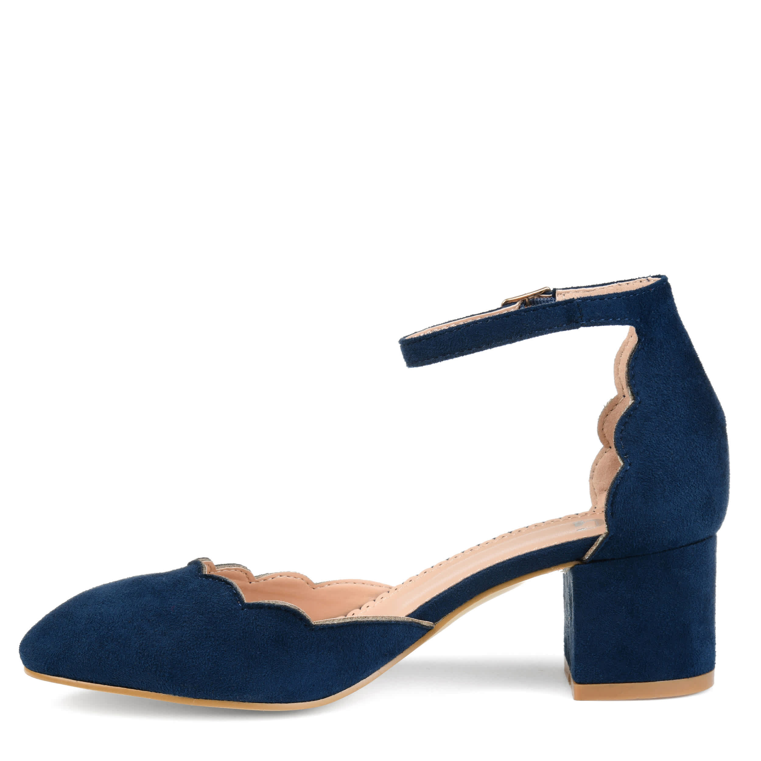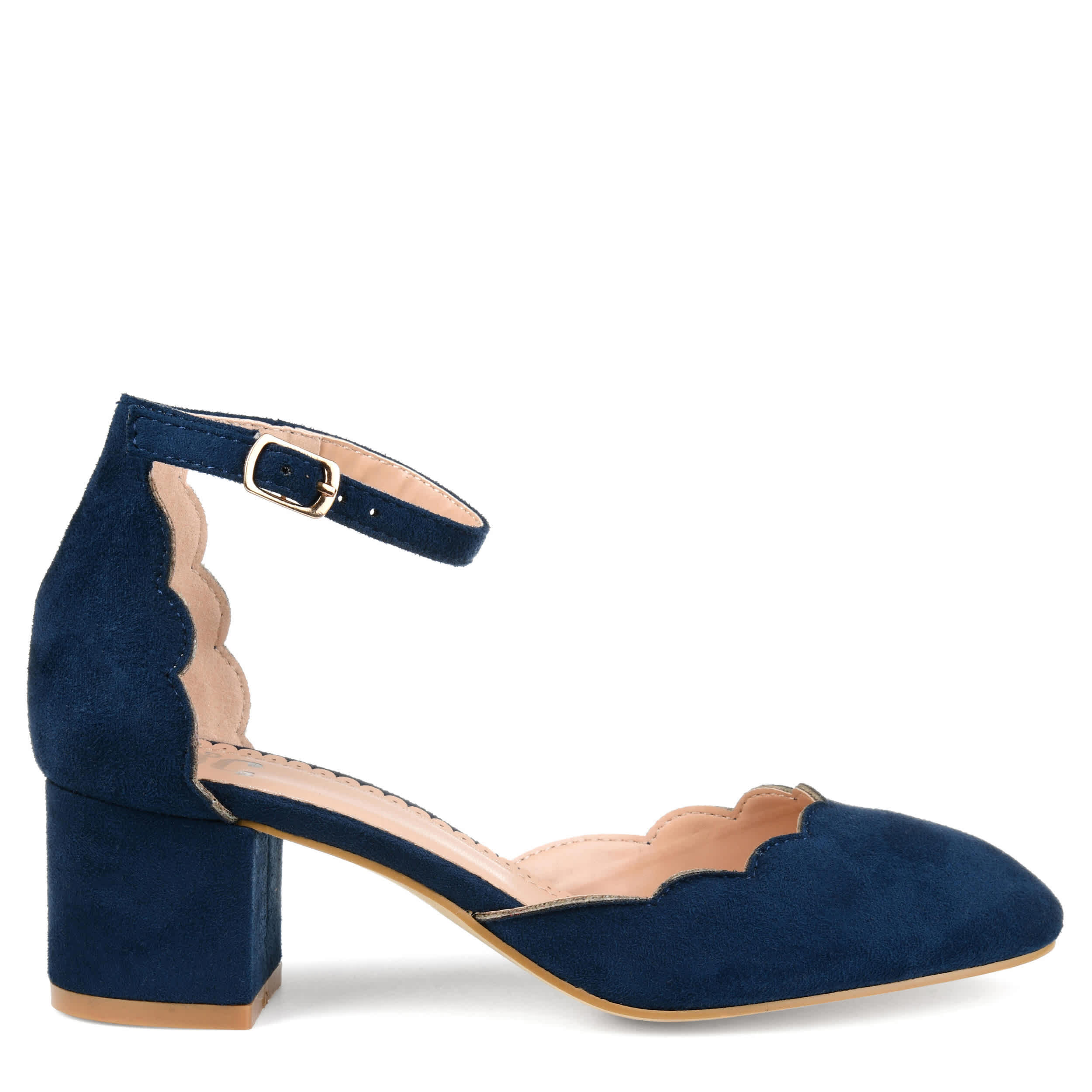 Elegant but comfortable, this Edna pump from Journee Collection will be your new style BFF. The faux suede upper has a closed almond toe design with scalloped edges and a halo strap closure for a modern pop. The covered 2" block heel adds just enough height to your silhouette.