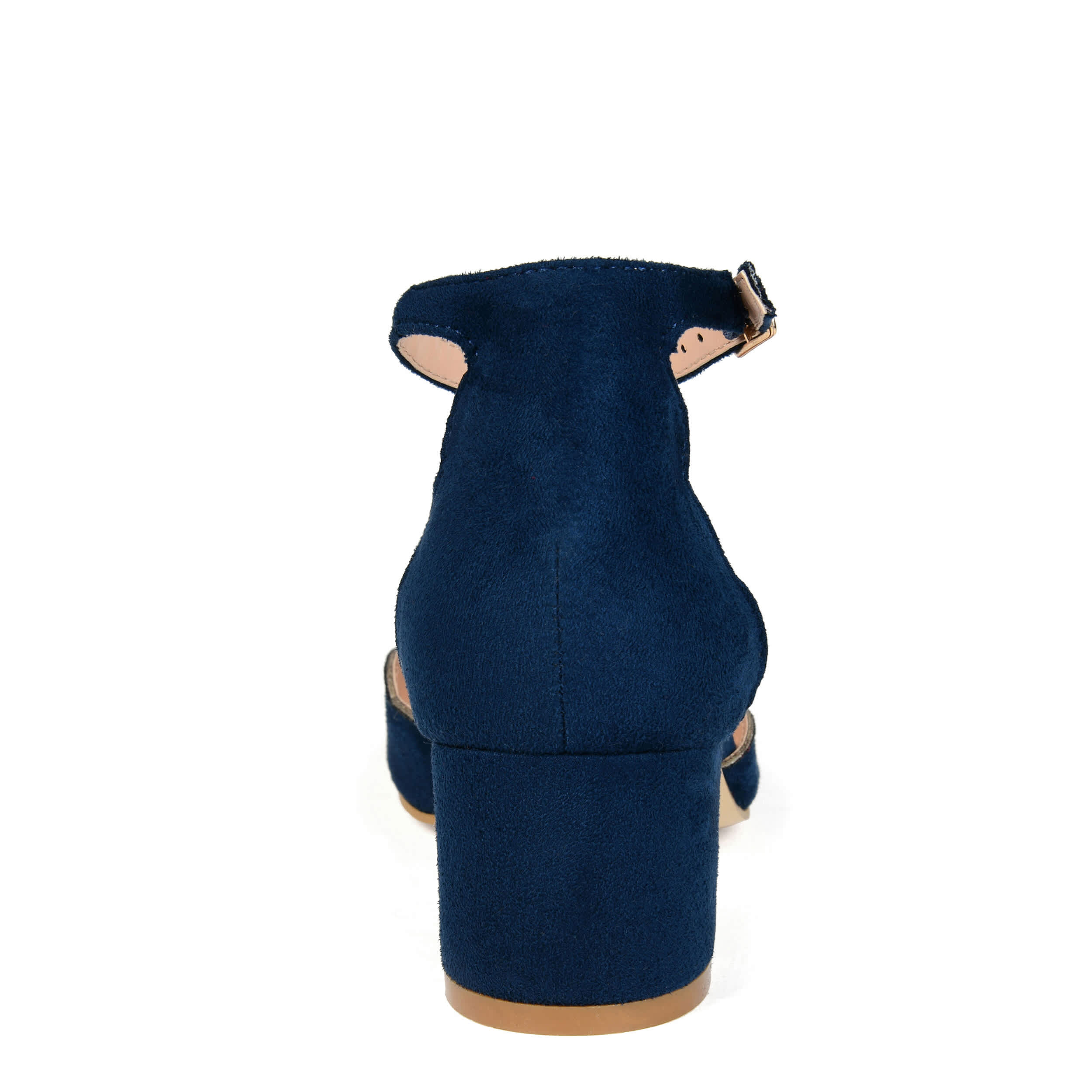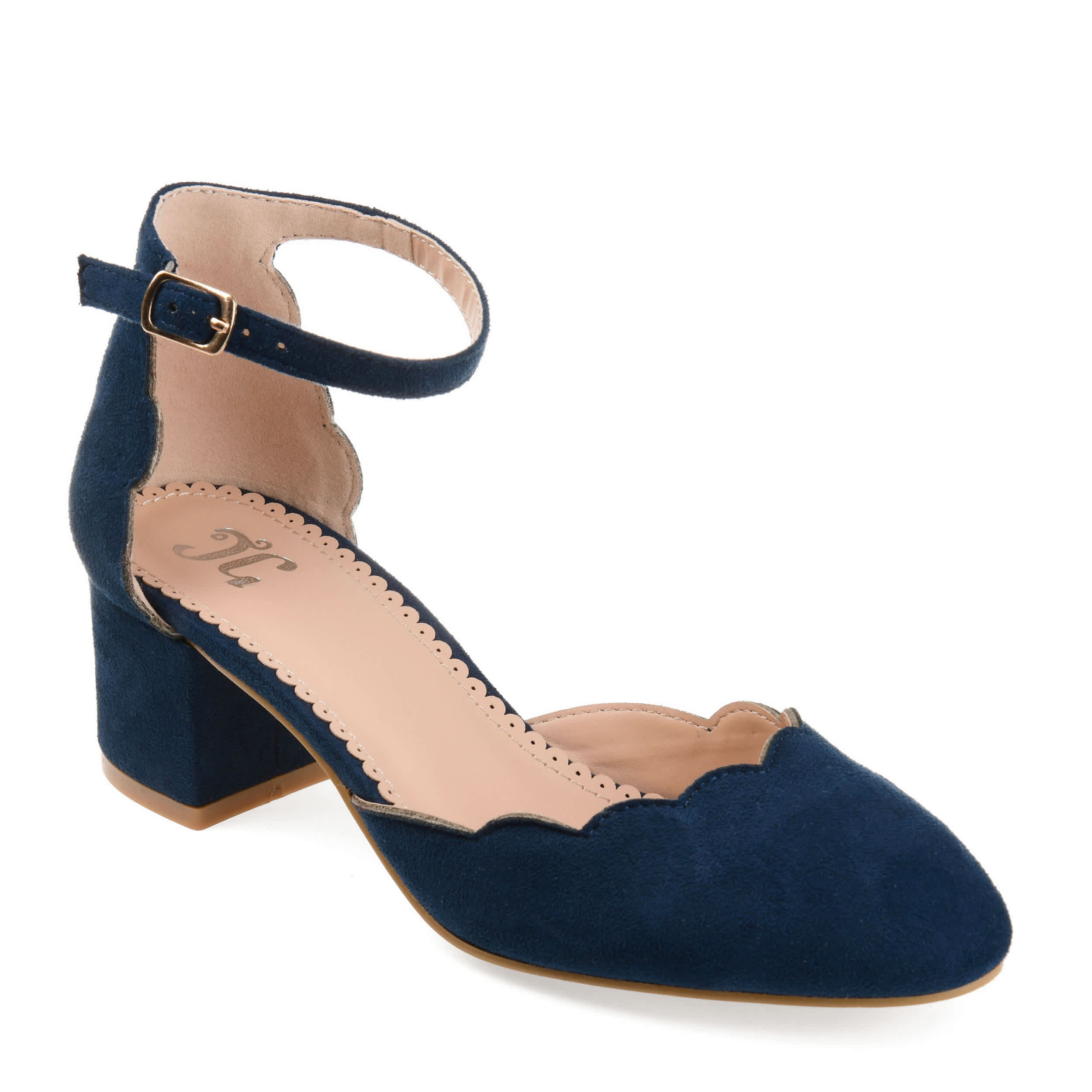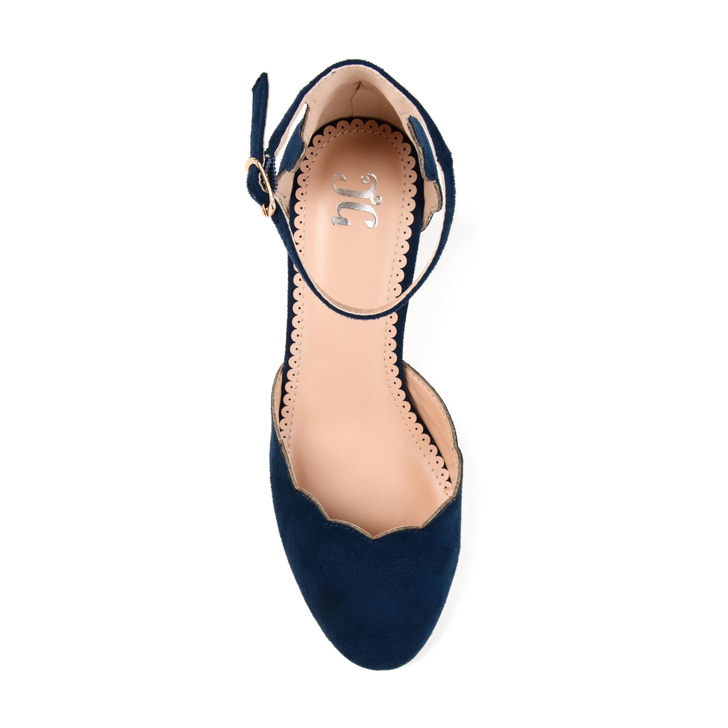 Elegant but comfortable, this Edna pump from Journee Collection will be your new style BFF. The faux suede upper has a closed almond toe design with scalloped edges and a halo strap closure for a modern pop. The covered 2" block heel adds just enough height to your silhouette.