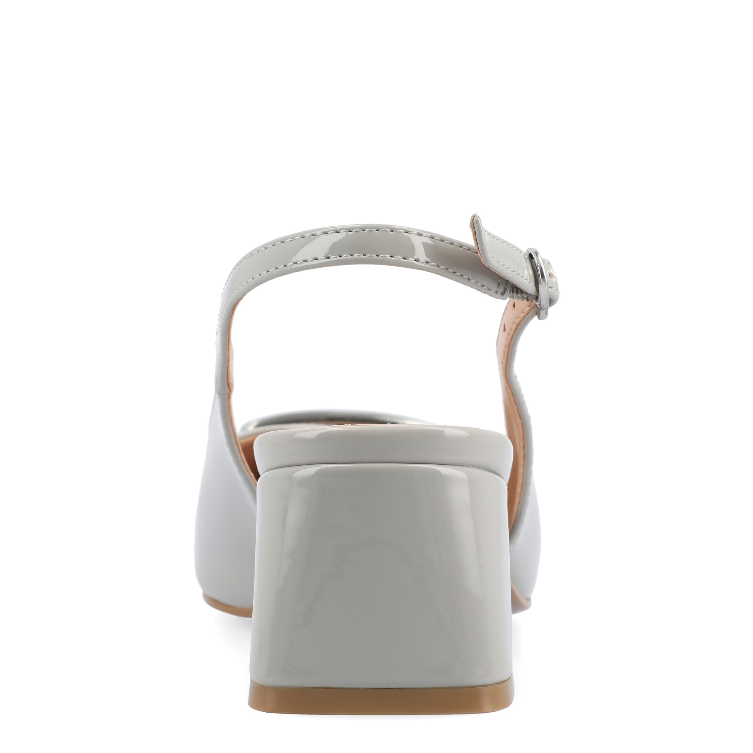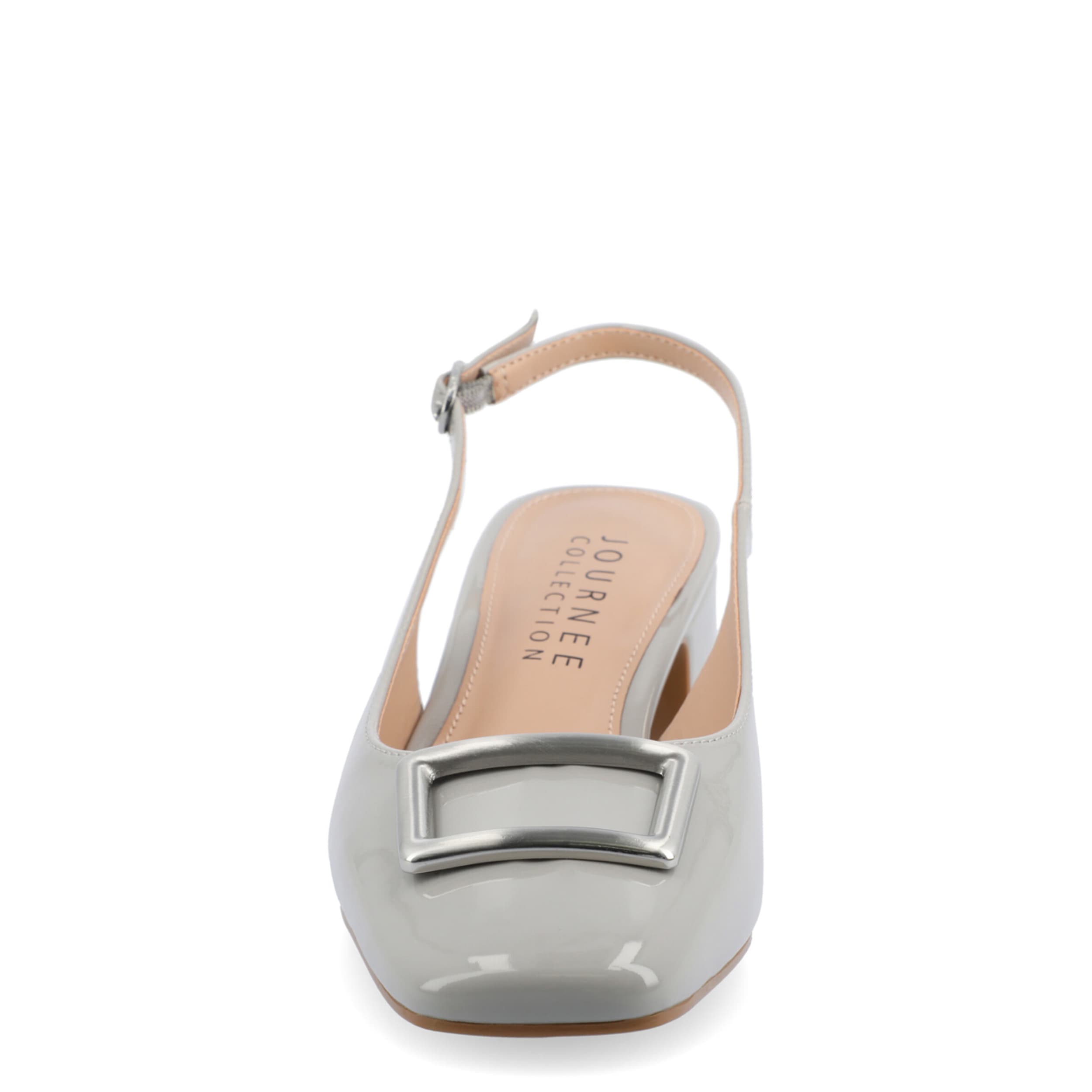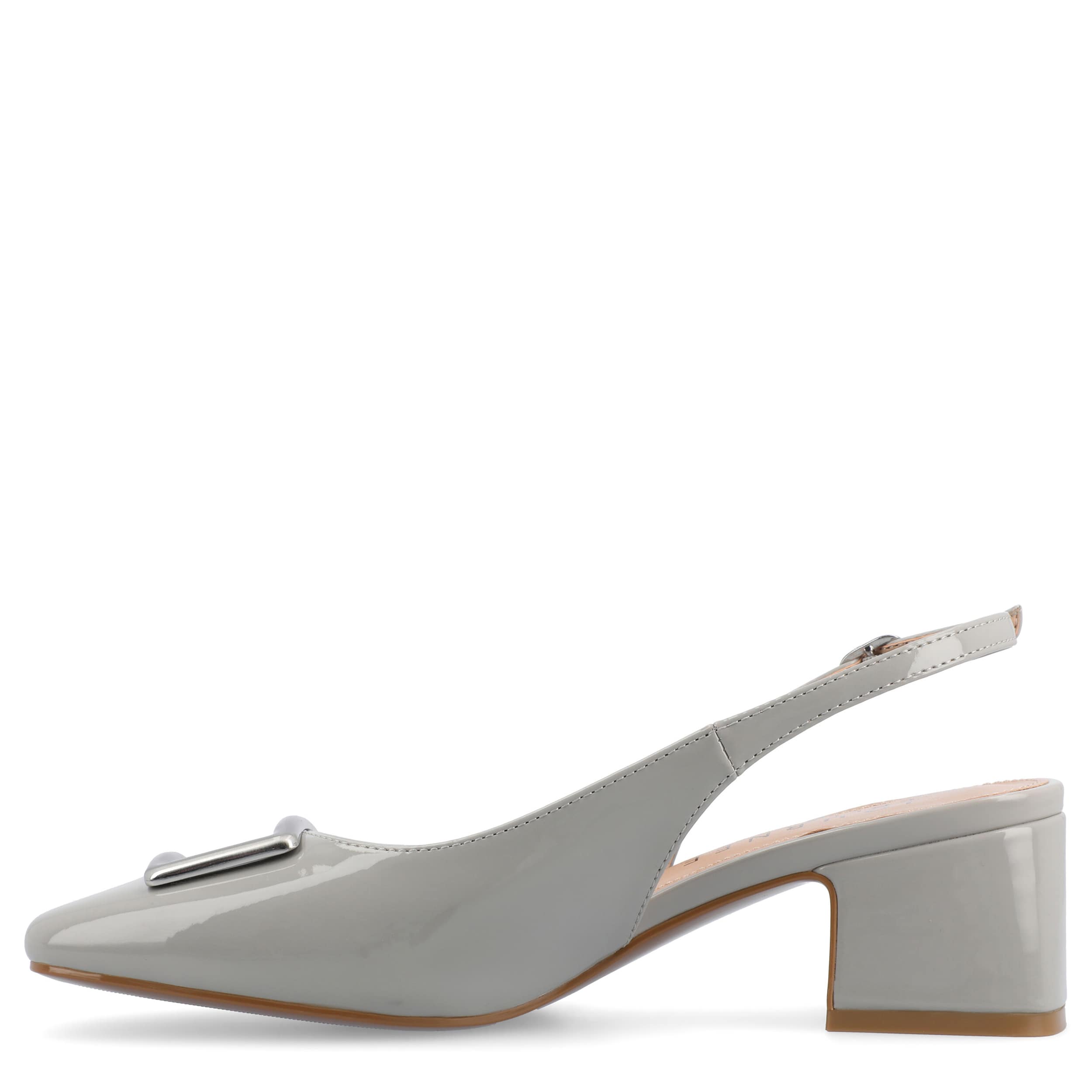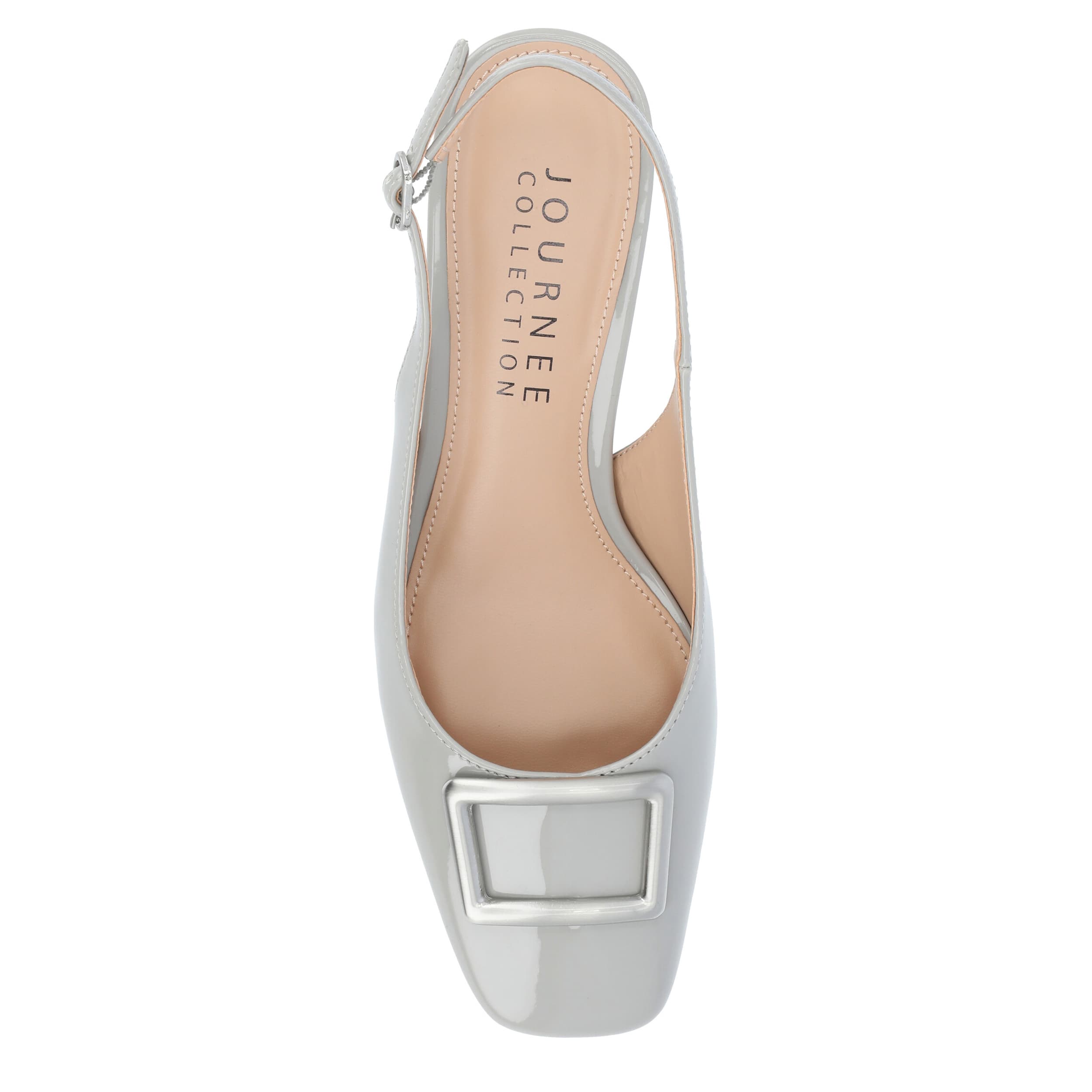 Step up your versatile style with the Journee Collection Everlee pump. Featuring a faux leather upper with metal buckle hardware, this slingback is contemporary for any occasion. The Tru Comfort Foamâ„¢ insole cushions your steps, while the block heel offers a nice lift.