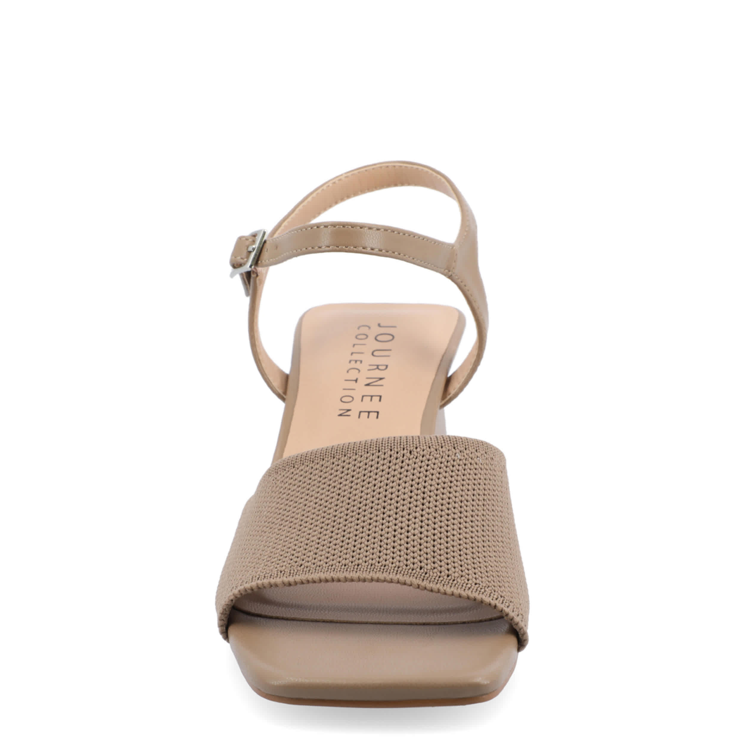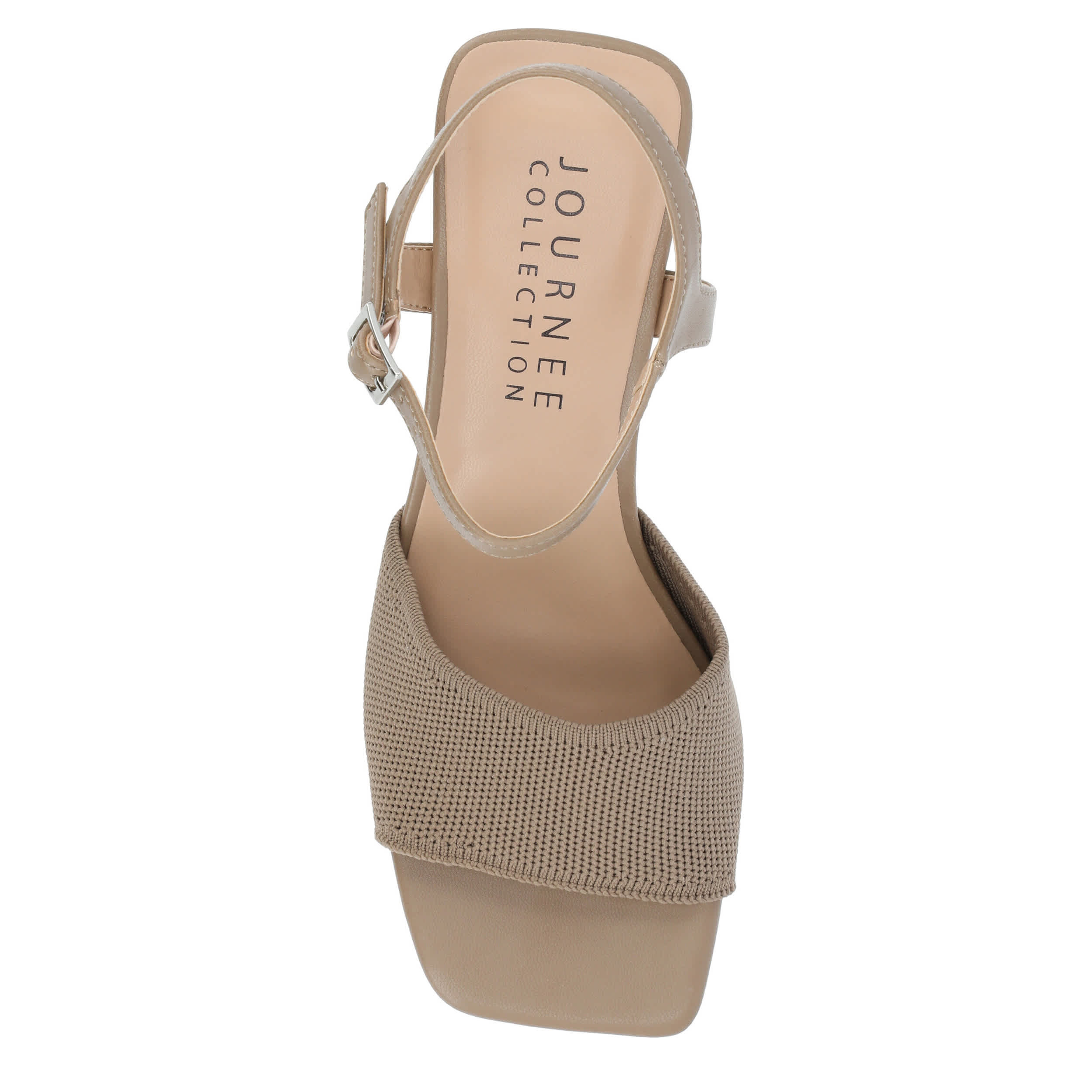 Be fashion forward with the Evylinn sandal from Journee Collection. With a fabric upper, this shoe has a square toe and sleek silhouette for extra style. The Tru Comfort Foamâ„¢ insole soothes your foot, while the block heel offers a nice elevation.