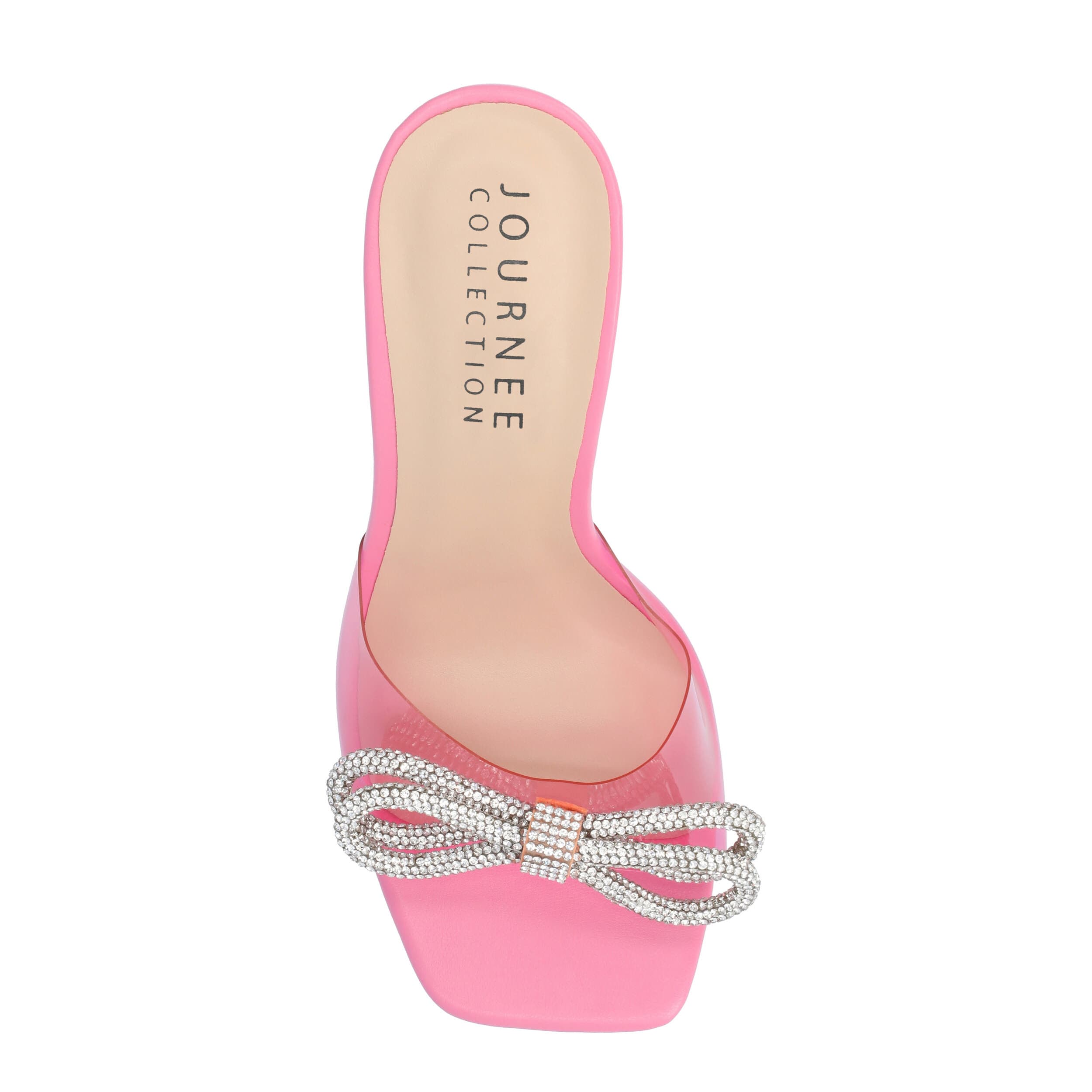 Sparkle and shine all night in the Fenella women's sandal from Journee Collection. With a luxe lucite upper featuring a gorgeous rhinestone bow accent at the toe for extra flair, this sassy sandal looks fantastic with your favorite mini dress. A Tru Comfort Foamâ„¢ footbed cushions and supports your feet, while the high stiletto heel is guaranteed to draw attention.