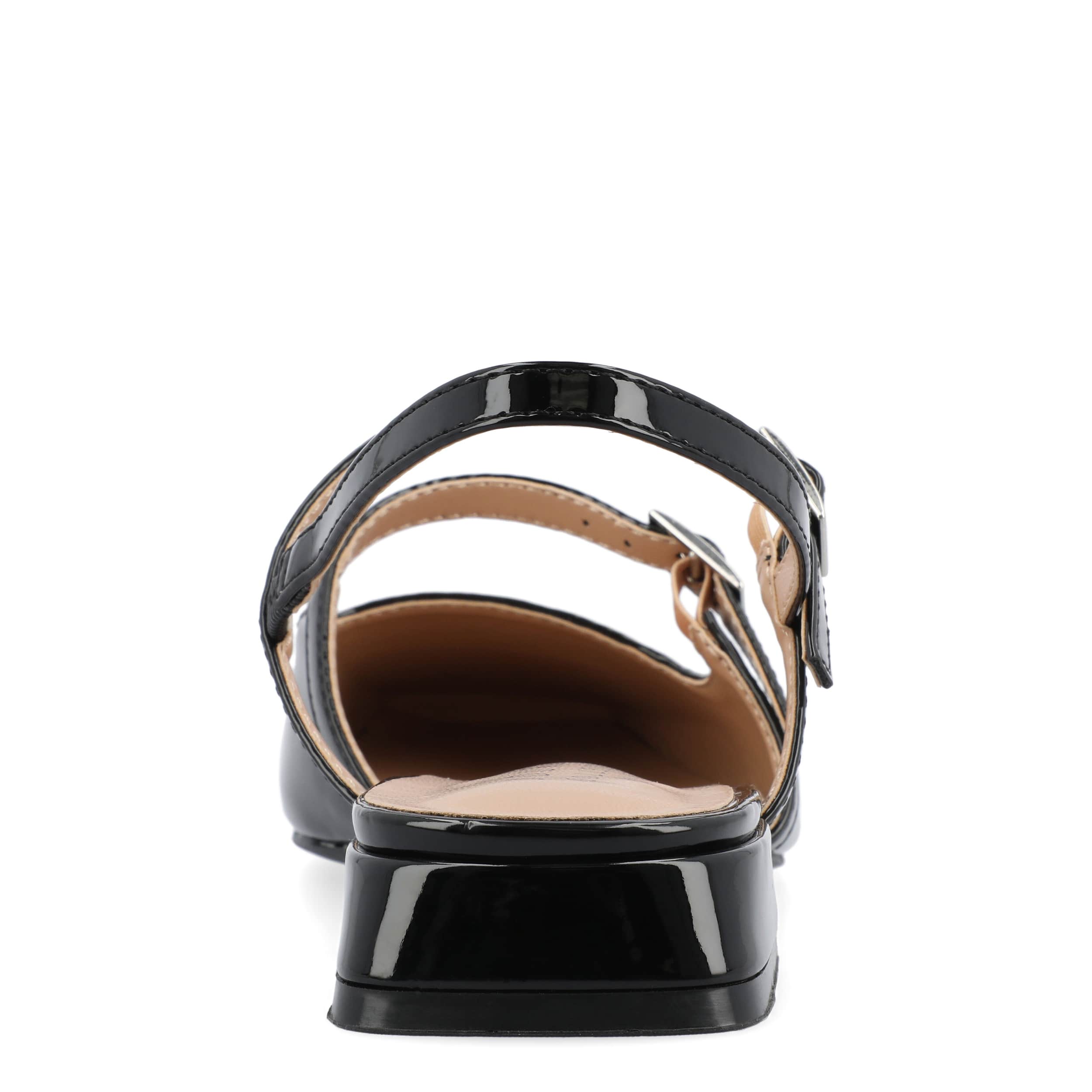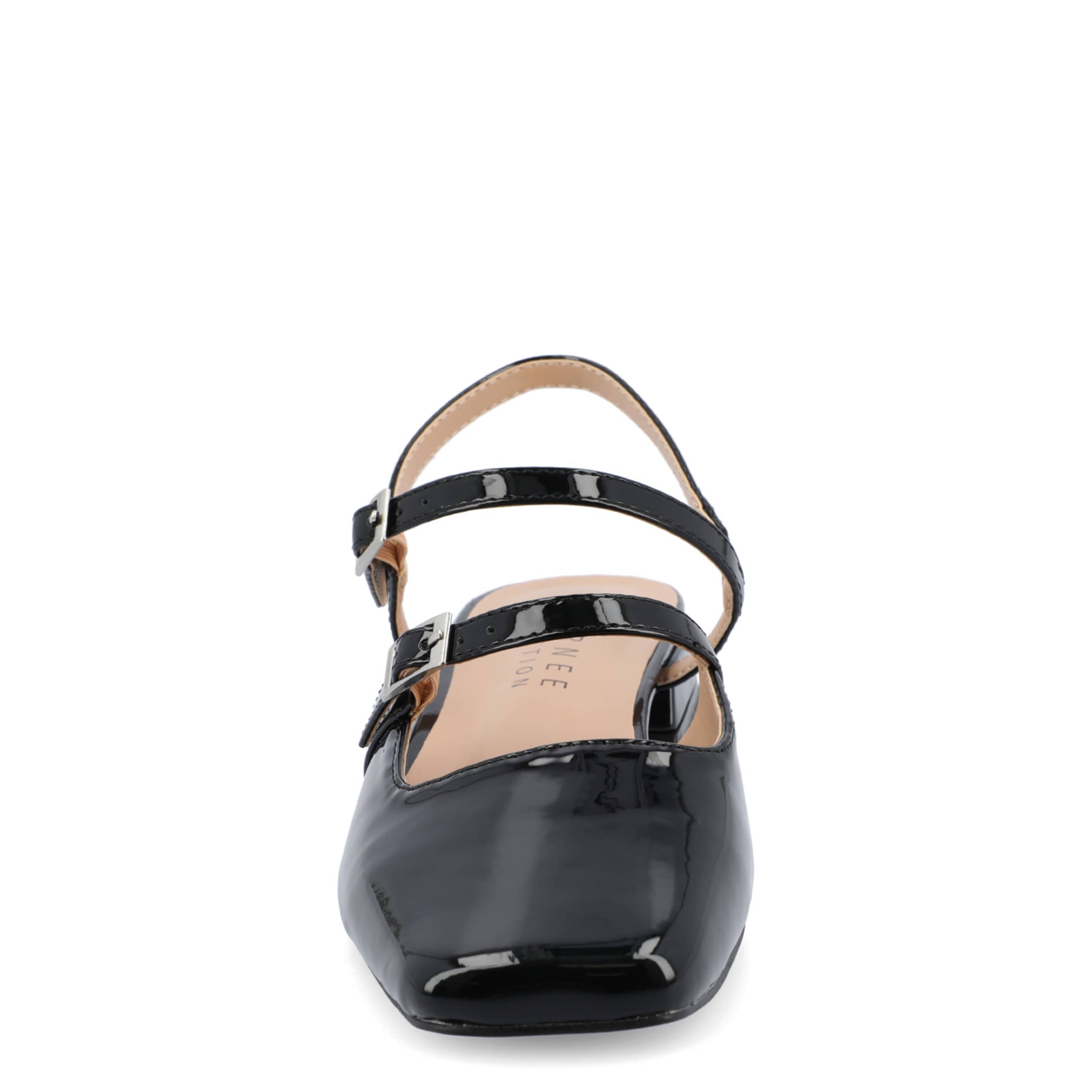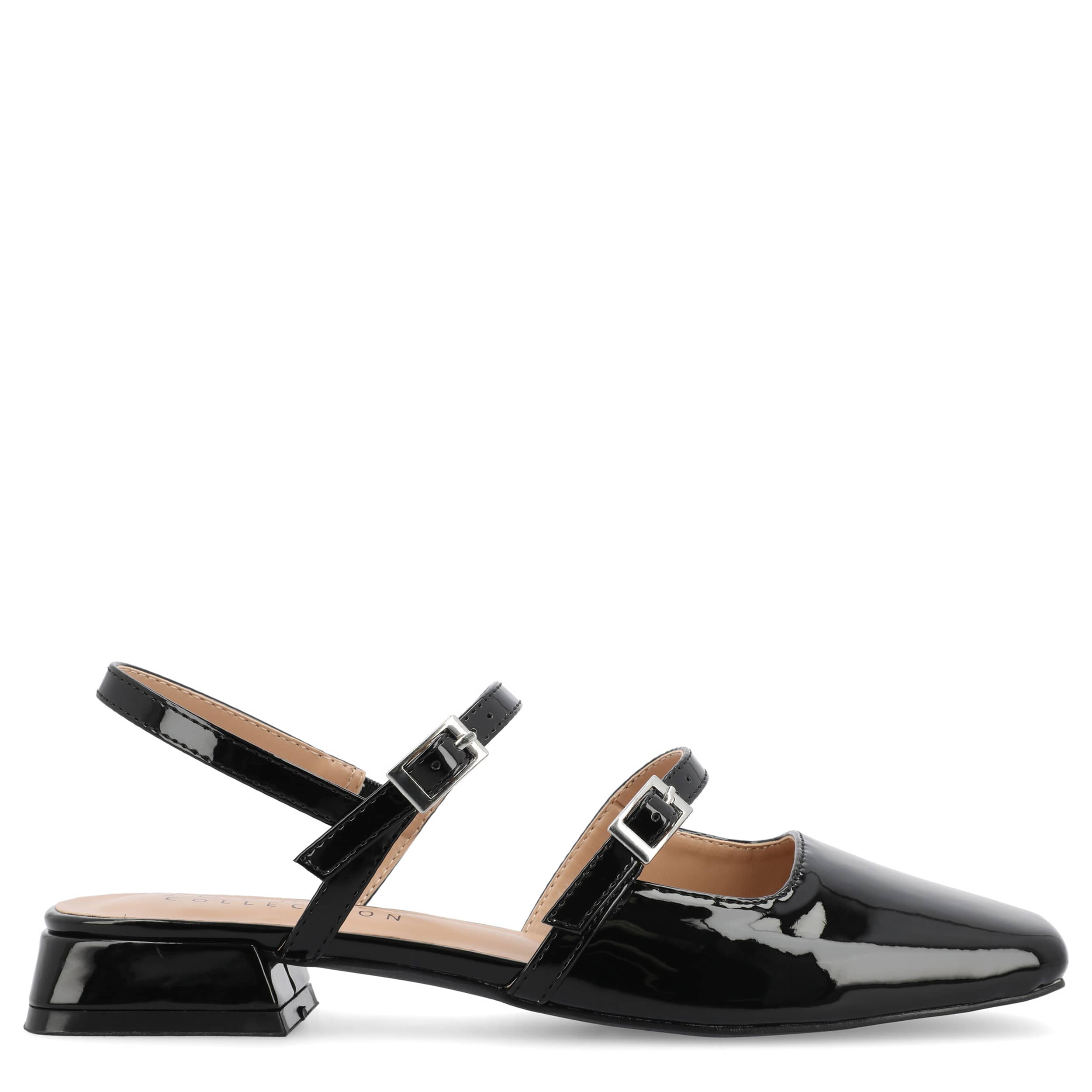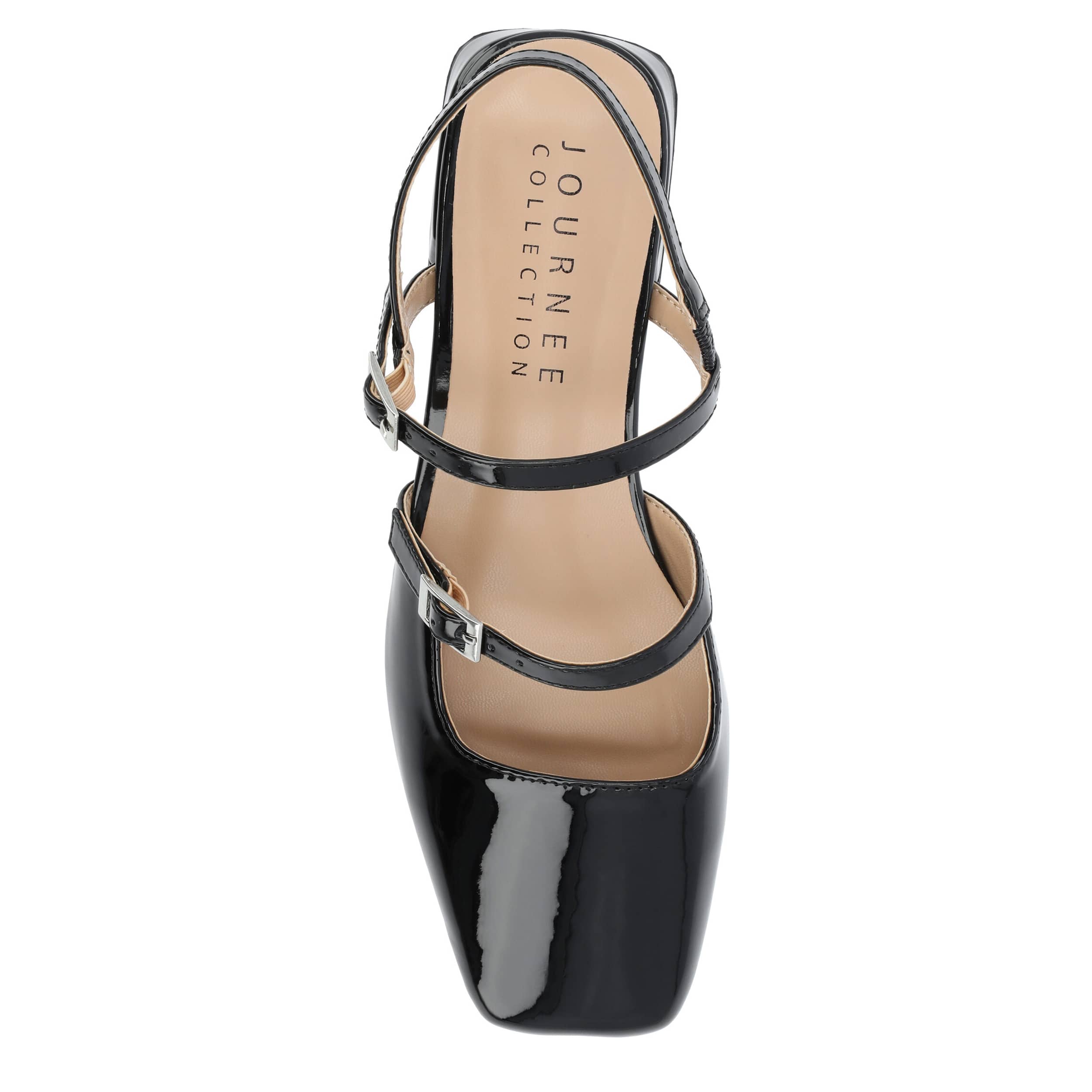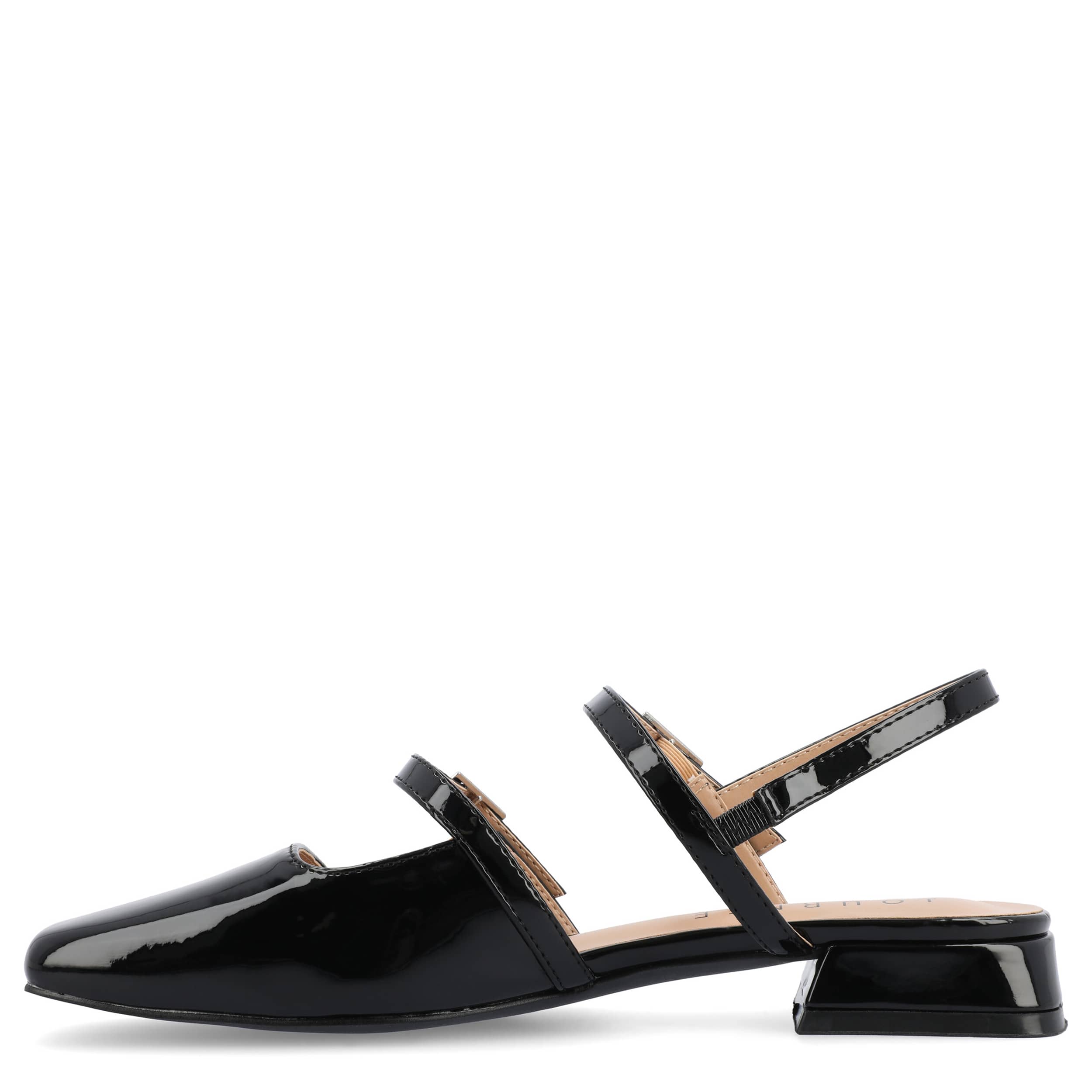 Seamless style and comfort with the Journee Collection Gretchenn pump. Featuring a glossy patent leather upper with an elastic slingback strap, this Mary Jane flat is fashionably different for work or the weekend. The insole offers all-day comfort, while the heel gives a subtle lift.