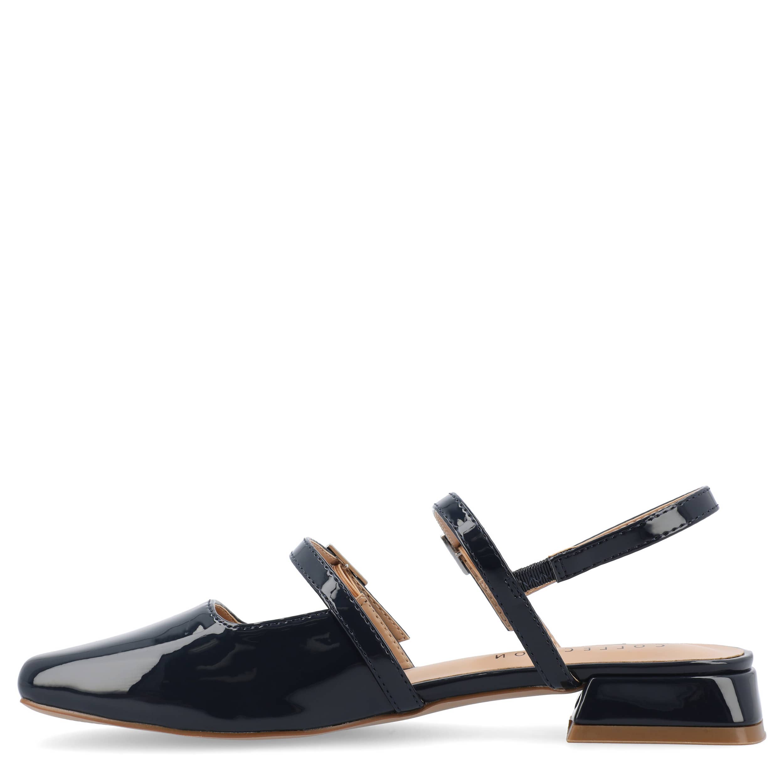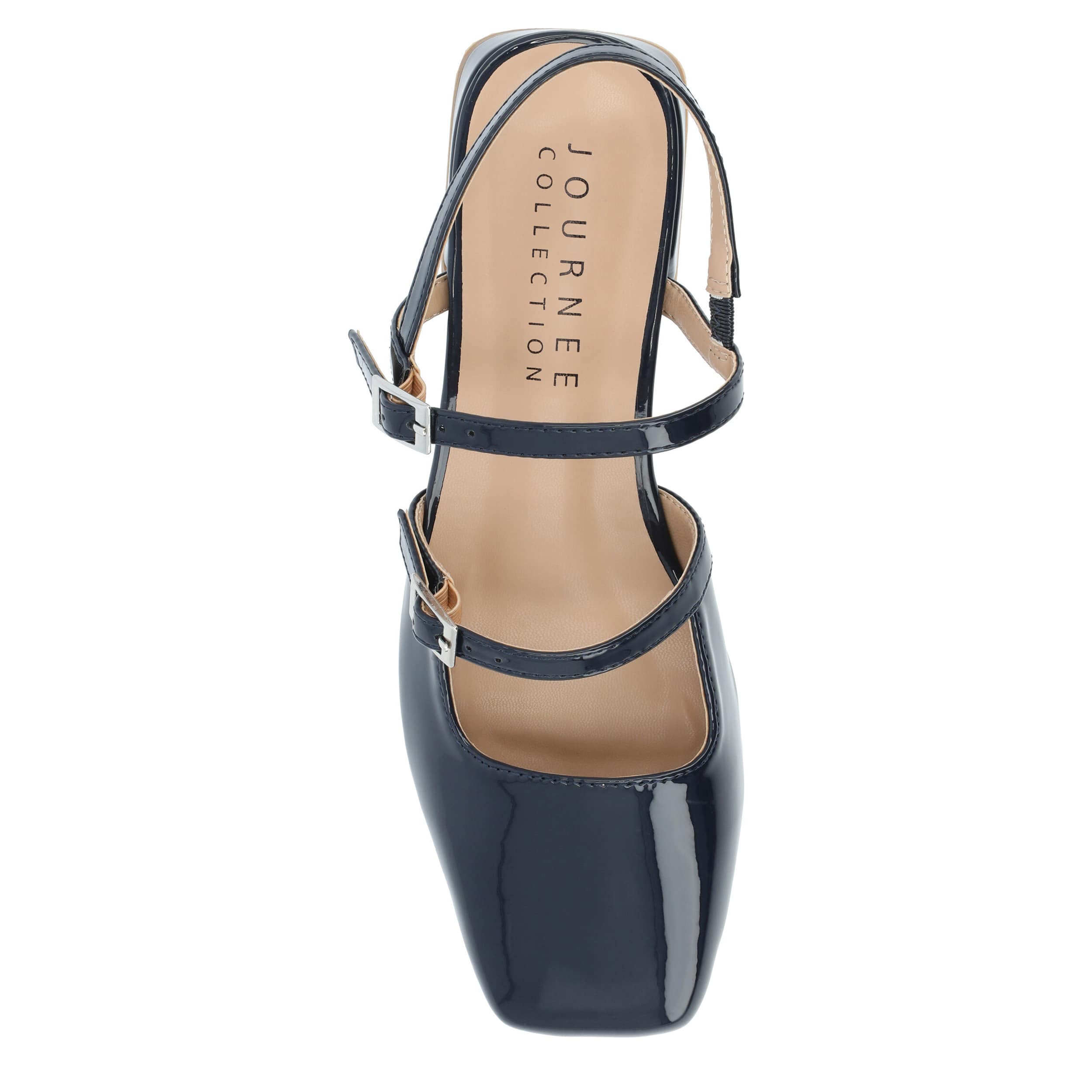 Seamless style and comfort with the Journee Collection Gretchenn pump. Featuring a glossy patent leather upper with an elastic slingback strap, this Mary Jane flat is fashionably different for work or the weekend. The insole offers all-day comfort, while the heel gives a subtle lift.