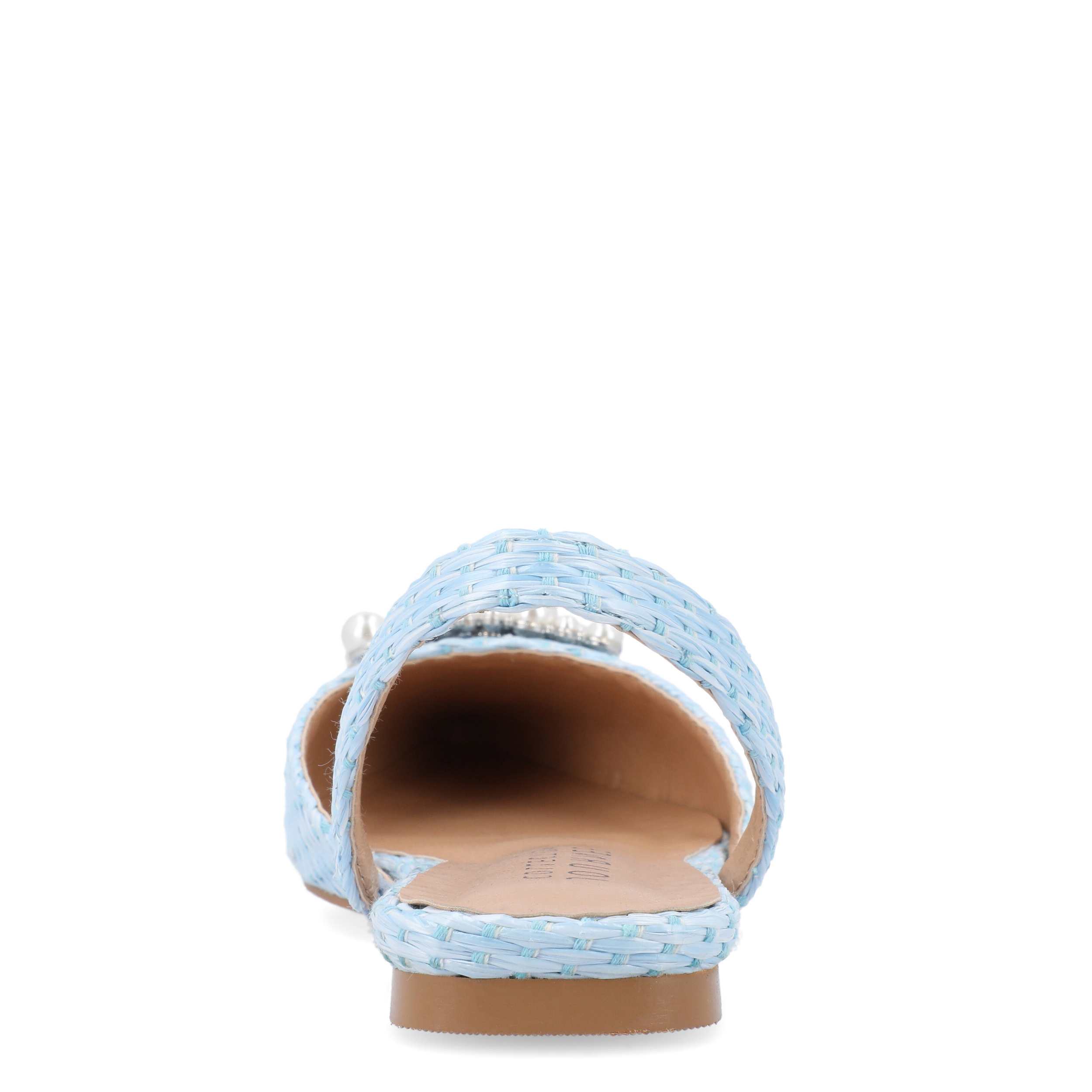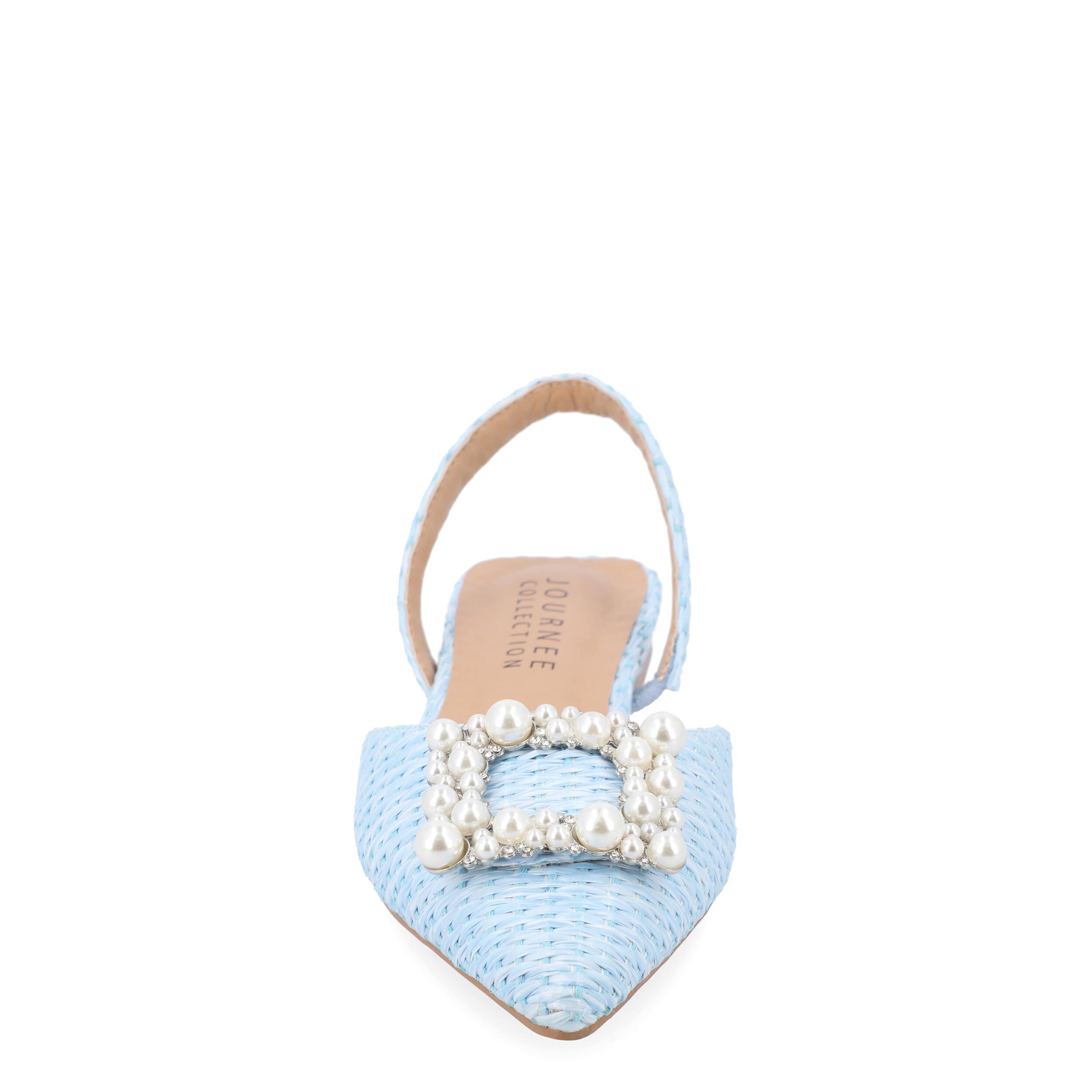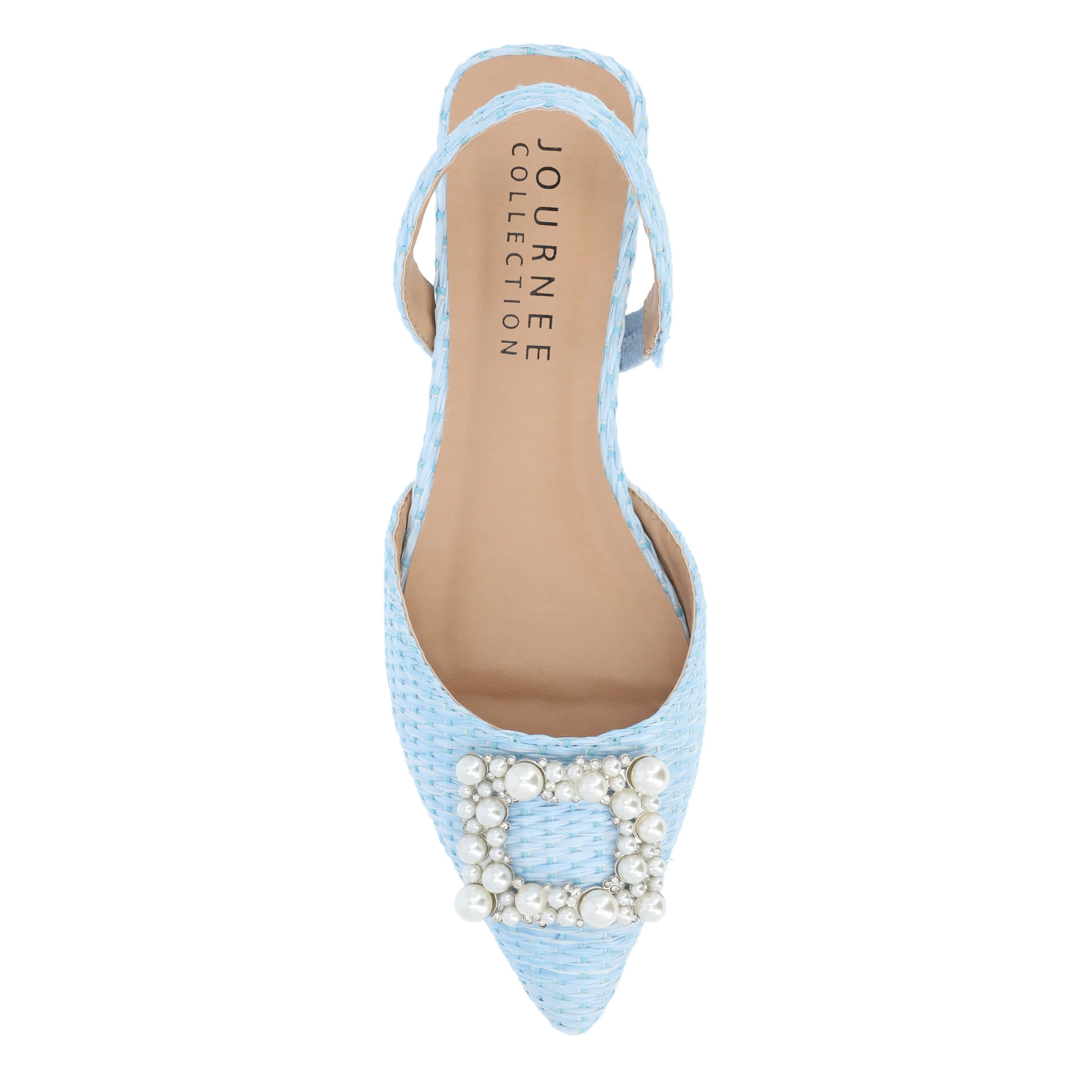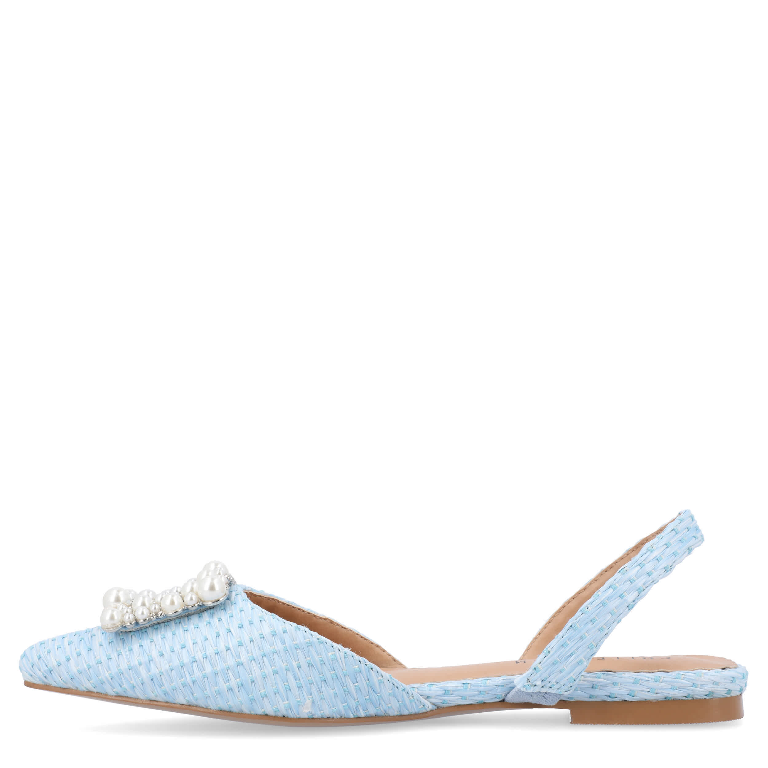 Grab your clutch and the Hannae Wide women's flat from Journee Collection. Featuring a raffia or faux suede upper with a sleek pointed toe, this pull-on shoe exudes sophistication with a large faux pearl brooch on the vamp. The footbed cushions, while the sole adds a durability.