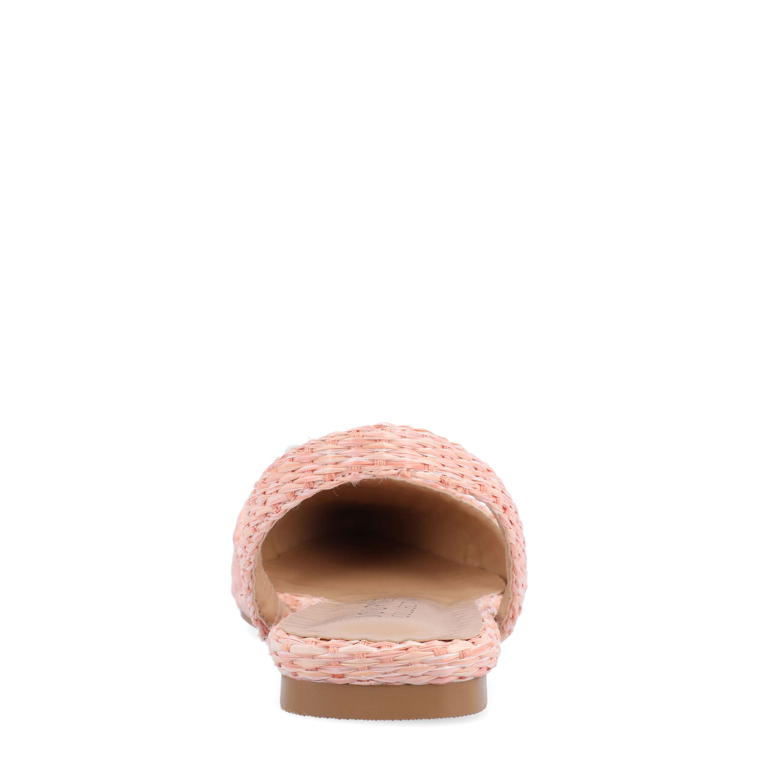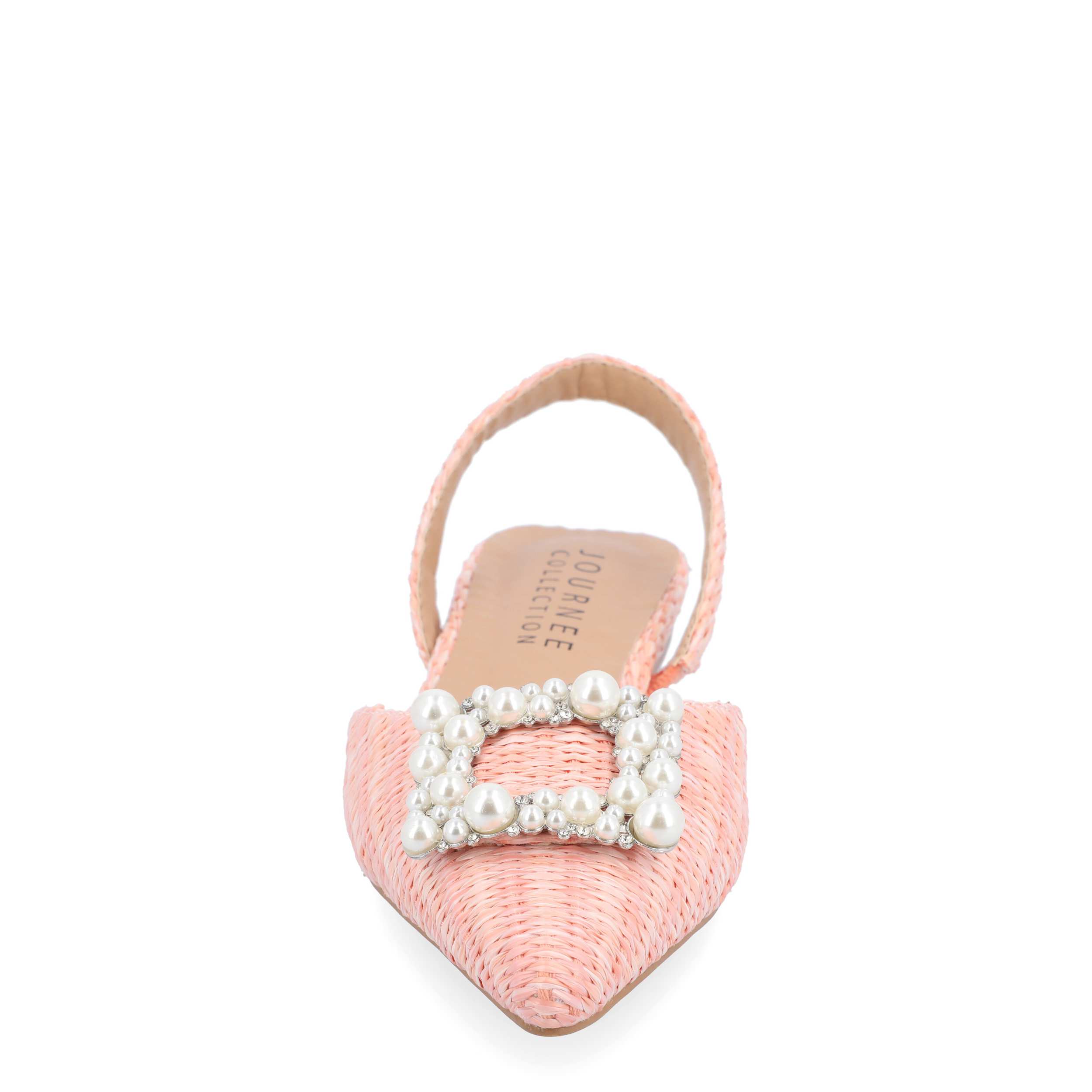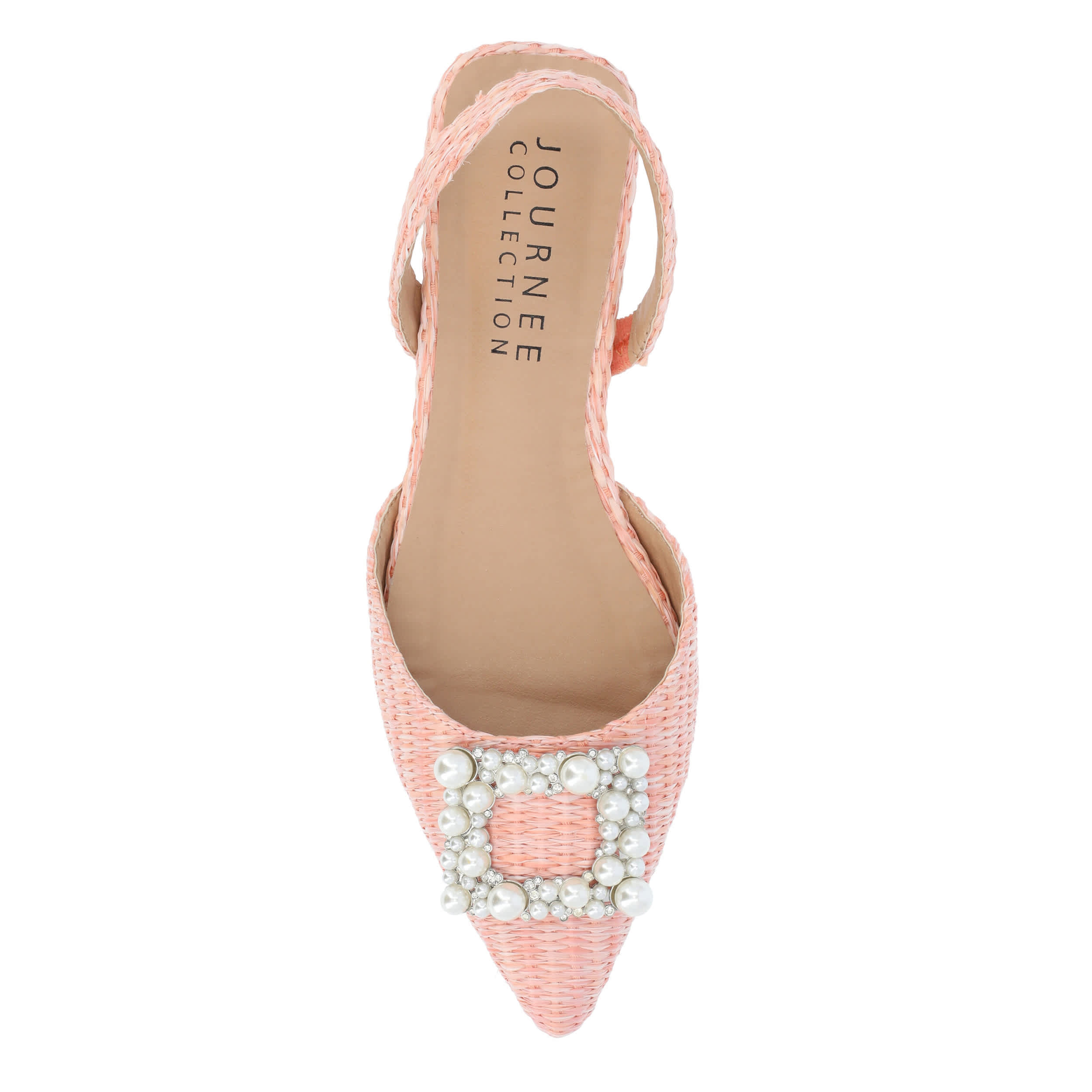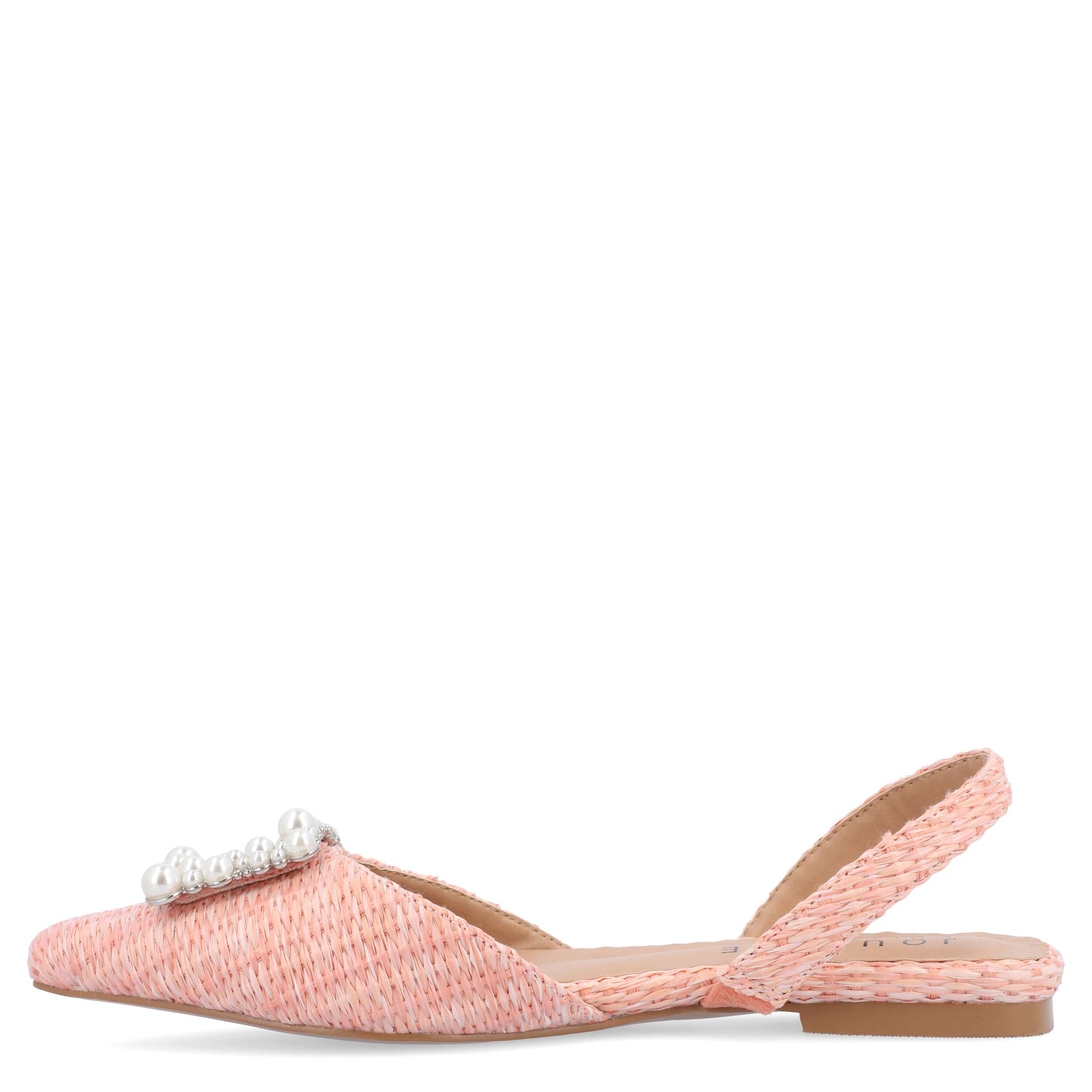 Grab your clutch and the Hannae Wide women's flat from Journee Collection. Featuring a raffia or faux suede upper with a sleek pointed toe, this pull-on shoe exudes sophistication with a large faux pearl brooch on the vamp. The footbed cushions, while the sole adds a durability.