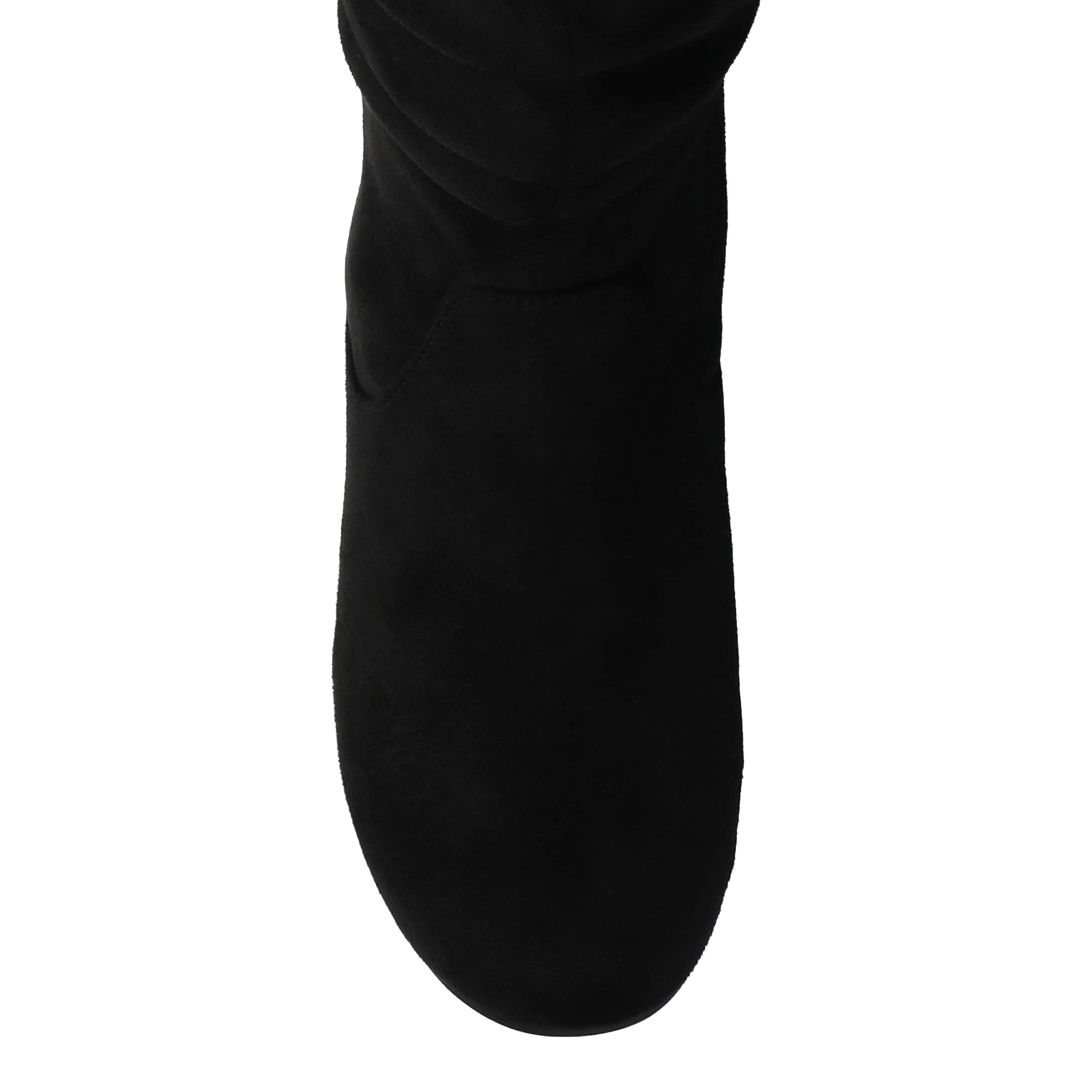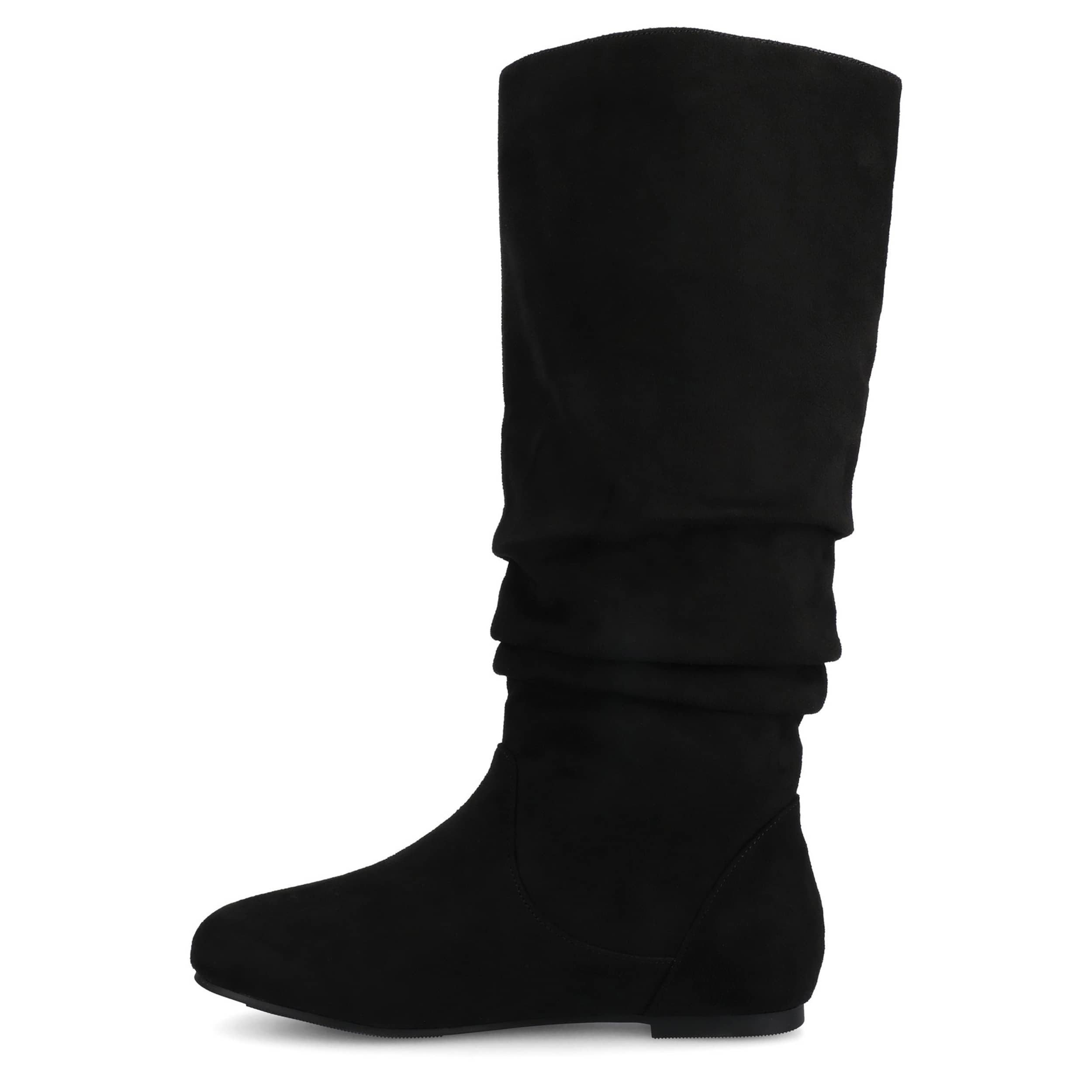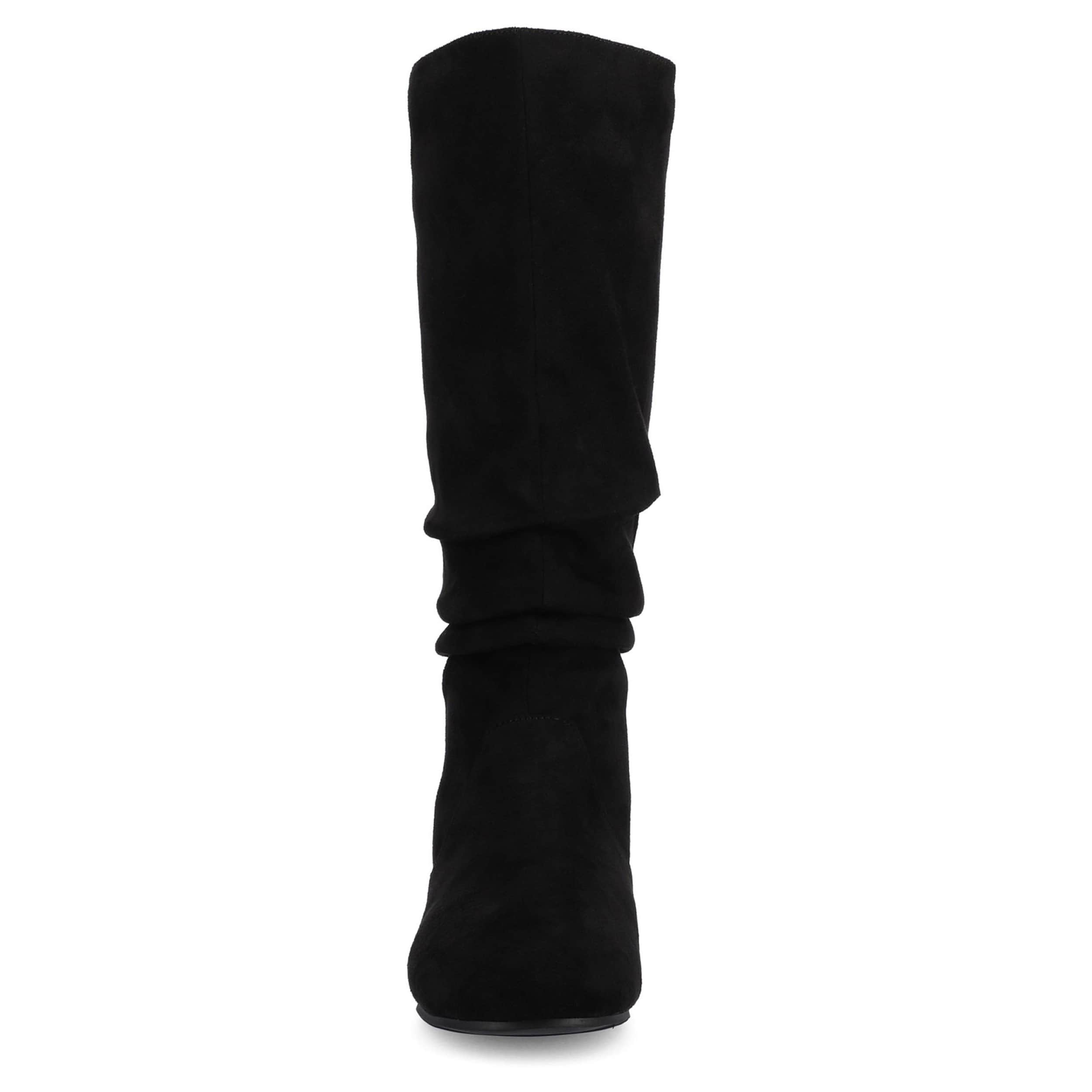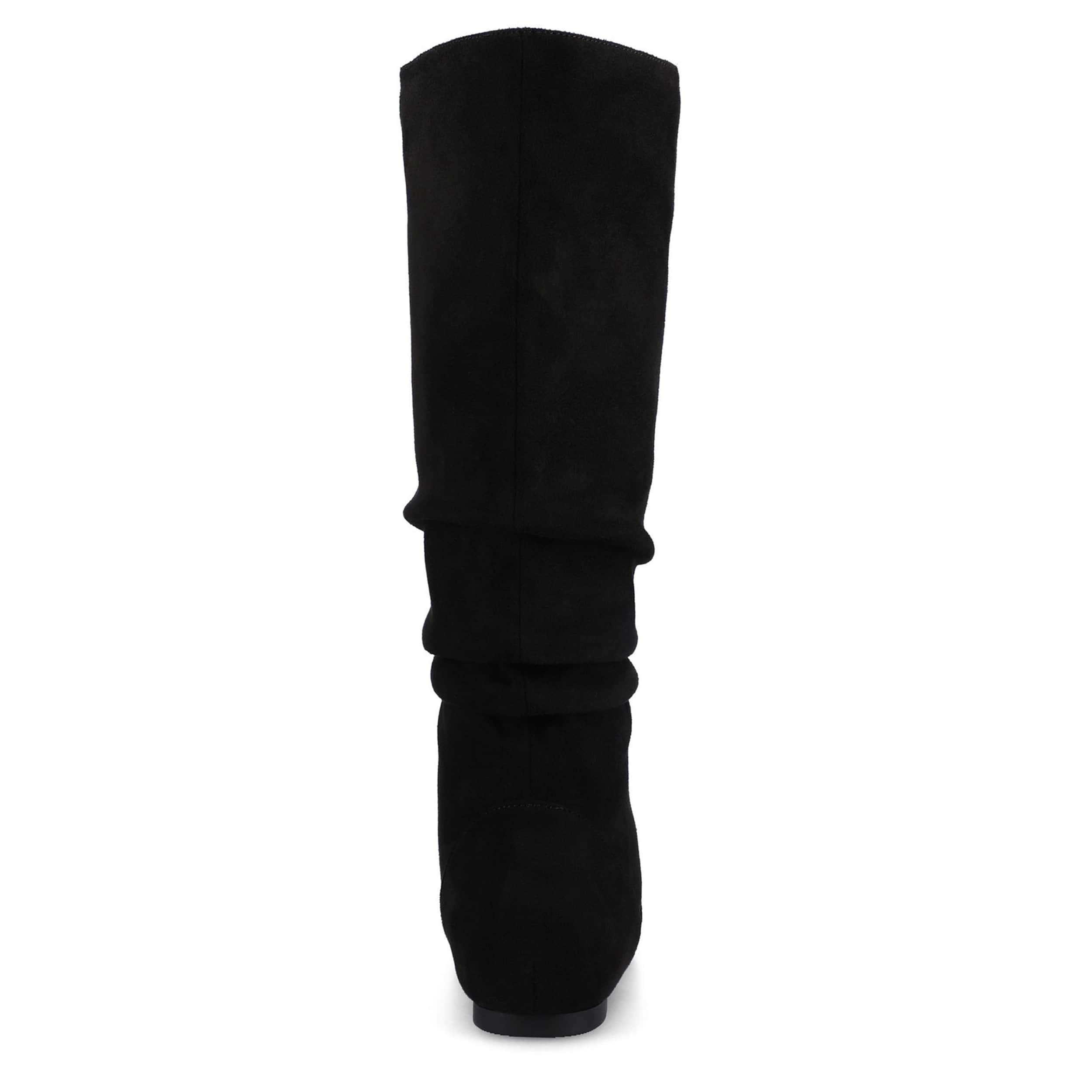 Fall calls for the Journee Collection Jayne tall boot. With a faux suede upper featuring slouchy detailing, this knee-high boot is a great add for the chill. The flat sole helps with easy movement alongside a cushy insole.