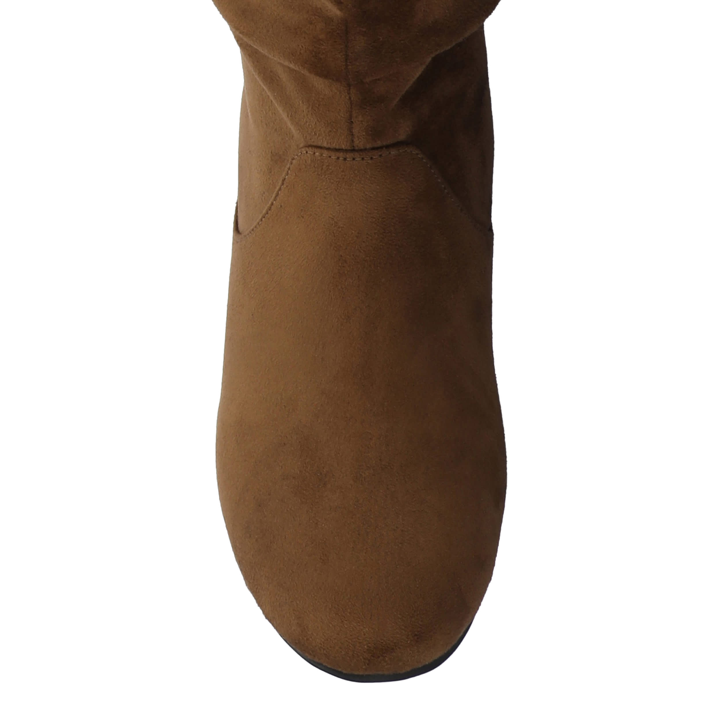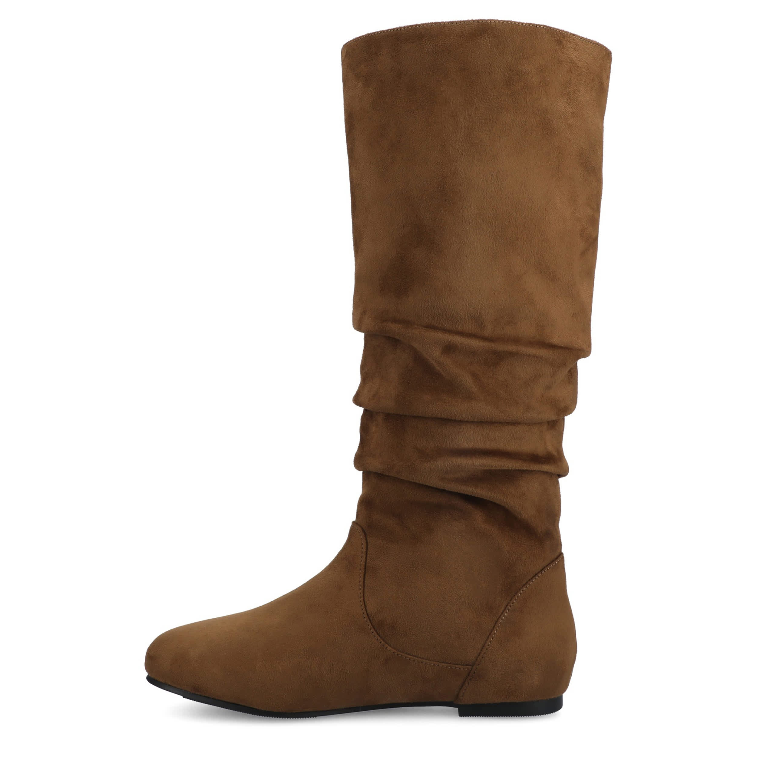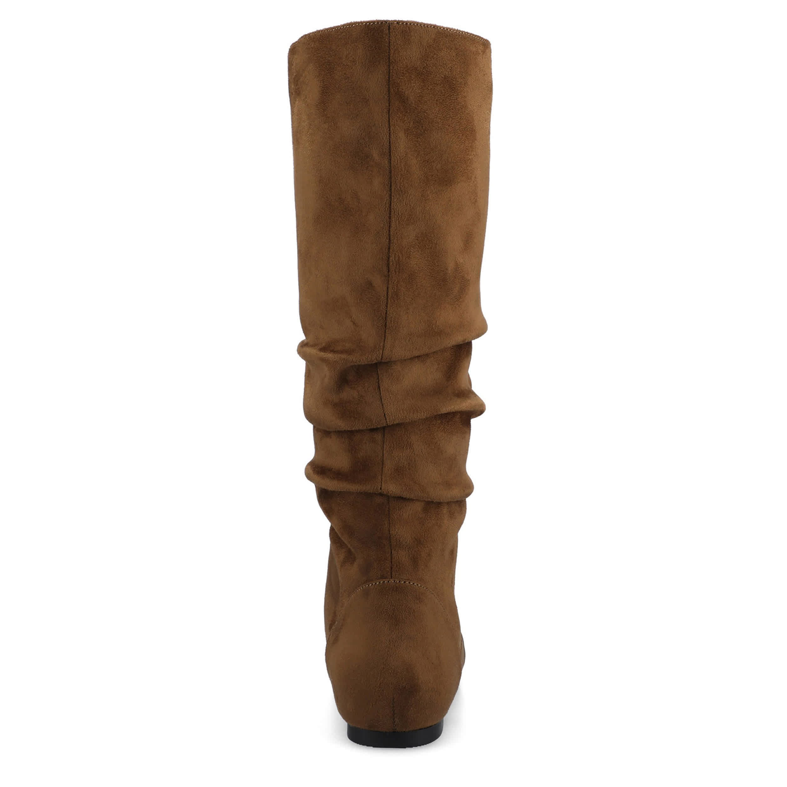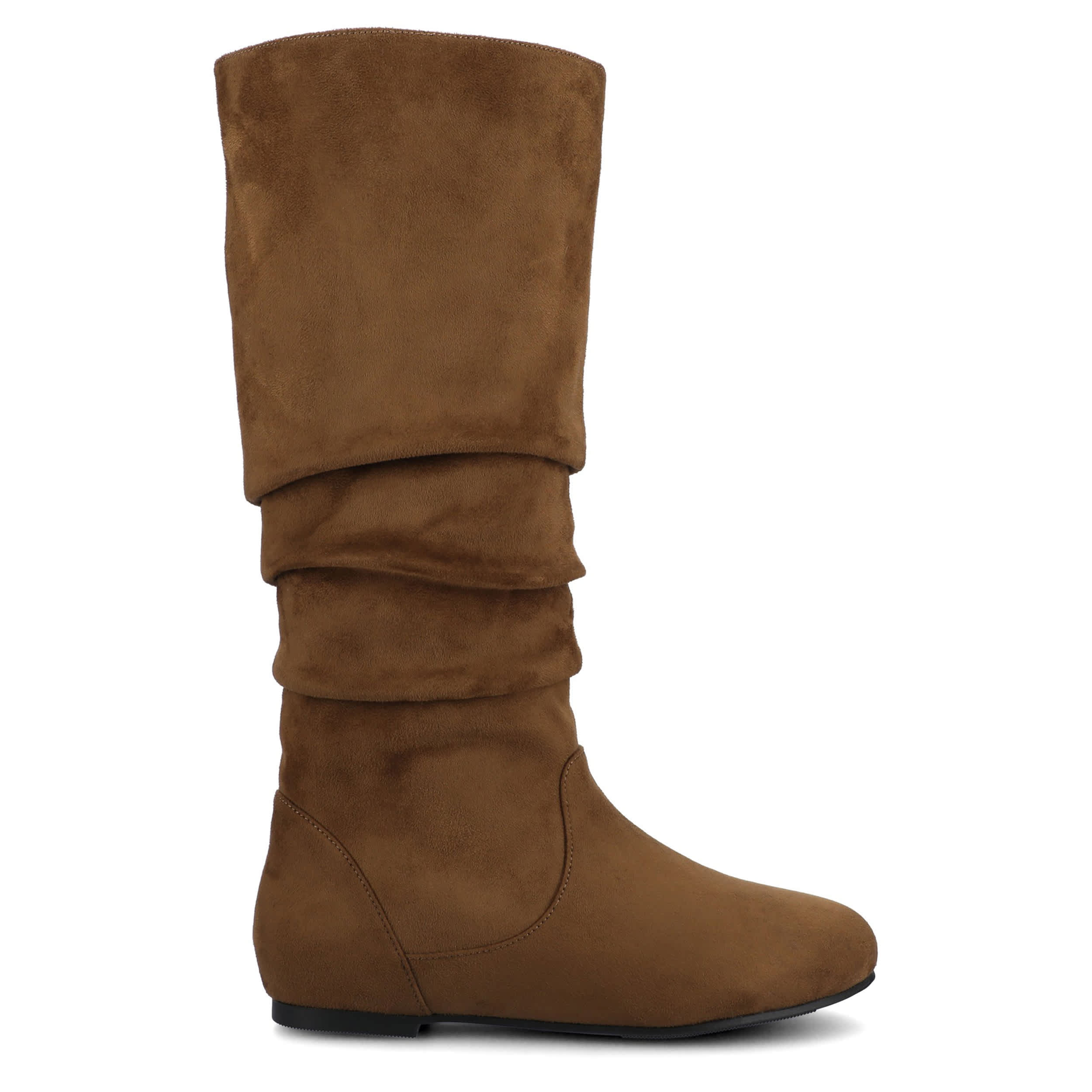 Fall calls for the Journee Collection Jayne tall boot. With a faux suede upper featuring slouchy detailing, this knee-high boot is a great add for the chill. The flat sole helps with easy movement alongside a cushy insole.