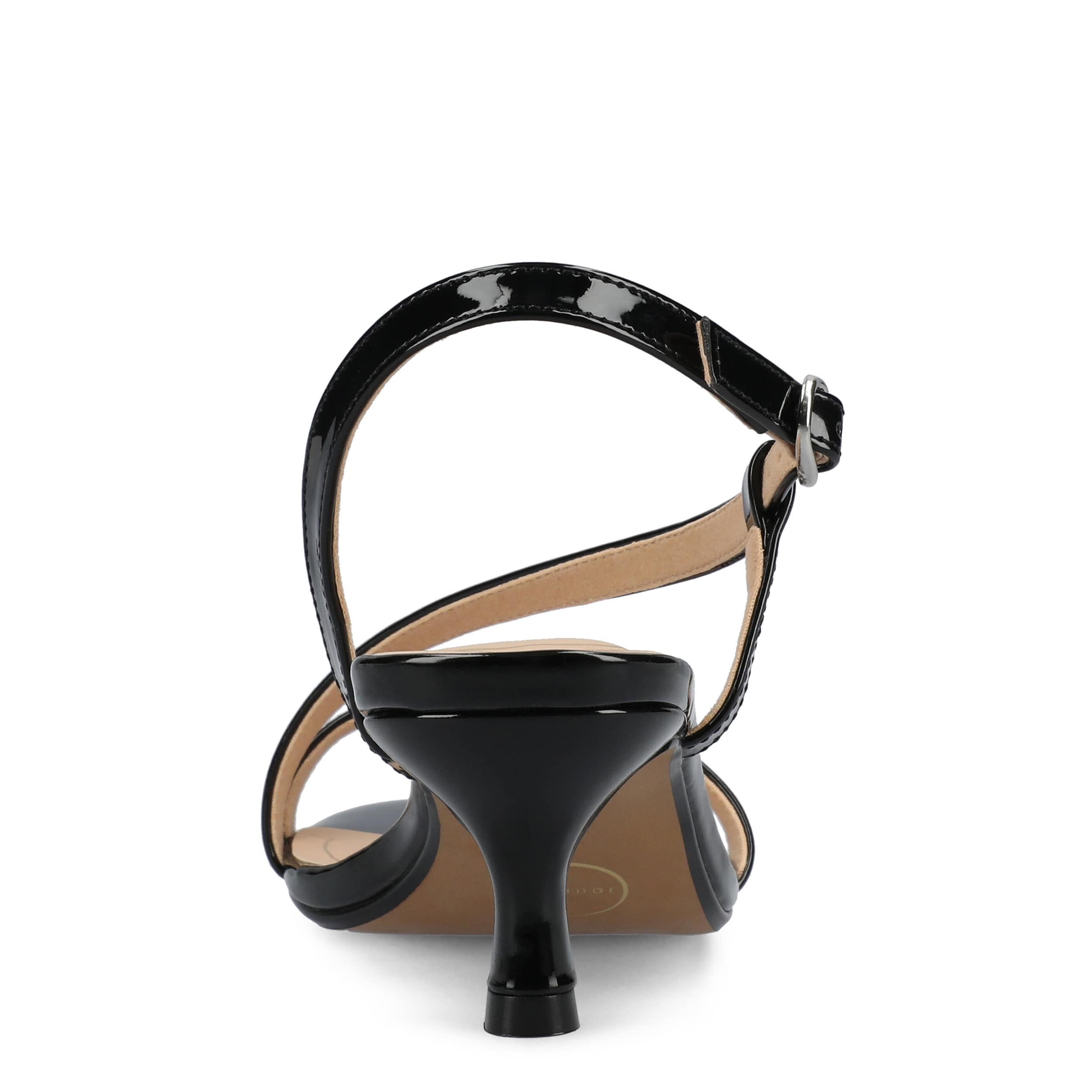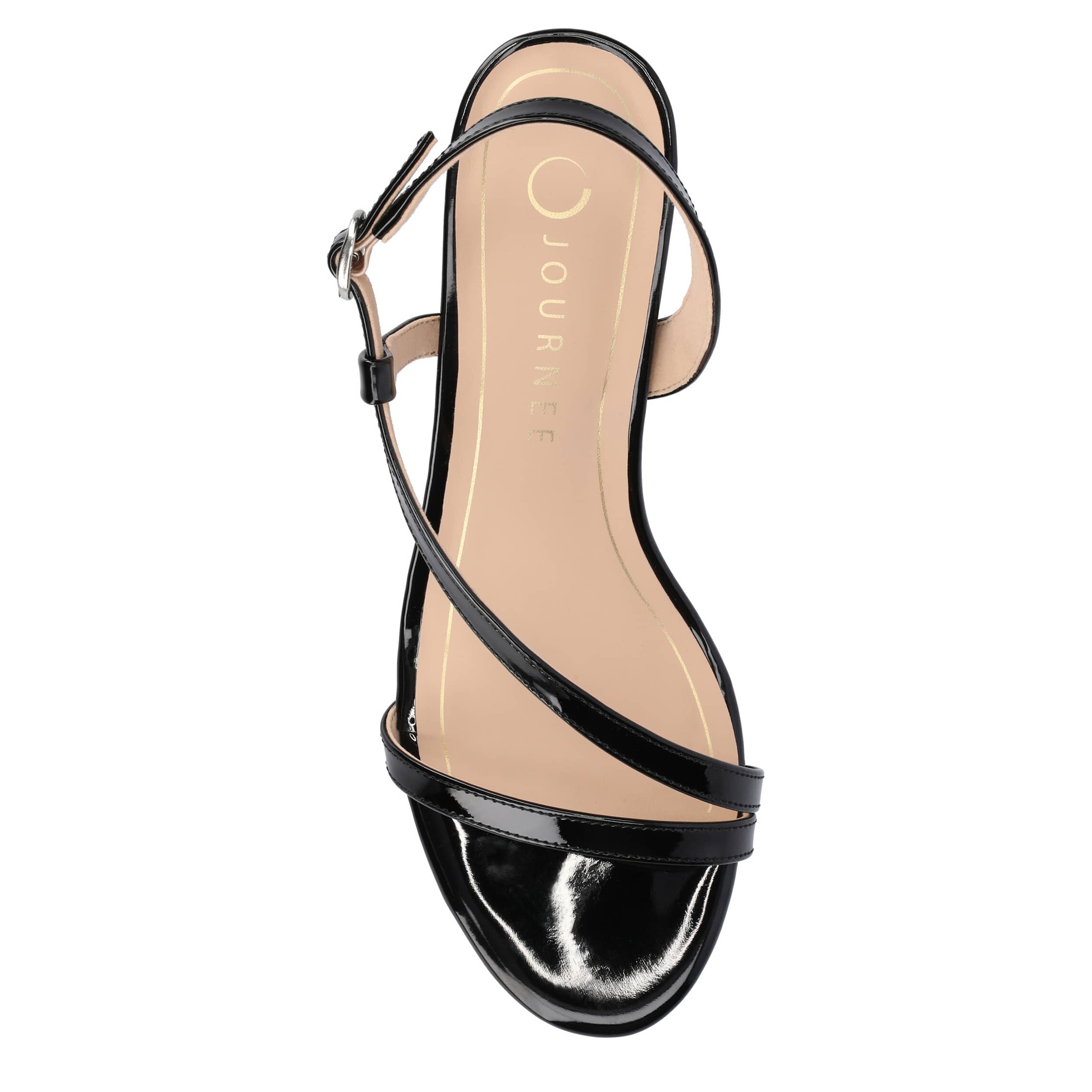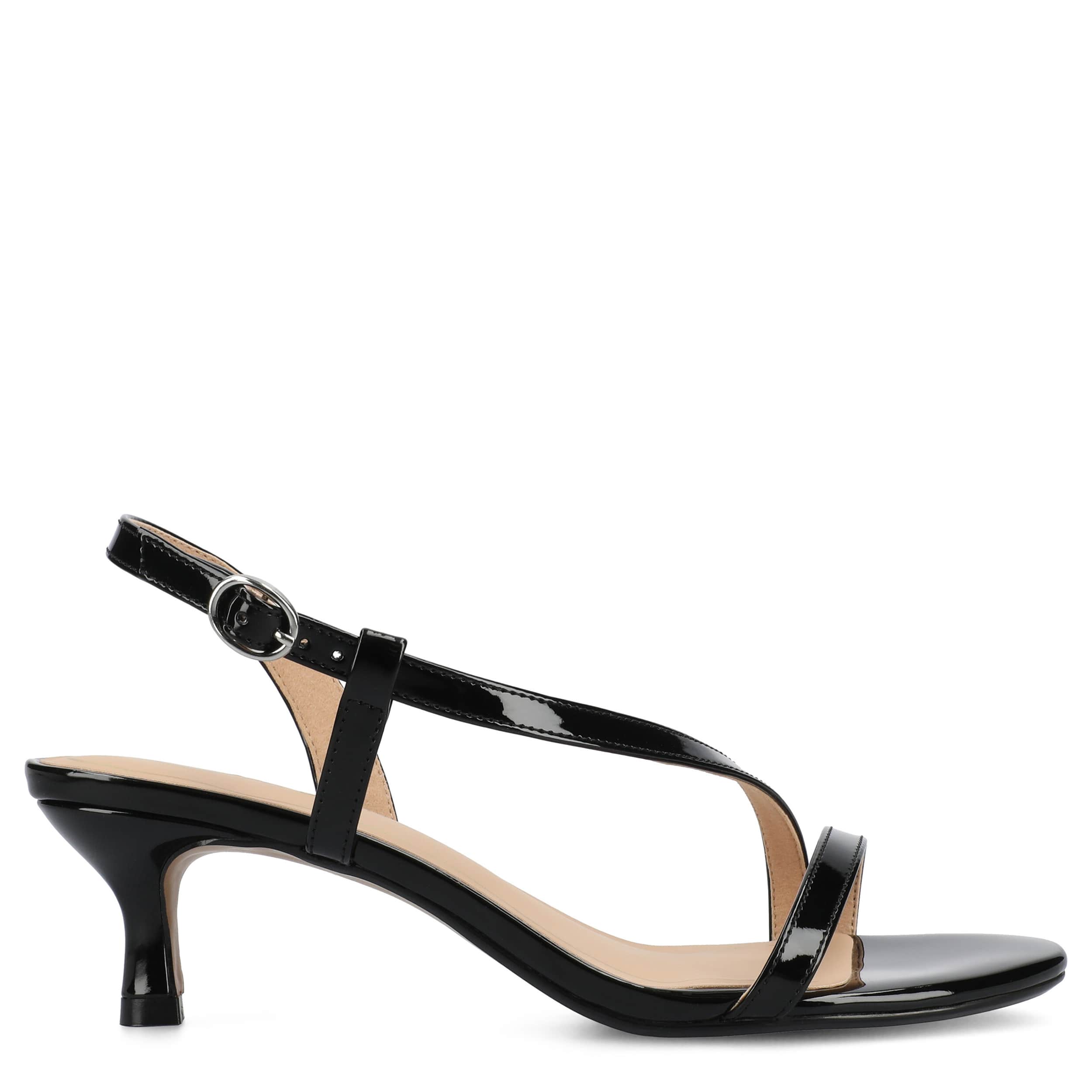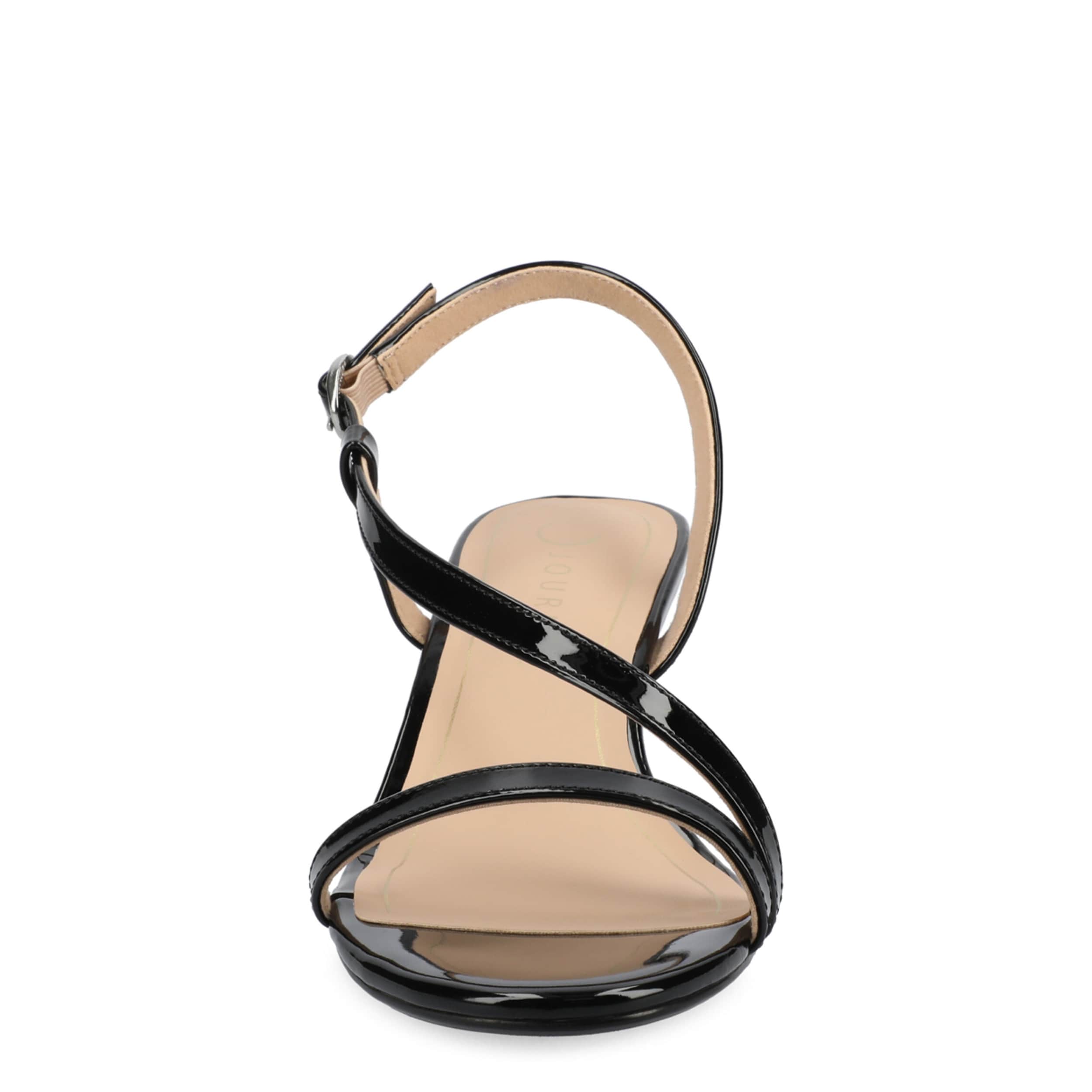 Dressy style comes easy with the Journee Collection Jemry sandal. Featuring a glossy patent leather upper, this sophisticated shoe has a sleek wraparound strap. The insole soothes your foot, while the low heel offers just a bit of lift.