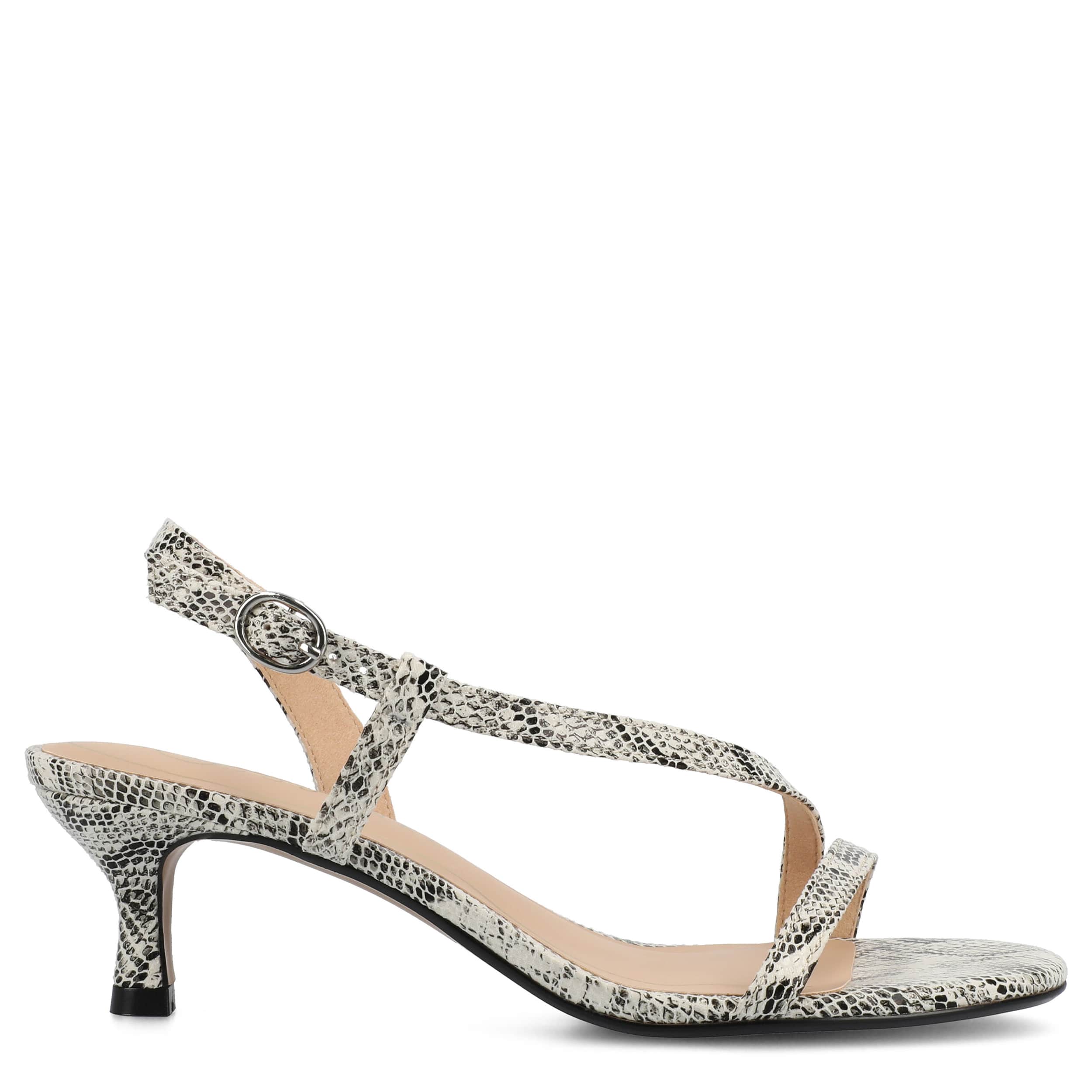 Dressy style comes easy with the Journee Collection Jemry sandal. Featuring a snakeskin printed faux leather upper, this sophisticated shoe has a sleek wraparound strap. The insole soothes your foot, while the low heel offers just a bit of lift.