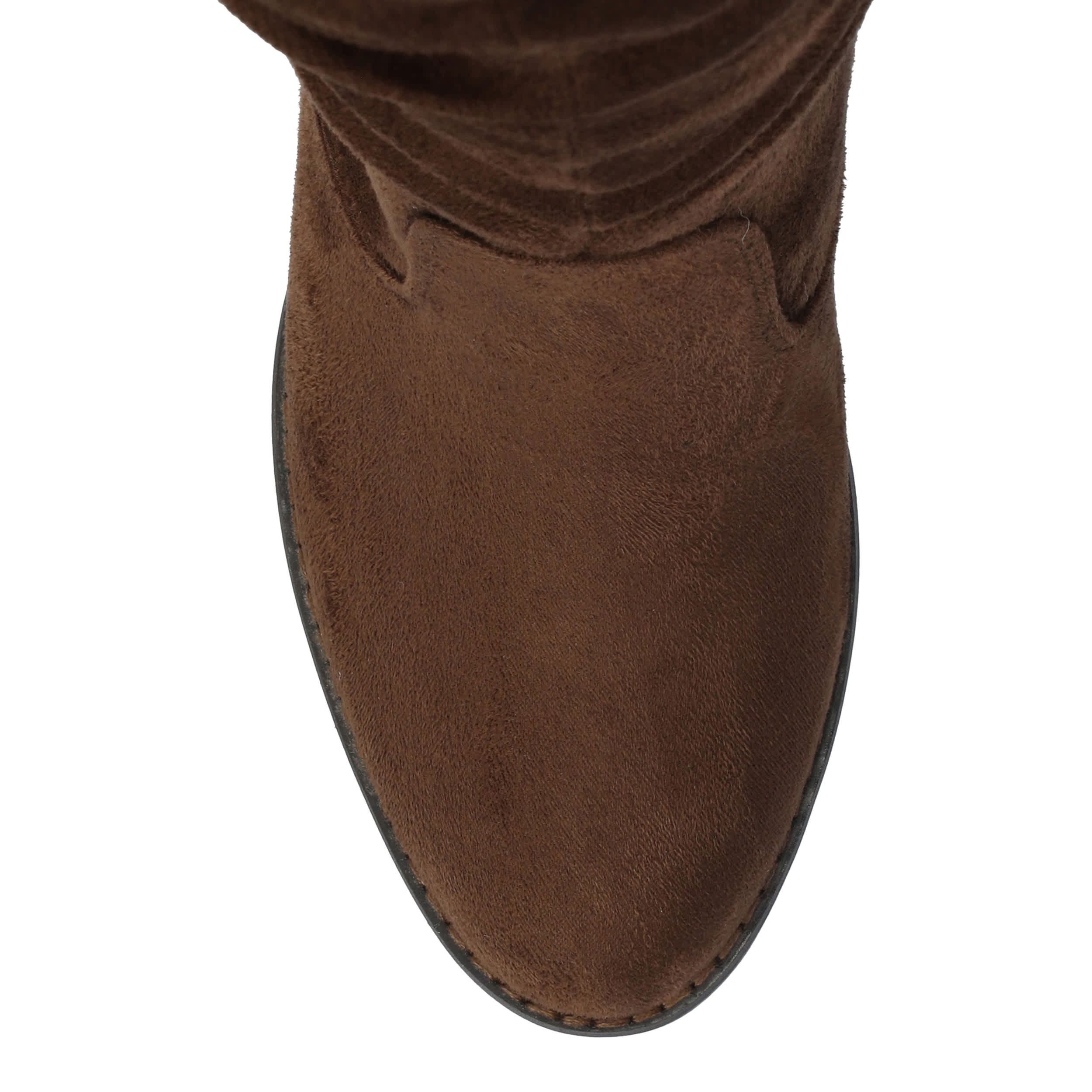 Smooth and indulgent, the Journee Collection Kaison Extra Wide Calf Over The Knee boot may become a guilty pleasure. With a faux suede upper featuring a 24" height that fits squarely thigh high, this slouchy boot is so comfortable. Walk that walk on the comfy insole and sturdy heel.