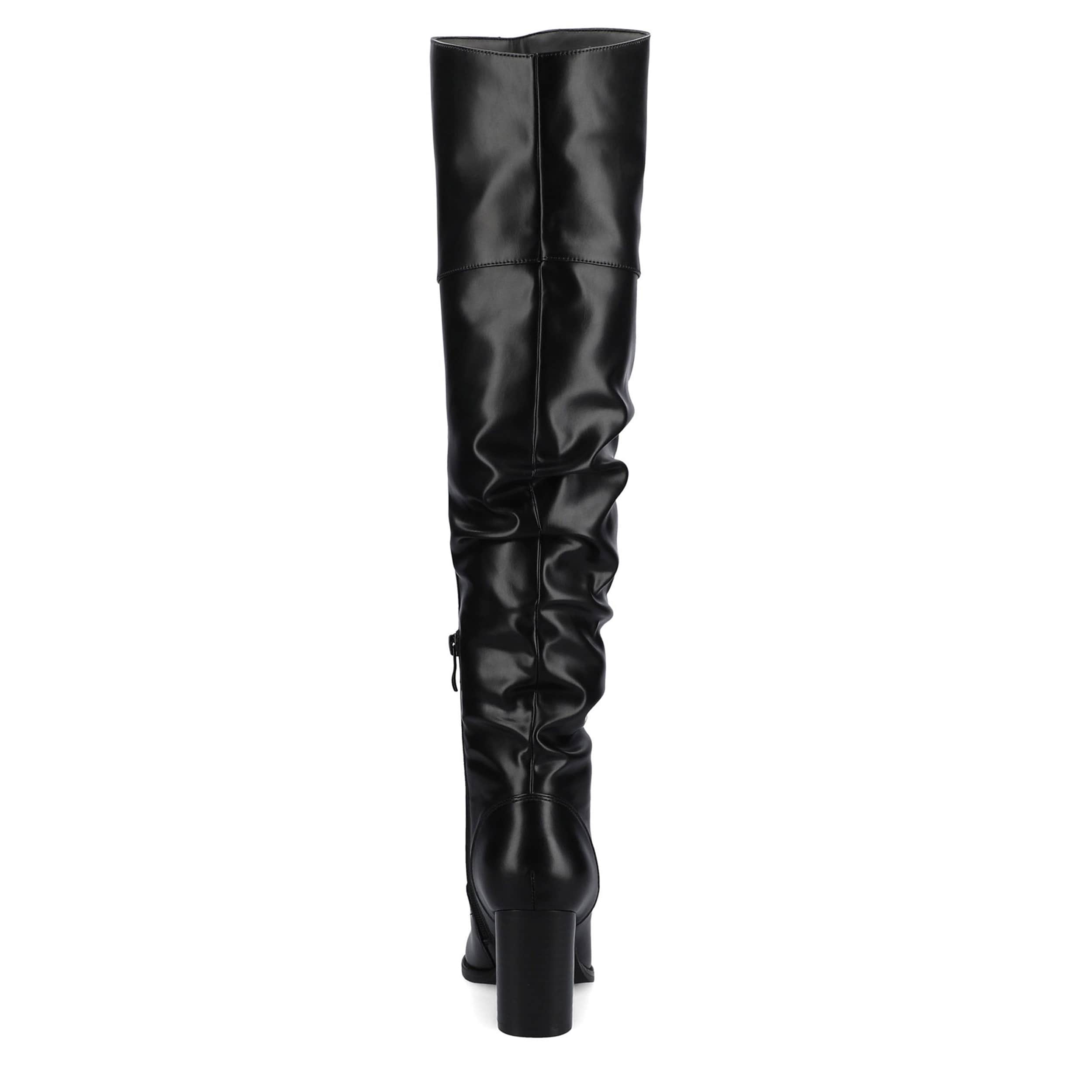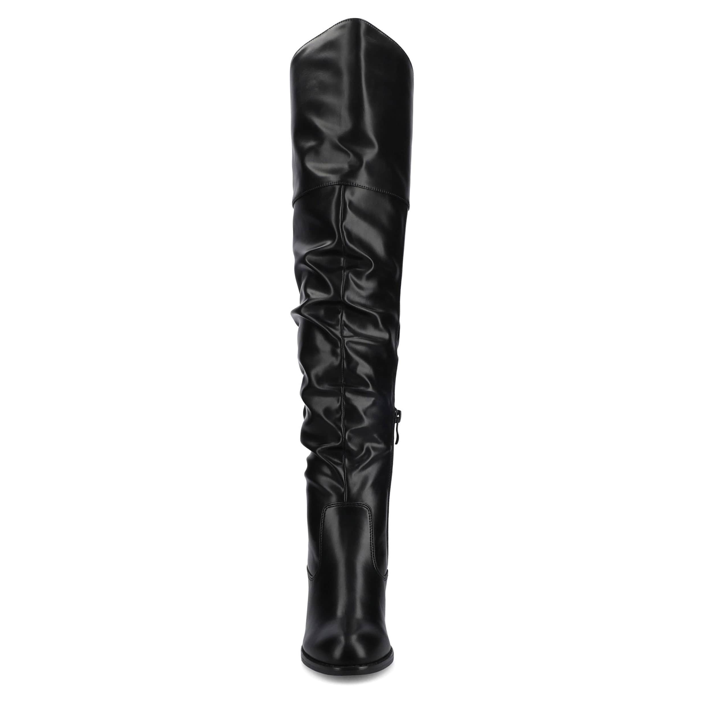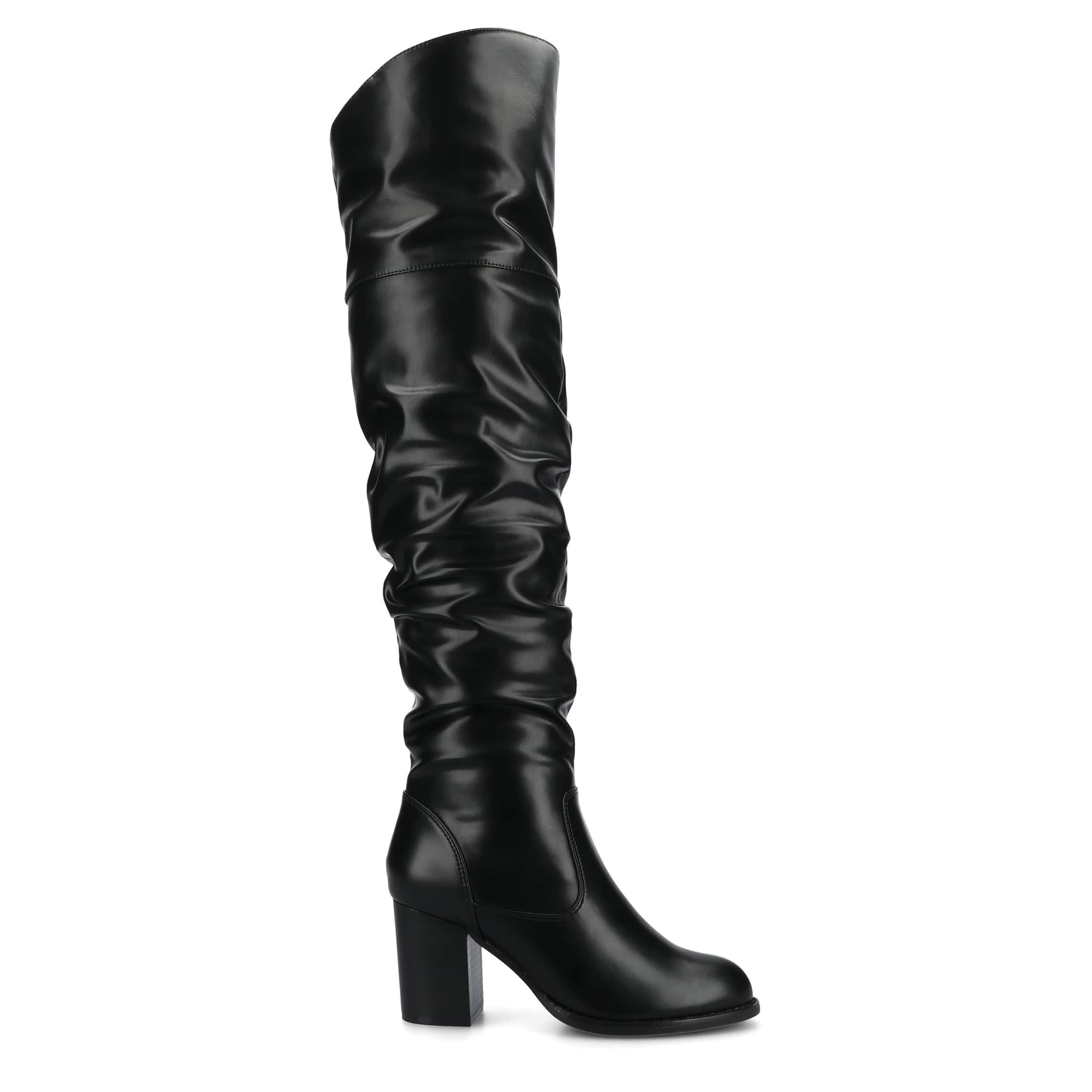 Smooth and indulgent, the Journee Collection Kaison Over The Knee boot may become a guilty pleasure. With a faux leather upper featuring a 24" height that fits squarely thigh high, this slouchy boot is so comfortable. Walk that walk on the comfy insole and sturdy heel.