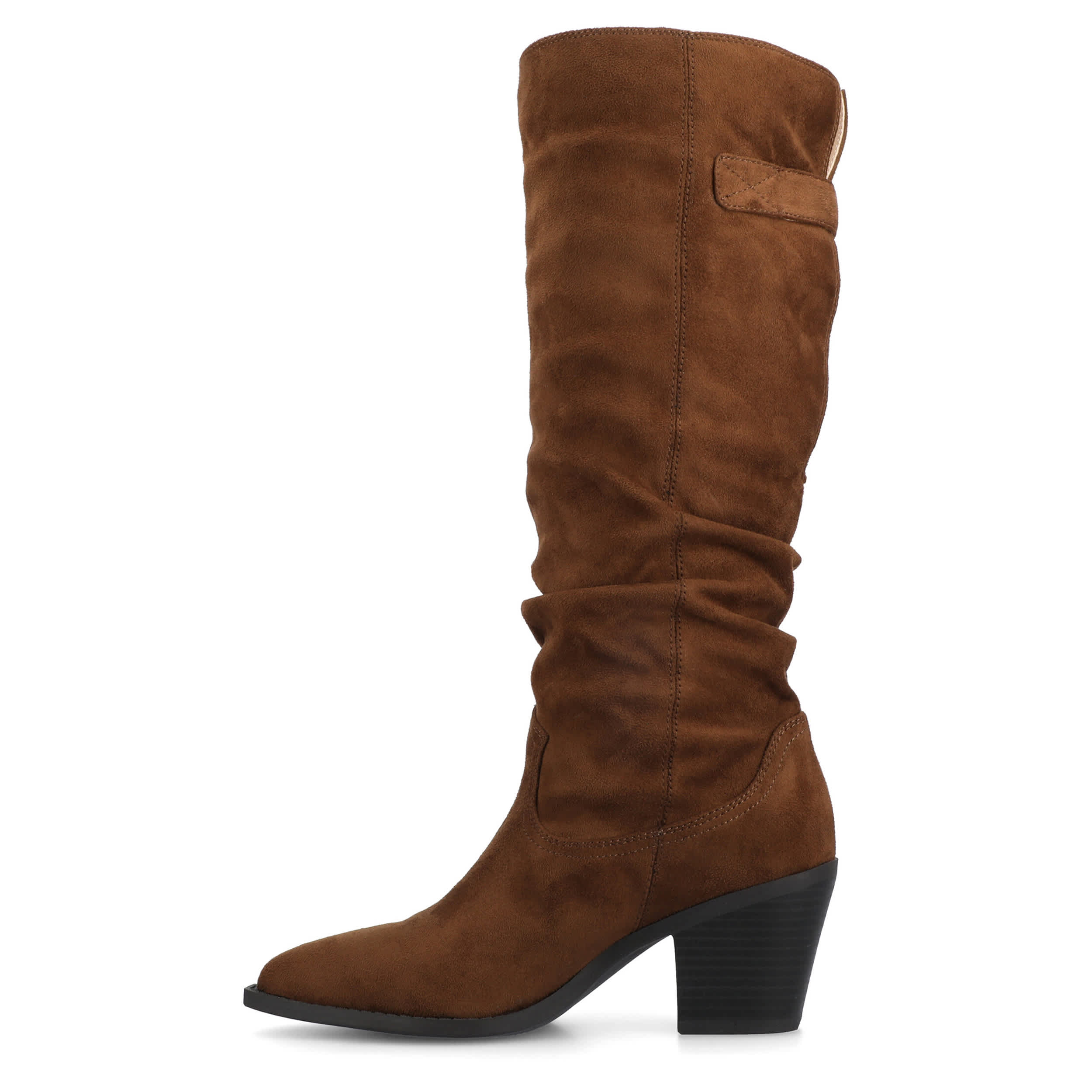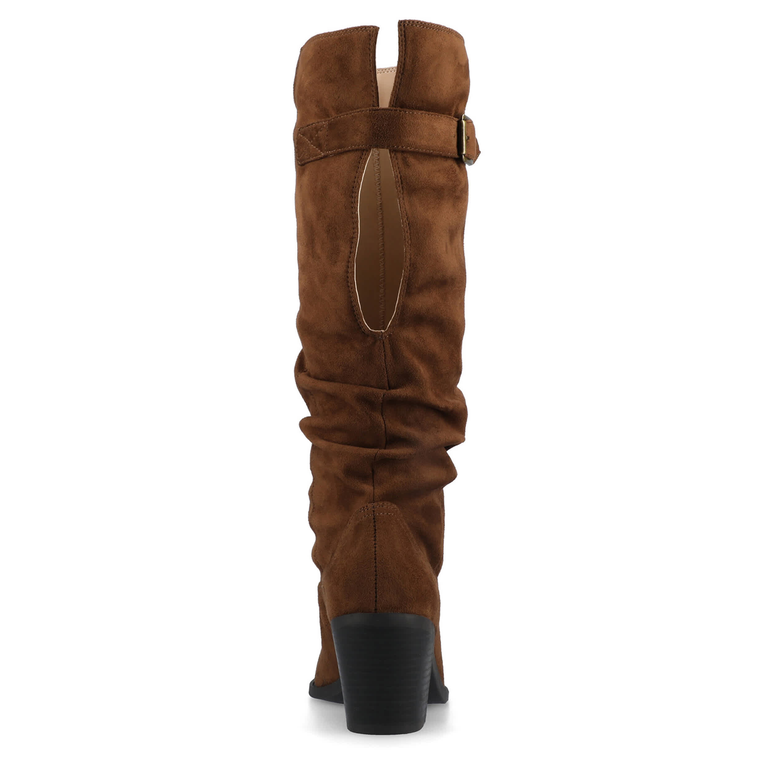 With its notched back and singl-band buckle strap, the Journee Collection Kaleah tall boot is kinda pirate chic. Featuring a faux leather upper that hits at 13 1/2" height, this slouchy, knee-high boot is fashionably relaxed. Walk that walk on the comfy insole and sturdy Cuban heel.
