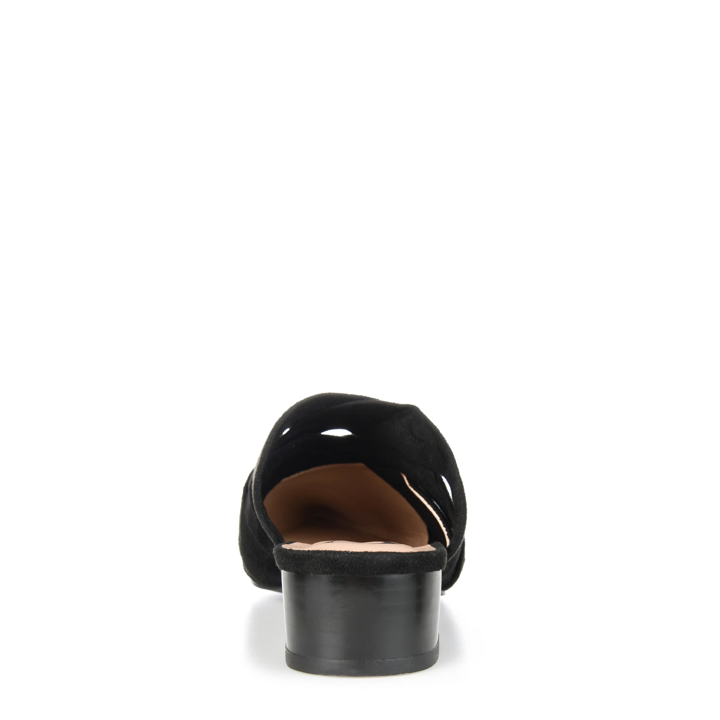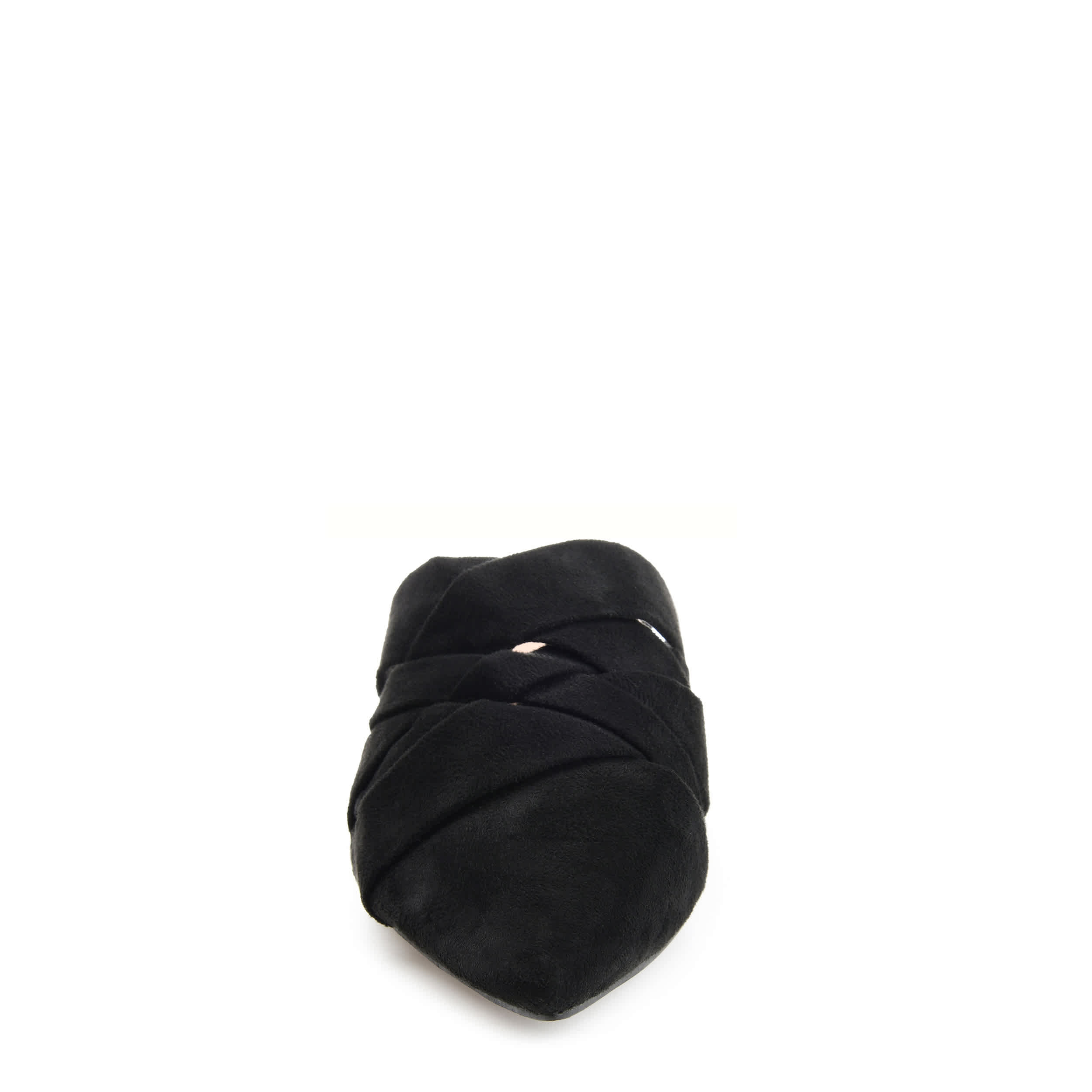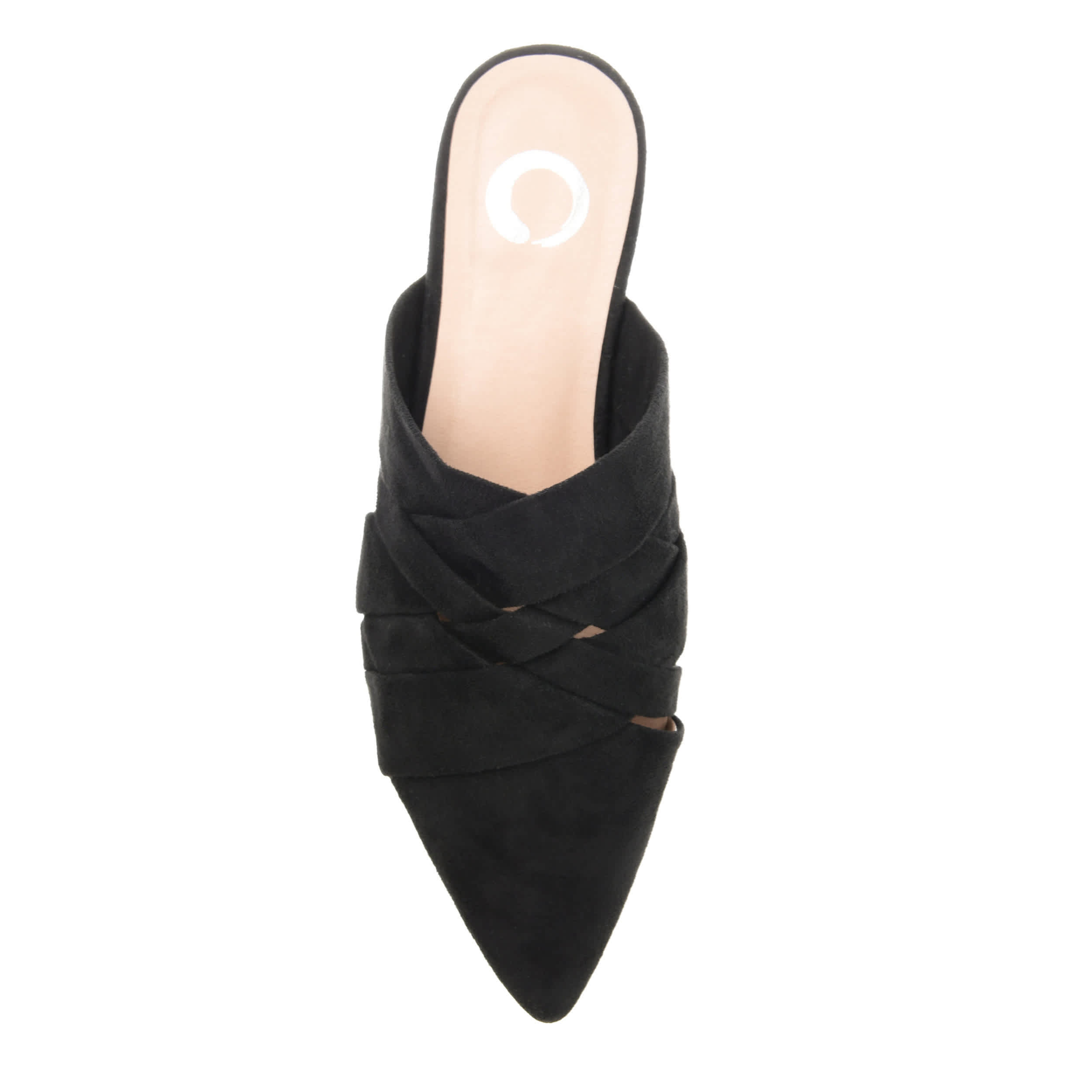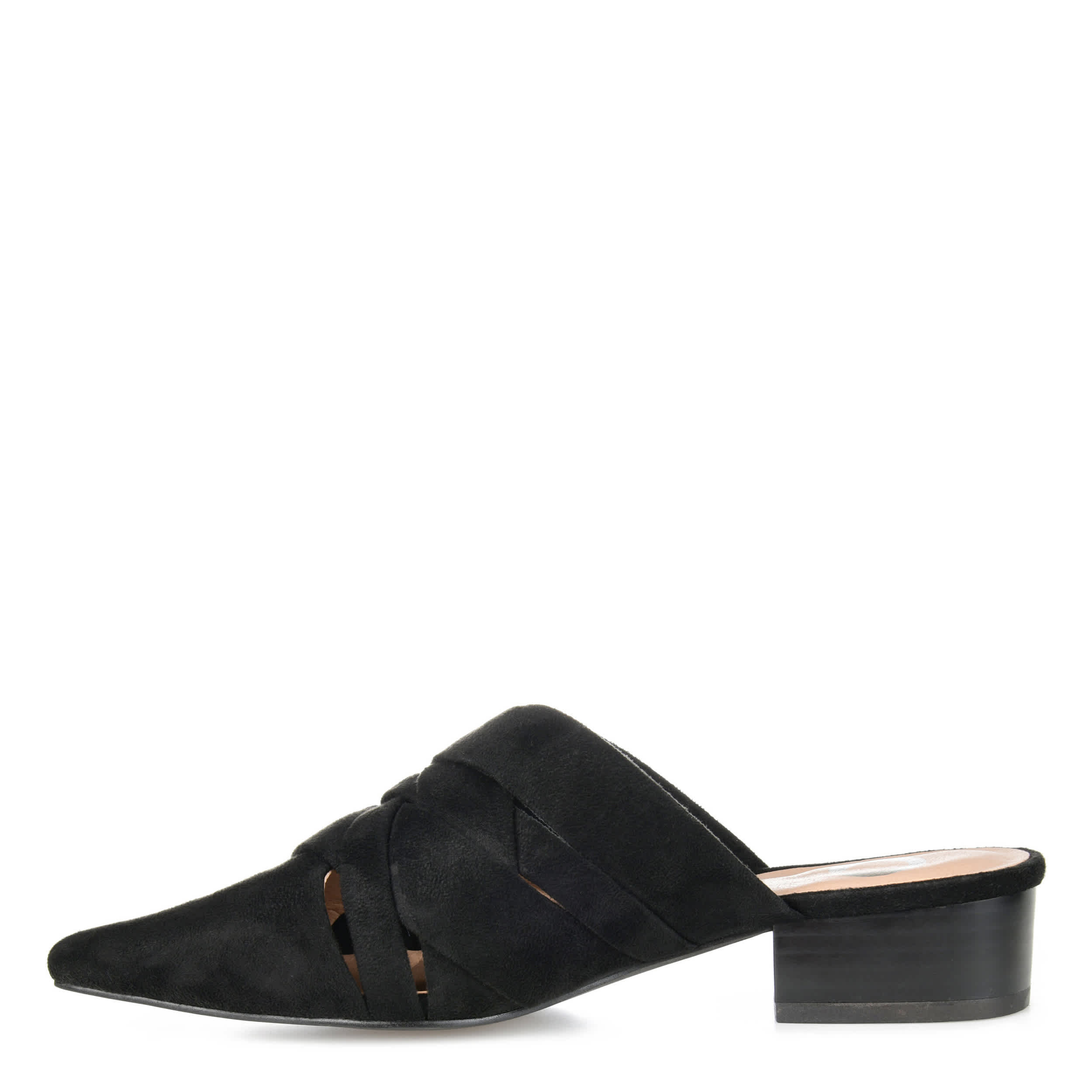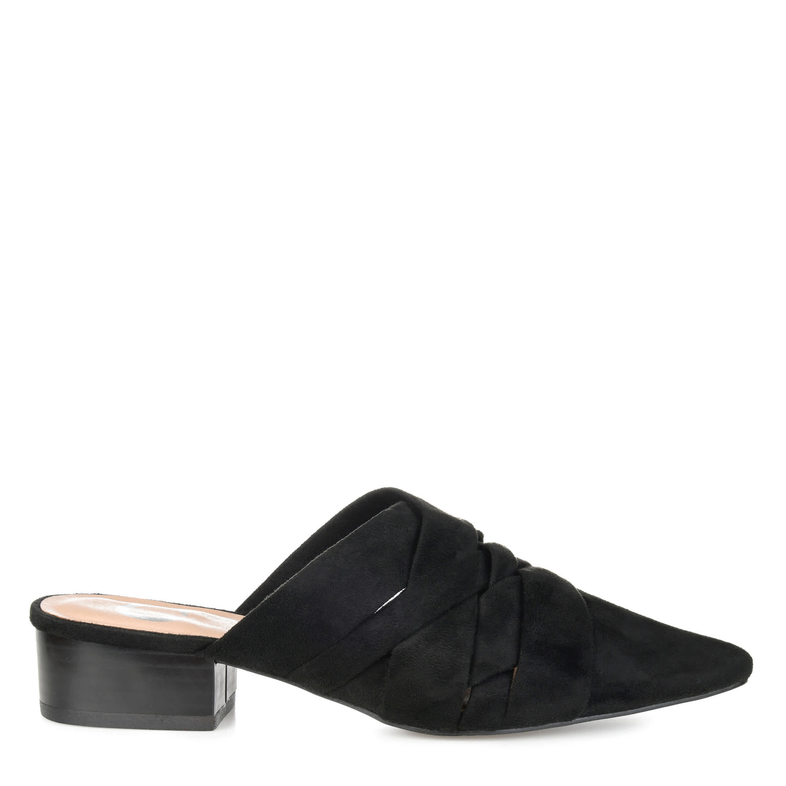 Any time you don't know what to wear is perfect for the Kalida women's mule from the Journee Collection. With a vegan suede upper featuring a pointed toe for a chic finish, this slip-on sandal has an interesting crisscross design that lends style points. The padded footbed cushions every step while the 1½" block heel provides subtle lift.