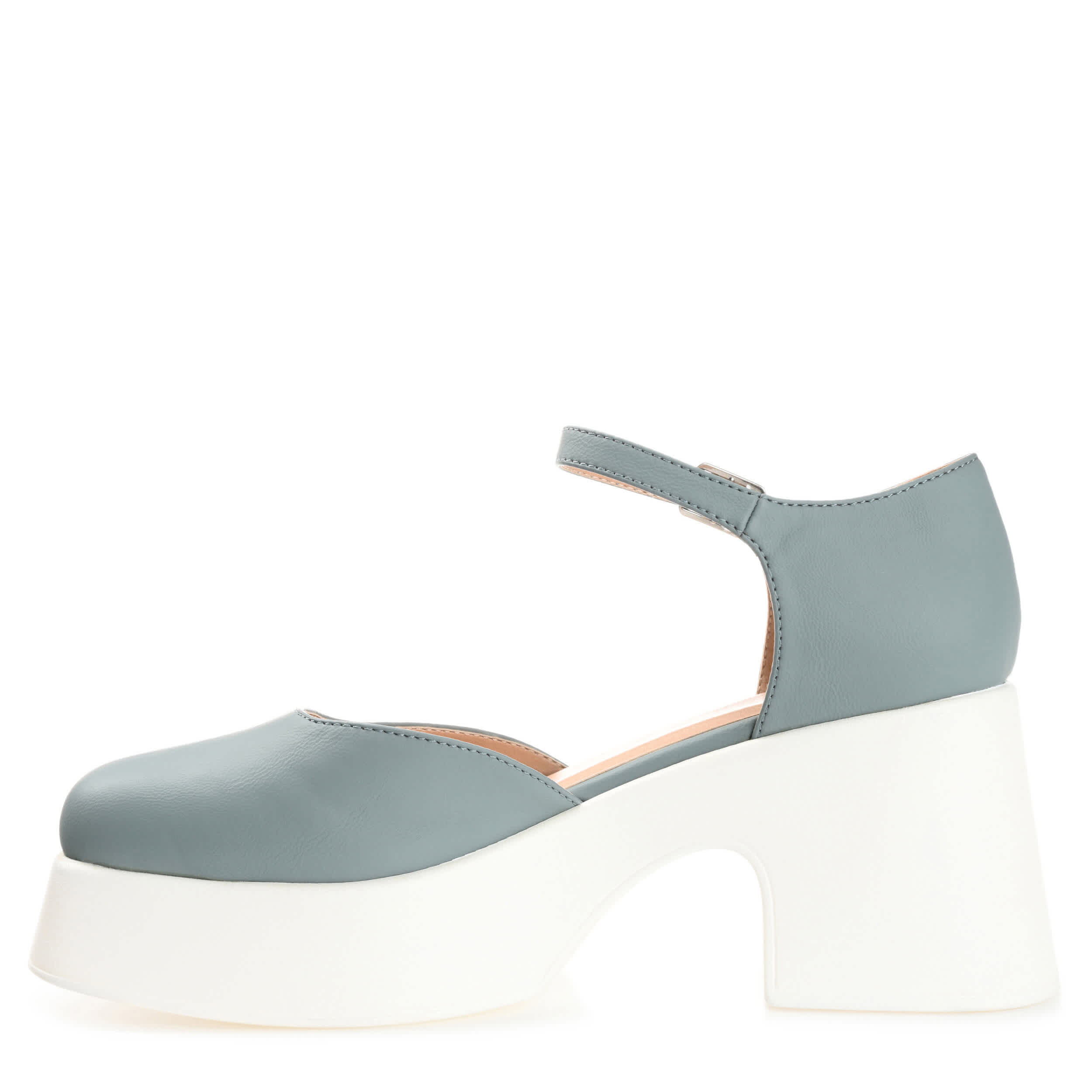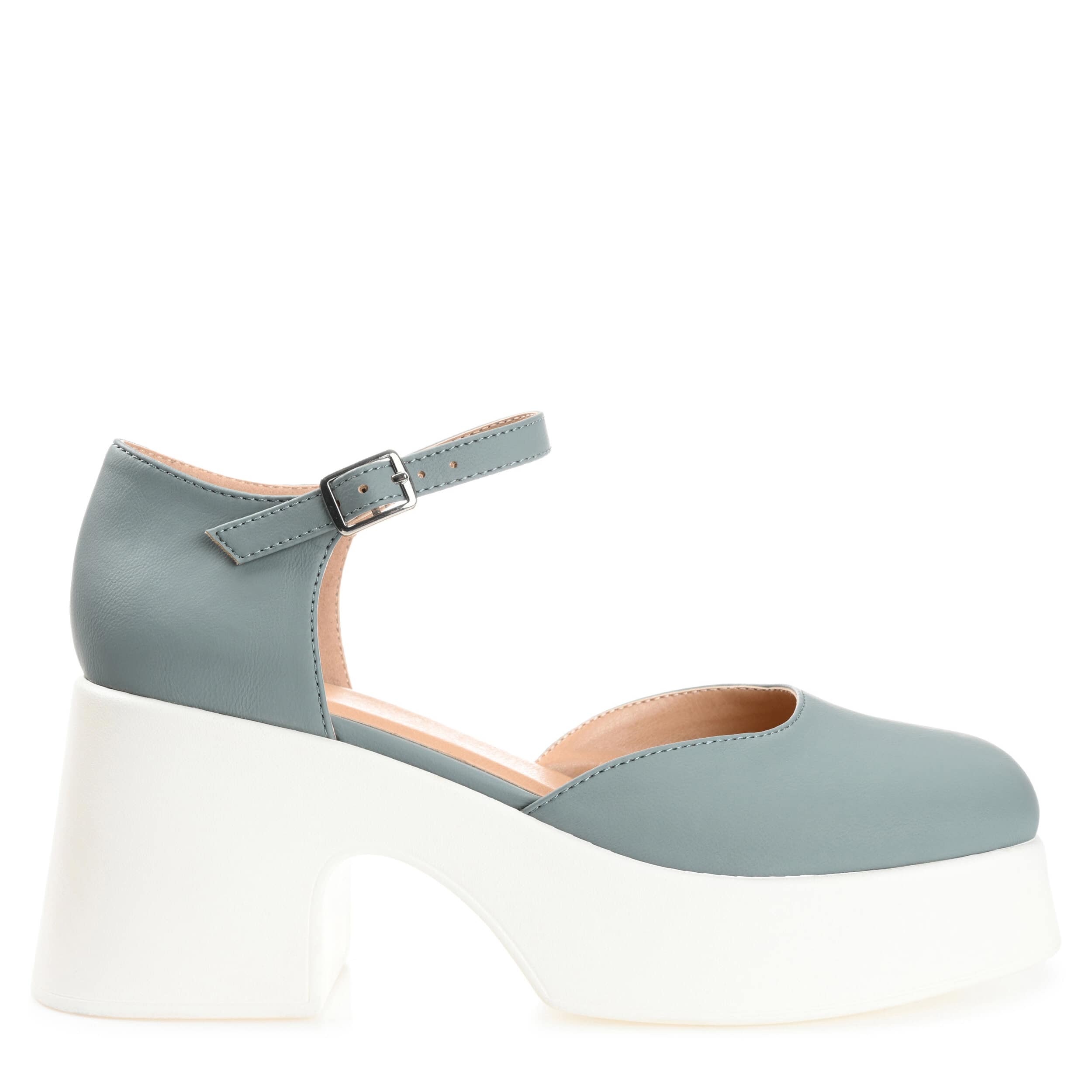 Make a statement in the Lizza women's pump from Journee Collection. With a luxe vegan leather upper featuring a thin ankle strap that adjusts for a perfect fit, this Mary Jane-style pump, with its flattering square toe and chunky block heel, looks great with casual cuffed jeans or a cute dress. A padded footbed cushions your feet, while the synthetic outsole provides an outstanding grip.