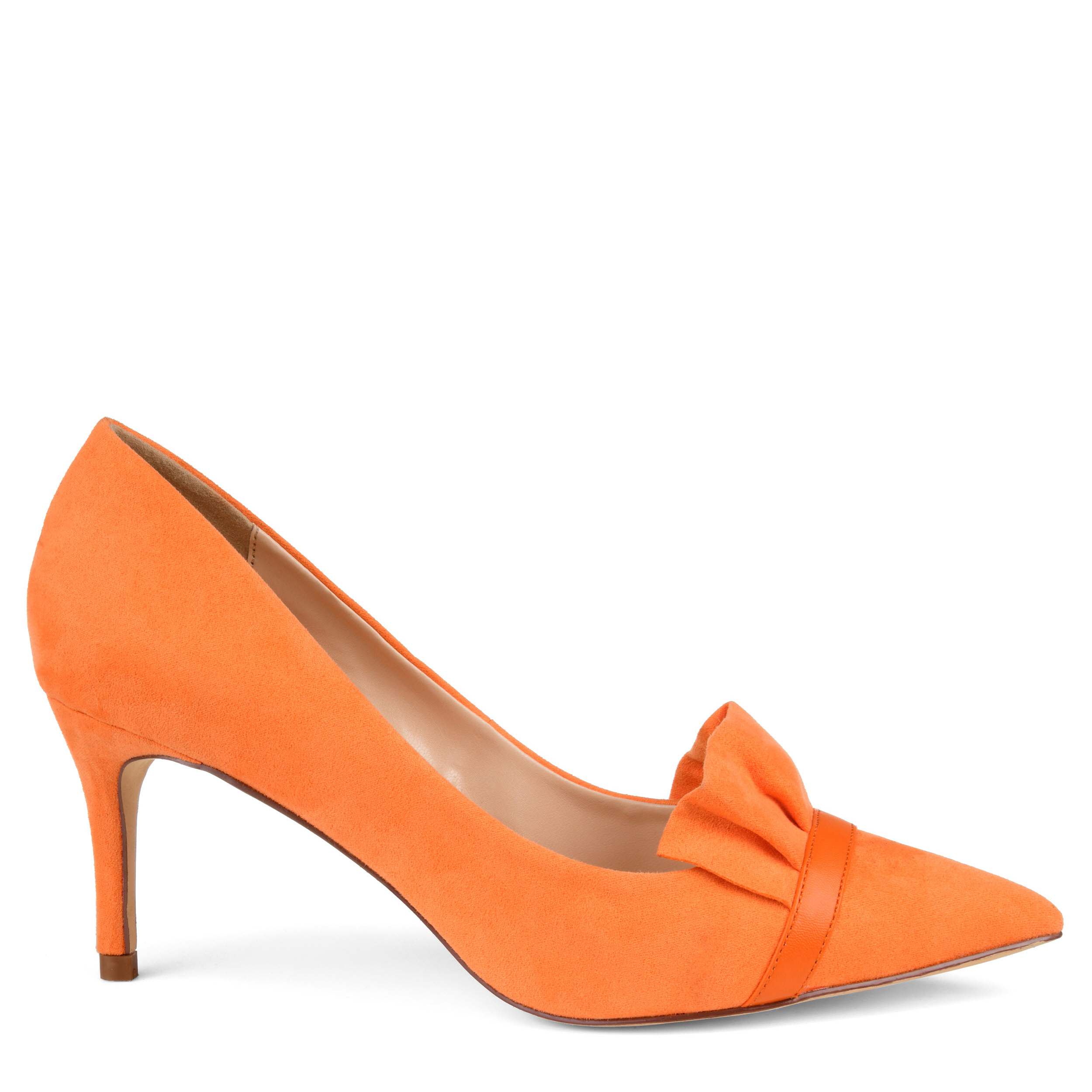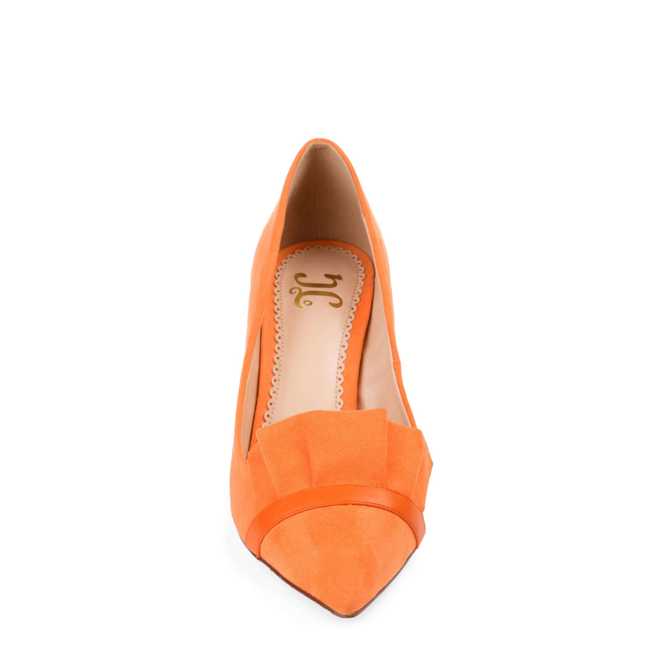 Look chic in your dressy attire with this Journee Collection Marek heel. The faux suede upper has a ruffle design on the vamp with a pointed toe for a sharp style. The covered 2¾" heel adds a silhouette boost to your look.